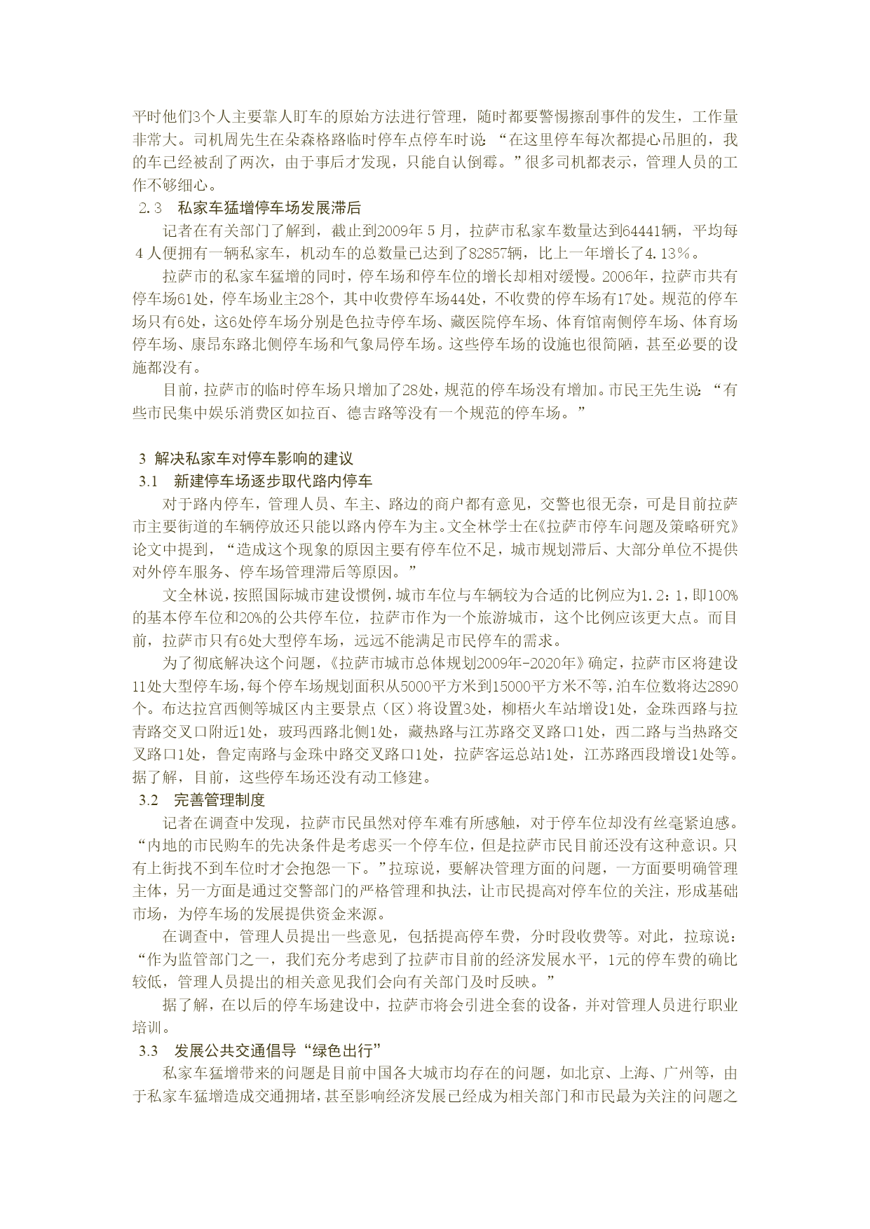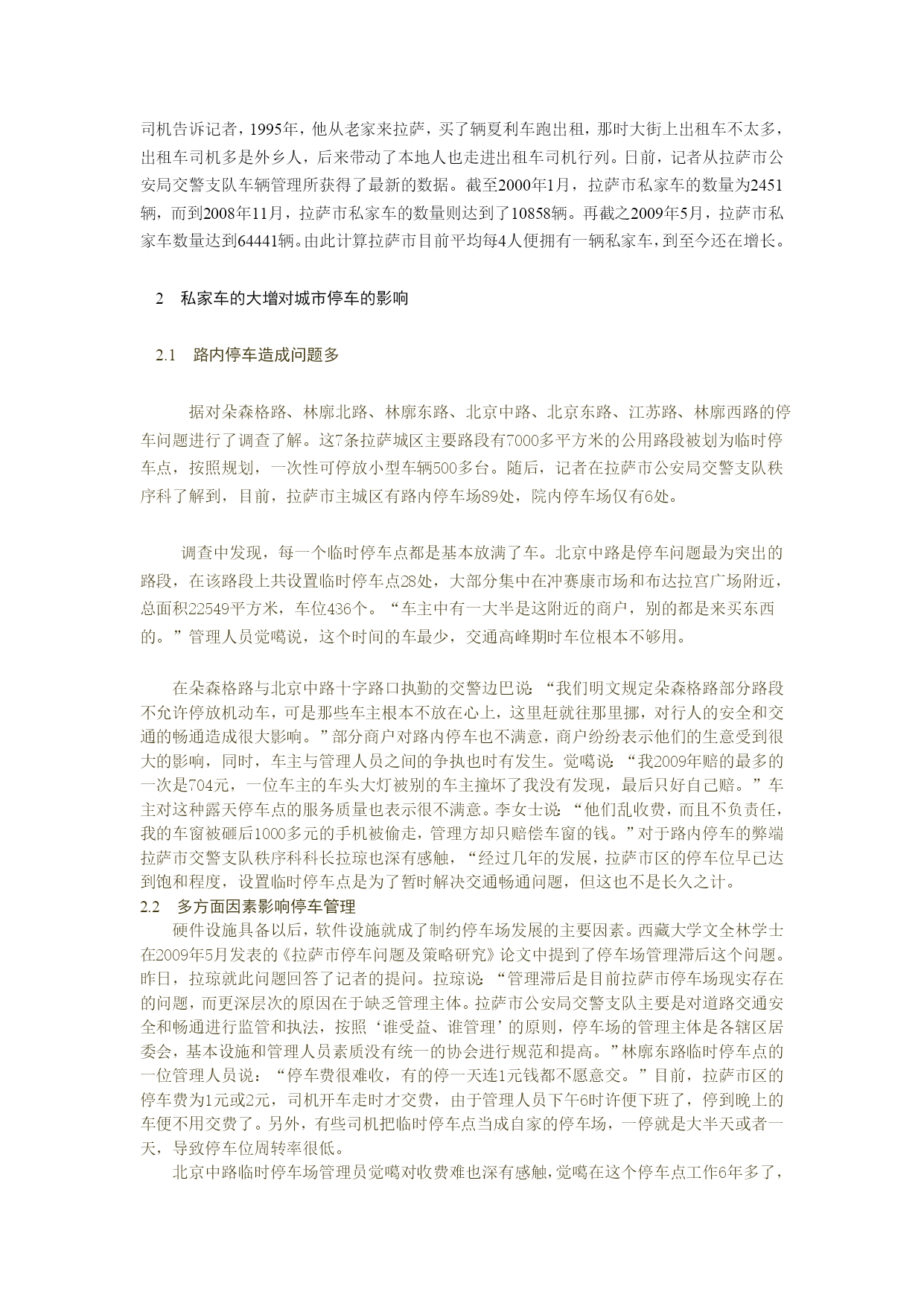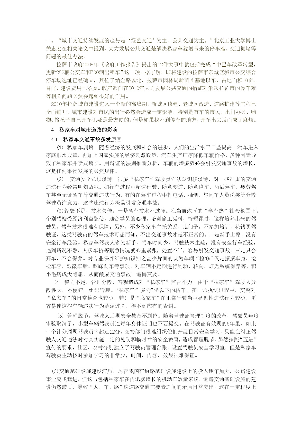 浅谈拉萨市私家车的大增对城市的影响格桑:09交通运输班,学号:22100940130指导老师:土登卓嘎摘要:近年来,随着拉萨经济快速发展及市民生活水平不断提高,越来越多的市民选择购买私家车用于代步,拉萨机动车保有量已突破10万辆,其中八成左右为私家车,这给拉萨市城市公交系统和设施提出了严峻考验,每逢上下加班、周末、拉萨市繁华地段就开始遭遇堵车,停车难。而且私家车的大增在道路上随便停车,使干扰了道路上的行驶车辆,有时会造成一些意外的交通事故,而且私家车好多车主的技术不够,未免造成事故,对道路的影响太大。关键词:私家车;事故;停车1拉萨市私家车的发展概况改革开放初期,永久、凤凰牌自行车作为市民的代步工具,曾风靡拉萨;上世纪80年代,摩托车逐渐成为市民新宠,那个年代,大街上如果偶尔驶过一辆私家车,便会引来路人翘首张望;拉萨真正出现第一批买私家车的市民,是在1990年前后,那时,买车需要预订。30年风雨历程,30年沧桑巨变,拉萨街头川流不息的车流,是时代变迁的最好见证。(1)上世纪80年代买车为生计拉萨最早成批出现的私人汽车是跑运输的货车。“那时,大街上看到最多的就是东风、解放牌大货车,拉着满满的货物,穿过城区。我和朋友买车就是为了赚钱,全家老小的生活、孩子的新衣服都要靠跑运输来挣。”上世纪80年代在西藏参军,之后留在拉萨跑运输的郭建国,对那一幕记忆犹新。(2)上世纪90年代初买车要预订1962年2月成立的自治区汽车配件公司,于1990年5月份正式改名为现在的自治区汽车工业贸易总公司,成为西藏第一家汽车销售公司,见证了西藏第一批私家车,流入平常百姓家的历程。现任自治区汽车工业贸易总公司销售公司经理的姚红旗说:“那时市民买车,要先到公司预订,交够订金,有的一个月后才能提到车,一辆夏利的价格是8万多元,能买到一辆车就算不错了,这是那个年代买车市民的普遍心态。”他说,现在公司销售的车辆有几十种品牌,车型丰富,选择空间很大,几天前悍马车“杀”进了拉萨市场。买车的年轻人已经无法体会买车要先预订,没有可挑选的品牌和车型,也不能砍价的年代的滋味了。今后,市民的交通工具只会越来越方便和新奇。(3)1994年第一批“面的”上世纪90年代中期,拉萨市的城市化水平有了显著的提高,市民感觉到居住的城市变大了、道路变宽了,拉萨市民出行对交通工具的依赖越来越大,也就是在这时,大街上悄然出现了“面的”。“到哪里?4块。”在关卫华记忆中,拉萨出现的第一批“面的”招手即停,谈好价格就走。1995年,运管部门开始整顿“面的”市场,车身刷着统一颜色、装着顶灯、有着各自编号的出租车取代了“面的”。据一位老司机讲述,拉萨第一个开出租车的司机是一位从甘肃来的外乡人,当时住在拉萨北郊,挣了钱后,回内地去了。因为人员流动太大,已经无从考证这位老司机的话是真是假。不过,祥云公司一位甘肃籍老司机告诉记者,1995年,他从老家来拉萨,买了辆夏利车跑出租,那时大街上出租车不太多,出租车司机多是外乡人,后来带动了本地人也走进出租车司机行列。日前,记者从拉萨市公安局交警支队车辆管理所获得了最新的数据。截至2000年1月,拉萨市私家车的数量为2451辆,而到2008年11月,拉萨市私家车的数量则达到了10858辆。再截之2009年5月,拉萨市私家车数量达到64441辆。由此计算拉萨市目前平均每4人便拥有一辆私家车,到至今还在增长。2私家车的大增对城市停车的影响2.1路内停车造成问题多据对朵森格路、林廓北路、林廓东路、北京中路、北京东路、江苏路、林廓西路的停车问题进行了调查了解。这7条拉萨城区主要路段有7000多平方米的公用路段被划为临时停车点,按照规划,一次性可停放小型车辆500多台。随后,记者在拉萨市公安局交警支队秩序科了解到,目前,拉萨市主城区有路内停车场89处,院内停车场仅有6处。调查中发现,每一个临时停车点都是基本放满了车。北京中路是停车问题最为突出的路段,在该路段上共设置临时停车点28处,大部分集中在冲赛康市场和布达拉宫广场附近,总面积22549平方米,车位436个。“车主中有一大半是这附近的商户,别的都是来买东西的。”管理人员觉噶说,这个时间的车最少,交通高峰期时车位根本不够用。在朵森格路与北京中路十字路口执勤的交警边巴说:“我们明文规定朵森格路部分路段不允许停放机动车,可是那些车主根本不放在心上,这里赶就往那里挪,对行人的安全和交通的畅通造成很大影响。”部分商户对路内停车也不满意,商户纷纷表示他们的生意受到很大的影响,同时,车主与管理人员之间的争执也时有发生。觉噶说:“我2009年赔的最多的一次是704元,一位车主的车头大灯被别的车主撞坏了我没有发现,最后只好自己赔。”车主对这种露天停车点的服务质量也表示很不满意。李女士说:“他们乱收费,而且不负责任