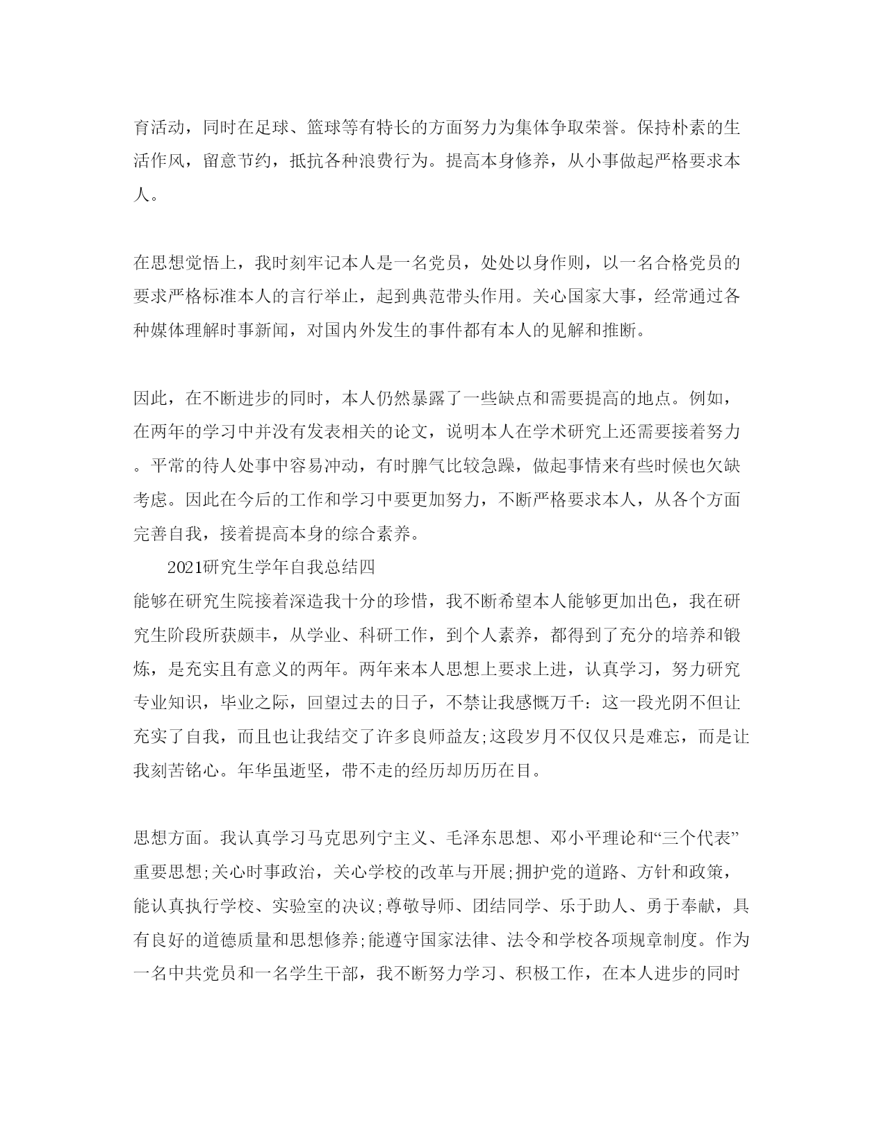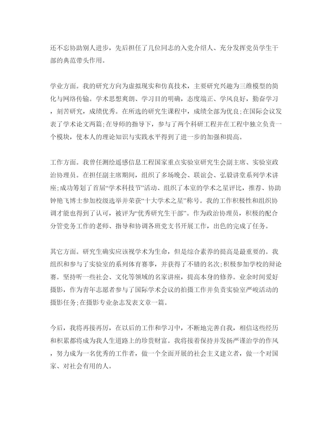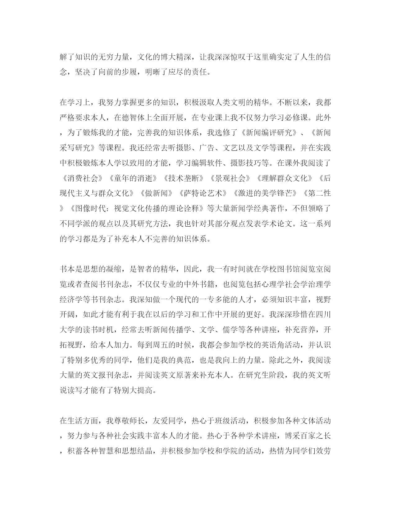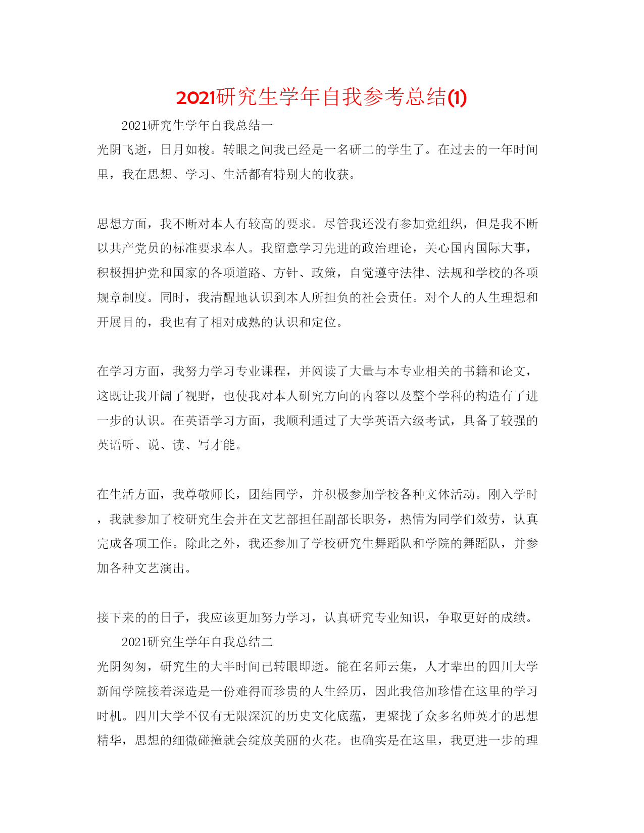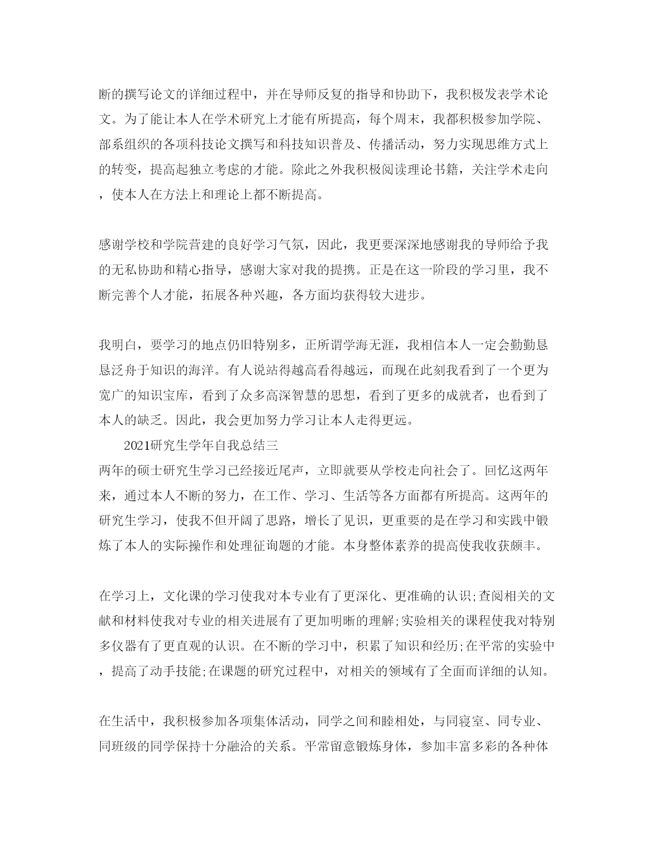 2021研究生学年自我参考总结(1)2021研究生学年自我总结一光阴飞逝,日月如梭。转眼之间我已经是一名研二的学生了。在过去的一年时间里,我在思想、学习、生活都有特别大的收获。思想方面,我不断对本人有较高的要求。尽管我还没有参加党组织,但是我不断以共产党员的标准要求本人。我留意学习先进的政治理论,关心国内国际大事,积极拥护党和国家的各项道路、方针、政策,自觉遵守法律、法规和学校的各项规章制度。同时,我清醒地认识到本人所担负的社会责任。对个人的人生理想和开展目的,我也有了相对成熟的认识和定位。在学习方面,我努力学习专业课程,并阅读了大量与本专业相关的书籍和论文,这既让我开阔了视野,也使我对本人研究方向的内容以及整个学科的构造有了进一步的认识。在英语学习方面,我顺利通过了大学英语六级考试,具备了较强的英语听、说、读、写才能。在生活方面,我尊敬师长,团结同学,并积极参加学校各种文体活动。刚入学时,我就参加了校研究生会并在文艺部担任副部长职务,热情为同学们效劳,认真完成各项工作。除此之外,我还参加了学校研究生舞蹈队和学院的舞蹈队,并参加各种文艺演出。接下来的的日子,我应该更加努力学习,认真研究专业知识,争取更好的成绩。2021研究生学年自我总结二光阴匆匆,研究生的大半时间已转眼即逝。能在名师云集,人才辈出的四川大学新闻学院接着深造是一份难得而珍贵的人生经历,因此我倍加珍惜在这里的学习时机。四川大学不仅有无限深沉的历史文化底蕴,更聚拢了众多名师英才的思想精华,思想的细微碰撞就会绽放美丽的火花。也确实是在这里,我更进一步的理解了知识的无穷力量,文化的博大精深,让我深深惊叹于这里确实定了人生的信念,坚决了向前的步履,明晰了应尽的责任。在学习上,我努力掌握更多的知识,积极汲取人类文明的精华。不断以来,我都严格要求本人,在德智体上全面开展,在专业课上我不仅努力学习必修课。此外,为了锻炼我的才能,完善我的知识体系,我选修了《新闻编评研究》、《新闻采写研究》等课程。我还经常去听摄影、广告、文艺以及文学等课程,并在实践中积极锻炼本人学以致用的才能,学习编辑软件、摄影技巧等。在课外我阅读了《消费社会》《童年的消逝》《技术垄断》《景观社会》《理解群众文化》《后现代主义与群众文化》《做新闻》《萨特论艺术》《激进的美学锋芒》《第二性》《图像时代:视觉文化传播的理论诠释》等大量新闻学经典著作,不但领略了不同学派的观点以及其研究方法,我也针对其部分观点发表学术论文。这一系列的学习都是为了补充本人不完善的知识体系。书本是思想的凝缩,是智者的精华,因此,我一有时间就在学校图书馆阅览室阅览或者查阅书刊杂志,不仅仅专业的中外书籍,也阅览包括心理学社会学治理学经济学等书刊杂志。我深知做一个现代的一专多能的人才,必须知识丰富,视野开阔,如此才能有利于我在以后的学习和工作中开展的更好。我深深珍惜在四川大学的读书时机,经常去听新闻传播学、文学、儒学等各种讲座,补充营养,开拓视野,给本人加力。每到周五的时候,我都会参加学校的英语角活动,并认识了特别多优秀的同学,他们是我的典范,也是我向上的力量。除此之外,我阅读大量的英文报刊杂志,并阅读英文原著来补充本人。在研究生阶段,我的英文听说读写才能有了特别大提高。在生活方面,我尊敬师长,友爱同学,热心于班级活动,积极参加各种文体活动,努力参与各种社会实践丰富本人的才能。热心于各种学术讲座,博采百家之长,积蓄各种智慧和思想结晶,并积极参加学校和学院的活动,热情为同学们效劳,认真完成各项工作,在这一系列的活动中,我进一步开阔了视野,拓展了学习兴趣,大大提高了本身才能。生活中与同学们和谐相处,互相关心,彼此鼓舞,共同进步。在思想上,我不断追求进步,参加了学术部,成为入党积极分子。我竭心尽力力争做好表率典范,保持良好的学习态度,关心时政,注重理论修养的提升,坚持我党的优良传统。认真学习党在各个时期的方针政策,领会共产党的思想和主旨,认真阅读马列主义原著,全面把握了马克思主义与中国革命和建立实践相结合的曲折历程以及当代中国的马克思主义的崭新风貌,进一步理解了党的最高纲领和最低纲领的统一性以及其与党在各个历史时期的道路、方针、政策的内在一致性,进而加强了本人在政治、思想、组织上与党中央保持高度一致的自觉性。在行动上,平时留意作风纪律养成,能够自觉遵守条令条例和研究生队的各项治理规定;入学后,特别快探究出与导师、同学和谐相处的适宜方式,迅速适应了学习生活环境改变、身份变化的要求;尊重师长,团结同学,与人为善,力求做到待人接物谦和有序,礼节礼貌周到得体;热于助人,关心别人,与朋友同学和睦相处,对困难的同学积极协助他们。我清醒地认识到,知识的不完善和思想的不成熟是我开展道路上必须铲除的桎梏,我需要接着对本人思想上加强改造,学习上不断提