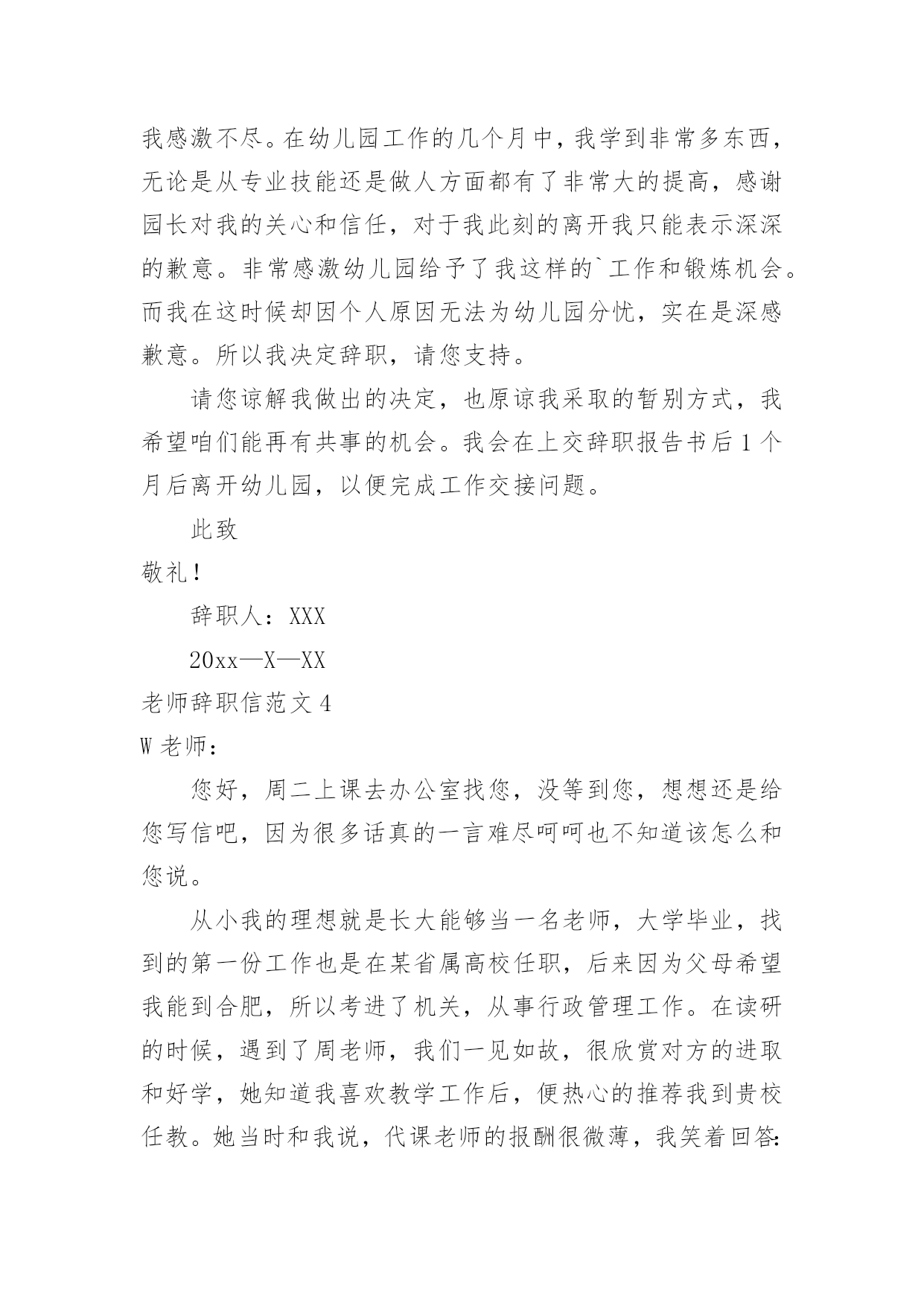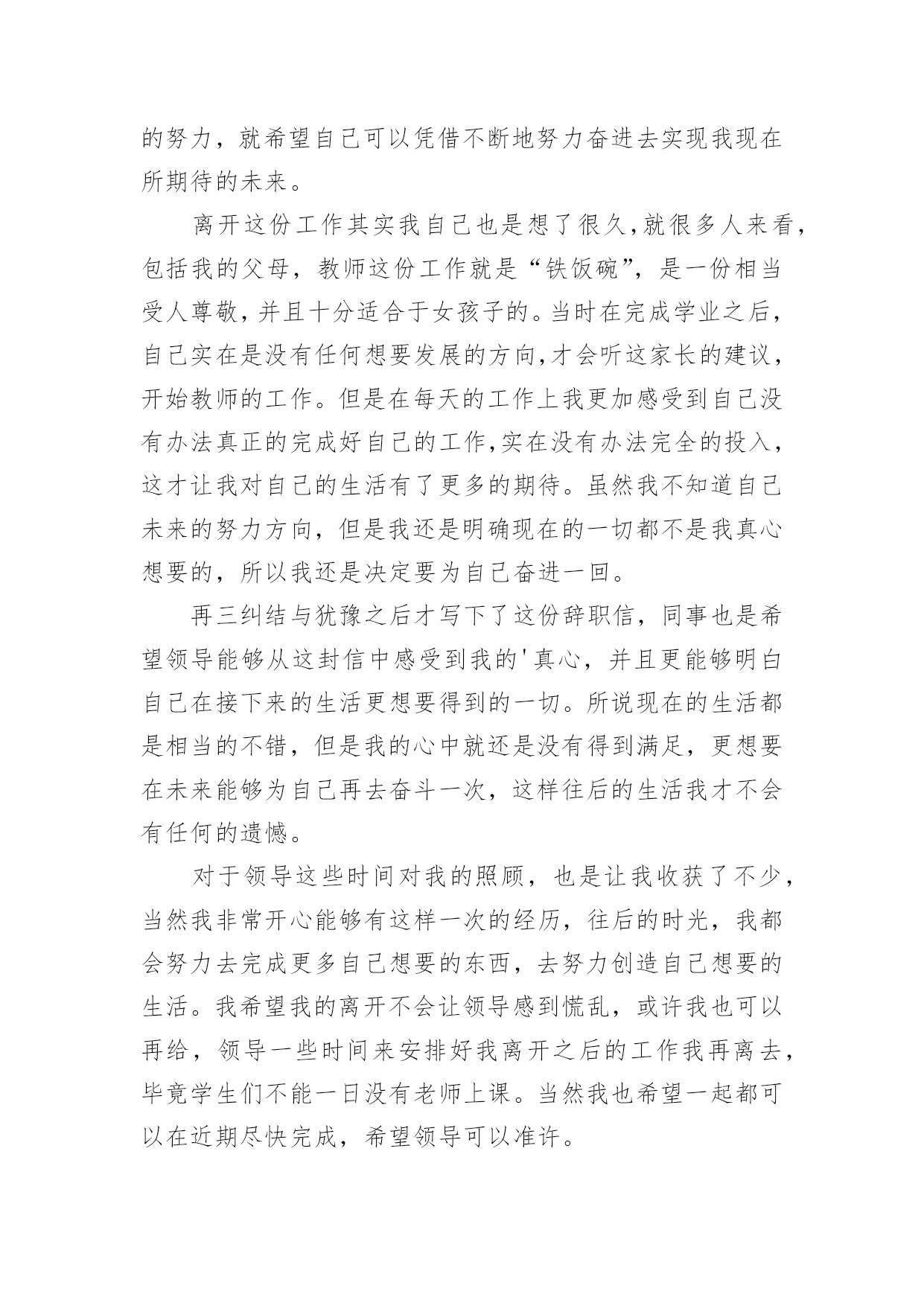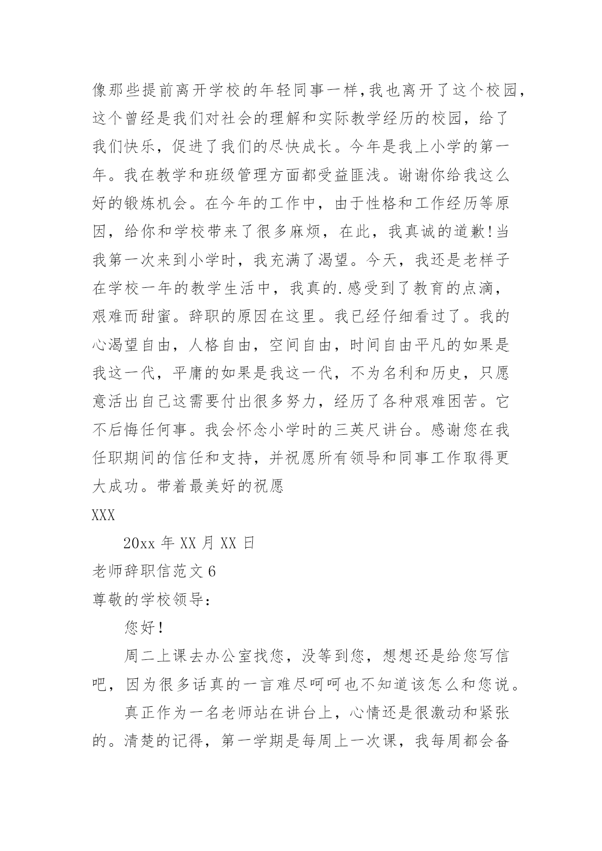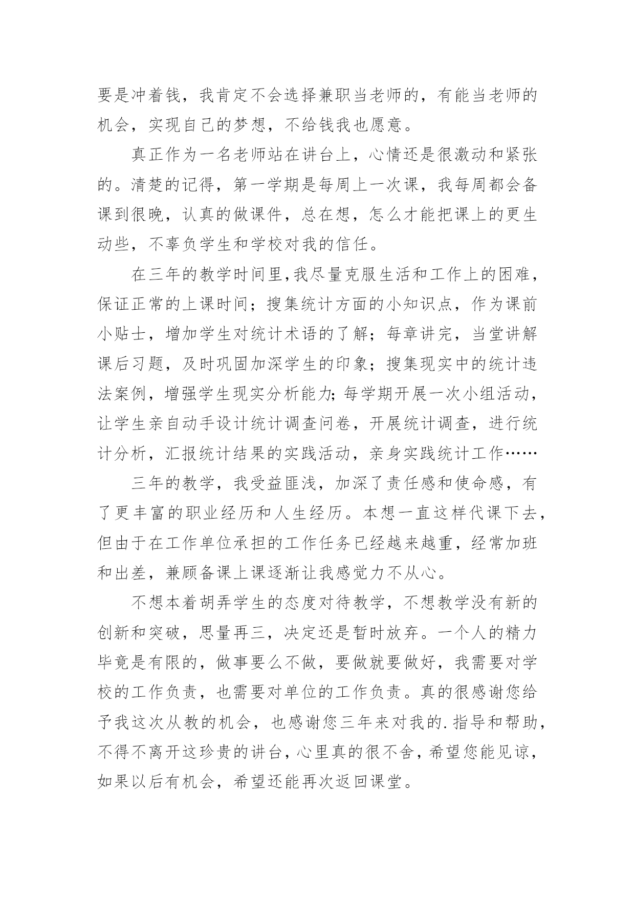 老师辞职信老师辞职信范文在职场打拼多年后,我们或许会因为个人原因而选择离职,这时就需要学习写辞职信吧。到底该怎么写辞职信呢?以下是小编为大家整理的老师辞职信范文,欢迎大家分享。老师辞职信范文1x校长:因为个人价值观的原因,我恳请辞去目前的工作,望批准!如果学校工作方便的话,我希望在11月份或者之前的某个时间就能离开!在学校的.教学经历将成为我的美好记忆中的一部分,希望领导及同事万事顺心,工作顺利!此致敬礼!辞职人:xxxxx月xx日老师辞职信范文2尊敬的领导:您好!这段时间以来,我的教学工作总算没有出现差错。但是我不敢保证以后的工作没有问题,我只好向学校呈上这份辞职报告了。工作近一年来,发现自己在工作、生活中,所学知识还有很多很多的欠缺,已经不能适应学校课改发展的需要,仍需继续学习课改理论。在近一年的时间里,我有幸得到了单位领导及同事们的倾心指导及热情帮助。工作上,我学到了许多宝贵的课改经验和实践技能,对课改工作有了大致的了解。思想上,得到领导与同事们的指导与帮助,有了更成熟与更深刻的人生观。这近一年的工作经验将是我今后学习和工作中的一笔宝贵的财富。我的能力不能胜任教务处教导员的职务,这是我很感到伤心的地方,我知道自己应该去努力但是我努力后还是不行。我的资历和能力以及阅历都不能胜任我目前的'工作,我只好辞职,给其他老师让位。在这里,特别感谢校领导与同事们在过去的工作、生活中给予的大力扶持与帮助。尤其感谢校长在近一年来的关照和指导以及对我的信任。感谢所有给予过我帮助的同事们!恳求领导批准我的申请。辞职人:xxx20xx年xx月xx日老师辞职信范文3亲爱的园长:您好!首先,非常感谢您这半年来对我的信任和关照。这段时间,我认真回顾了这几个月来的工作情况,觉得来**幼儿园工作是我的幸运,我一直非常珍惜这份工作,这几个月来感谢园长对我的关心和教导,同事们对我的帮助让我感激不尽。在幼儿园工作的几个月中,我学到非常多东西,无论是从专业技能还是做人方面都有了非常大的提高,感谢园长对我的关心和信任,对于我此刻的离开我只能表示深深的歉意。非常感激幼儿园给予了我这样的`工作和锻炼机会。而我在这时候却因个人原因无法为幼儿园分忧,实在是深感歉意。所以我决定辞职,请您支持。请您谅解我做出的决定,也原谅我采取的暂别方式,我希望咱们能再有共事的机会。我会在上交辞职报告书后1个月后离开幼儿园,以便完成工作交接问题。此致敬礼!辞职人:XXX20xx—X—XX老师辞职信范文4W老师:您好,周二上课去办公室找您,没等到您,想想还是给您写信吧,因为很多话真的一言难尽呵呵也不知道该怎么和您说。从小我的理想就是长大能够当一名老师,大学毕业,找到的第一份工作也是在某省属高校任职,后来因为父母希望我能到合肥,所以考进了机关,从事行政管理工作。在读研的时候,遇到了周老师,我们一见如故,很欣赏对方的进取和好学,她知道我喜欢教学工作后,便热心的推荐我到贵校任教。她当时和我说,代课老师的报酬很微薄,我笑着回答:要是冲着钱,我肯定不会选择兼职当老师的,有能当老师的机会,实现自己的梦想,不给钱我也愿意。真正作为一名老师站在讲台上,心情还是很激动和紧张的。清楚的记得,第一学期是每周上一次课,我每周都会备课到很晚,认真的做课件,总在想,怎么才能把课上的更生动些,不辜负学生和学校对我的信任。在三年的教学时间里,我尽量克服生活和工作上的困难,保证正常的上课时间;搜集统计方面的小知识点,作为课前小贴士,增加学生对统计术语的了解;每章讲完,当堂讲解课后习题,及时巩固加深学生的印象;搜集现实中的统计违法案例,增强学生现实分析能力;每学期开展一次小组活动,让学生亲自动手设计统计调查问卷,开展统计调查,进行统计分析,汇报统计结果的实践活动,亲身实践统计工作……三年的教学,我受益匪浅,加深了责任感和使命感,有了更丰富的职业经历和人生经历。本想一直这样代课下去,但由于在工作单位承担的工作任务已经越来越重,经常加班和出差,兼顾备课上课逐渐让我感觉力不从心。不想本着胡弄学生的态度对待教学,不想教学没有新的创新和突破,思量再三,决定还是暂时放弃。一个人的精力毕竟是有限的,做事要么不做,要做就要做好,我需要对学校的工作负责,也需要对单位的工作负责。真的很感谢您给予我这次从教的机会,也感谢您三年来对我的.指导和帮助,不得不离开这珍贵的讲台,心里真的很不舍,希望您能见谅,如果以后有机会,希望还能再次返回课堂。最后,有个小小的愿望,希望W老师能够帮我实现。一段人生经历的结束,总想留下点纪念,不知道学校或者是教学组,能否对我这段时间的工作给一个鉴定,对我这三年教学的评价也好,意见建议也行,只想今后回忆起这段经历时,有个纪念。如能实现,将感激不尽。这学期还有一个多月的教学时间,我一定会一如既往的用心上课,认真履行完自己的工