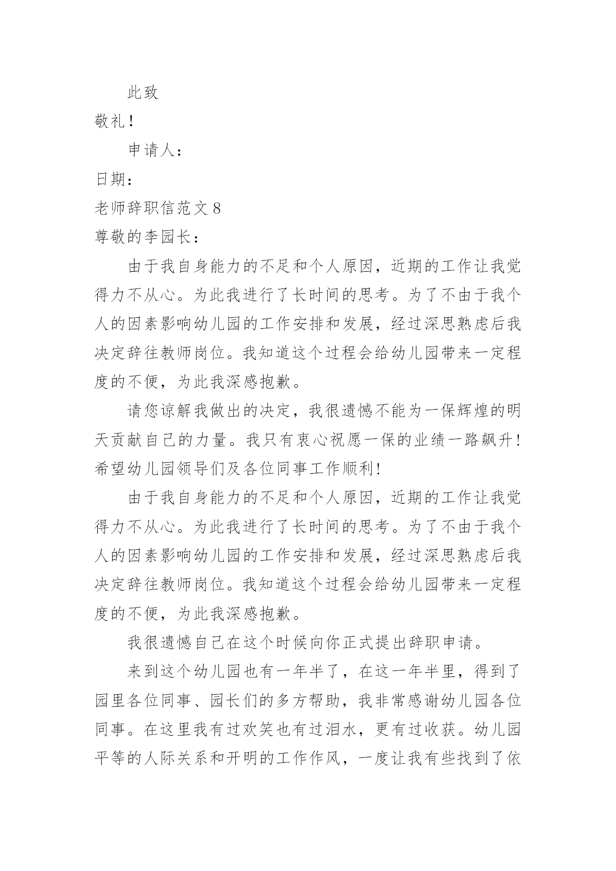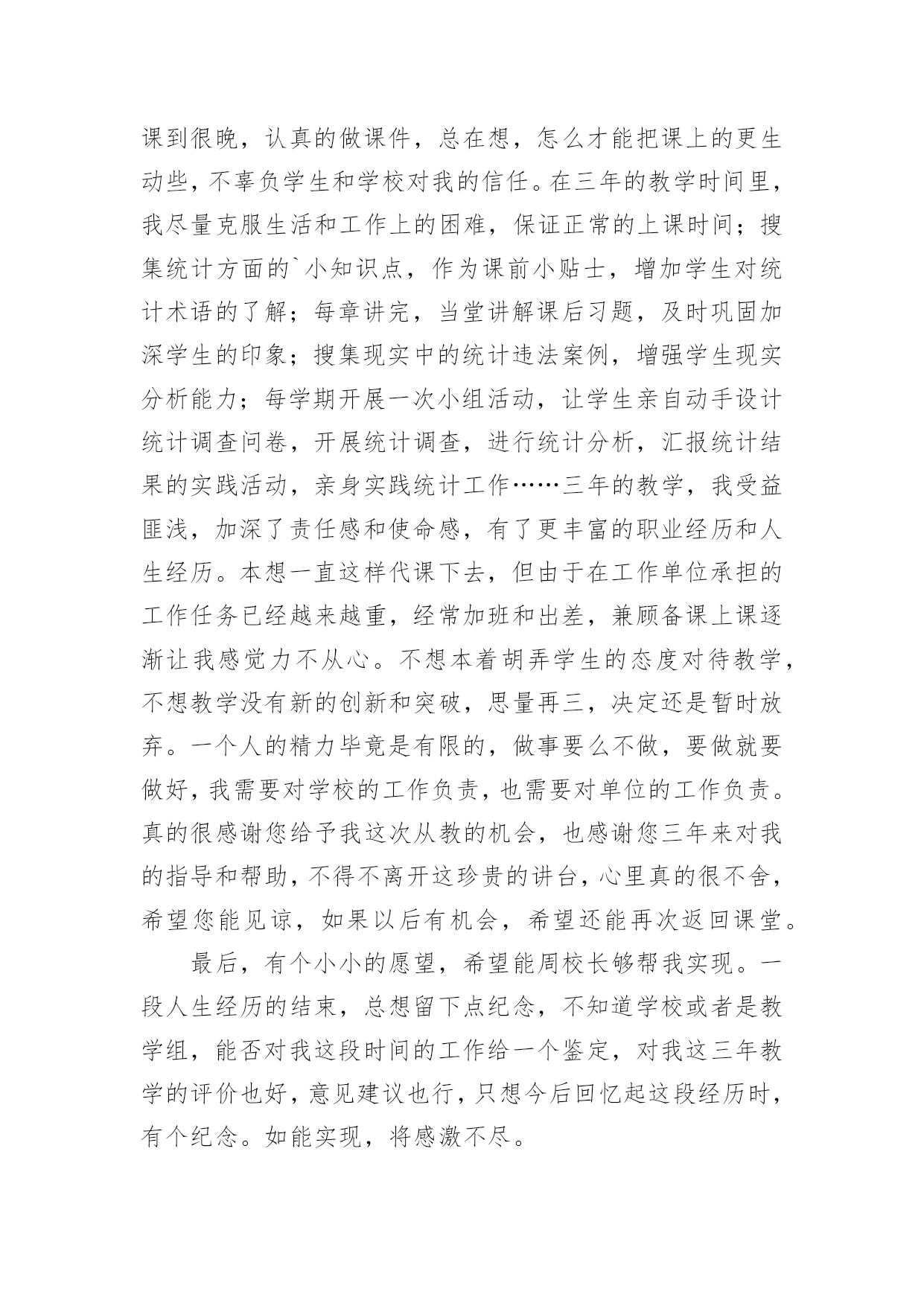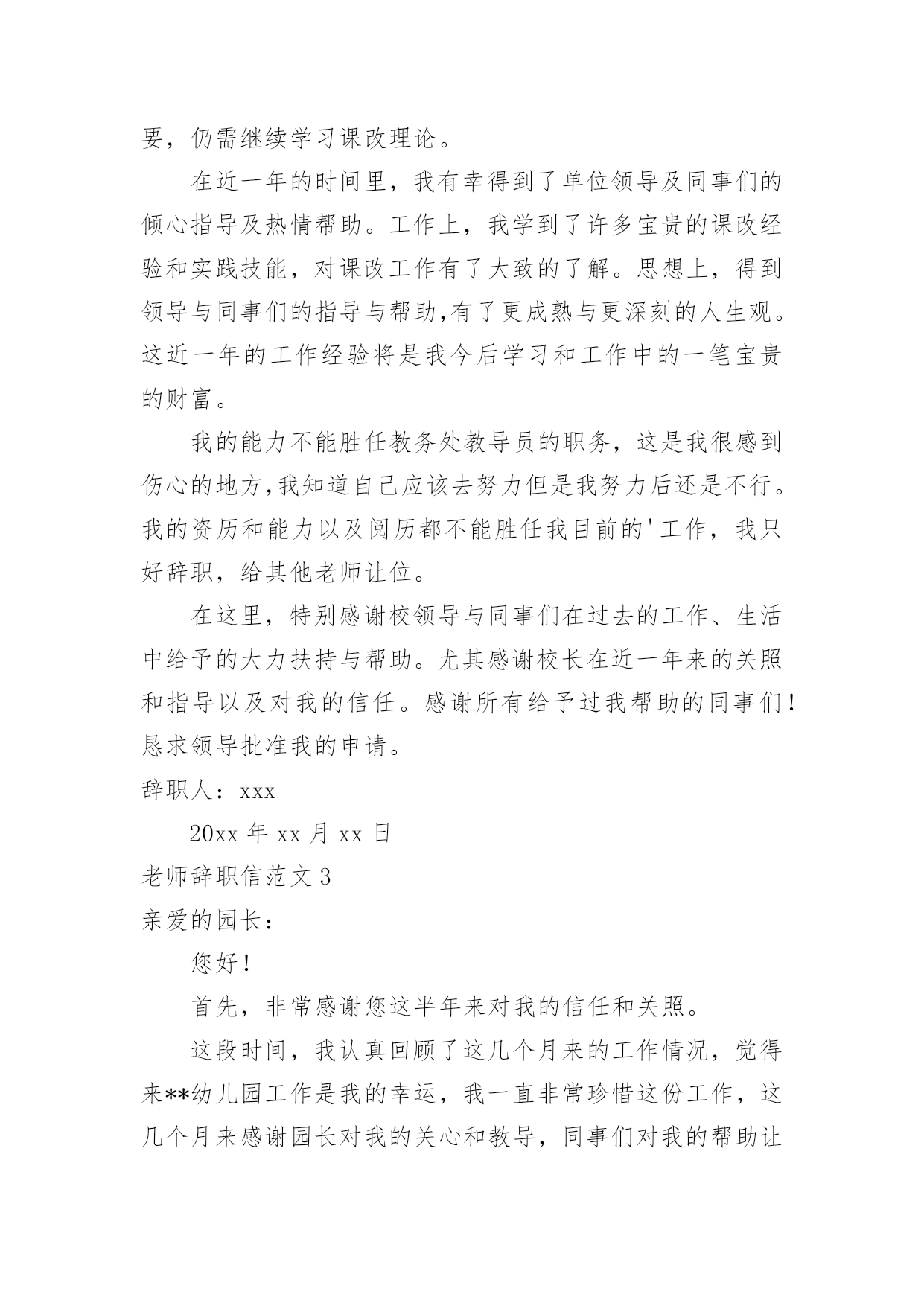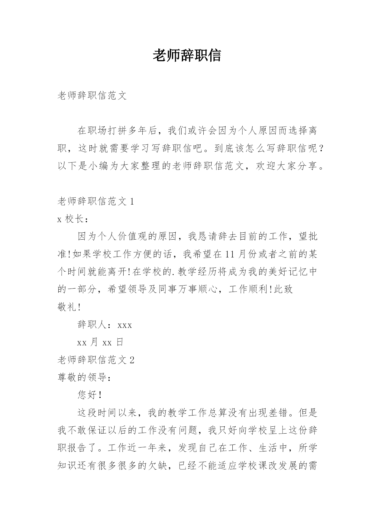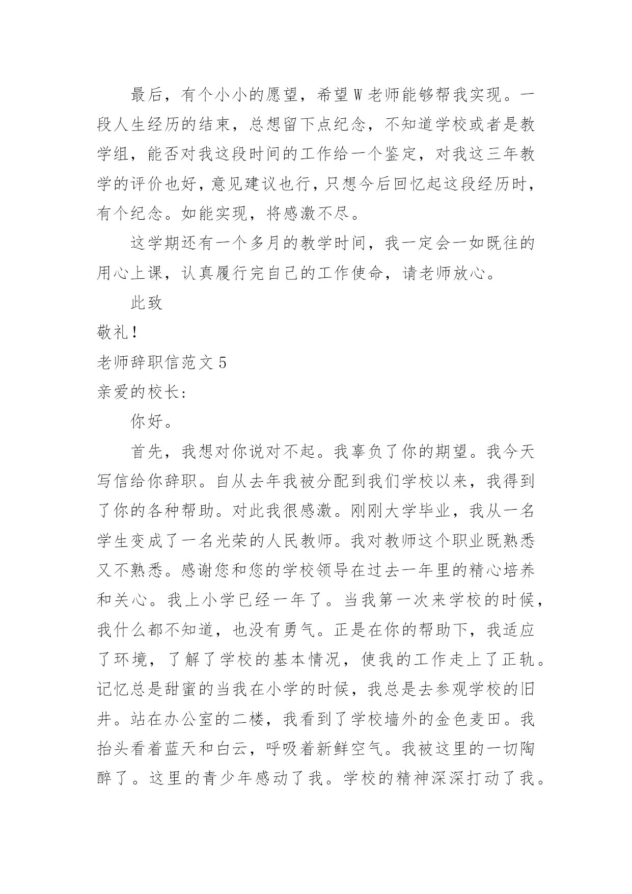 老师辞职信老师辞职信范文在职场打拼多年后,我们或许会因为个人原因而选择离职,这时就需要学习写辞职信吧。到底该怎么写辞职信呢?以下是小编为大家整理的老师辞职信范文,欢迎大家分享。老师辞职信范文1x校长:因为个人价值观的原因,我恳请辞去目前的工作,望批准!如果学校工作方便的话,我希望在11月份或者之前的某个时间就能离开!在学校的.教学经历将成为我的美好记忆中的一部分,希望领导及同事万事顺心,工作顺利!此致敬礼!辞职人:xxxxx月xx日老师辞职信范文2尊敬的领导:您好!这段时间以来,我的教学工作总算没有出现差错。但是我不敢保证以后的工作没有问题,我只好向学校呈上这份辞职报告了。工作近一年来,发现自己在工作、生活中,所学知识还有很多很多的欠缺,已经不能适应学校课改发展的需要,仍需继续学习课改理论。在近一年的时间里,我有幸得到了单位领导及同事们的倾心指导及热情帮助。工作上,我学到了许多宝贵的课改经验和实践技能,对课改工作有了大致的了解。思想上,得到领导与同事们的指导与帮助,有了更成熟与更深刻的人生观。这近一年的工作经验将是我今后学习和工作中的一笔宝贵的财富。我的能力不能胜任教务处教导员的职务,这是我很感到伤心的地方,我知道自己应该去努力但是我努力后还是不行。我的资历和能力以及阅历都不能胜任我目前的'工作,我只好辞职,给其他老师让位。在这里,特别感谢校领导与同事们在过去的工作、生活中给予的大力扶持与帮助。尤其感谢校长在近一年来的关照和指导以及对我的信任。感谢所有给予过我帮助的同事们!恳求领导批准我的申请。辞职人:xxx20xx年xx月xx日老师辞职信范文3亲爱的园长:您好!首先,非常感谢您这半年来对我的信任和关照。这段时间,我认真回顾了这几个月来的工作情况,觉得来**幼儿园工作是我的幸运,我一直非常珍惜这份工作,这几个月来感谢园长对我的关心和教导,同事们对我的帮助让我感激不尽。在幼儿园工作的几个月中,我学到非常多东西,无论是从专业技能还是做人方面都有了非常大的提高,感谢园长对我的关心和信任,对于我此刻的离开我只能表示深深的歉意。非常感激幼儿园给予了我这样的`工作和锻炼机会。而我在这时候却因个人原因无法为幼儿园分忧,实在是深感歉意。所以我决定辞职,请您支持。请您谅解我做出的决定,也原谅我采取的暂别方式,我希望咱们能再有共事的机会。我会在上交辞职报告书后1个月后离开幼儿园,以便完成工作交接问题。此致敬礼!辞职人:XXX20xx—X—XX老师辞职信范文4W老师:您好,周二上课去办公室找您,没等到您,想想还是给您写信吧,因为很多话真的一言难尽呵呵也不知道该怎么和您说。从小我的理想就是长大能够当一名老师,大学毕业,找到的第一份工作也是在某省属高校任职,后来因为父母希望我能到合肥,所以考进了机关,从事行政管理工作。在读研的时候,遇到了周老师,我们一见如故,很欣赏对方的进取和好学,她知道我喜欢教学工作后,便热心的推荐我到贵校任教。她当时和我说,代课老师的报酬很微薄,我笑着回答:要是冲着钱,我肯定不会选择兼职当老师的,有能当老师的机会,实现自己的梦想,不给钱我也愿意。真正作为一名老师站在讲台上,心情还是很激动和紧张的。清楚的记得,第一学期是每周上一次课,我每周都会备课到很晚,认真的做课件,总在想,怎么才能把课上的更生动些,不辜负学生和学校对我的信任。在三年的教学时间里,我尽量克服生活和工作上的困难,保证正常的上课时间;搜集统计方面的小知识点,作为课前小贴士,增加学生对统计术语的了解;每章讲完,当堂讲解课后习题,及时巩固加深学生的印象;搜集现实中的统计违法案例,增强学生现实分析能力;每学期开展一次小组活动,让学生亲自动手设计统计调查问卷,开展统计调查,进行统计分析,汇报统计结果的实践活动,亲身实践统计工作……三年的教学,我受益匪浅,加深了责任感和使命感,有了更丰富的职业经历和人生经历。本想一直这样代课下去,但由于在工作单位承担的工作任务已经越来越重,经常加班和出差,兼顾备课上课逐渐让我感觉力不从心。不想本着胡弄学生的态度对待教学,不想教学没有新的创新和突破,思量再三,决定还是暂时放弃。一个人的精力毕竟是有限的,做事要么不做,要做就要做好,我需要对学校的工作负责,也需要对单位的工作负责。真的很感谢您给予我这次从教的机会,也感谢您三年来对我的.指导和帮助,不得不离开这珍贵的讲台,心里真的很不舍,希望您能见谅,如果以后有机会,希望还能再次返回课堂。最后,有个小小的愿望,希望W老师能够帮我实现。一段人生经历的结束,总想留下点纪念,不知道学校或者是教学组,能否对我这段时间的工作给一个鉴定,对我这三年教学的评价也好,意见建议也行,只想今后回忆起这段经历时,有个纪念。如能实现,将感激不尽。这学期还有一个多月的教学时间,我一定会一如既往的用心上课,认真履行完自己的工