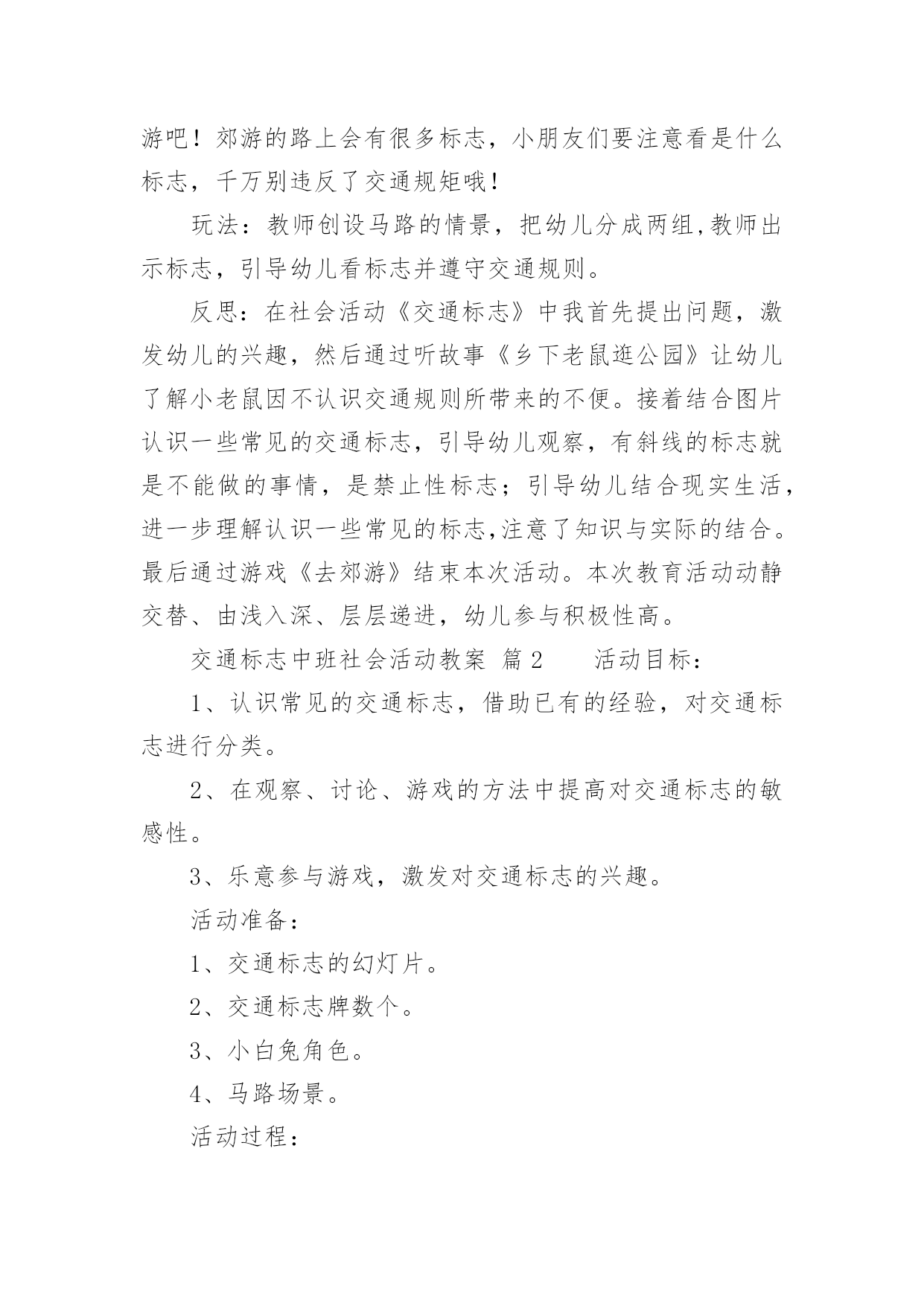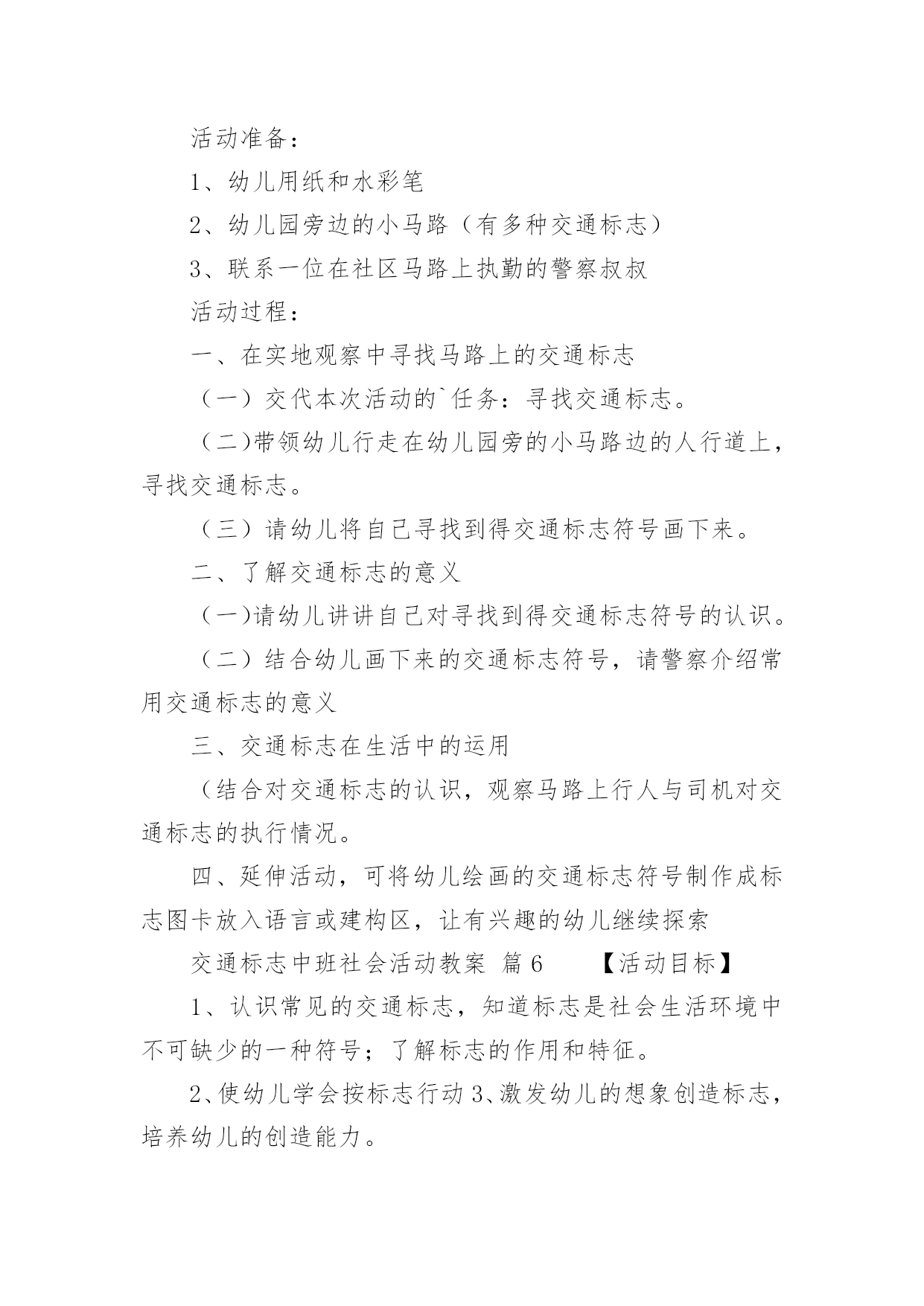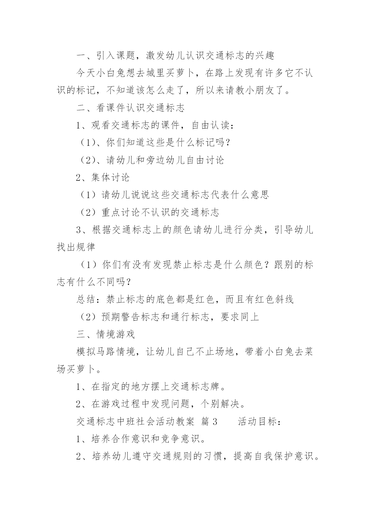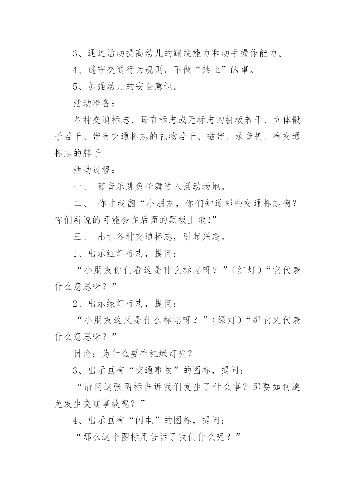 交通标志中班社会活动教案交通标志中班社会活动教案(通用12篇)作为一名为他人授业解惑的教育工作者,很有必要精心设计一份教案,借助教案可以有效提升自己的教学能力。那么什么样的教案才是好的呢?以下是小编精心整理的交通标志中班社会活动教案,仅供参考,希望能够帮助到大家。交通标志中班社会活动教案篇1一、教学活动目标1、认识常见的交通标志,知道车辆行驶时有特定的范围和特定的规则。2、懂得人们必须自觉遵守交通规则,注意安全,培养看标志的良好习惯。二、活动准备1、交通标志图片。2、音乐《去郊游》3、幼儿用书三、指导要点1、活动重点:认识常见的交通标志,懂得人们必须自觉遵守交通规则,注意安全。2、活动难点:知道车辆行使时有特定的范围和特定的规则。3、指导要点:以生动的故事激发幼儿学习的兴趣,引导幼儿认识常见的交通标志,懂得人们必须自觉遵守交通规则,主意安全。四、活动过程1、欣赏故事,理解故事内容。(1)提出问题,激发兴趣。师:有一只小老鼠开车进城玩,可是却没钱上公园,这是为什么呢?你们想知道吗?请小朋友们认真听听《乡下老鼠逛公园》这个故事。(2)教师讲述故事。提问:小老鼠为什么没钱上公园呢?小结:小老鼠不认识交通标志,违反了交通规则,所以被罚款了,罚了钱就没有钱上幼儿园。2、结合图片,认识一些常见的交通标志。(1)师:你们愿意教小老鼠认识马路上的交通标志吗?让我们一起来看看。(2)依次出示标识卡,提问:这是什么标志?你们认识它吗?标志上画有什么?表示什么意思?3、讨论:为什么要在马路上还要听从谁的指挥?小结:有了交通标志,马路上的车和行人就不会随意乱行、没有规规矩、互不相让。小朋友们出门的时候要注意看是什么交通标志,注意安全,做一个遵守交通工具规则的乖宝宝!4、游戏:去郊游师:小朋友认识了这么多的标志,那我们一起开车去郊游吧!郊游的路上会有很多标志,小朋友们要注意看是什么标志,千万别违反了交通规矩哦!玩法:教师创设马路的情景,把幼儿分成两组,教师出示标志,引导幼儿看标志并遵守交通规则。反思:在社会活动《交通标志》中我首先提出问题,激发幼儿的兴趣,然后通过听故事《乡下老鼠逛公园》让幼儿了解小老鼠因不认识交通规则所带来的不便。接着结合图片认识一些常见的交通标志,引导幼儿观察,有斜线的标志就是不能做的事情,是禁止性标志;引导幼儿结合现实生活,进一步理解认识一些常见的标志,注意了知识与实际的结合。最后通过游戏《去郊游》结束本次活动。本次教育活动动静交替、由浅入深、层层递进,幼儿参与积极性高。交通标志中班社会活动教案篇2活动目标:1、认识常见的交通标志,借助已有的经验,对交通标志进行分类。2、在观察、讨论、游戏的方法中提高对交通标志的敏感性。3、乐意参与游戏,激发对交通标志的兴趣。活动准备:1、交通标志的幻灯片。2、交通标志牌数个。3、小白兔角色。4、马路场景。活动过程:一、引入课题,激发幼儿认识交通标志的兴趣今天小白兔想去城里买萝卜,在路上发现有许多它不认识的标记,不知道该怎么走了,所以来请教小朋友了。二、看课件认识交通标志1、观看交通标志的课件,自由认读:(1)、你们知道这些是什么标记吗?(2)、请幼儿和旁边幼儿自由讨论2、集体讨论(1)请幼儿说说这些交通标志代表什么意思(2)重点讨论不认识的交通标志3、根据交通标志上的颜色请幼儿进行分类,引导幼儿找出规律(1)你们有没有发现禁止标志是什么颜色?跟别的标志有什么不同吗?总结:禁止标志的底色都是红色,而且有红色斜线(2)预期警告标志和通行标志,要求同上三、情境游戏模拟马路情境,让幼儿自己不止场地,带着小白兔去菜场买萝卜。1、在指定的地方摆上交通标志牌。2、在游戏过程中发现问题,个别解决。交通标志中班社会活动教案篇3活动目标:1、培养合作意识和竞争意识。2、培养幼儿遵守交通规则的习惯,提高自我保护意识。3、通过活动提高幼儿的蹦跳能力和动手操作能力。4、遵守交通行为规则,不做“禁止”的事。5、加强幼儿的安全意识。活动准备:各种交通标志、画有标志或无标志的拼板若干、立体骰子若干、带有交通标志的礼物若干、磁带、录音机、有交通标志的牌子活动过程:一、随音乐跳兔子舞进入活动场地。二、你才我翻“小朋友,你们知道哪些交通标志啊?你们所说的可能会在后面的黑板上哦!”三、出示各种交通标志,引起兴趣。1、出示红灯标志,提问:“小朋友你们看这是什么标志呀?”(红灯)“它代表什么意思呀?”2、出示绿灯标志,提问:“小朋友这又是什么标志呀?”(绿灯)“那它又代表什么意思呀?”讨论:为什么要有红绿灯呢?3、出示画有“交通事故”的图标,提问:“请问这张图标告诉我们发生了什么事?那要如何避免发生交通事故呢?”4、出示画有“闪电”的图标,提问:“那么这个图标用告诉了我们什么呢?”四、进行拼图活动,为游戏做准备。“小朋友,你们看这里有