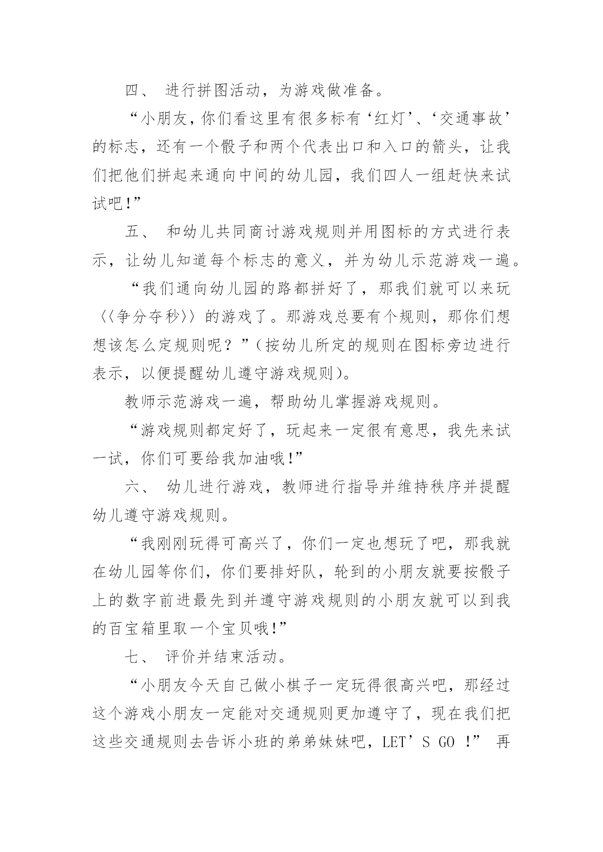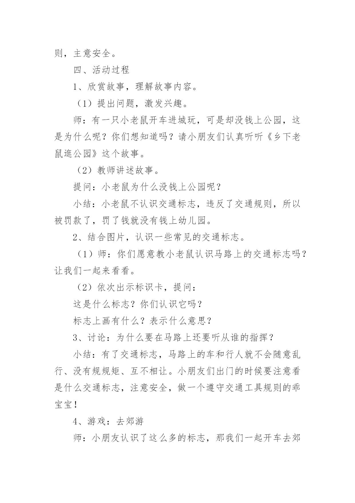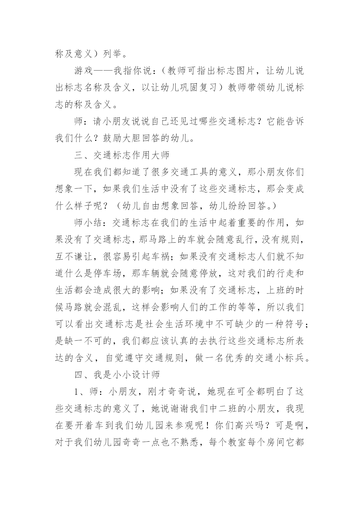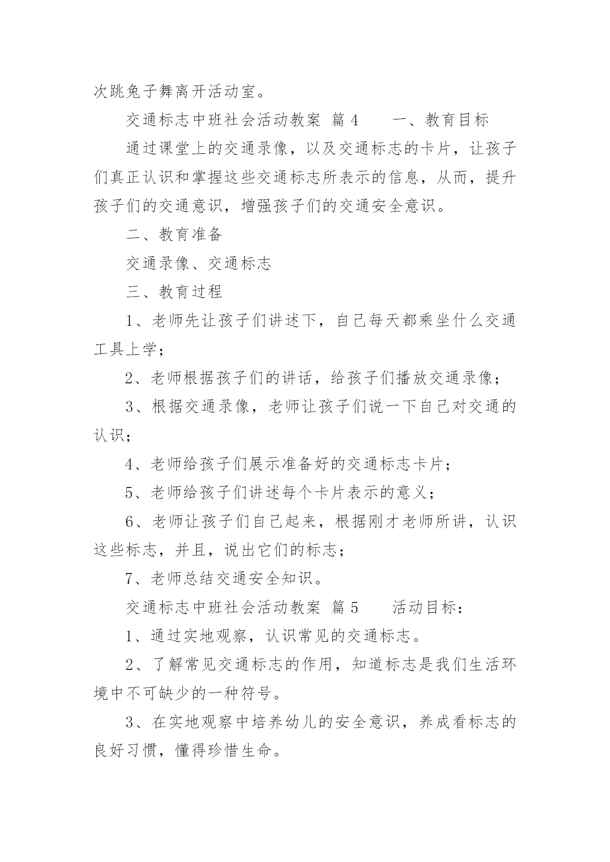 交通标志中班社会活动教案交通标志中班社会活动教案(通用12篇)作为一名为他人授业解惑的教育工作者,很有必要精心设计一份教案,借助教案可以有效提升自己的教学能力。那么什么样的教案才是好的呢?以下是小编精心整理的交通标志中班社会活动教案,仅供参考,希望能够帮助到大家。交通标志中班社会活动教案篇1一、教学活动目标1、认识常见的交通标志,知道车辆行驶时有特定的范围和特定的规则。2、懂得人们必须自觉遵守交通规则,注意安全,培养看标志的良好习惯。二、活动准备1、交通标志图片。2、音乐《去郊游》3、幼儿用书三、指导要点1、活动重点:认识常见的交通标志,懂得人们必须自觉遵守交通规则,注意安全。2、活动难点:知道车辆行使时有特定的范围和特定的规则。3、指导要点:以生动的故事激发幼儿学习的兴趣,引导幼儿认识常见的交通标志,懂得人们必须自觉遵守交通规则,主意安全。四、活动过程1、欣赏故事,理解故事内容。(1)提出问题,激发兴趣。师:有一只小老鼠开车进城玩,可是却没钱上公园,这是为什么呢?你们想知道吗?请小朋友们认真听听《乡下老鼠逛公园》这个故事。(2)教师讲述故事。提问:小老鼠为什么没钱上公园呢?小结:小老鼠不认识交通标志,违反了交通规则,所以被罚款了,罚了钱就没有钱上幼儿园。2、结合图片,认识一些常见的交通标志。(1)师:你们愿意教小老鼠认识马路上的交通标志吗?让我们一起来看看。(2)依次出示标识卡,提问:这是什么标志?你们认识它吗?标志上画有什么?表示什么意思?3、讨论:为什么要在马路上还要听从谁的指挥?小结:有了交通标志,马路上的车和行人就不会随意乱行、没有规规矩、互不相让。小朋友们出门的时候要注意看是什么交通标志,注意安全,做一个遵守交通工具规则的乖宝宝!4、游戏:去郊游师:小朋友认识了这么多的标志,那我们一起开车去郊游吧!郊游的路上会有很多标志,小朋友们要注意看是什么标志,千万别违反了交通规矩哦!玩法:教师创设马路的情景,把幼儿分成两组,教师出示标志,引导幼儿看标志并遵守交通规则。反思:在社会活动《交通标志》中我首先提出问题,激发幼儿的兴趣,然后通过听故事《乡下老鼠逛公园》让幼儿了解小老鼠因不认识交通规则所带来的不便。接着结合图片认识一些常见的交通标志,引导幼儿观察,有斜线的标志就是不能做的事情,是禁止性标志;引导幼儿结合现实生活,进一步理解认识一些常见的标志,注意了知识与实际的结合。最后通过游戏《去郊游》结束本次活动。本次教育活动动静交替、由浅入深、层层递进,幼儿参与积极性高。交通标志中班社会活动教案篇2活动目标:1、认识常见的交通标志,借助已有的经验,对交通标志进行分类。2、在观察、讨论、游戏的方法中提高对交通标志的敏感性。3、乐意参与游戏,激发对交通标志的兴趣。活动准备:1、交通标志的幻灯片。2、交通标志牌数个。3、小白兔角色。4、马路场景。活动过程:一、引入课题,激发幼儿认识交通标志的兴趣今天小白兔想去城里买萝卜,在路上发现有许多它不认识的标记,不知道该怎么走了,所以来请教小朋友了。二、看课件认识交通标志1、观看交通标志的课件,自由认读:(1)、你们知道这些是什么标记吗?(2)、请幼儿和旁边幼儿自由讨论2、集体讨论(1)请幼儿说说这些交通标志代表什么意思(2)重点讨论不认识的交通标志3、根据交通标志上的颜色请幼儿进行分类,引导幼儿找出规律(1)你们有没有发现禁止标志是什么颜色?跟别的标志有什么不同吗?总结:禁止标志的底色都是红色,而且有红色斜线(2)预期警告标志和通行标志,要求同上三、情境游戏模拟马路情境,让幼儿自己不止场地,带着小白兔去菜场买萝卜。1、在指定的地方摆上交通标志牌。2、在游戏过程中发现问题,个别解决。交通标志中班社会活动教案篇3活动目标:1、培养合作意识和竞争意识。2、培养幼儿遵守交通规则的习惯,提高自我保护意识。3、通过活动提高幼儿的蹦跳能力和动手操作能力。4、遵守交通行为规则,不做“禁止”的事。5、加强幼儿的安全意识。活动准备:各种交通标志、画有标志或无标志的拼板若干、立体骰子若干、带有交通标志的礼物若干、磁带、录音机、有交通标志的牌子活动过程:一、随音乐跳兔子舞进入活动场地。二、你才我翻“小朋友,你们知道哪些交通标志啊?你们所说的可能会在后面的黑板上哦!”三、出示各种交通标志,引起兴趣。1、出示红灯标志,提问:“小朋友你们看这是什么标志呀?”(红灯)“它代表什么意思呀?”2、出示绿灯标志,提问:“小朋友这又是什么标志呀?”(绿灯)“那它又代表什么意思呀?”讨论:为什么要有红绿灯呢?3、出示画有“交通事故”的图标,提问:“请问这张图标告诉我们发生了什么事?那要如何避免发生交通事故呢?”4、出示画有“闪电”的图标,提问:“那么这个图标用告诉了我们什么呢?”四、进行拼图活动,为游戏做准备。“小朋友,你们看这里有