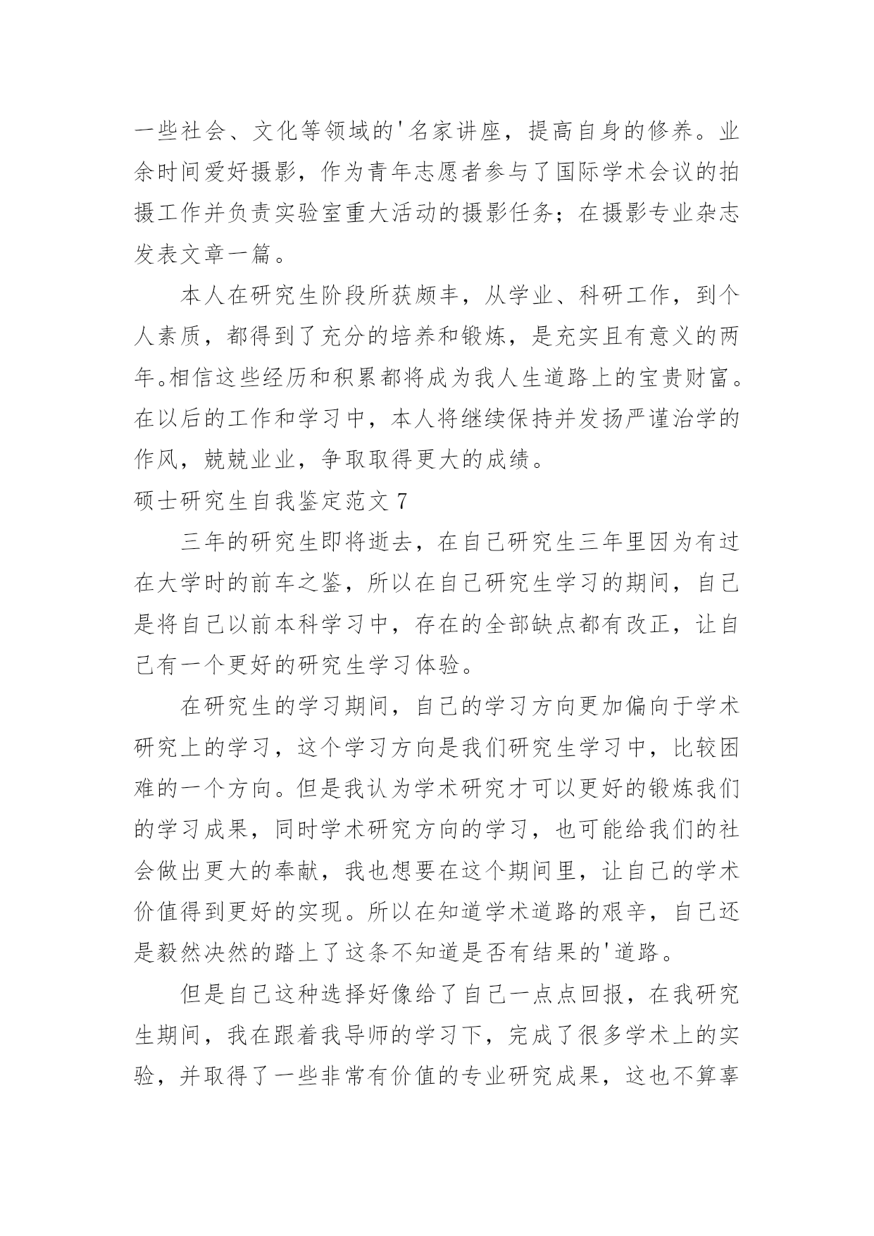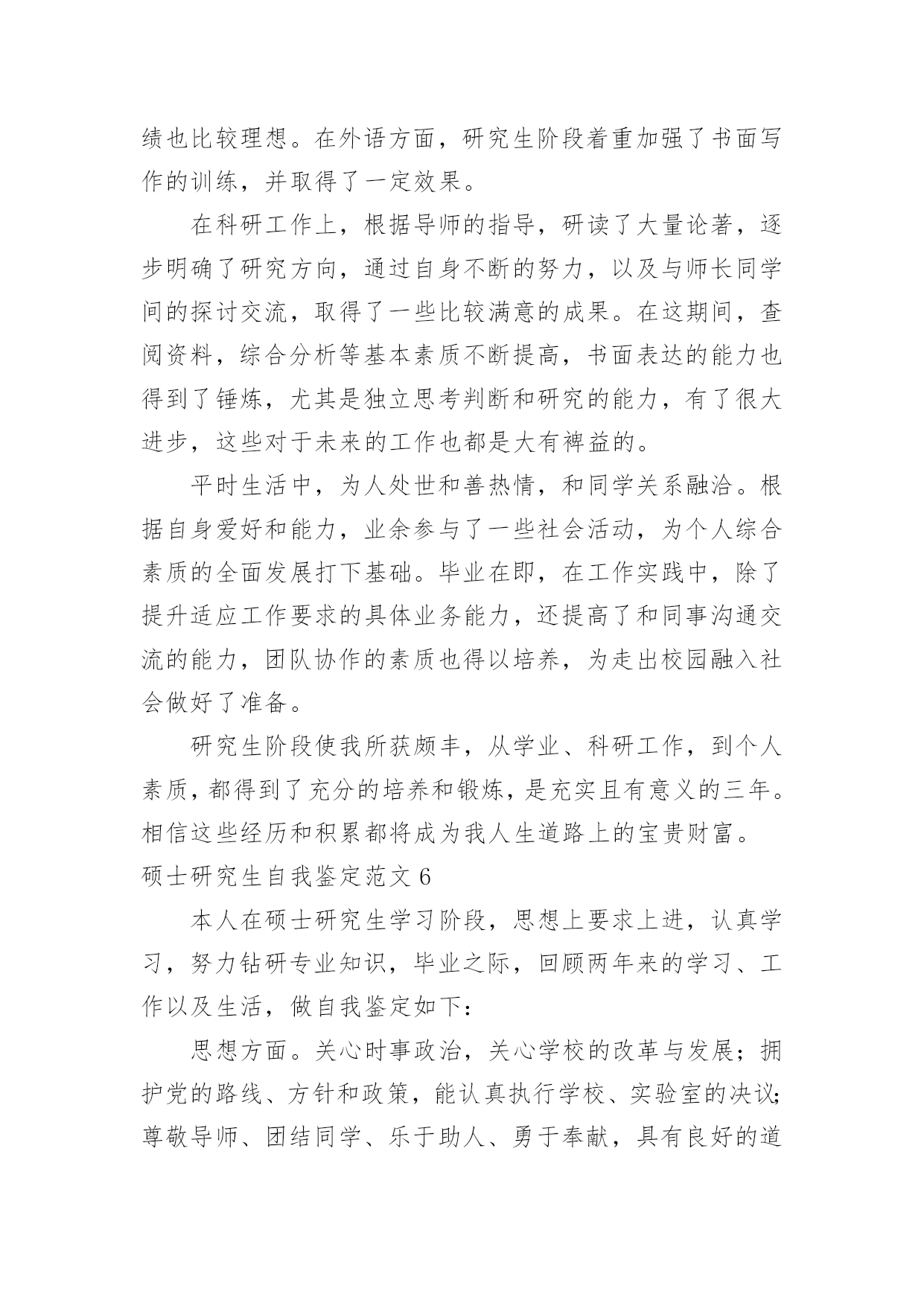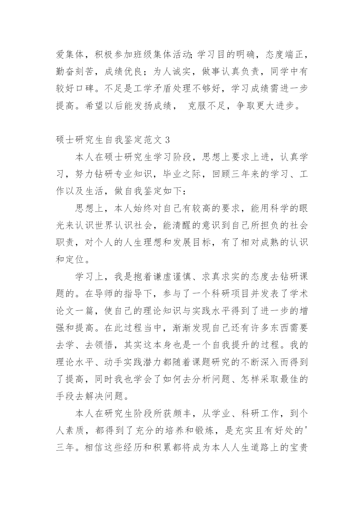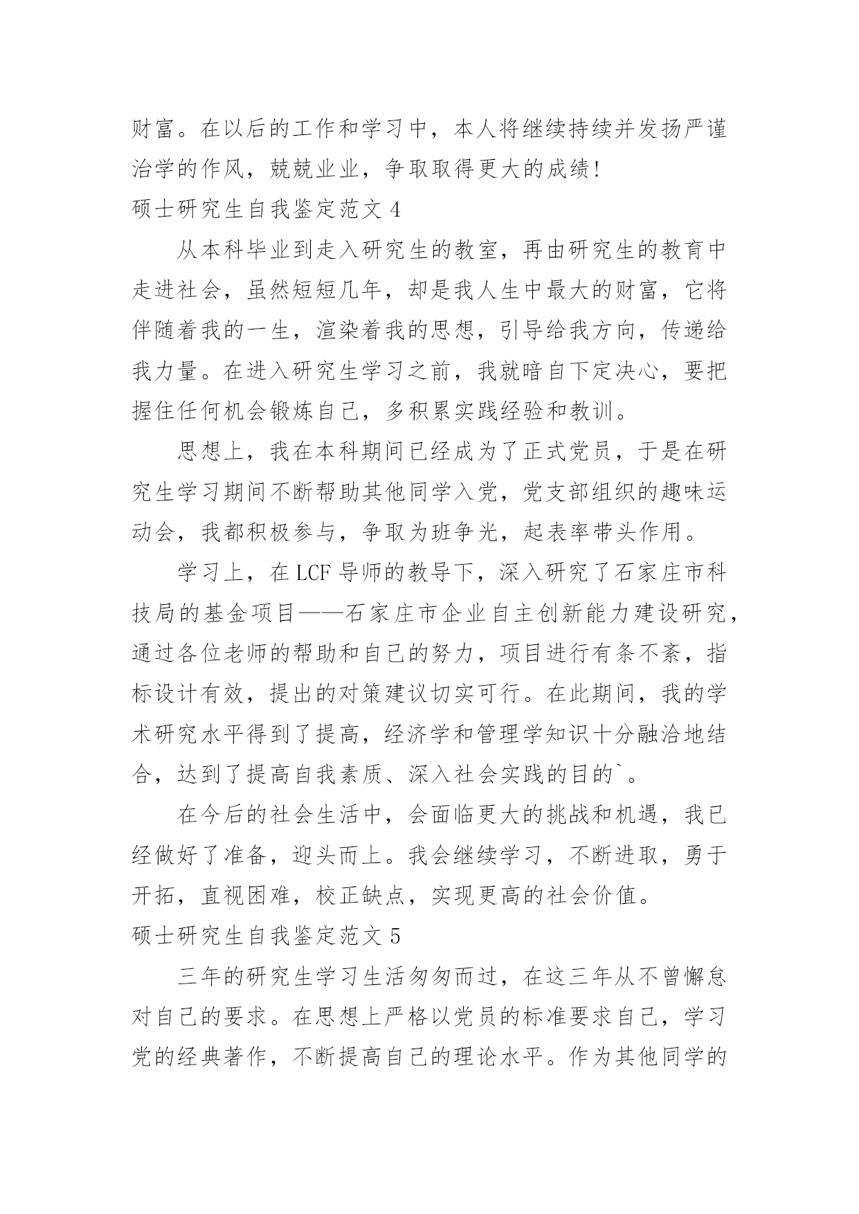 硕士研究生自我鉴定硕士研究生自我鉴定范文10篇自我鉴定是个人在一个阶段对自己的学习或工作生活的自我总结,自我鉴定能够提升我们的书面表达能力,因此我们要做好总结,写好自我鉴定。如何把自我鉴定做到重点突出呢?以下是小编为大家收集的硕士研究生自我鉴定范文,欢迎大家分享。硕士研究生自我鉴定范文1时间如白驹过隙,三年的研究生生活转迅即失。在毕业之际,回首这三年走过的路,收获颇多,总的说起来有以下几点:在政治上、思想上我一直积极要求进步。我是在20xx年5月光荣地成为了一名预备党员,在进入华南农业大学后,通过本党支部同志的影响,带动,帮助,思想上有了更大的进步,并加深了我对建设有中国特色的社会主义理论和党的基本路线深刻的认识,进一步的树立了坚定的共产主义信念。经过党组织1年预备期的考察,于20xx年5月如期转为正式党员。在成为一名党员后我时刻牢记自己是一名党员,处处以身作则,以一名合格党员的要求严格规范自己的言行举止。在这次汶川大地震后能积极捐款,自愿缴纳特殊党费,贡献出自己的一份绵薄之力。在学习上,文化课的学习使我对本专业有了更深刻、更准确的认识;查阅相关的文献和资料使我对专业的相关进展有了更加清晰的了解;在不断的学习中,积累了知识和经验;在平常的实验中,提高了动手技能;在导师的.指导下,积极参与各项教学科研活动,在课题的研究过程中,对相关的领域有了全面而具体的认知。专业课程的学习上,根据自身研究方向的要求,有针对性的认真研读了有关核心课程,为自己的科研工作打下扎实基础;并涉猎了一部分其他课程,开阔视野,对本人研究方向的应用背景以及整个学科的结构有了宏观的认识。在英语学习方面,通过了国家英语六级考试,具备了较强的英语听说能力。在生活中,我积极参加各项集体活动,同学之间和睦相处,关系融洽。平常注意锻炼身体,参加丰富多彩的各种体育活动,如篮球,乒乓球等。保持朴素的生活作风,注意节俭,抵制各种浪费行为。提高自身修养,从小事做起严格要求自己。在硕士研究生期间,无论是在思想上、个人素质上还是在学业上我都有了长足的进步,是充实且有意义的三年。我相信在这三年当中所得到的培养和锻炼将是我人生当中的一笔不可多的财富。在今后的工作当中我将继续保持并发扬这些优点,以取得更大的成绩。硕士研究生自我鉴定范文2该同学政治立场坚定,思想纯洁,有一定奉献精神,党员的先锋模范作用发挥比较好。能自觉遵守《学生行为准则》和学校的'各项规章制度,尊敬师长,团结、关心同学,热爱集体,积极参加班级集体活动;学习目的明确,态度端正,勤奋刻苦,成绩优良;为人诚实,做事认真负责,同学中有较好口碑。不足是工学矛盾处理不够好,学习成绩需进一步提高。希望以后能发扬成绩,克服不足,争取更大进步。硕士研究生自我鉴定范文3本人在硕士研究生学习阶段,思想上要求上进,认真学习,努力钻研专业知识,毕业之际,回顾三年来的学习、工作以及生活,做自我鉴定如下:思想上,本人始终对自己有较高的要求,能用科学的眼光来认识世界认识社会,能清醒的意识到自己所担负的社会职责,对个人的人生理想和发展目标,有了相对成熟的认识和定位。学习上,我是抱着谦虚谨慎、求真求实的态度去钻研课题的。在导师的指导下,参与了一个科研项目并发表了学术论文一篇,使自己的理论知识与实践水平得到了进一步的增强和提高。在此过程当中,渐渐发现自己还有许多东西需要去学、去领悟,其实这本身也是一个自我提升的过程。我的理论水平、动手实践潜力都随着课题研究的不断深入而得到了提高,同时我也学会了如何去分析问题、怎样采取最佳的手段去解决问题。本人在研究生阶段所获颇丰,从学业、科研工作,到个人素质,都得到了充分的培养和锻炼,是充实且有好处的'三年。相信这些经历和积累都将成为本人人生道路上的宝贵财富。在以后的工作和学习中,本人将继续持续并发扬严谨治学的作风,兢兢业业,争取取得更大的成绩!硕士研究生自我鉴定范文4从本科毕业到走入研究生的教室,再由研究生的教育中走进社会,虽然短短几年,却是我人生中最大的财富,它将伴随着我的一生,渲染着我的思想,引导给我方向,传递给我力量。在进入研究生学习之前,我就暗自下定决心,要把握住任何机会锻炼自己,多积累实践经验和教训。思想上,我在本科期间已经成为了正式党员,于是在研究生学习期间不断帮助其他同学入党,党支部组织的趣味运动会,我都积极参与,争取为班争光,起表率带头作用。学习上,在LCF导师的教导下,深入研究了石家庄市科技局的基金项目——石家庄市企业自主创新能力建设研究,通过各位老师的帮助和自己的努力,项目进行有条不紊,指标设计有效,提出的对策建议切实可行。在此期间,我的学术研究水平得到了提高,经济学和管理学知识十分融洽地结合,达到了提高自我素质、深入社会实践的目的`。在今后的社会生活中,会面临更大的挑战和机遇,我已经做好了准备,迎头而
