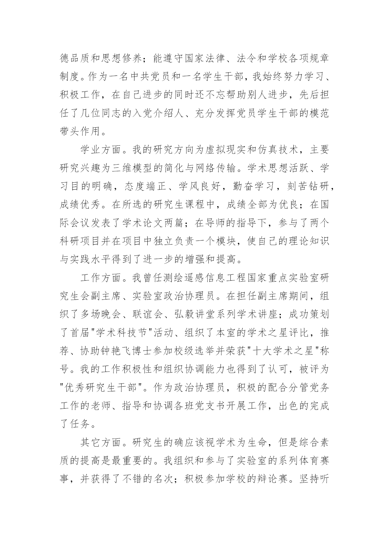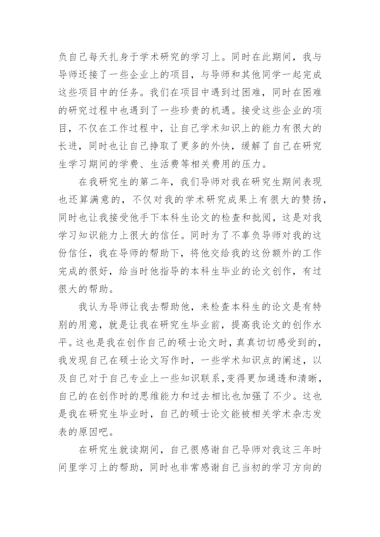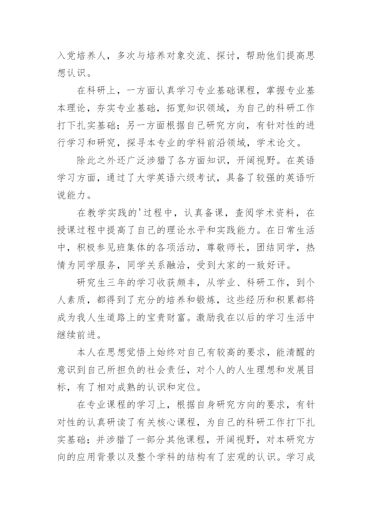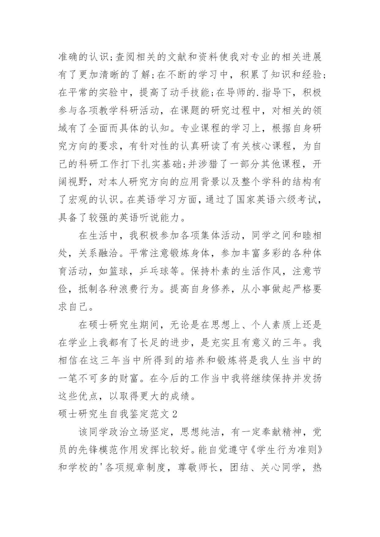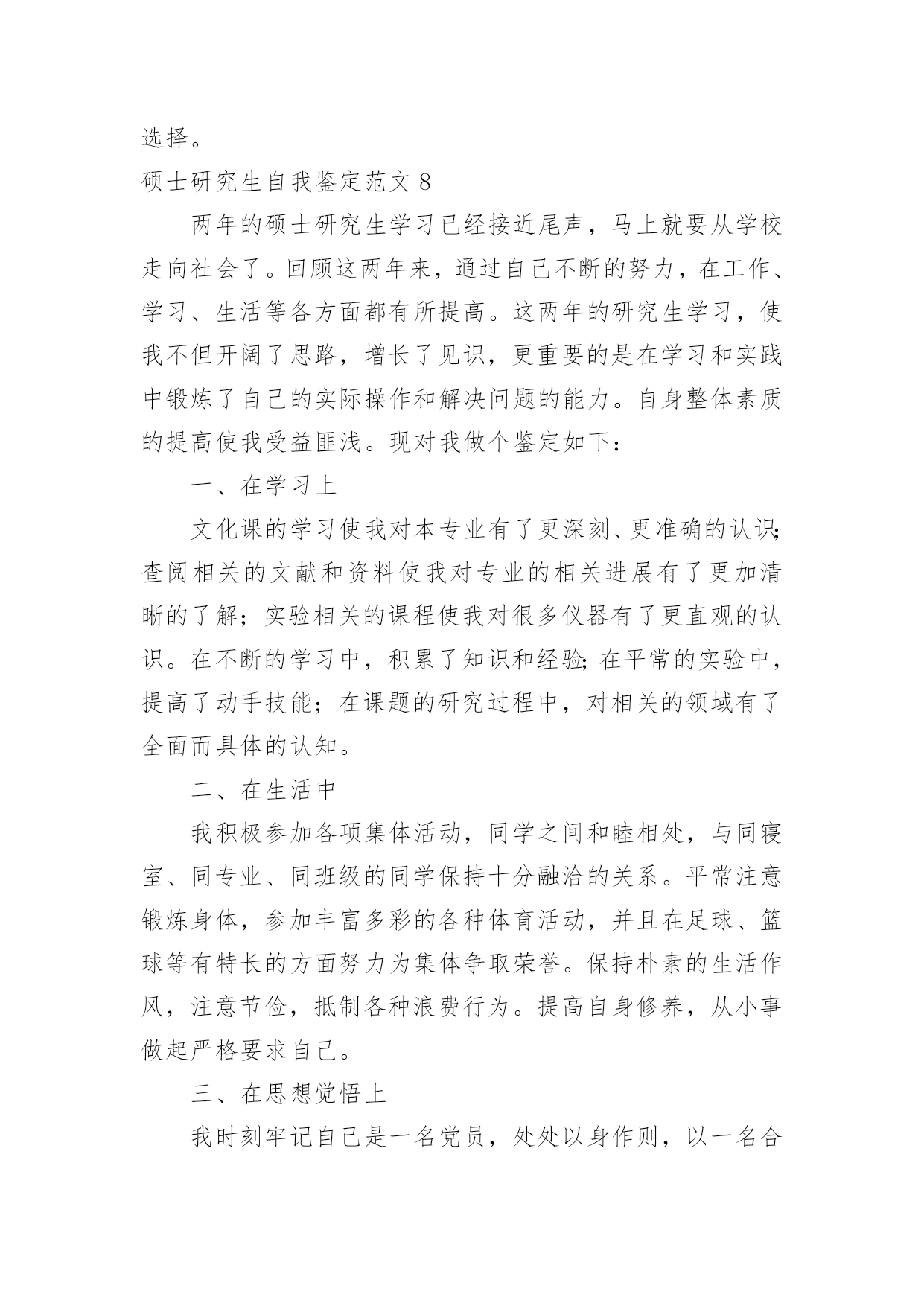 硕士研究生自我鉴定硕士研究生自我鉴定范文10篇自我鉴定是个人在一个阶段对自己的学习或工作生活的自我总结,自我鉴定能够提升我们的书面表达能力,因此我们要做好总结,写好自我鉴定。如何把自我鉴定做到重点突出呢?以下是小编为大家收集的硕士研究生自我鉴定范文,欢迎大家分享。硕士研究生自我鉴定范文1时间如白驹过隙,三年的研究生生活转迅即失。在毕业之际,回首这三年走过的路,收获颇多,总的说起来有以下几点:在政治上、思想上我一直积极要求进步。我是在20xx年5月光荣地成为了一名预备党员,在进入华南农业大学后,通过本党支部同志的影响,带动,帮助,思想上有了更大的进步,并加深了我对建设有中国特色的社会主义理论和党的基本路线深刻的认识,进一步的树立了坚定的共产主义信念。经过党组织1年预备期的考察,于20xx年5月如期转为正式党员。在成为一名党员后我时刻牢记自己是一名党员,处处以身作则,以一名合格党员的要求严格规范自己的言行举止。在这次汶川大地震后能积极捐款,自愿缴纳特殊党费,贡献出自己的一份绵薄之力。在学习上,文化课的学习使我对本专业有了更深刻、更准确的认识;查阅相关的文献和资料使我对专业的相关进展有了更加清晰的了解;在不断的学习中,积累了知识和经验;在平常的实验中,提高了动手技能;在导师的.指导下,积极参与各项教学科研活动,在课题的研究过程中,对相关的领域有了全面而具体的认知。专业课程的学习上,根据自身研究方向的要求,有针对性的认真研读了有关核心课程,为自己的科研工作打下扎实基础;并涉猎了一部分其他课程,开阔视野,对本人研究方向的应用背景以及整个学科的结构有了宏观的认识。在英语学习方面,通过了国家英语六级考试,具备了较强的英语听说能力。在生活中,我积极参加各项集体活动,同学之间和睦相处,关系融洽。平常注意锻炼身体,参加丰富多彩的各种体育活动,如篮球,乒乓球等。保持朴素的生活作风,注意节俭,抵制各种浪费行为。提高自身修养,从小事做起严格要求自己。在硕士研究生期间,无论是在思想上、个人素质上还是在学业上我都有了长足的进步,是充实且有意义的三年。我相信在这三年当中所得到的培养和锻炼将是我人生当中的一笔不可多的财富。在今后的工作当中我将继续保持并发扬这些优点,以取得更大的成绩。硕士研究生自我鉴定范文2该同学政治立场坚定,思想纯洁,有一定奉献精神,党员的先锋模范作用发挥比较好。能自觉遵守《学生行为准则》和学校的'各项规章制度,尊敬师长,团结、关心同学,热爱集体,积极参加班级集体活动;学习目的明确,态度端正,勤奋刻苦,成绩优良;为人诚实,做事认真负责,同学中有较好口碑。不足是工学矛盾处理不够好,学习成绩需进一步提高。希望以后能发扬成绩,克服不足,争取更大进步。硕士研究生自我鉴定范文3本人在硕士研究生学习阶段,思想上要求上进,认真学习,努力钻研专业知识,毕业之际,回顾三年来的学习、工作以及生活,做自我鉴定如下:思想上,本人始终对自己有较高的要求,能用科学的眼光来认识世界认识社会,能清醒的意识到自己所担负的社会职责,对个人的人生理想和发展目标,有了相对成熟的认识和定位。学习上,我是抱着谦虚谨慎、求真求实的态度去钻研课题的。在导师的指导下,参与了一个科研项目并发表了学术论文一篇,使自己的理论知识与实践水平得到了进一步的增强和提高。在此过程当中,渐渐发现自己还有许多东西需要去学、去领悟,其实这本身也是一个自我提升的过程。我的理论水平、动手实践潜力都随着课题研究的不断深入而得到了提高,同时我也学会了如何去分析问题、怎样采取最佳的手段去解决问题。本人在研究生阶段所获颇丰,从学业、科研工作,到个人素质,都得到了充分的培养和锻炼,是充实且有好处的'三年。相信这些经历和积累都将成为本人人生道路上的宝贵财富。在以后的工作和学习中,本人将继续持续并发扬严谨治学的作风,兢兢业业,争取取得更大的成绩!硕士研究生自我鉴定范文4从本科毕业到走入研究生的教室,再由研究生的教育中走进社会,虽然短短几年,却是我人生中最大的财富,它将伴随着我的一生,渲染着我的思想,引导给我方向,传递给我力量。在进入研究生学习之前,我就暗自下定决心,要把握住任何机会锻炼自己,多积累实践经验和教训。思想上,我在本科期间已经成为了正式党员,于是在研究生学习期间不断帮助其他同学入党,党支部组织的趣味运动会,我都积极参与,争取为班争光,起表率带头作用。学习上,在LCF导师的教导下,深入研究了石家庄市科技局的基金项目——石家庄市企业自主创新能力建设研究,通过各位老师的帮助和自己的努力,项目进行有条不紊,指标设计有效,提出的对策建议切实可行。在此期间,我的学术研究水平得到了提高,经济学和管理学知识十分融洽地结合,达到了提高自我素质、深入社会实践的目的`。在今后的社会生活中,会面临更大的挑战和机遇,我已经做好了准备,迎头而