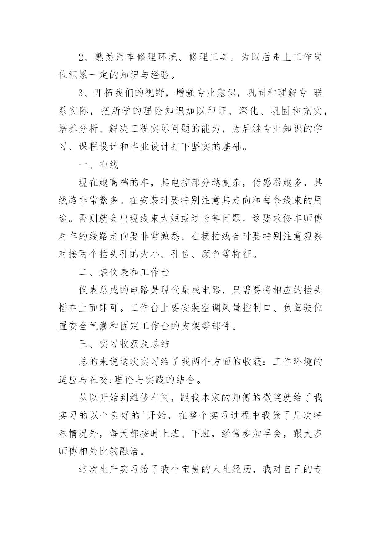 汽车维修实习心得汽车维修实习心得当我们受到启发,对生活有了新的感悟时,就十分有必须要写一篇心得体会,如此就可以提升我们写作能力了。是不是无从下笔、没有头绪?下面是小编收集整理的汽车维修实习心得,欢迎阅读,希望大家能够喜欢。汽车维修实习心得120xx年7月,我在东风雪铁龙4S店进行电工实习。在这一年的时间里,我对汽车维修服务站的整车销售、零部件供应、售后服务、维修以及信息反馈等有了一定的了解和深刻体会。东风雪铁龙销售服务有限公司是一个拥有东风雪铁龙定点、配套直接提供的一流维修设备:举升机、轮胎动平衡机、车身校正架、烤漆房等,使用于维修业务的计算机网络。宽敞、整洁的业务接待大厅,宽敞的维修车间,设置24个标准工位充分满足维修作业的需要。规格齐全,优质纯正的配件是雪铁龙系列车辆运行的安全保证。东风雪铁龙销售服务有限公司是一个大型的四S店,销售服务的车型有富康、爱丽舍,赛纳,世嘉,萨拉毕加索,凯旋、C2,C4,C5,共九种车型。1、通过生产实习加深对汽车专业在国民经济中所处地位和作用的认识,巩固专业思想,激发学习热情。2、熟悉汽车修理环境、修理工具。为以后走上工作岗位积累一定的知识与经验。3、开拓我们的视野,增强专业意识,巩固和理解专联系实际,把所学的理论知识加以印证、深化、巩固和充实,培养分析、解决工程实际问题的能力,为后继专业知识的学习、课程设计和毕业设计打下坚实的基础。一、布线现在越高档的车,其电控部分越复杂,传感器越多,其线路非常繁多。在安装时要特别注意其走向和每条线束的用途。否则就会出现线束太短或过长等问题。这要求修车师傅对车的线路走向要非常熟悉。在接插线合时要特别注意观察对接两个插头孔的大小、孔位、颜色等特征。二、装仪表和工作台仪表总成的电路是现代集成电路,只需要将相应的插头插在上面即可。工作台上要安装空调风量控制口、负驾驶位置安全气囊和固定工作台的支架等部件。三、实习收获及总结总的来说这次实习给了我两个方面的收获:工作环境的适应与社交;理论与实践的结合。从以开始到维修车间,跟我本家的师傅的微笑就给了我实习的以个良好的'开始,在整个实习过程中我除了几次特殊情况外,每天都按时上班、下班,经常参加早会,跟大多师傅相处比较融洽。这次生产实习给了我个宝贵的人生经历,我对自己的专业有了更为详尽而深刻的了解,也是对这几年大学里所学知识的巩固与运用。在实习中我的理论同实践进行真实地接触,思维和现实有了结合点。这些都对我的观念起着或潜移默化或震撼的作用。从这次实习中,我体会到了实际的工作与书本上的知识是有一定距离的,并且需要进一步的再学习。但这短短的3周实习时间远远不能够对一个行业做深入地了解,对专业技能有较大的提高,所学所见都是肤浅的、粗略的。实习中也让我对自己的众多不足有了一个清洗的认识:做事不够踏实沉稳,社交能力有较大的提升空间,专业英语不够扎实。汽车维修实习心得2我在汽车公司的实习即将结束了,通过这段时间的实习工作,使我自身在专业上知识和其它各方面都有了长足的进步,通过实习工作我对汽车有了更深刻的了解,通过工作使我得以迈进更高的汽车行业的门槛,走上汽车开发这条道路,从此努力成为一个优秀的汽车人。可能有很多人工作在汽车行业,但并不是每个人都机会去拆车,公司花费了大量的人力、财力和物力,为我们提供了十分难得的拆车的机会,为我们的迅速成长提供了良好的条件,我想每一位新员工都该对公司的付出表示感谢,对作为技术中心的成员感到自豪和骄傲。在拆车的过程当中我得到了督导、指导老师以及很多同事的帮助,每次有不懂的地方他们总是细致耐心的解答,在那里只要你用心去发现去学习总能学到很多知识,可以搞懂很多看书看不明白的问题,当然这主要要感谢那些热心帮助我的各位督导、指导老师和同事。通过拆车实习我收获了很多东西,了解了汽车的基本构造和基本知识,增强了团队合作精神,真正在工作中体会到了团队合作的重要性,同时也增强了积极面对和克服困难以及吃苦耐劳的能力,为以后对工作的适应打下了比较好的基础。对于整车的拆解我们遵循着严格的流程,有着明确的分工,每个班分成三个组——主拆组、分拆组和数据登录组,这都对我们顺利的完成拆车实习起到了十分重要的作用。在正式的拆车之前我们首先对车辆的整车姿态进行了测量,对车辆的各个姿态进行拍照。在此之后有做了些拆车之前的准备工作,例如断电、放水和放油。之后我们进入了正式的拆解环节,在现场督导的指导下整车的拆解紧张而有序的进行。首先拆的是四门两盖,由于大多数同事没有拆车的经验,所以在拆的时候都没有找到技巧导致拆的比较慢。然后开始拆保险杠和翼子板。在拆车之前我一直都认为保险杠都是用金属等强度比较到的材料制造的,但是拆车的时候发现我们拆的车的保险杠是塑料的,感觉到有些难理解,保险杠是塑料的在汽车发生交通事故的时候又怎么起到保险的作用呢?通过别人
