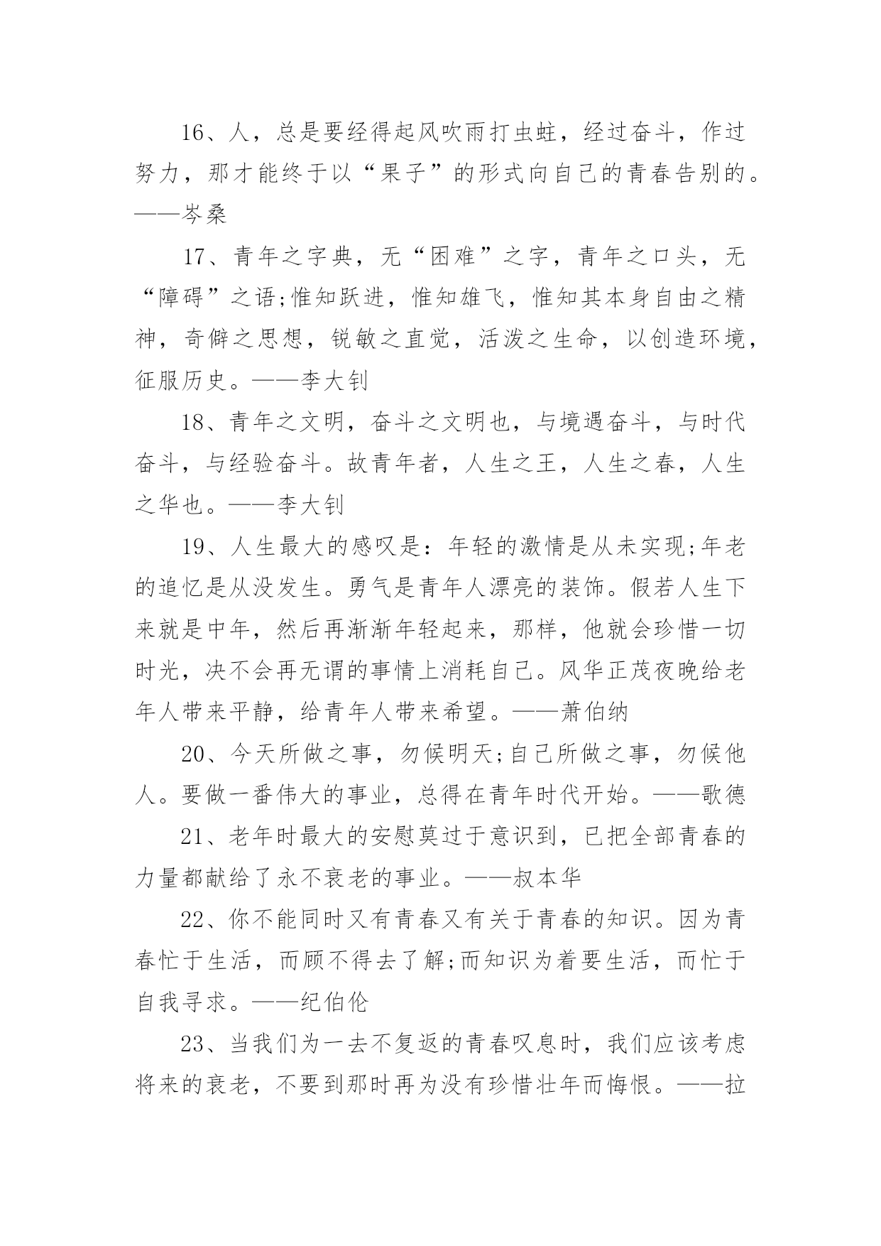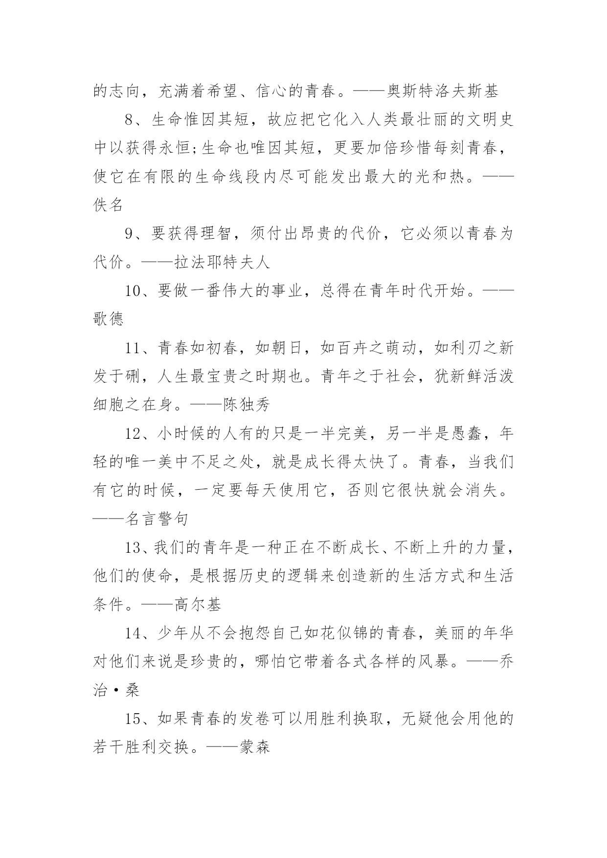 中考语文青春相关作文素材中考语文青春相关作文素材1、青春并不像一袭新衣,好像我们仔细少穿一点就可以保持簇新似的。青春,当我们有它的时候我们一定要每天穿用它,而它则很快就会消逝。——(英国)霍士脱2、少年人不会抱怨自己如花似锦的青春,美丽的年华对他们说来是珍贵的,哪怕它带着各式各样的风暴。3、人世间,比青春再可宝贵的东西实在没有,然而青春也最容易消逝。最可贵的东西却不甚为人所爱惜,最易消逝的东西却在促进它的消逝。谁能保持得永远的青春的,便是伟大的人。——(现代)郭沫若4、青年是我们的未来,是我们的希望。青年应当接替我们老年人。青年应当举起我们的旗帜直到胜利的终点。——斯大林5、人生难得是青春,要学汤铭日日新。但嘱加鞭须趁早,莫抛岁月负双亲。——袁玉冰6、人世间,比青春再可贵的东西实在没有,然而青春也最容易消逝。最可贵的东西却不甚为人们所爱惜,最易消逝的东西却在促使它的消逝。谁能保持永远的青春,便是伟大的人。——郭沫若7、生活赋予我们一种巨大的和无限高贵的礼品,这就是青春:充满着力量,充满着期待、志愿,充满求知和斗争的志向,充满着希望、信心的青春。——奥斯特洛夫斯基8、生命惟因其短,故应把它化入人类最壮丽的文明史中以获得永恒;生命也唯因其短,更要加倍珍惜每刻青春,使它在有限的生命线段内尽可能发出最大的光和热。——佚名9、要获得理智,须付出昂贵的代价,它必须以青春为代价。——拉法耶特夫人10、要做一番伟大的事业,总得在青年时代开始。——歌德11、青春如初春,如朝日,如百卉之萌动,如利刃之新发于硎,人生最宝贵之时期也。青年之于社会,犹新鲜活泼细胞之在身。——陈独秀12、小时候的人有的只是一半完美,另一半是愚蠢,年轻的唯一美中不足之处,就是成长得太快了。青春,当我们有它的时候,一定要每天使用它,否则它很快就会消失。——名言警句13、我们的青年是一种正在不断成长、不断上升的力量,他们的使命,是根据历史的逻辑来创造新的生活方式和生活条件。——高尔基14、少年从不会抱怨自己如花似锦的青春,美丽的年华对他们来说是珍贵的,哪怕它带着各式各样的风暴。——乔治·桑15、如果青春的发卷可以用胜利换取,无疑他会用他的若干胜利交换。——蒙森16、人,总是要经得起风吹雨打虫蛀,经过奋斗,作过努力,那才能终于以“果子”的形式向自己的青春告别的。——岑桑17、青年之字典,无“困难”之字,青年之口头,无“障碍”之语;惟知跃进,惟知雄飞,惟知其本身自由之精神,奇僻之思想,锐敏之直觉,活泼之生命,以创造环境,征服历史。——李大钊18、青年之文明,奋斗之文明也,与境遇奋斗,与时代奋斗,与经验奋斗。故青年者,人生之王,人生之春,人生之华也。——李大钊19、人生最大的感叹是:年轻的激情是从未实现;年老的追忆是从没发生。勇气是青年人漂亮的装饰。假若人生下来就是中年,然后再渐渐年轻起来,那样,他就会珍惜一切时光,决不会再无谓的事情上消耗自己。风华正茂夜晚给老年人带来平静,给青年人带来希望。——萧伯纳20、今天所做之事,勿候明天;自己所做之事,勿候他人。要做一番伟大的事业,总得在青年时代开始。——歌德21、老年时最大的安慰莫过于意识到,已把全部青春的力量都献给了永不衰老的事业。——叔本华22、你不能同时又有青春又有关于青春的知识。因为青春忙于生活,而顾不得去了解;而知识为着要生活,而忙于自我寻求。——纪伯伦23、当我们为一去不复返的青春叹息时,我们应该考虑将来的衰老,不要到那时再为没有珍惜壮年而悔恨。——拉布吕耶尔24、青春是人生最快乐的时光,但这种快乐往往完全是因为它充满着希望,而不是因为得到了什么或逃避了什么。——托·卡莱尔25、青春是有限的,智慧是无穷的,趁短的青春,去学习无穷的智慧。——高尔基