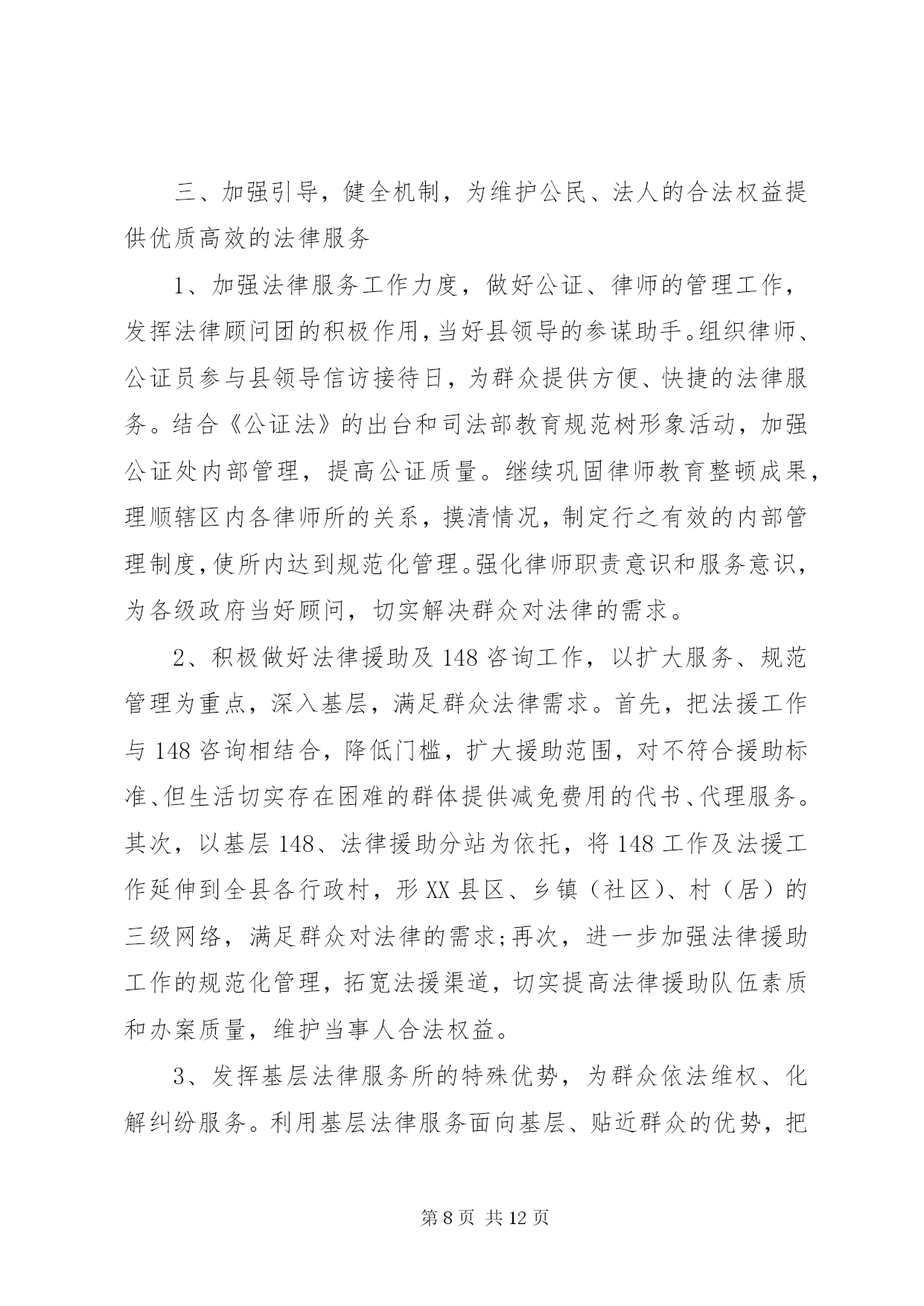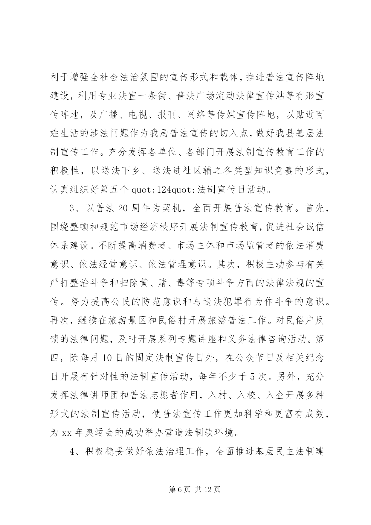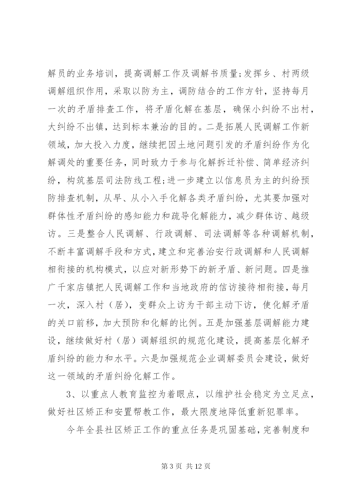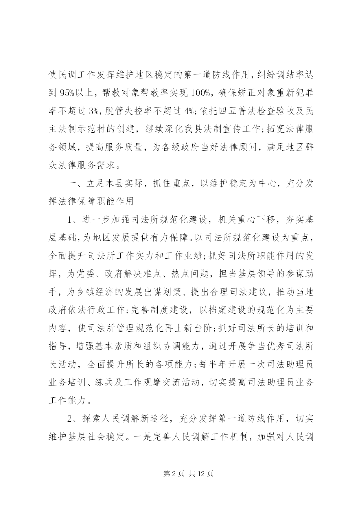 第PAGE\*Arabic\*MERGEFORMAT12页共NUMPAGES\*MERGEFORMAT12页20XX年地方司法局全年工作计划20xx年是继续深化贯彻党的xx大和xx届四中全会精神,提高党的执政能力,继续全面推进建设小康社会的重要一年,更是司法行政工作快速稳步发展的关键一年。我们本着与时俱进、开拓进取的精神,大胆尝试、勇于创新,以构建和谐延庆、促进全面协调发展为第一目标,努力创造一流的工作业绩;以维护稳定为第一职责,全力保障地区社会稳定大局;以服务发展为第一要务,促进地区法制建设健康发展;以人民满意为第一标准,全面提高司法行政队伍的政治业务素质,不断探索司法行政工作的新路子。20xx年我局的总体工作思路:以三个代表重要思想为指导,深入学习和贯彻党的xx大和xx届四中全会精神,全面落实科学发展观,把加强党的执政能力建设与司法行政职能工作相结合,提高机关工作效能,强化全员大局意识、责任意识、服务意识、效能意识,抓好整体队伍的形象工程,在各项职能工作中体现执法为民、服务发展的要求。加强基层基础工作,整合司法行政职能,重心下移,以抓典型带动全局工作,以创新求发展,以抓特色工作为切入点,提高全县司法行政工作水平,为构建和谐延庆提供有力的司法保障。我局20xx年工作具体目标是:加大人民调解、安置帮教及社区矫正等基层基础工作力度,使民调工作发挥维护地区稳定的第一道防线作用,纠纷调结率达到95%以上,帮教对象帮教率实现100%,确保矫正对象重新犯罪率不超过3%,脱管失控率不超过4%;依托四五普法检查验收及民主法制示范村的创建,继续深化我县法制宣传工作;拓宽法律服务领域,提高服务质量,为各级政府当好法律顾问,满足地区群众法律服务需求。一、立足本县实际,抓住重点,以维护稳定为中心,充分发挥法律保障职能作用1、进一步加强司法所规范化建设,机关重心下移,夯实基层基础,为地区发展提供有力保障。以司法所规范化建设为重点,全面提升司法所工作实力和工作业绩;抓好司法所职能作用的发挥,为党委、政府解决难点、热点问题,担当基层领导的参谋助手,为乡镇经济的发展出谋划策、提出合理司法建议,推动当地政府依法行政工作;完善制度建设,以档案建设的规范化为主要内容,使司法所管理规范化再上新台阶;抓好司法所长的培训和指导,增强基本素质和组织协调能力,通过开展争当优秀司法所长活动,全面提升所长的各项能力;每半年开展一次司法助理员业务培训、练兵及工作观摩交流活动,切实提高司法助理员业务工作能力。2、探索人民调解新途径,充分发挥第一道防线作用,切实维护基层社会稳定。一是完善人民调解工作机制,加强对人民调解员的业务培训,提高调解工作及调解书质量;发挥乡、村两级调解组织作用,采取以防为主,调防结合的工作方针,坚持每月一次的矛盾排查工作,将矛盾化解在基层,确保小纠纷不出村,大纠纷不出镇,达到标本兼治的目的。二是拓展人民调解工作新领域,加大投入力度,继续把因土地问题引发的矛盾纠纷作为化解调处的重要任务,同时致力于参与化解拆迁补偿、简单经济纠纷,构筑基层司法防线工程;进一步建立以信息员为主的纠纷预防排查机制,从早、从小入手化解各类矛盾纠纷,尤其要加强对群体性矛盾纠纷的感知能力和疏导化解能力,减少群体访、越级访。三是整合人民调解、行政调解、司法调解等各种调解机制,不断丰富调解手段和方式,建立和完善治安行政调解和人民调解相衔接的机构模式,以应对新形势下的新矛盾、新问题。四是推广千家店镇把人民调解工作和当地政府的信访接待相衔接,每月一次,深入村(居),变群众上访为干部主动下访,使化解矛盾的关口前移,加大预防和化解的比例。五是加强基层调解能力建设,继续做好村(居)调解组织的规范化建设,提高基层化解矛盾纠纷的能力和水平。六是加强规范企业调解委员会建设,做好这一领域的矛盾纠纷化解工作。3、以重点人教育监控为着眼点,以维护社会稳定为立足点,做好社区矫正和安置帮教工作,最大限度地降低重新犯罪率。今年全县社区矫正工作的重点任务是巩固基础,完善制度和程序,为矫正工作的推进提供保障。一是加强与相关单位的协调联系,强化对基层单位的业务指导,加强对社区矫正工作的调研力度,完善与矫正工作相配套的各项措施。尤其是要抓好XX县区社区矫正中心的建立和作用的发挥,整合相关单位和社会志愿者等社会力量的资源,建立社会公众参与社区矫正的组织机制。二是完善从接收到解除矫正的一整套制度,严格按照程序做好每一个环节;抓好业务培训和内部管理,以制度规范工作,以措施提高效果,以考评激励实绩,逐步使社区矫正工作运行规范。三是把工作重心放在重点人的管理教育和监控上,在思想教育上给予倾斜,勤走访、勤评估、勤分析,工作中实施分类管理、分阶段教育;尝试利用刑释解教人员对矫正对象开展思想教育,探索一条管理教育的新路