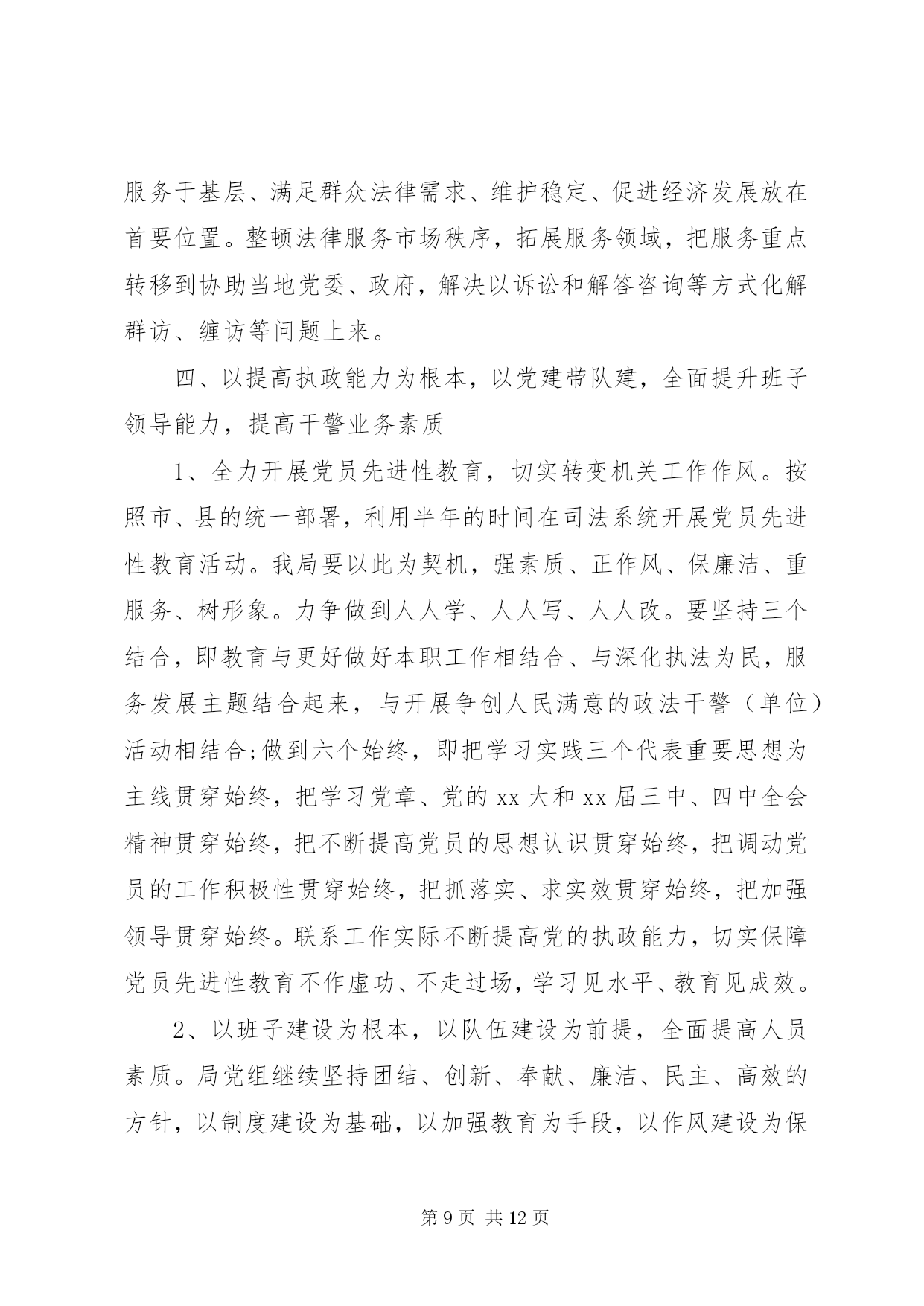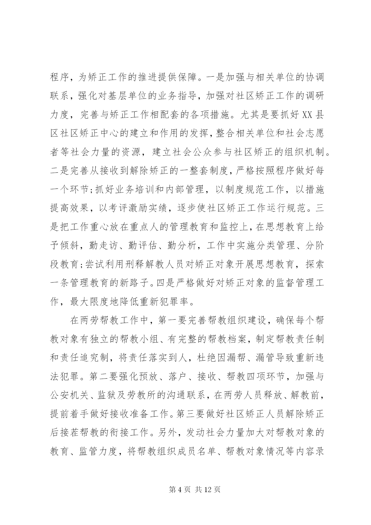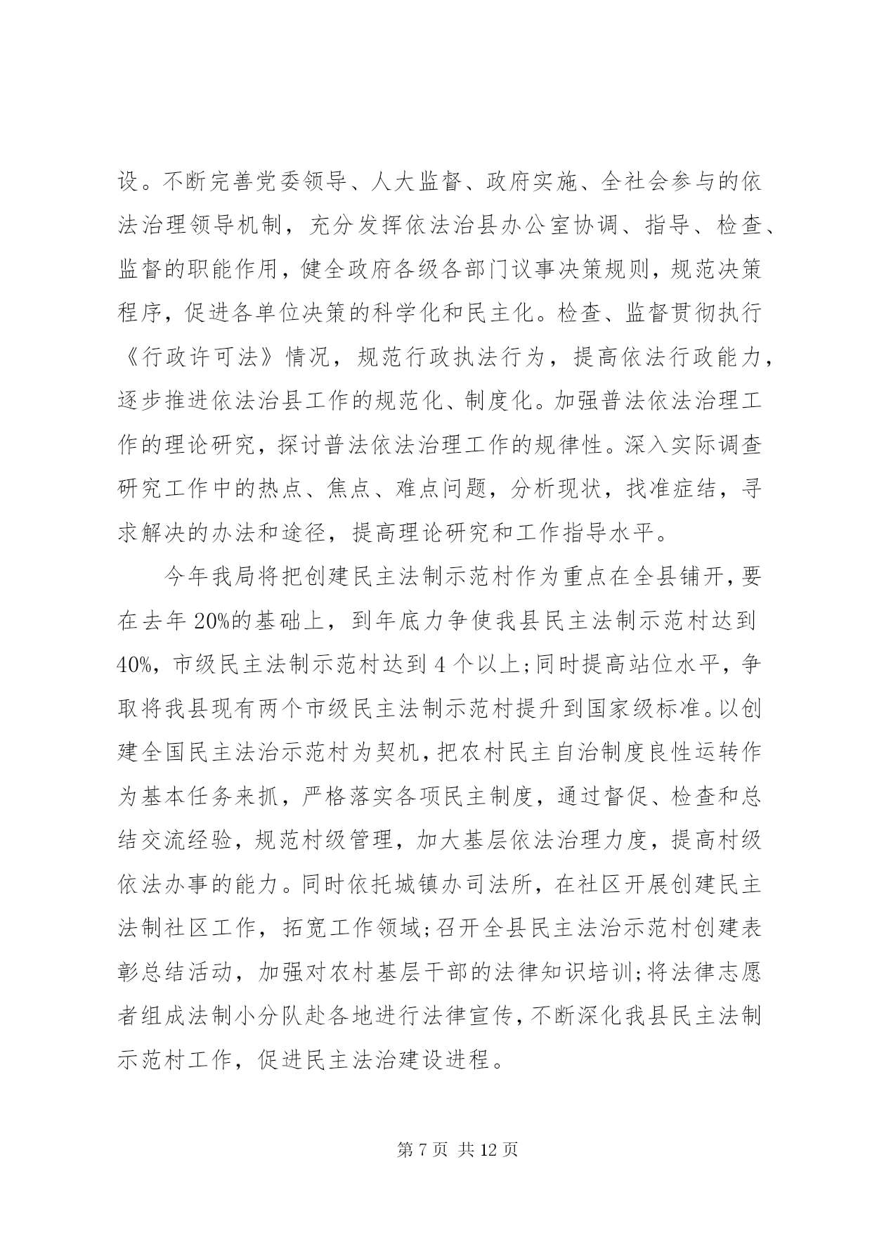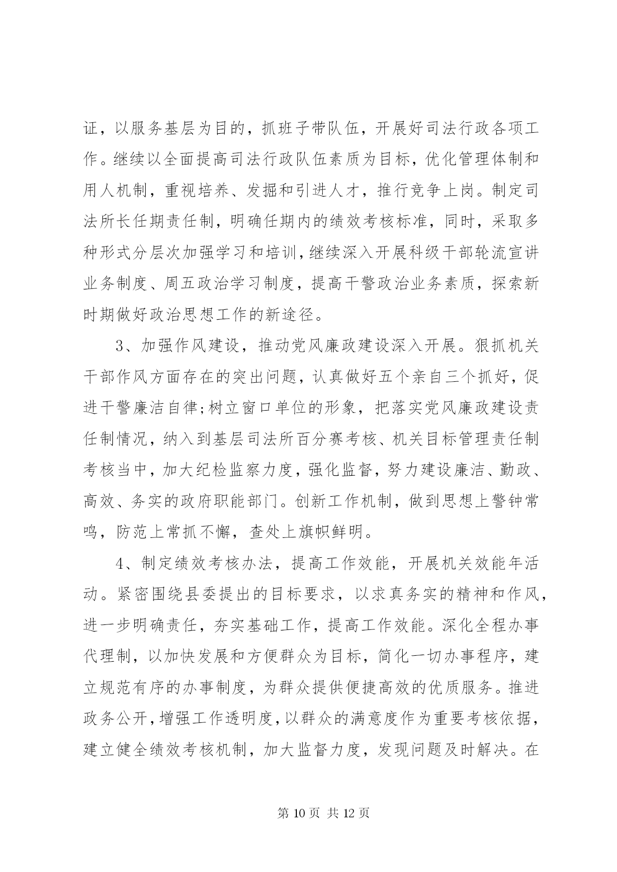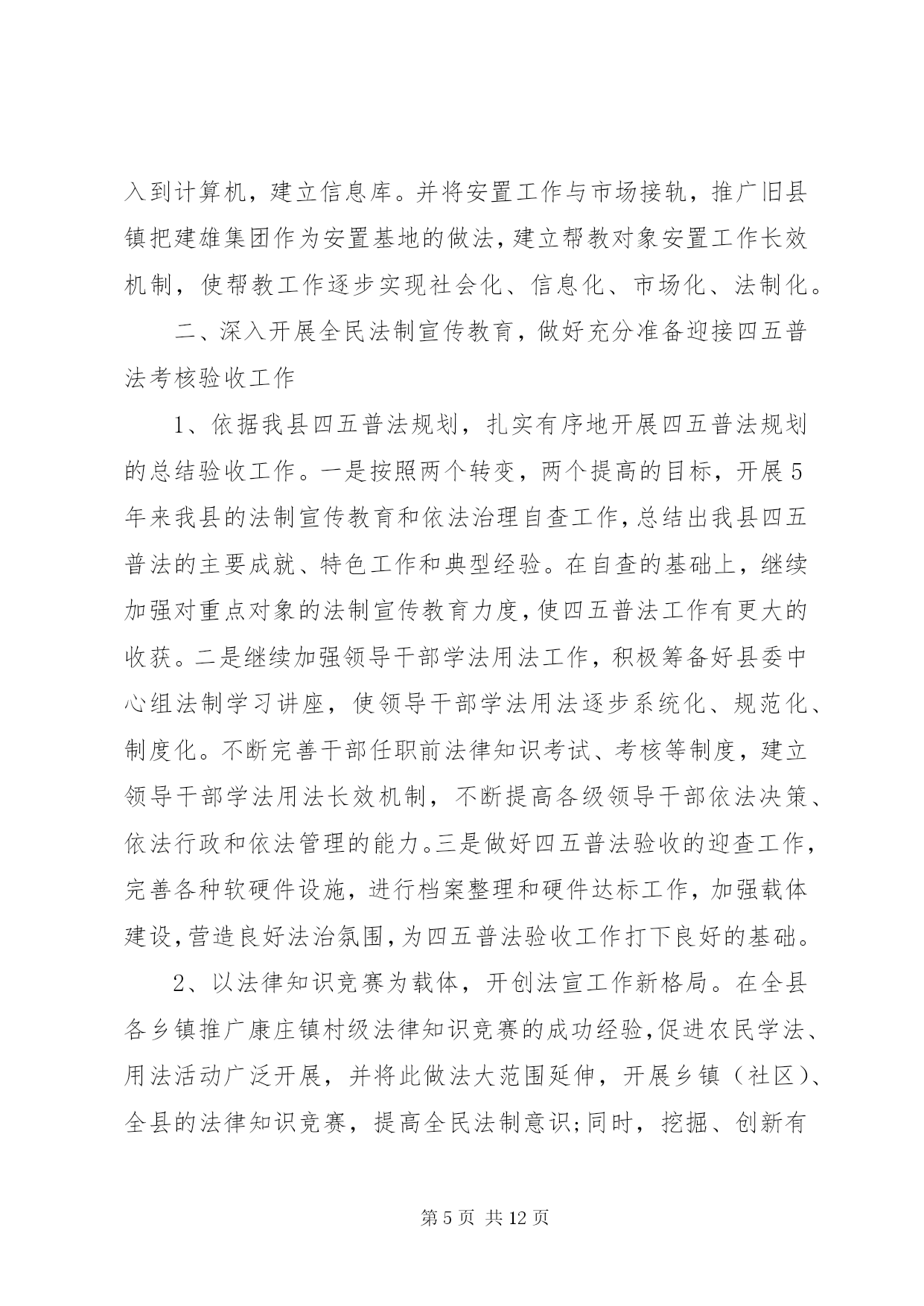第PAGE\*Arabic\*MERGEFORMAT12页共NUMPAGES\*MERGEFORMAT12页20XX年地方司法局全年工作计划20xx年是继续深化贯彻党的xx大和xx届四中全会精神,提高党的执政能力,继续全面推进建设小康社会的重要一年,更是司法行政工作快速稳步发展的关键一年。我们本着与时俱进、开拓进取的精神,大胆尝试、勇于创新,以构建和谐延庆、促进全面协调发展为第一目标,努力创造一流的工作业绩;以维护稳定为第一职责,全力保障地区社会稳定大局;以服务发展为第一要务,促进地区法制建设健康发展;以人民满意为第一标准,全面提高司法行政队伍的政治业务素质,不断探索司法行政工作的新路子。20xx年我局的总体工作思路:以三个代表重要思想为指导,深入学习和贯彻党的xx大和xx届四中全会精神,全面落实科学发展观,把加强党的执政能力建设与司法行政职能工作相结合,提高机关工作效能,强化全员大局意识、责任意识、服务意识、效能意识,抓好整体队伍的形象工程,在各项职能工作中体现执法为民、服务发展的要求。加强基层基础工作,整合司法行政职能,重心下移,以抓典型带动全局工作,以创新求发展,以抓特色工作为切入点,提高全县司法行政工作水平,为构建和谐延庆提供有力的司法保障。我局20xx年工作具体目标是:加大人民调解、安置帮教及社区矫正等基层基础工作力度,使民调工作发挥维护地区稳定的第一道防线作用,纠纷调结率达到95%以上,帮教对象帮教率实现100%,确保矫正对象重新犯罪率不超过3%,脱管失控率不超过4%;依托四五普法检查验收及民主法制示范村的创建,继续深化我县法制宣传工作;拓宽法律服务领域,提高服务质量,为各级政府当好法律顾问,满足地区群众法律服务需求。一、立足本县实际,抓住重点,以维护稳定为中心,充分发挥法律保障职能作用1、进一步加强司法所规范化建设,机关重心下移,夯实基层基础,为地区发展提供有力保障。以司法所规范化建设为重点,全面提升司法所工作实力和工作业绩;抓好司法所职能作用的发挥,为党委、政府解决难点、热点问题,担当基层领导的参谋助手,为乡镇经济的发展出谋划策、提出合理司法建议,推动当地政府依法行政工作;完善制度建设,以档案建设的规范化为主要内容,使司法所管理规范化再上新台阶;抓好司法所长的培训和指导,增强基本素质和组织协调能力,通过开展争当优秀司法所长活动,全面提升所长的各项能力;每半年开展一次司法助理员业务培训、练兵及工作观摩交流活动,切实提高司法助理员业务工作能力。2、探索人民调解新途径,充分发挥第一道防线作用,切实维护基层社会稳定。一是完善人民调解工作机制,加强对人民调解员的业务培训,提高调解工作及调解书质量;发挥乡、村两级调解组织作用,采取以防为主,调防结合的工作方针,坚持每月一次的矛盾排查工作,将矛盾化解在基层,确保小纠纷不出村,大纠纷不出镇,达到标本兼治的目的。二是拓展人民调解工作新领域,加大投入力度,继续把因土地问题引发的矛盾纠纷作为化解调处的重要任务,同时致力于参与化解拆迁补偿、简单经济纠纷,构筑基层司法防线工程;进一步建立以信息员为主的纠纷预防排查机制,从早、从小入手化解各类矛盾纠纷,尤其要加强对群体性矛盾纠纷的感知能力和疏导化解能力,减少群体访、越级访。三是整合人民调解、行政调解、司法调解等各种调解机制,不断丰富调解手段和方式,建立和完善治安行政调解和人民调解相衔接的机构模式,以应对新形势下的新矛盾、新问题。四是推广千家店镇把人民调解工作和当地政府的信访接待相衔接,每月一次,深入村(居),变群众上访为干部主动下访,使化解矛盾的关口前移,加大预防和化解的比例。五是加强基层调解能力建设,继续做好村(居)调解组织的规范化建设,提高基层化解矛盾纠纷的能力和水平。六是加强规范企业调解委员会建设,做好这一领域的矛盾纠纷化解工作。3、以重点人教育监控为着眼点,以维护社会稳定为立足点,做好社区矫正和安置帮教工作,最大限度地降低重新犯罪率。今年全县社区矫正工作的重点任务是巩固基础,完善制度和程序,为矫正工作的推进提供保障。一是加强与相关单位的协调联系,强化对基层单位的业务指导,加强对社区矫正工作的调研力度,完善与矫正工作相配套的各项措施。尤其是要抓好XX县区社区矫正中心的建立和作用的发挥,整合相关单位和社会志愿者等社会力量的资源,建立社会公众参与社区矫正的组织机制。二是完善从接收到解除矫正的一整套制度,严格按照程序做好每一个环节;抓好业务培训和内部管理,以制度规范工作,以措施提高效果,以考评激励实绩,逐步使社区矫正工作运行规范。三是把工作重心放在重点人的管理教育和监控上,在思想教育上给予倾斜,勤走访、勤评估、勤分析,工作中实施分类管理、分阶段教育;尝试利用刑释解教人员对矫正对象开展思想教育,探索一条管理教育的新路
