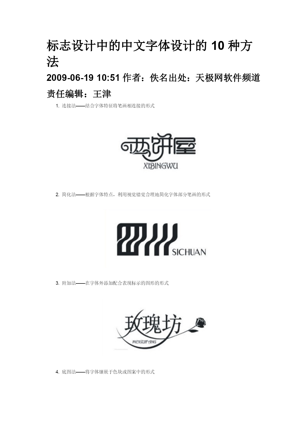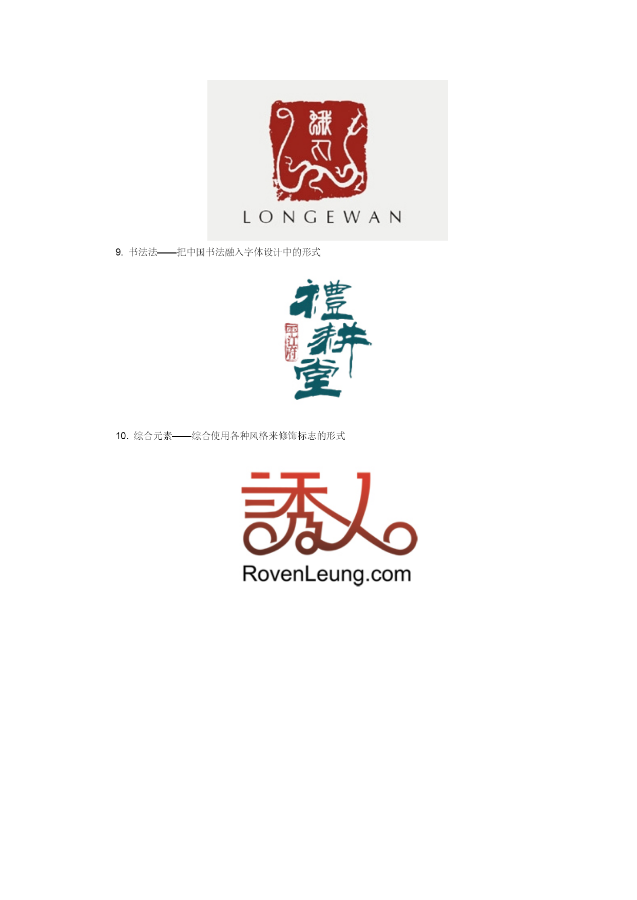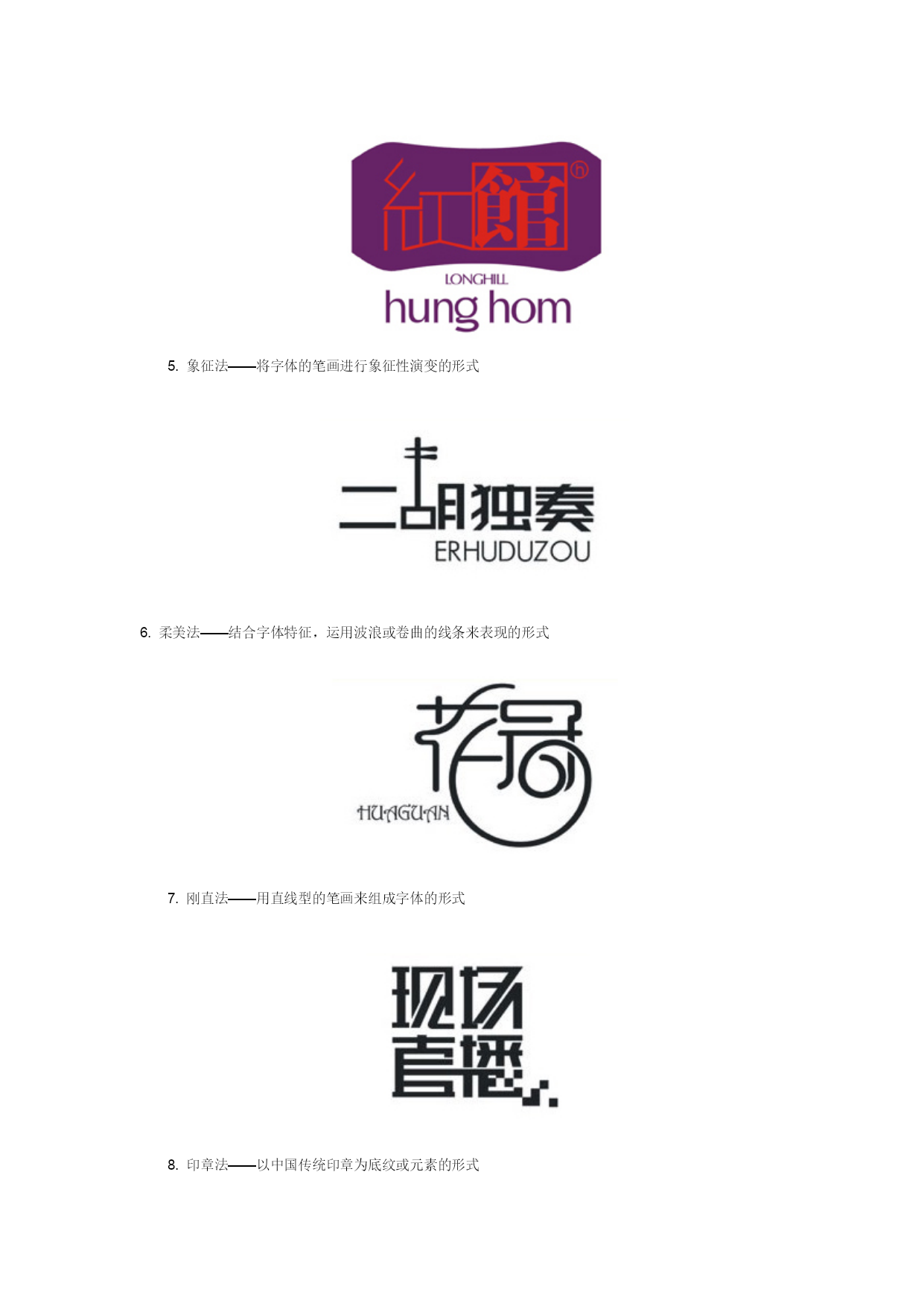 标志设计中的中文字体设计的10种方法2009-06-1910:51作者:佚名出处:天极网软件频道责任编辑:王津1.连接法——结合字体特征将笔画相连接的形式2.简化法——根据字体特点,利用视觉错觉合理地简化字体部分笔画的形式3.附加法——在字体外添加配合表现标示的图形的形式4.底图法——将字体镶嵌于色块或图案中的形式5.象征法——将字体的笔画进行象征性演变的形式6.柔美法——结合字体特征,运用波浪或卷曲的线条来表现的形式7.刚直法——用直线型的笔画来组成字体的形式8.印章法——以中国传统印章为底纹或元素的形式9.书法法——把中国书法融入字体设计中的形式10.综合元素——综合使用各种风格来修饰标志的形式