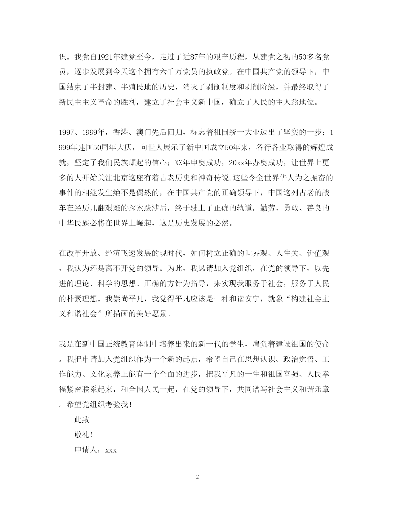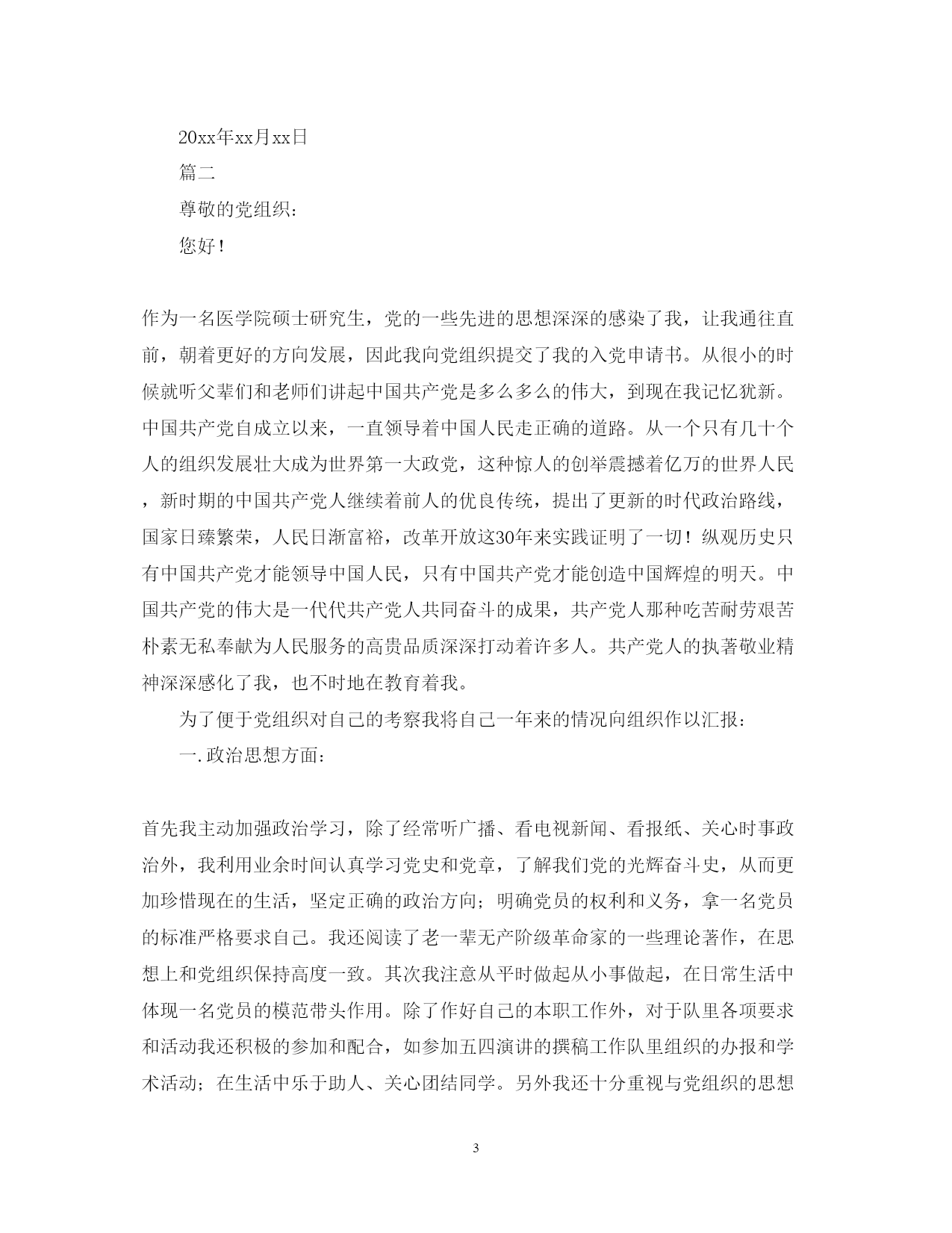 此资料由网络收集而来,如有侵权请告知上传者立即删除。资料共分享,我们负责传递知识。PAGEPAGE5在校研究生入党申请2020篇一尊敬的党组织:我要求加入中国共产党,愿意为共产主义而奋斗终生。作为一名研究生,考研复习期间我系统学习了马克思主义、毛泽东思想和邓小平理论,通过学习,我深刻领悟到社会的发展,社会意识形态的进步离不开先进思想的点拨和科学理论的引导。马克思主义传入中国在当时有着非常重要的意义。当时的中国是一个受封建统治两千多年的古老国家,封建愚昧根深蒂固,马克思主义象一阵清风,吹得死水起了微澜。它对物质意识关系的正确分析以及其科学的发展观、矛盾及普遍联系等观点如一剂醒脑药,将人们从封建愚昧中唤醒,指引人们用科学的世界观和方法论去重新认识这个世界。毛泽东思想是在长期反帝、反封建、反官僚资本主义的革命斗争中逐渐完善起来的科学理论,并最终指引中国取得革命的胜利。邓小平理论对中国经济的发展有着划时代的意义,社会主义本质论使人们摆脱了资/社争论的樊篱,最终认识到“归根到底,发展才是硬道理”这个真理。“三个有利于标准”的提出,更是为社会一切政治、经济的发展指明了方向。改革开放30年,使我们古老的国家焕发出了新的活力,在“建设有中国特色社会主义”科学思想的指引下,中国经济取得了令世界瞩目的长足进步。中国共产党提出“建设社会主义和谐社会”的思想,为全国人民描画出了一幅安定、祥和、富强、发展的美好愿景。“科学发展观”的提出预示着中国将走向更加人性化、理性化的发展道路。研究生在学期间我参加了业余党校的学习,使我对中国共产党有了更为全面的认识。我党自1921年建党至今,走过了近87年的艰辛历程,从建党之初的50多名党员,逐步发展到今天这个拥有六千万党员的执政党。在中国共产党的领导下,中国结束了半封建、半殖民地的历史,消灭了剥削制度和剥削阶级,并最终取得了新民主主义革命的胜利,建立了社会主义新中国,确立了人民的主人翁地位。1997、1999年,香港、澳门先后回归,标志着祖国统一大业迈出了坚实的一步;1999年建国50周年大庆,向世人展示了新中国成立50年来,各行各业取得的辉煌成就,坚定了我们民族崛起的信心;XX年申奥成功,20xx年办奥成功,让世界上更多的人开始关注北京这座有着古老历史和神奇传说.这些令全世界华人为之振奋的事件的相继发生绝不是偶然的,在中国共产党的正确领导下,中国这列古老的战车在经历几翻艰难的探索跋涉后,终于驶上了正确的轨道,勤劳、勇敢、善良的中华民族必将在世界上崛起,这是历史发展的必然。在改革开放、经济飞速发展的现时代,如何树立正确的世界观、人生关、价值观,我认为还是离不开党的领导。为此,我恳请加入党组织,在党的领导下,以先进的理论、科学的思想、正确的方针为指导,来实现我服务于社会,服务于人民的朴素理想。我崇尚平凡,我觉得平凡应该是一种和谐安宁,就象“构建社会主义和谐社会”所描画的美好愿景。我是在新中国正统教育体制中培养出来的新一代的学生,肩负着建设祖国的使命。我把申请加入党组织作为一个新的起点,希望自己在思想认识、政治觉悟、工作能力、文化素养上能有一个全面的进步,把我平凡的一生和祖国富强、人民幸福紧密联系起来,和全国人民一起,在党的领导下,共同谱写社会主义和谐乐章。希望党组织考验我!此致敬礼!申请人:xxx20xx年xx月xx日篇二尊敬的党组织:您好!作为一名医学院硕士研究生,党的一些先进的思想深深的感染了我,让我通往直前,朝着更好的方向发展,因此我向党组织提交了我的入党申请书。从很小的时候就听父辈们和老师们讲起中国共产党是多么多么的伟大,到现在我记忆犹新。中国共产党自成立以来,一直领导着中国人民走正确的道路。从一个只有几十个人的组织发展壮大成为世界第一大政党,这种惊人的创举震撼着亿万的世界人民,新时期的中国共产党人继续着前人的优良传统,提出了更新的时代政治路线,国家日臻繁荣,人民日渐富裕,改革开放这30年来实践证明了一切!纵观历史只有中国共产党才能领导中国人民,只有中国共产党才能创造中国辉煌的明天。中国共产党的伟大是一代代共产党人共同奋斗的成果,共产党人那种吃苦耐劳艰苦朴素无私奉献为人民服务的高贵品质深深打动着许多人。共产党人的执著敬业精神深深感化了我,也不时地在教育着我。为了便于党组织对自己的考察我将自己一年来的情况向组织作以汇报:一.政治思想方面:首先我主动加强政治学习,除了经常听广播、看电视新闻、看报纸、关心时事政治外,我利用业余时间认真学习党史和党章,了解我们党的光辉奋斗史,从而更加珍惜现在的生活,坚定正确的政治方向;明确党员的权利和义务,拿一名党员的标准严格要求自己。我还阅读了老一辈无产阶级革命家的一些理论著作,在思想上和党组织保持高度一致。其次我