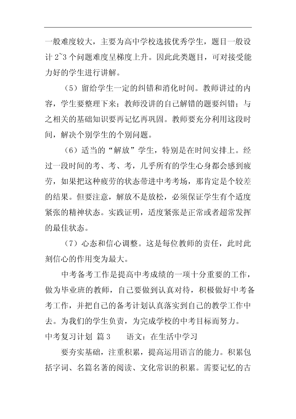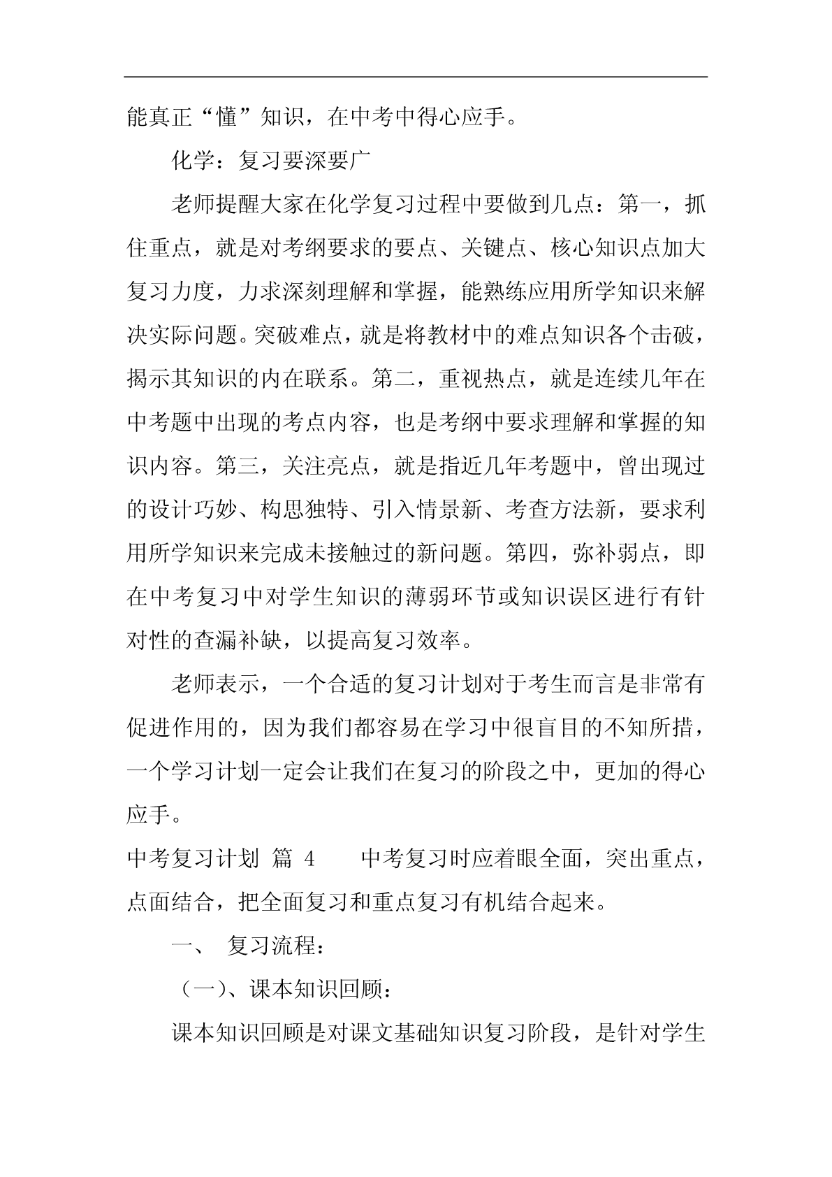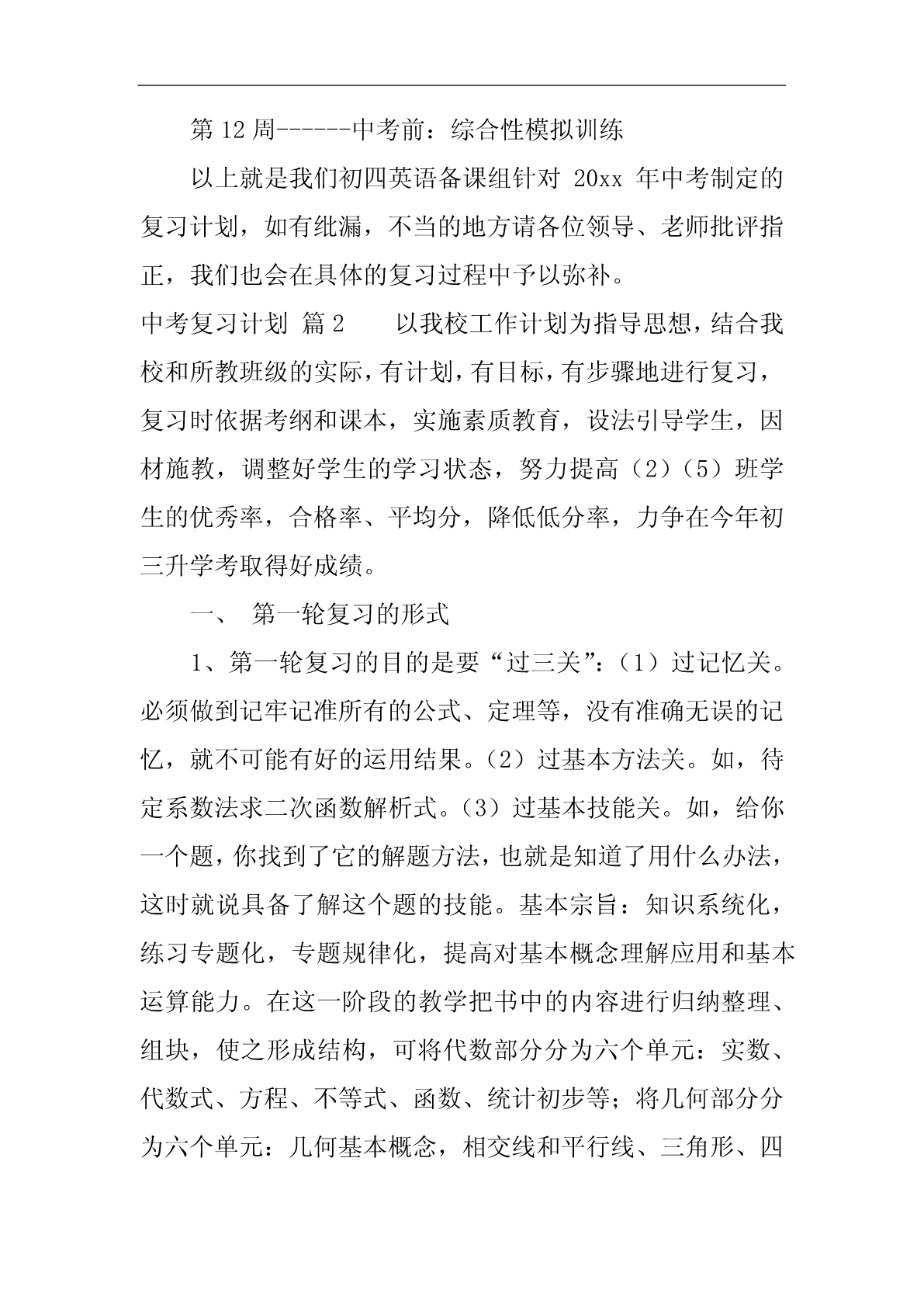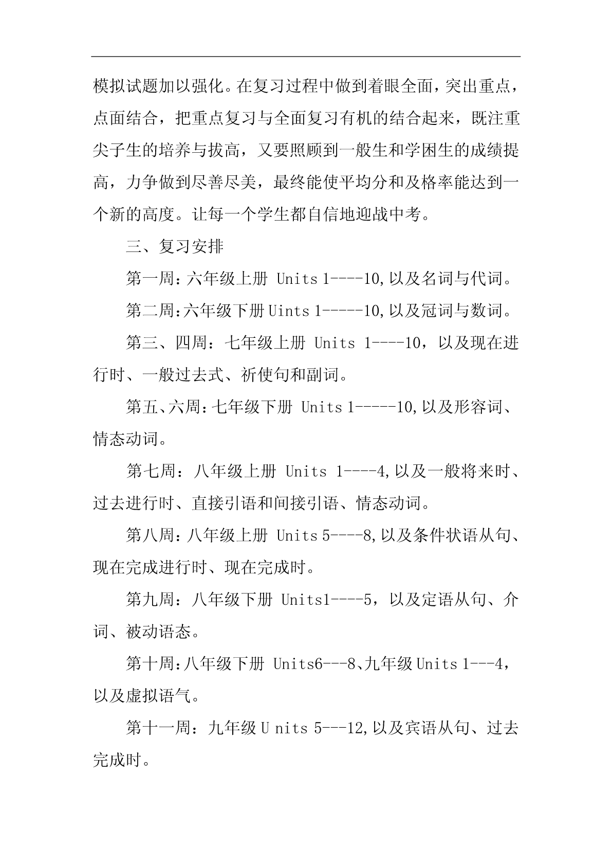 中考复习计划中考复习计划范文10篇中考复习计划篇1随着新学期的开始,20xx年中考的脚步也越来越近了。为了搞好我校的英语中考总复习,让我校的初四学生能胸有成竹地迎接中考并取得优异成绩,我们备课组经过研讨特制定了本计划:一、指导思想我们以《英语课程标准》为指导,以教材,初中学业水平考试总复习为具体内容,根据国家提出的素质教育的要求,结合我校实际情况,我们备课组经过讨论,制订了周密的复习计划,领学生进行全面复习,稳打稳扎,争取提高学生的听、说、读、写能力,发展学生的综合语言运用能力;面向全体学生,为学生全面发展奠定基础,有计划,有步骤地开展总复习,争取在20xx年的中考中取得较好的成绩。二、复习目标我们将以《淄博市初中毕业升学学业考试说明》为依据,结合本校学生的实际情况进行中考总复习,首先以课本为主线进行基础知识的梳理,即话题复习;然后以《中考说明》上的专题训练为依据进行专题复习;最后精选一些综合性的模拟试题加以强化。在复习过程中做到着眼全面,突出重点,点面结合,把重点复习与全面复习有机的结合起来,既注重尖子生的培养与拔高,又要照顾到一般生和学困生的成绩提高,力争做到尽善尽美,最终能使平均分和及格率能达到一个新的高度。让每一个学生都自信地迎战中考。三、复习安排第一周:六年级上册Units1----10,以及名词与代词。第二周:六年级下册Uints1-----10,以及冠词与数词。第三、四周:七年级上册Units1----10,以及现在进行时、一般过去式、祈使句和副词。第五、六周:七年级下册Units1-----10,以及形容词、情态动词。第七周:八年级上册Units1----4,以及一般将来时、过去进行时、直接引语和间接引语、情态动词。第八周:八年级上册Units5----8,以及条件状语从句、现在完成进行时、现在完成时。第九周:八年级下册Units1----5,以及定语从句、介词、被动语态。第十周:八年级下册Units6---8、九年级Units1---4,以及虚拟语气。第十一周:九年级Units5---12,以及宾语从句、过去完成时。第12周------中考前:综合性模拟训练以上就是我们初四英语备课组针对20xx年中考制定的复习计划,如有纰漏,不当的地方请各位领导、老师批评指正,我们也会在具体的复习过程中予以弥补。中考复习计划篇2以我校工作计划为指导思想,结合我校和所教班级的实际,有计划,有目标,有步骤地进行复习,复习时依据考纲和课本,实施素质教育,设法引导学生,因材施教,调整好学生的学习状态,努力提高(2)(5)班学生的优秀率,合格率、平均分,降低低分率,力争在今年初三升学考取得好成绩。一、第一轮复习的形式1、第一轮复习的目的是要“过三关”:(1)过记忆关。必须做到记牢记准所有的公式、定理等,没有准确无误的记忆,就不可能有好的运用结果。(2)过基本方法关。如,待定系数法求二次函数解析式。(3)过基本技能关。如,给你一个题,你找到了它的解题方法,也就是知道了用什么办法,这时就说具备了解这个题的技能。基本宗旨:知识系统化,练习专题化,专题规律化,提高对基本概念理解应用和基本运算能力。在这一阶段的教学把书中的内容进行归纳整理、组块,使之形成结构,可将代数部分分为六个单元:实数、代数式、方程、不等式、函数、统计初步等;将几何部分分为六个单元:几何基本概念,相交线和平行线、三角形、四边形、相似三角形、解直角三角形、圆等。采用填空的形式提炼出各章节重要知识,帮助学生自主学习,强化记忆,配套练习以《新课程目标测评》、《初中毕业达标指导》为主,复习完每个单元进行一次单元测试,重视补缺工作。2、第一轮复习应该注意的几个问题(1)、扎扎实实地夯实基础。每年中考试题按难度比例,基础分占比例大,因此使每个学生对初中数学知识都能达到“理解”和“掌握”的要求,在应用基础知识时能做到熟练、正确和迅速。(2)、中考有些基础题是课本上的原题或改造,必须深钻教材,绝不脱离课本。尤其是在初三(5)班,以基础知识为本,训练基本技能,练习题浅显易懂。(3)、不搞题海战术,精讲精练,举一反三、触类旁通。“大练习量”是相对而言的,它不是盲目的大,也不是盲目的练。而是有针对性的、典型性、层次性、切中要害的强化练习。(4)、定期检查学生完成的作业,及时反馈。教师对于作业、练习、测验中的问题,应采用集中讲授和个别辅导相结合,或将问题渗透在以后的教学过程中等办法进行反馈、矫正和强化。(5)、注重思想教育,不断激发他们学好数学的自信心,并创造条件,让学生体验成功的快乐。(6)、