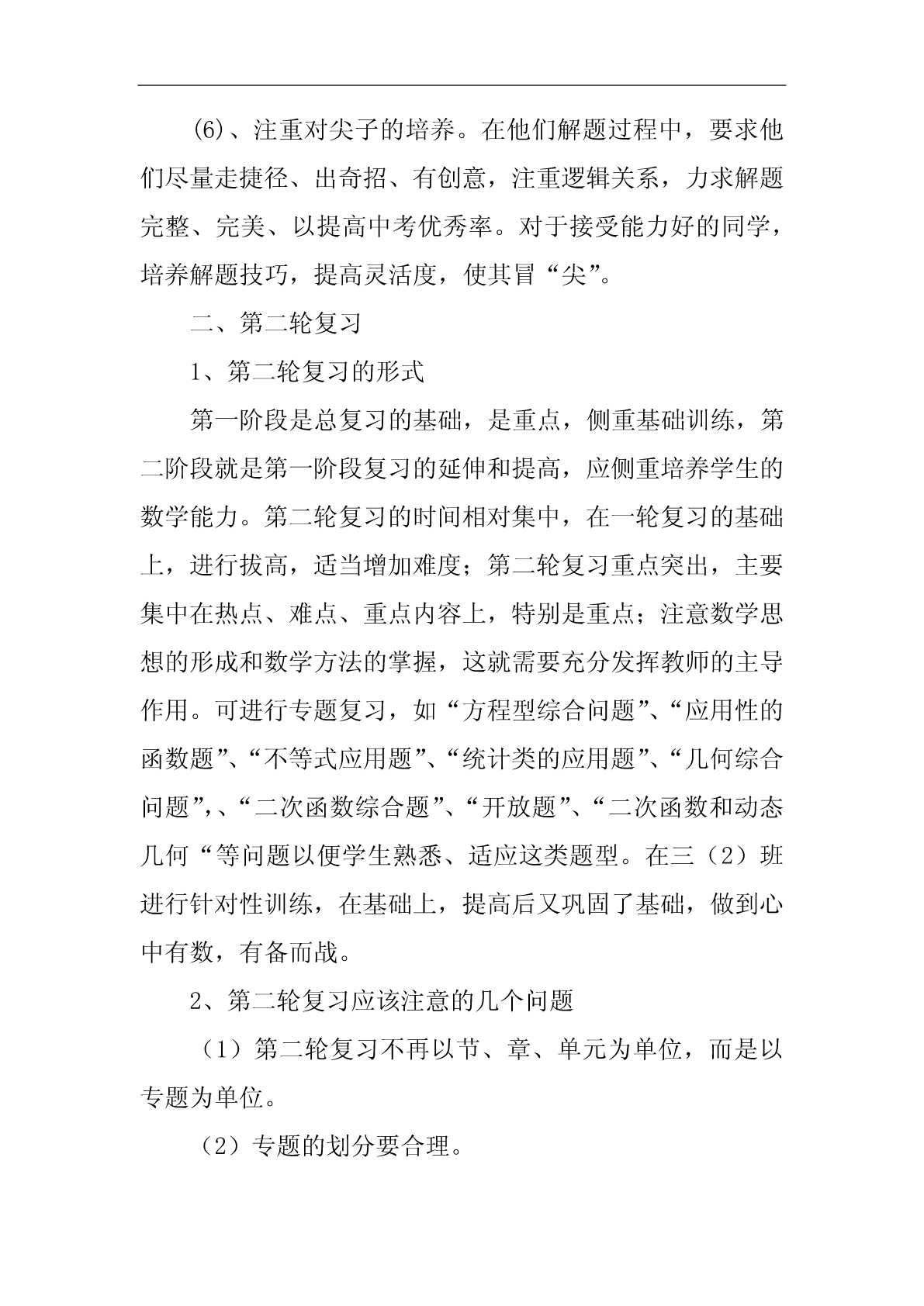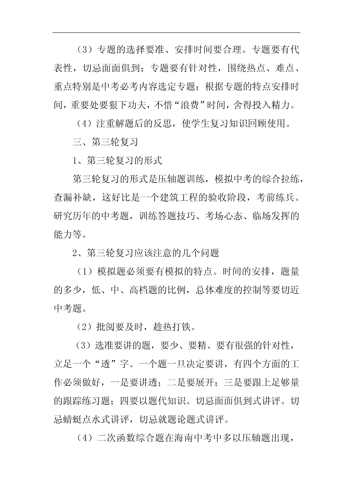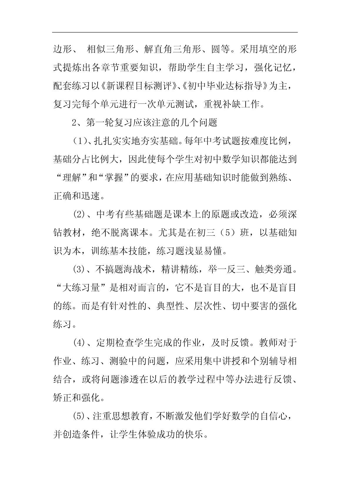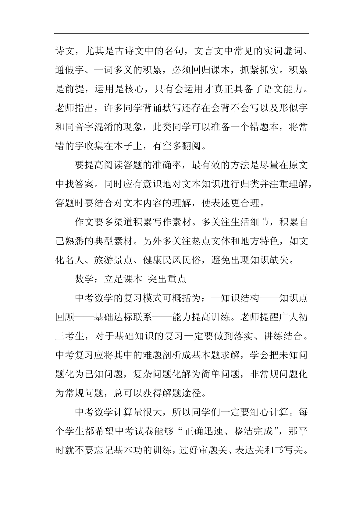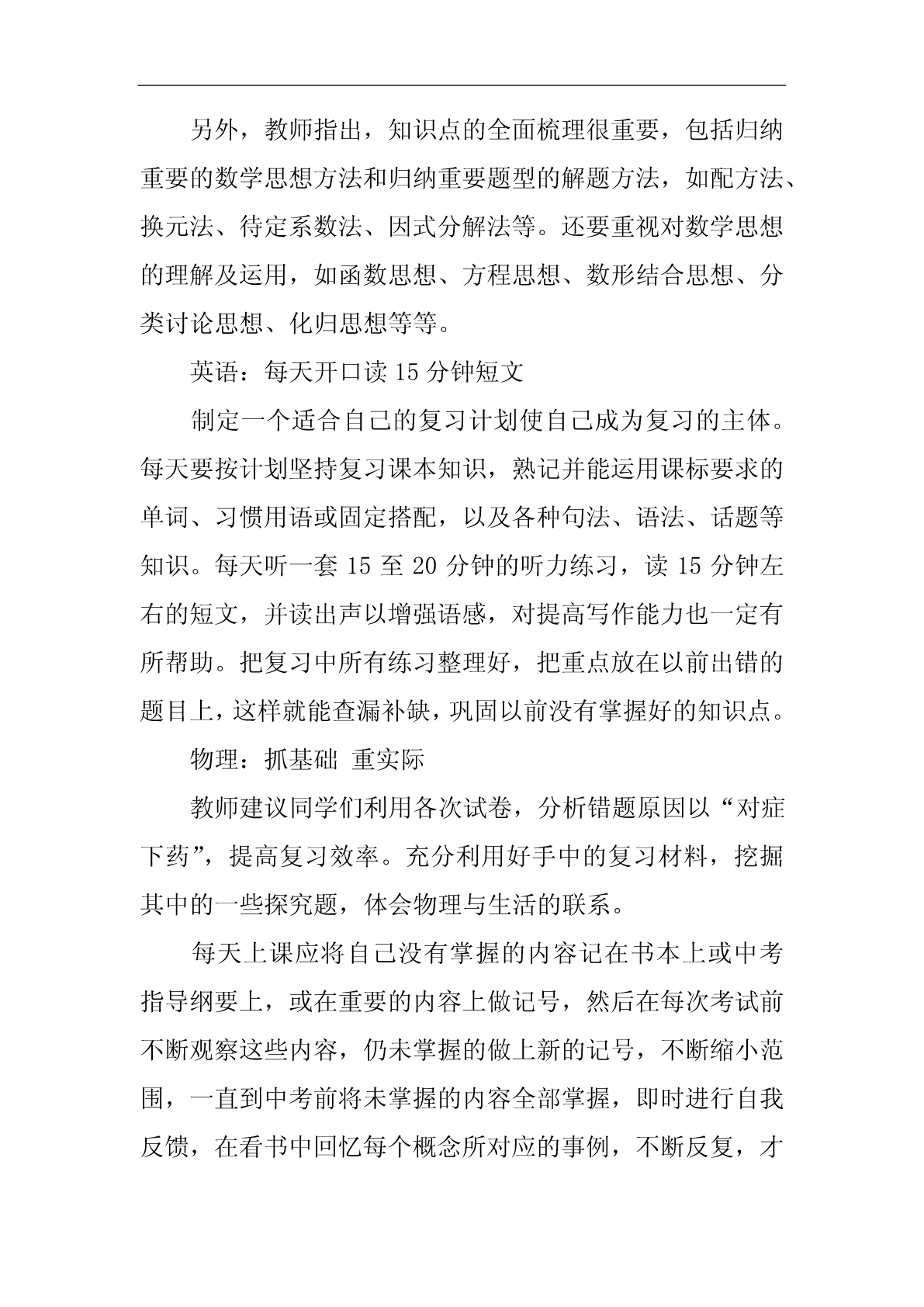 中考复习计划中考复习计划范文10篇中考复习计划篇1随着新学期的开始,20xx年中考的脚步也越来越近了。为了搞好我校的英语中考总复习,让我校的初四学生能胸有成竹地迎接中考并取得优异成绩,我们备课组经过研讨特制定了本计划:一、指导思想我们以《英语课程标准》为指导,以教材,初中学业水平考试总复习为具体内容,根据国家提出的素质教育的要求,结合我校实际情况,我们备课组经过讨论,制订了周密的复习计划,领学生进行全面复习,稳打稳扎,争取提高学生的听、说、读、写能力,发展学生的综合语言运用能力;面向全体学生,为学生全面发展奠定基础,有计划,有步骤地开展总复习,争取在20xx年的中考中取得较好的成绩。二、复习目标我们将以《淄博市初中毕业升学学业考试说明》为依据,结合本校学生的实际情况进行中考总复习,首先以课本为主线进行基础知识的梳理,即话题复习;然后以《中考说明》上的专题训练为依据进行专题复习;最后精选一些综合性的模拟试题加以强化。在复习过程中做到着眼全面,突出重点,点面结合,把重点复习与全面复习有机的结合起来,既注重尖子生的培养与拔高,又要照顾到一般生和学困生的成绩提高,力争做到尽善尽美,最终能使平均分和及格率能达到一个新的高度。让每一个学生都自信地迎战中考。三、复习安排第一周:六年级上册Units1----10,以及名词与代词。第二周:六年级下册Uints1-----10,以及冠词与数词。第三、四周:七年级上册Units1----10,以及现在进行时、一般过去式、祈使句和副词。第五、六周:七年级下册Units1-----10,以及形容词、情态动词。第七周:八年级上册Units1----4,以及一般将来时、过去进行时、直接引语和间接引语、情态动词。第八周:八年级上册Units5----8,以及条件状语从句、现在完成进行时、现在完成时。第九周:八年级下册Units1----5,以及定语从句、介词、被动语态。第十周:八年级下册Units6---8、九年级Units1---4,以及虚拟语气。第十一周:九年级Units5---12,以及宾语从句、过去完成时。第12周------中考前:综合性模拟训练以上就是我们初四英语备课组针对20xx年中考制定的复习计划,如有纰漏,不当的地方请各位领导、老师批评指正,我们也会在具体的复习过程中予以弥补。中考复习计划篇2以我校工作计划为指导思想,结合我校和所教班级的实际,有计划,有目标,有步骤地进行复习,复习时依据考纲和课本,实施素质教育,设法引导学生,因材施教,调整好学生的学习状态,努力提高(2)(5)班学生的优秀率,合格率、平均分,降低低分率,力争在今年初三升学考取得好成绩。一、第一轮复习的形式1、第一轮复习的目的是要“过三关”:(1)过记忆关。必须做到记牢记准所有的公式、定理等,没有准确无误的记忆,就不可能有好的运用结果。(2)过基本方法关。如,待定系数法求二次函数解析式。(3)过基本技能关。如,给你一个题,你找到了它的解题方法,也就是知道了用什么办法,这时就说具备了解这个题的技能。基本宗旨:知识系统化,练习专题化,专题规律化,提高对基本概念理解应用和基本运算能力。在这一阶段的教学把书中的内容进行归纳整理、组块,使之形成结构,可将代数部分分为六个单元:实数、代数式、方程、不等式、函数、统计初步等;将几何部分分为六个单元:几何基本概念,相交线和平行线、三角形、四边形、相似三角形、解直角三角形、圆等。采用填空的形式提炼出各章节重要知识,帮助学生自主学习,强化记忆,配套练习以《新课程目标测评》、《初中毕业达标指导》为主,复习完每个单元进行一次单元测试,重视补缺工作。2、第一轮复习应该注意的几个问题(1)、扎扎实实地夯实基础。每年中考试题按难度比例,基础分占比例大,因此使每个学生对初中数学知识都能达到“理解”和“掌握”的要求,在应用基础知识时能做到熟练、正确和迅速。(2)、中考有些基础题是课本上的原题或改造,必须深钻教材,绝不脱离课本。尤其是在初三(5)班,以基础知识为本,训练基本技能,练习题浅显易懂。(3)、不搞题海战术,精讲精练,举一反三、触类旁通。“大练习量”是相对而言的,它不是盲目的大,也不是盲目的练。而是有针对性的、典型性、层次性、切中要害的强化练习。(4)、定期检查学生完成的作业,及时反馈。教师对于作业、练习、测验中的问题,应采用集中讲授和个别辅导相结合,或将问题渗透在以后的教学过程中等办法进行反馈、矫正和强化。(5)、注重思想教育,不断激发他们学好数学的自信心,并创造条件,让学生体验成功的快乐。(6)、
