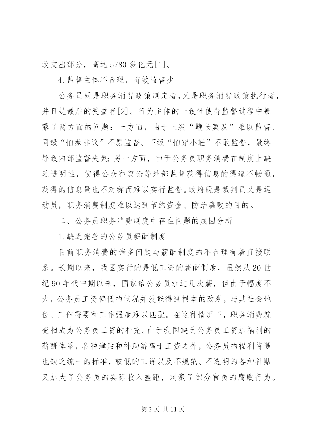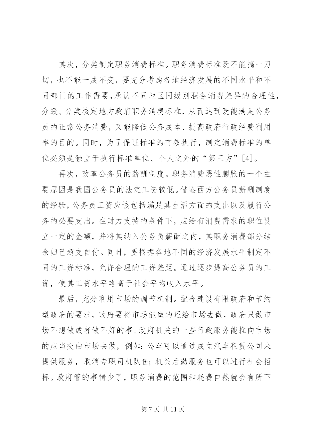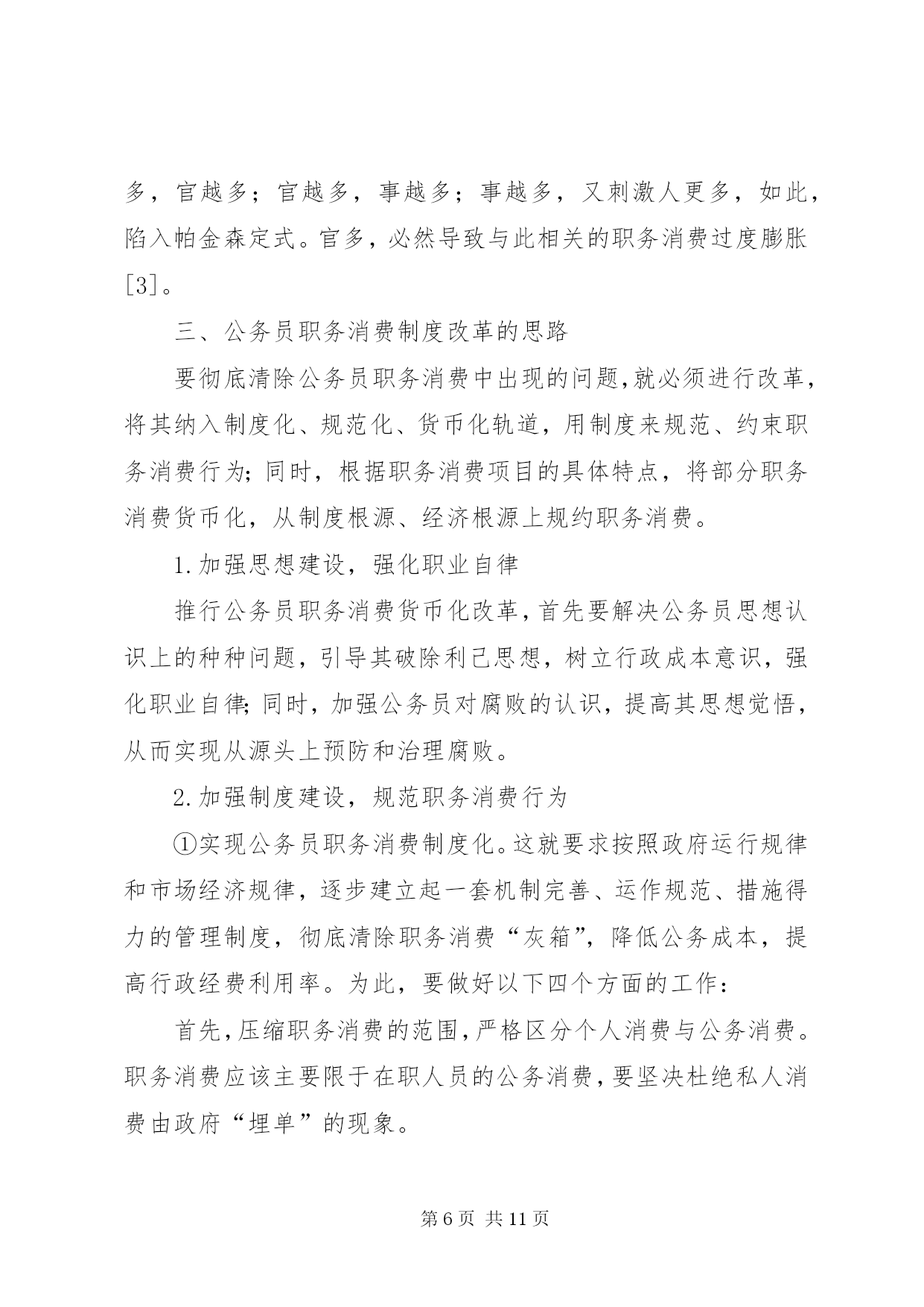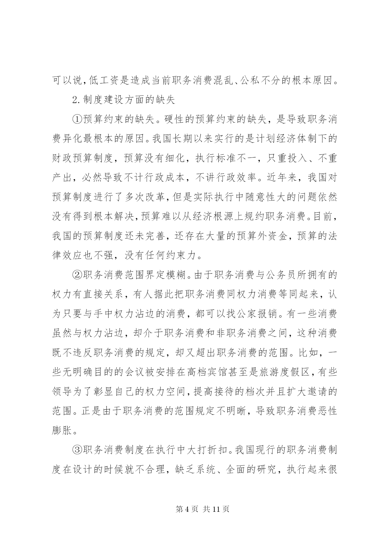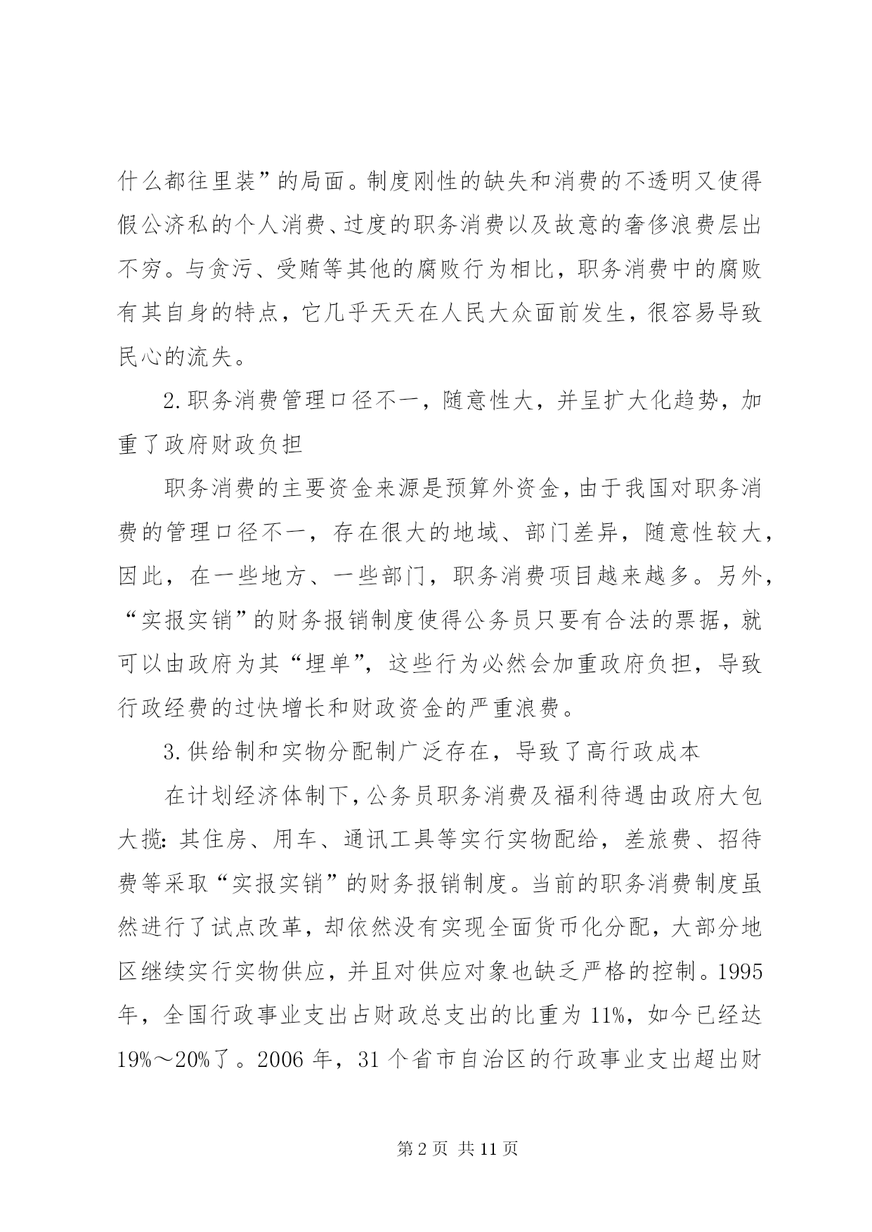 第PAGE\*Arabic\*MERGEFORMAT11页共NUMPAGES\*MERGEFORMAT11页小议公务员职务消费制度改革摘要。职务消费是维持政府机构正常运转所必须支付的成本。它是一把“双刃剑”,管理得当,有利于整个社会的良性运作;管理不当,则会导致财政资金的大量流失。因此,必须对公务员职务消费制度进行改革,将其纳入制度化、货币化、规范化轨道,以规范公务员职务消费行为,在降低政府运行成本的同时,提高政府的行政效能。键词:公务员;职务消费;制度规范;货币化改革职务消费是指公务人员为履行公务所必需的、适度的消费,包括招待费、差旅费、交通费、通讯费等,它构成政府运行成本的主要部分,是维持政府机构正常运转所必需的费用支出。但是,职务消费与权力紧密相关,对职务消费的范围及标准既无允许的规范,又无约束的规定,往往会导致行为主体的“自由裁量权”过大,使得必要的消费供给不足、腐败现象普遍存在。要保证财政资源的使用不偏离公共利益,就必须将职务消费纳入制度化、货币化、规范化的轨道。一、当前公务员职务消费领域存在的主要问题1.职务消费不透明、不规范,滋生腐败职务消费中的腐败是腐败最集中、最常见的表现。由于对职务消费的范围、标准等基本问题缺乏明确的规定,使得实际工作中缺乏合理、规范的制度性约束,形成了“职务消费是一个筐,什么都往里装”的局面。制度刚性的缺失和消费的不透明又使得假公济私的个人消费、过度的职务消费以及故意的奢侈浪费层出不穷。与贪污、受贿等其他的腐败行为相比,职务消费中的腐败有其自身的特点,它几乎天天在人民大众面前发生,很容易导致民心的流失。2.职务消费管理口径不一,随意性大,并呈扩大化趋势,加重了政府财政负担职务消费的主要资金来源是预算外资金,由于我国对职务消费的管理口径不一,存在很大的地域、部门差异,随意性较大,因此,在一些地方、一些部门,职务消费项目越来越多。另外,“实报实销”的财务报销制度使得公务员只要有合法的票据,就可以由政府为其“埋单”,这些行为必然会加重政府负担,导致行政经费的过快增长和财政资金的严重浪费。3.供给制和实物分配制广泛存在,导致了高行政成本在计划经济体制下,公务员职务消费及福利待遇由政府大包大揽:其住房、用车、通讯工具等实行实物配给,差旅费、招待费等采取“实报实销”的财务报销制度。当前的职务消费制度虽然进行了试点改革,却依然没有实现全面货币化分配,大部分地区继续实行实物供应,并且对供应对象也缺乏严格的控制。1995年,全国行政事业支出占财政总支出的比重为11%,如今已经达19%~20%了。2006年,31个省市自治区的行政事业支出超出财政支出部分,高达5780多亿元[1]。4.监督主体不合理,有效监督少公务员既是职务消费政策制定者,又是职务消费政策执行者,并且是最后的受益者[2]。行为主体的一致性使得监督过程中暴露了两方面的问题:一方面,由于上级“鞭长莫及”难以监督、同级“怕惹非议”不愿监督、下级“怕穿小鞋”不敢监督,最终导致内部监督失灵;另一方面,由于公务员职务消费在制度上缺乏透明性,使得公众和舆论等外部监督获得信息的渠道不畅通,获得的信息量也不对称而难以实行监督。政府既是裁判员又是运动员,职务消费制度难以达到节约资金、防治腐败的目的。二、公务员职务消费制度中存在问题的成因分析1.缺乏完善的公务员薪酬制度目前职务消费的诸多问题与薪酬制度的不合理有着直接联系。长期以来,我国实行的是低工资的薪酬制度,虽然从20世纪90年代中期以来,国家给公务员加过几次薪,但由于幅度不大,公务员工资偏低的状况并没能得到根本的改观,与其社会地位、工作需要和工作强度难以匹配。在这种情况下,职务消费就变相成为公务员工资的补充。由于我国缺乏公务员工资加福利的薪酬体系,各种津贴和补助游离于工资之外,公务员的福利待遇也缺乏统一的标准,较低的工资以及不规范、不透明的各种补贴又加大了公务员的实际收入差距,刺激了部分官员的腐败行为。可以说,低工资是造成当前职务消费混乱、公私不分的根本原因。2.制度建设方面的缺失①预算约束的缺失。硬性的预算约束的缺失,是导致职务消费异化最根本的原因。我国长期以来实行的是计划经济体制下的财政预算制度,预算没有细化,执行标准不一,只重投入、不重产出,必然导致不计行政成本,不讲行政效率。近年来,我国对预算制度进行了多次改革,但是实际执行中随意性大的问题依然没有得到根本解决,预算难以从经济根源上规约职务消费。目前,我国的预算制度还未完善,还存在大量的预算外资金,预算的法律效应也不强,没有任何约束力。②职务消费范围界定模糊。由于职务消费与公务员所拥有的权力有直接关系,有人据此把职务消费同权力消费等同起来,认为只要与手中权力沾边的消费,都可以找公家报销。有一些消费虽然与权力沾边,却介于职务消费