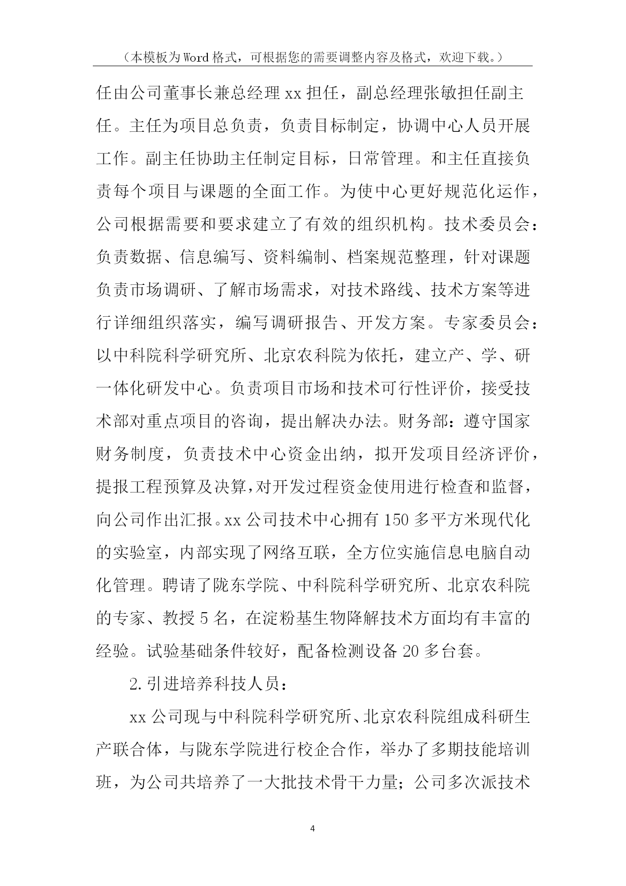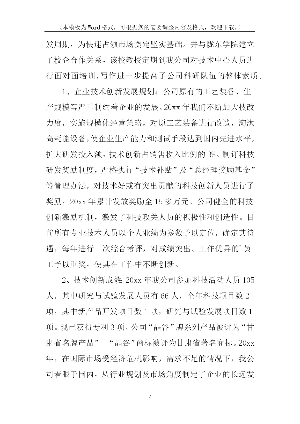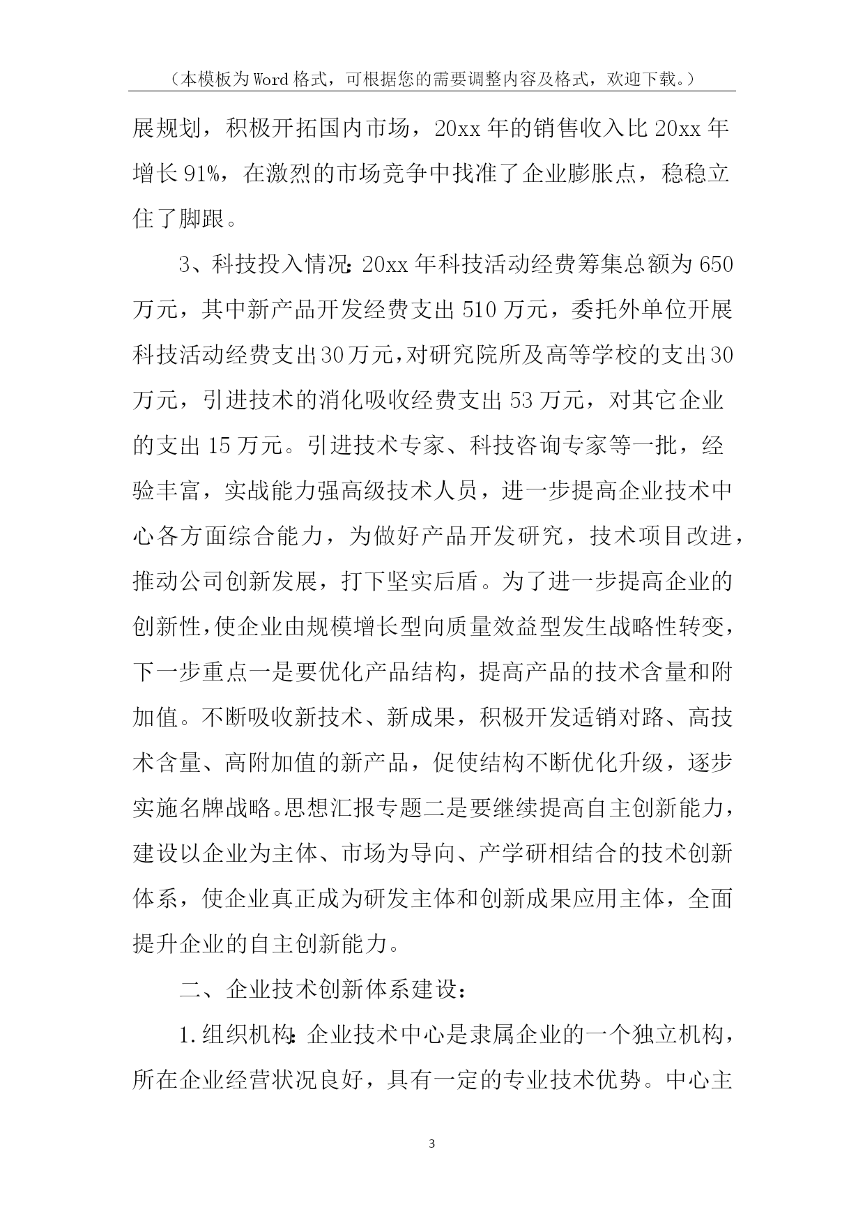 (本模板为Word格式,可根据您的需要调整内容及格式,欢迎下载。)PAGE\*MERGEFORMAT5技术单位工作总结一、企业技术创新战略与规划的实施情况xx公司技术中心自20xx年3月成立以来,以产品研发为中心,倡导技术创新,在技术研发,技术攻关、技术创新狠下工夫,现在公司淀粉基生物降解环保制品的研发型号日益齐全、产品迈向多元化。公司建立了高精密仪器检测检验的生产过程检测阵地,拥有电子分析天平、微量分析天平、微型植物试样粉碎机、薄膜测厚仪等先进设备,为产品质量控制提供及时、准确的信息。公司按国际质量体系iso9001认证要求,建立了现代化质量管理体系,致力于持续改进,不断完善体系确保有效运行。总经理xx高度重视技术中心建设,20xx年、20xx年、20xx年连续三年科技活动经费投入均超过企业年销售收入的3%。技术中心现拥有专业检测中心,检测设备、仪器齐全,在新产品的检测方面,对于客户来样能从多方面测绘出真实的数据来,能更深入地了解国内外同行业先进加工工艺。依托技术中心继续深化与国家级科研机构中科院科学研究所的合作。从产品设计、研制及加工上对我公司专业人员进行培训并联合研发新产品,研制新工艺以大大缩短产品工艺开发周期,为快速占领市场奠定坚实基础。并与陇东学院建立了校企合作关系,该校教授定期到我公司对技术中心人员进行面对面培训,写作进一步提高了公司科研队伍的整体素质。1、企业技术创新发展规划:公司原有的工艺装备、生产规模等严重制约着企业的发展。20xx年我们不断加大技改力度,实施规模化经营策略,对原工艺装备进行改造,淘汰高耗能设备,使企业生产能力和测试手段达到国内先进水平,扩大研发投入额,技术创新占销售收入比例的3%。制订科技研发奖励制度,严格执行“技术补贴”及“总经理奖励基金”等管理办法,对技术好或有突出贡献的科技创新人员进行了奖励,20xx年累计发放奖励金15多万元。公司健全的科技创新激励机制,激发了科技攻关人员的积极性和创造性。目前所有专业技术人员以个人业绩为参数予以定位,确定其待遇,每年进行一次综合考评,对成绩突出、工作优异的'员工予以重奖,使其在工作中不断创新。2、技术创新成效:20xx年我公司参加科技活动人员105人,其中研究与试验发展人员有66人,全年科技项目数2项,其中新产品开发项目数1项,研究与试验发展项目数1项。现已获得专利3项。公司“晶谷”牌系列产品被评为“甘肃省名牌产品”“晶谷”商标被评为甘肃省著名商标。20xx年,在国际市场受经济危机影响,需求不足的情况下,我公司着眼于国内,从行业规划及市场角度制定了企业的长远发展规划,积极开拓国内市场,20xx年的销售收入比20xx年增长91%,在激烈的市场竞争中找准了企业膨胀点,稳稳立住了脚跟。3、科技投入情况:20xx年科技活动经费筹集总额为650万元,其中新产品开发经费支出510万元,委托外单位开展科技活动经费支出30万元,对研究院所及高等学校的支出30万元,引进技术的消化吸收经费支出53万元,对其它企业的支出15万元。引进技术专家、科技咨询专家等一批,经验丰富,实战能力强高级技术人员,进一步提高企业技术中心各方面综合能力,为做好产品开发研究,技术项目改进,推动公司创新发展,打下坚实后盾。为了进一步提高企业的创新性,使企业由规模增长型向质量效益型发生战略性转变,下一步重点一是要优化产品结构,提高产品的技术含量和附加值。不断吸收新技术、新成果,积极开发适销对路、高技术含量、高附加值的新产品,促使结构不断优化升级,逐步实施名牌战略。思想汇报专题二是要继续提高自主创新能力,建设以企业为主体、市场为导向、产学研相结合的技术创新体系,使企业真正成为研发主体和创新成果应用主体,全面提升企业的自主创新能力。二、企业技术创新体系建设:1.组织机构:企业技术中心是隶属企业的一个独立机构,所在企业经营状况良好,具有一定的专业技术优势。中心主任由公司董事长兼总经理xx担任,副总经理张敏担任副主任。主任为项目总负责,负责目标制定,协调中心人员开展工作。副主任协助主任制定目标,日常管理。和主任直接负责每个项目与课题的全面工作。为使中心更好规范化运作,公司根据需要和要求建立了有效的组织机构。技术委员会:负责数据、信息编写、资料编制、档案规范整理,针对课题负责市场调研、了解市场需求,对技术路线、技术方案等进行详细组织落实,编写调研报告、开发方案。专家委员会:以中科院科学研究所、北京农科院为依托,建立产、学、研一体化研发中心。负责项目市场和技术可行性评价,接受技术部对重点项目的咨询,提出解决办法。财务部:遵守国家财务制度,负责技术中心资金出纳,拟开发项目经济评价,提报工程预算及决算,对开发过程资金使用进行检查和监督,向公司作出汇报。xx公司技术中心拥有150多平方米现代化的实