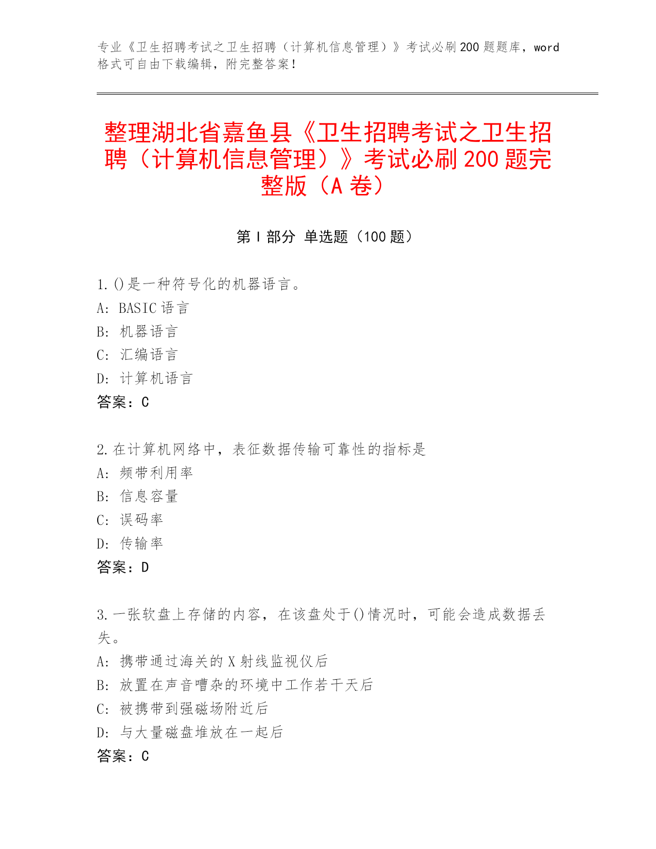 整理湖北省嘉鱼县《卫生招聘考试之卫生招聘(计算机信息管理)》考试必刷200题完整版(A卷)