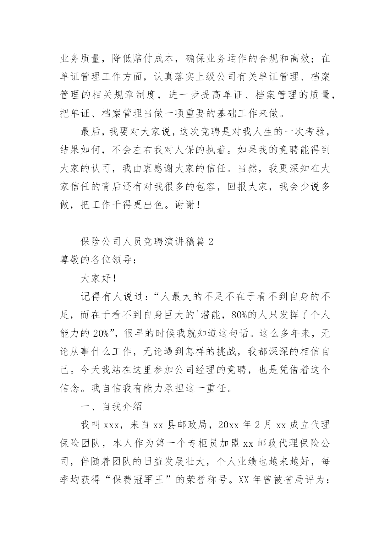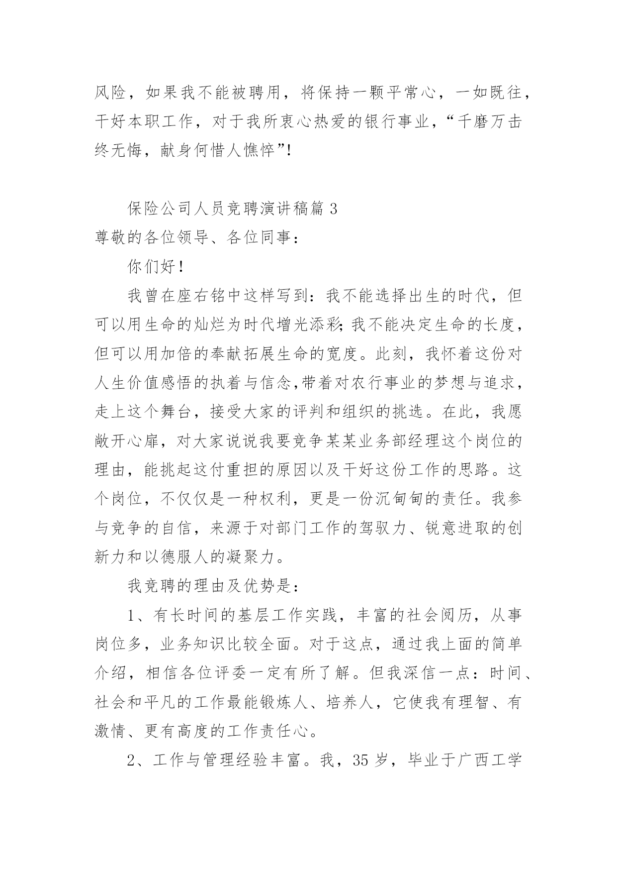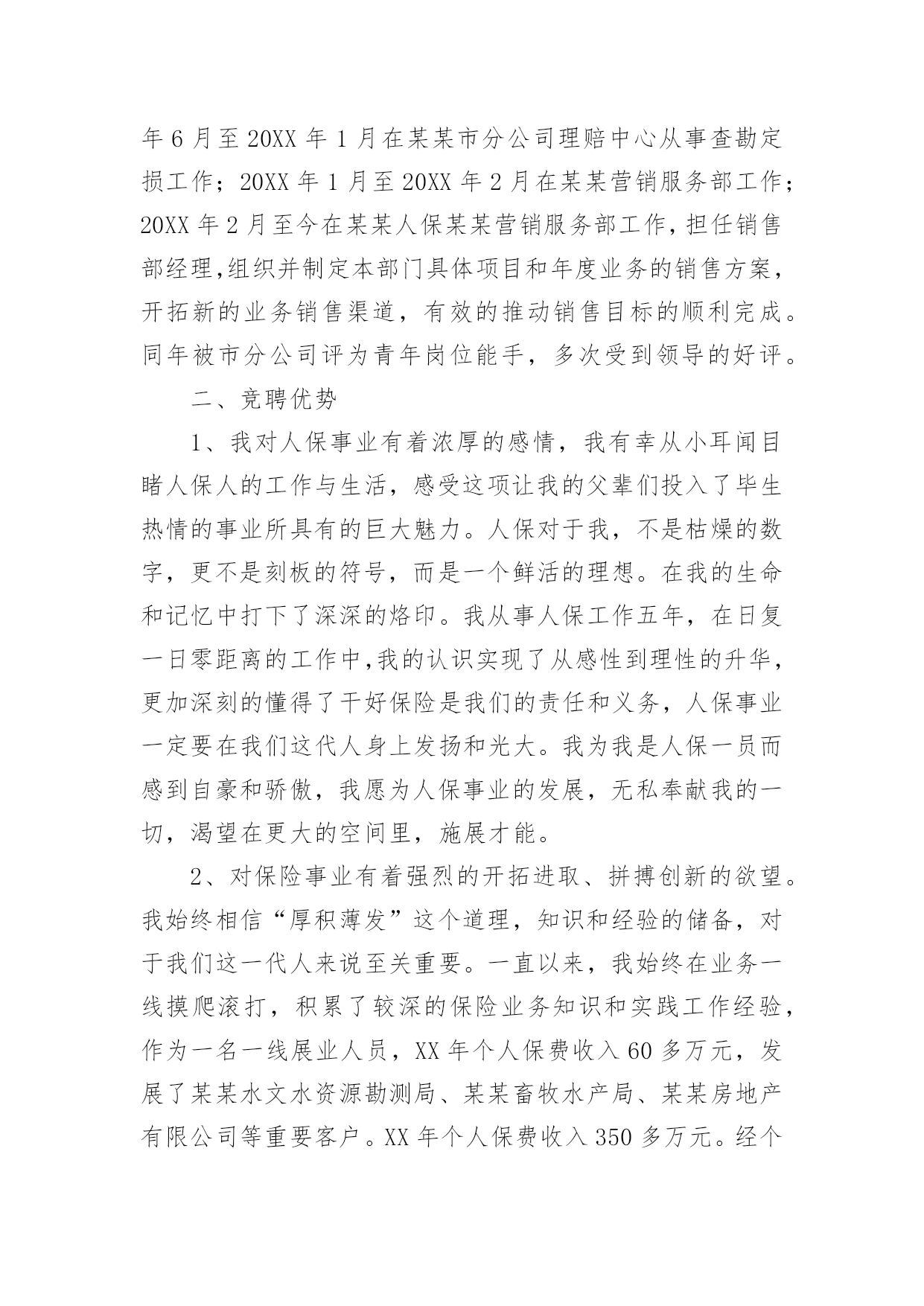 保险公司人员竞聘演讲稿随着公开选拔领导干部在全国各地的全面展开,竞聘上岗的演讲已成为优秀人才走上领导岗位必不可少的途径。下面是小编为大家整理了保险公司人员竞聘演讲稿,欢迎参考。保险公司人员竞聘演讲稿篇1尊敬的各位领导、同志们:大家好!首先,感谢各位领导和同事们为我们提供了展示自我和施展才华的平台!我认为,为更好的做好业务发展和经营管理的每一项工作,作为我们每位员工以良好的精神状态和旺盛的精力投入工作,为公司实现有效益的发展,是我们的责任和义务,作为始终战斗在一线的我更是责无旁贷。我将珍惜这次机会,提高自己、锻炼自己,做到一专多能,带着感情、热情、激情做好本职工作,让自己的能力有一个新的提高。根据竞聘要求,对照自身条件,今天我竞聘人保财险某某市分公司某某营销服务部主管承保经理助理职务,下面我讲一下个人简历和竞聘的优势及上岗后的设想。一、个人简历我叫某某,今年26岁,现任人保财险某某市分公司某某营销服务部销售部经理,中共预备党员,本科学历。20XX年1月从事人保工作,历任业务员、查勘定损员、销售部经理。20XX年1月至20XX年6月在人保某某支公司工作;20XX年6月至20XX年1月在某某市分公司理赔中心从事查勘定损工作;20XX年1月至20XX年2月在某某营销服务部工作;20XX年2月至今在某某人保某某营销服务部工作,担任销售部经理,组织并制定本部门具体项目和年度业务的销售方案,开拓新的业务销售渠道,有效的推动销售目标的顺利完成。同年被市分公司评为青年岗位能手,多次受到领导的好评。二、竞聘优势1、我对人保事业有着浓厚的感情,我有幸从小耳闻目睹人保人的工作与生活,感受这项让我的父辈们投入了毕生热情的事业所具有的巨大魅力。人保对于我,不是枯燥的数字,更不是刻板的符号,而是一个鲜活的理想。在我的生命和记忆中打下了深深的烙印。我从事人保工作五年,在日复一日零距离的工作中,我的认识实现了从感性到理性的升华,更加深刻的懂得了干好保险是我们的责任和义务,人保事业一定要在我们这代人身上发扬和光大。我为我是人保一员而感到自豪和骄傲,我愿为人保事业的发展,无私奉献我的一切,渴望在更大的空间里,施展才能。2、对保险事业有着强烈的开拓进取、拼搏创新的欲望。我始终相信“厚积薄发”这个道理,知识和经验的储备,对于我们这一代人来说至关重要。一直以来,我始终在业务一线摸爬滚打,积累了较深的保险业务知识和实践工作经验,作为一名一线展业人员,XX年个人保费收入60多万元,发展了某某水文水资源勘测局、某某畜牧水产局、某某房地产有限公司等重要客户。XX年个人保费收入350多万元。经个人努力从其他财险公司手中抢来某某市国际会展中心、某某市妇联、并发展了吉利4S店,仅吉利4S店一家XX年保费收入280万元,XX年保费收入260万元。XX年接手三菱4S店,经各方面努力,使本来选择其它财险公司的三菱4S又重新与我公司合作,而且稳定发展。到目前为止保费收入200万元。同年又发展了4个品牌的汽车经销商,有海南马自达4S店、福仕达4S店、江铃4S店、江淮4S店。还有两家车商正在谈判中。从XX年1月份截止现在个人保费收入740万元。尤其是针对车商业务有着丰富的管理经验,在业务拓展上付出了自己很大的精力和心血,体现出与车商沟通之间很强的亲和力、协调能力和公关能力,为公司整体业务发展起到了积极的推动和促进作用。3、对保险理赔工作有着丰富的实践经验。我从XX年到XX年在理赔中心从事查勘定损工作了三年,对理赔工作及业务比较熟悉,业务再错综复杂,也能应对自如,同时,根据工作特点,经常不分时间、不分白昼,只要工作需要,就马上投入工作。辛苦和付出,也使我得到了最好的锻炼和成长。三、竞聘设想竞聘之前,我对竞聘主管承保经理助理这一职务进行了深刻的分析和理性的认识,可以说这一职务对我来说是全新的并带有挑战性的工作。历年的工作实践告诉我,要想干好事业,就要奉献自我,在业务知识的运用和新市场的开拓上,我有较强的工作经验,是做好经理助理这一职务的基本条件。如果能竞聘成功,我将做到以下四点:1、认真学习,努力钻研业务,尽快进入角色。走上新的工作岗位,首先开展调查研究、结合汽车经销商业务发展实际,打开工作局面,提高工作的准确性。2、全面配合一把手工作,摆正位置,从管理协调能力和创新思路的提高入手,善于学习和积累,以自己几年的基层工作经验为领导的决策提供有价值的参考。如果我能竞聘成功,我将尽快进入角色,努力适应新形势、新战略、新岗位、新要求,树立超前谋划、积极主动的思想意识和踏踏实实、兢兢业业的工作作风,不计得失、乐于奉献,以全局为重,不断给自己增加压力和动力,以最快的速度进入工作状态,为公司促发展、保效益、防风险战略目标的实现做出自己应有的贡献。3、积极探索有效的工作方法和途径,形成较清晰的工作思路,充分发挥