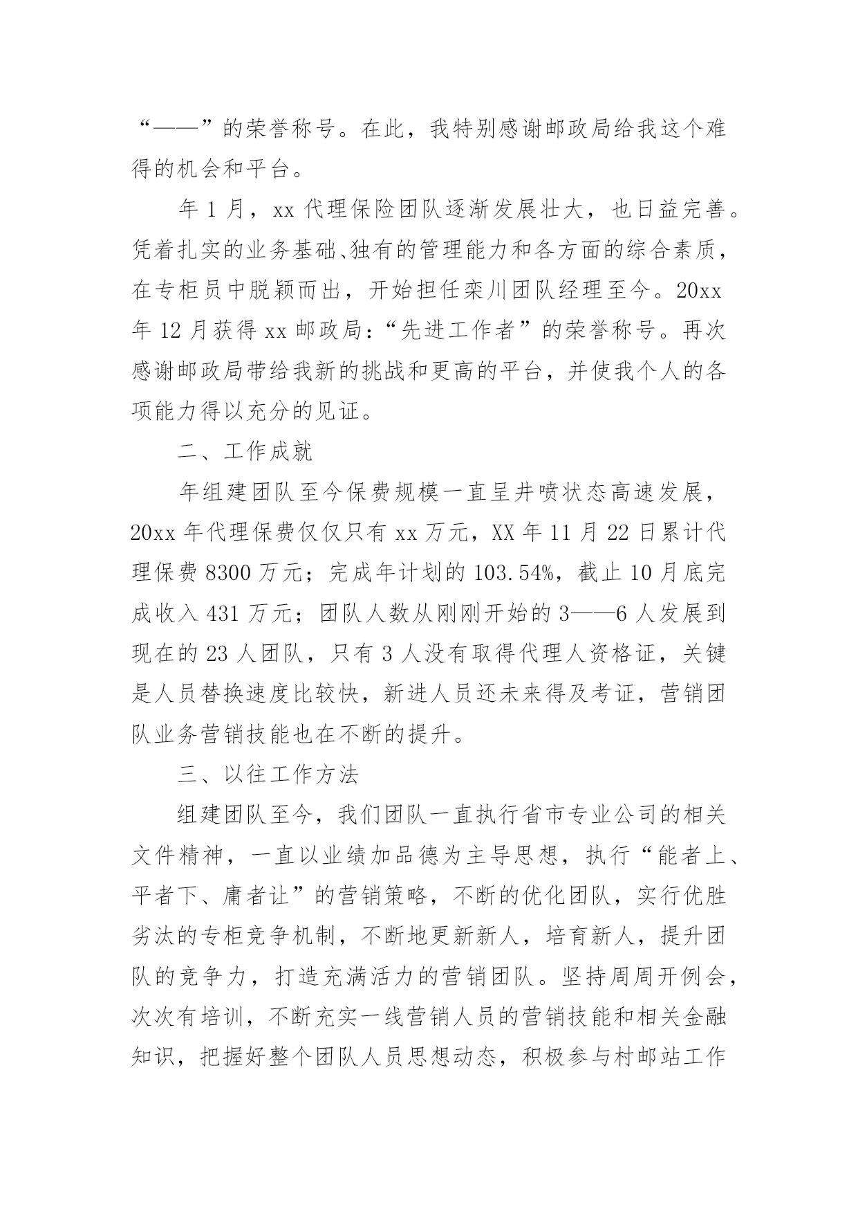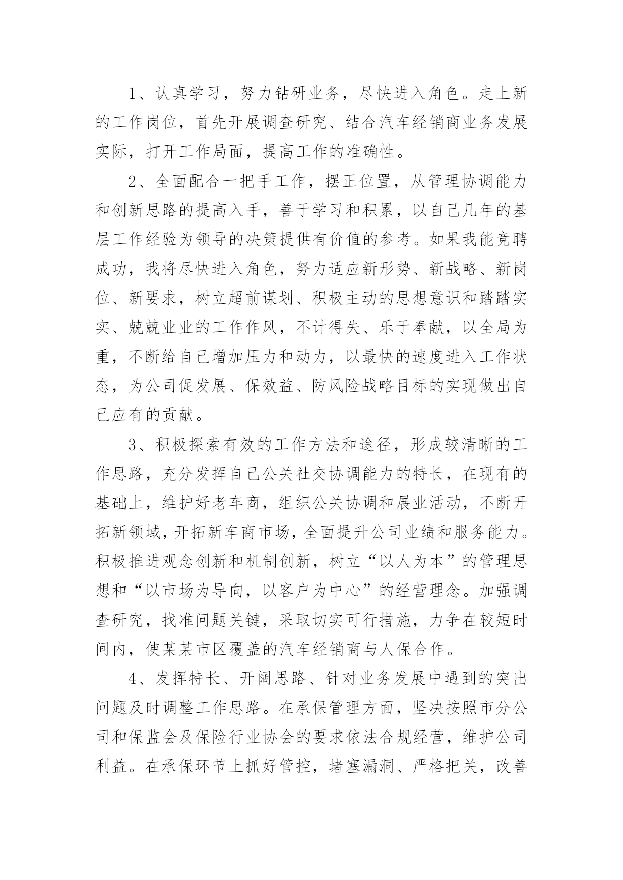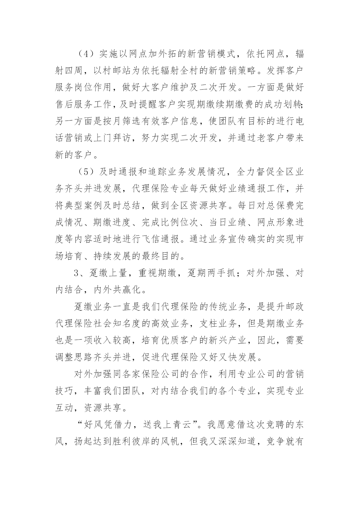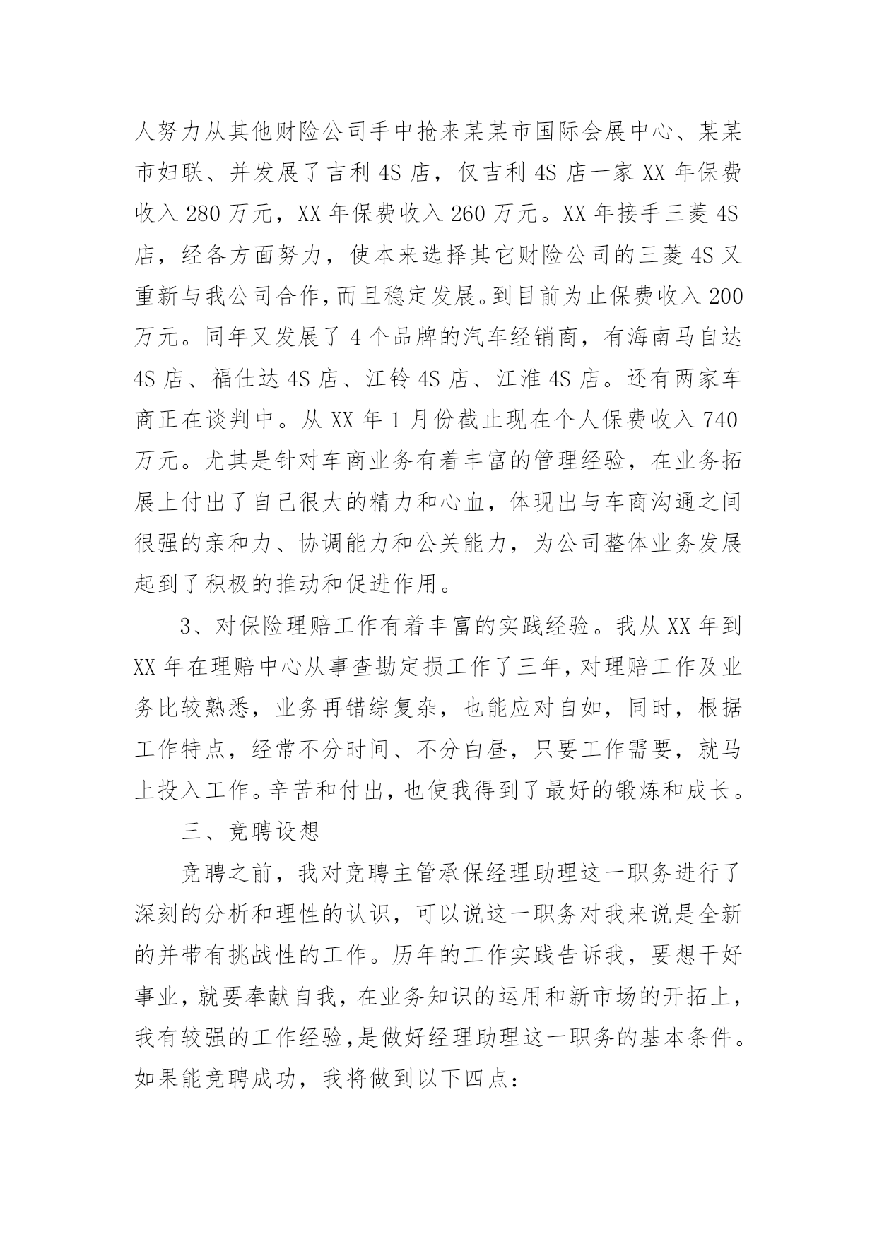 保险公司人员竞聘演讲稿随着公开选拔领导干部在全国各地的全面展开,竞聘上岗的演讲已成为优秀人才走上领导岗位必不可少的途径。下面是小编为大家整理了保险公司人员竞聘演讲稿,欢迎参考。保险公司人员竞聘演讲稿篇1尊敬的各位领导、同志们:大家好!首先,感谢各位领导和同事们为我们提供了展示自我和施展才华的平台!我认为,为更好的做好业务发展和经营管理的每一项工作,作为我们每位员工以良好的精神状态和旺盛的精力投入工作,为公司实现有效益的发展,是我们的责任和义务,作为始终战斗在一线的我更是责无旁贷。我将珍惜这次机会,提高自己、锻炼自己,做到一专多能,带着感情、热情、激情做好本职工作,让自己的能力有一个新的提高。根据竞聘要求,对照自身条件,今天我竞聘人保财险某某市分公司某某营销服务部主管承保经理助理职务,下面我讲一下个人简历和竞聘的优势及上岗后的设想。一、个人简历我叫某某,今年26岁,现任人保财险某某市分公司某某营销服务部销售部经理,中共预备党员,本科学历。20XX年1月从事人保工作,历任业务员、查勘定损员、销售部经理。20XX年1月至20XX年6月在人保某某支公司工作;20XX年6月至20XX年1月在某某市分公司理赔中心从事查勘定损工作;20XX年1月至20XX年2月在某某营销服务部工作;20XX年2月至今在某某人保某某营销服务部工作,担任销售部经理,组织并制定本部门具体项目和年度业务的销售方案,开拓新的业务销售渠道,有效的推动销售目标的顺利完成。同年被市分公司评为青年岗位能手,多次受到领导的好评。二、竞聘优势1、我对人保事业有着浓厚的感情,我有幸从小耳闻目睹人保人的工作与生活,感受这项让我的父辈们投入了毕生热情的事业所具有的巨大魅力。人保对于我,不是枯燥的数字,更不是刻板的符号,而是一个鲜活的理想。在我的生命和记忆中打下了深深的烙印。我从事人保工作五年,在日复一日零距离的工作中,我的认识实现了从感性到理性的升华,更加深刻的懂得了干好保险是我们的责任和义务,人保事业一定要在我们这代人身上发扬和光大。我为我是人保一员而感到自豪和骄傲,我愿为人保事业的发展,无私奉献我的一切,渴望在更大的空间里,施展才能。2、对保险事业有着强烈的开拓进取、拼搏创新的欲望。我始终相信“厚积薄发”这个道理,知识和经验的储备,对于我们这一代人来说至关重要。一直以来,我始终在业务一线摸爬滚打,积累了较深的保险业务知识和实践工作经验,作为一名一线展业人员,XX年个人保费收入60多万元,发展了某某水文水资源勘测局、某某畜牧水产局、某某房地产有限公司等重要客户。XX年个人保费收入350多万元。经个人努力从其他财险公司手中抢来某某市国际会展中心、某某市妇联、并发展了吉利4S店,仅吉利4S店一家XX年保费收入280万元,XX年保费收入260万元。XX年接手三菱4S店,经各方面努力,使本来选择其它财险公司的三菱4S又重新与我公司合作,而且稳定发展。到目前为止保费收入200万元。同年又发展了4个品牌的汽车经销商,有海南马自达4S店、福仕达4S店、江铃4S店、江淮4S店。还有两家车商正在谈判中。从XX年1月份截止现在个人保费收入740万元。尤其是针对车商业务有着丰富的管理经验,在业务拓展上付出了自己很大的精力和心血,体现出与车商沟通之间很强的亲和力、协调能力和公关能力,为公司整体业务发展起到了积极的推动和促进作用。3、对保险理赔工作有着丰富的实践经验。我从XX年到XX年在理赔中心从事查勘定损工作了三年,对理赔工作及业务比较熟悉,业务再错综复杂,也能应对自如,同时,根据工作特点,经常不分时间、不分白昼,只要工作需要,就马上投入工作。辛苦和付出,也使我得到了最好的锻炼和成长。三、竞聘设想竞聘之前,我对竞聘主管承保经理助理这一职务进行了深刻的分析和理性的认识,可以说这一职务对我来说是全新的并带有挑战性的工作。历年的工作实践告诉我,要想干好事业,就要奉献自我,在业务知识的运用和新市场的开拓上,我有较强的工作经验,是做好经理助理这一职务的基本条件。如果能竞聘成功,我将做到以下四点:1、认真学习,努力钻研业务,尽快进入角色。走上新的工作岗位,首先开展调查研究、结合汽车经销商业务发展实际,打开工作局面,提高工作的准确性。2、全面配合一把手工作,摆正位置,从管理协调能力和创新思路的提高入手,善于学习和积累,以自己几年的基层工作经验为领导的决策提供有价值的参考。如果我能竞聘成功,我将尽快进入角色,努力适应新形势、新战略、新岗位、新要求,树立超前谋划、积极主动的思想意识和踏踏实实、兢兢业业的工作作风,不计得失、乐于奉献,以全局为重,不断给自己增加压力和动力,以最快的速度进入工作状态,为公司促发展、保效益、防风险战略目标的实现做出自己应有的贡献。3、积极探索有效的工作方法和途径,形成较清晰的工作思路,充分发挥