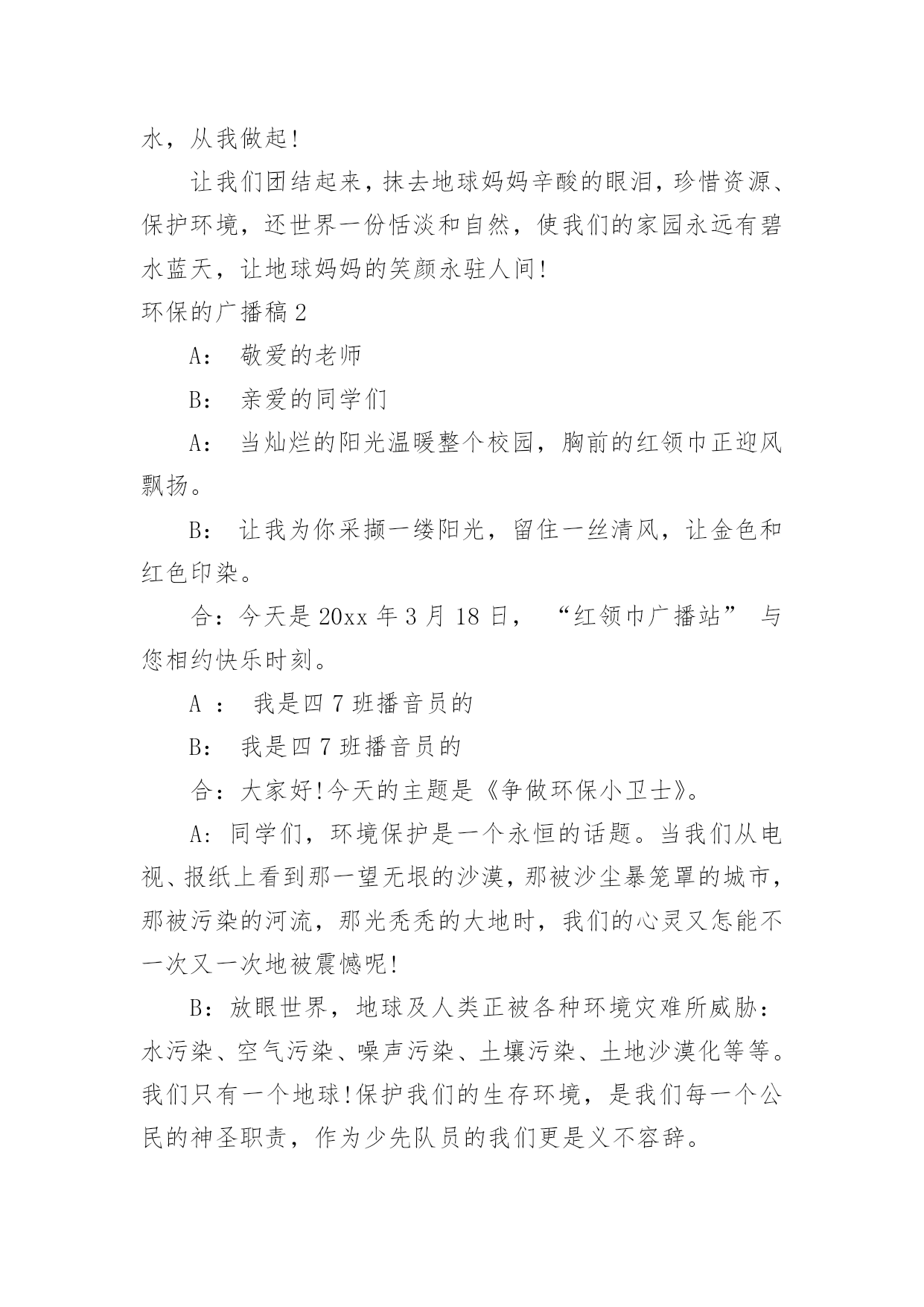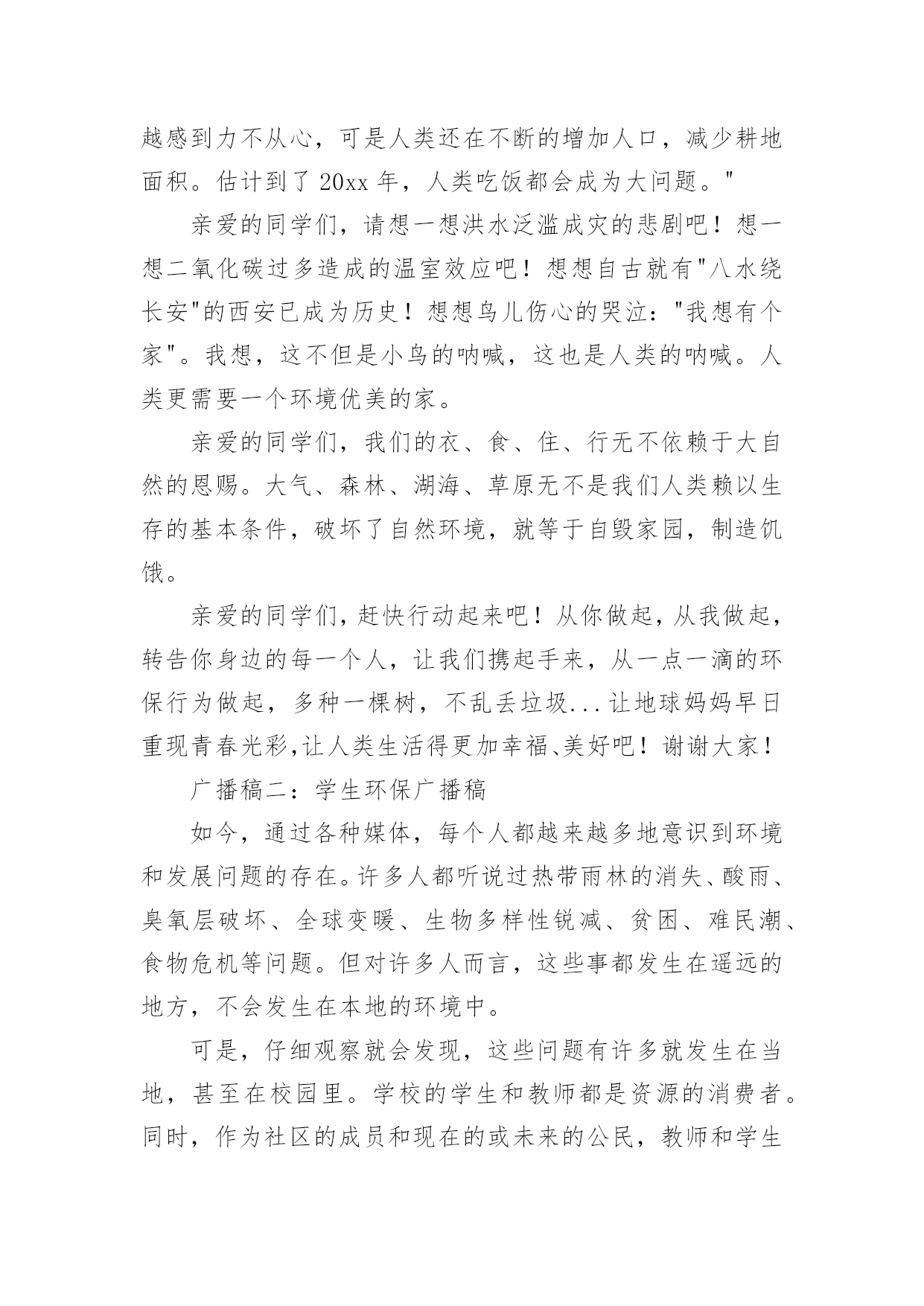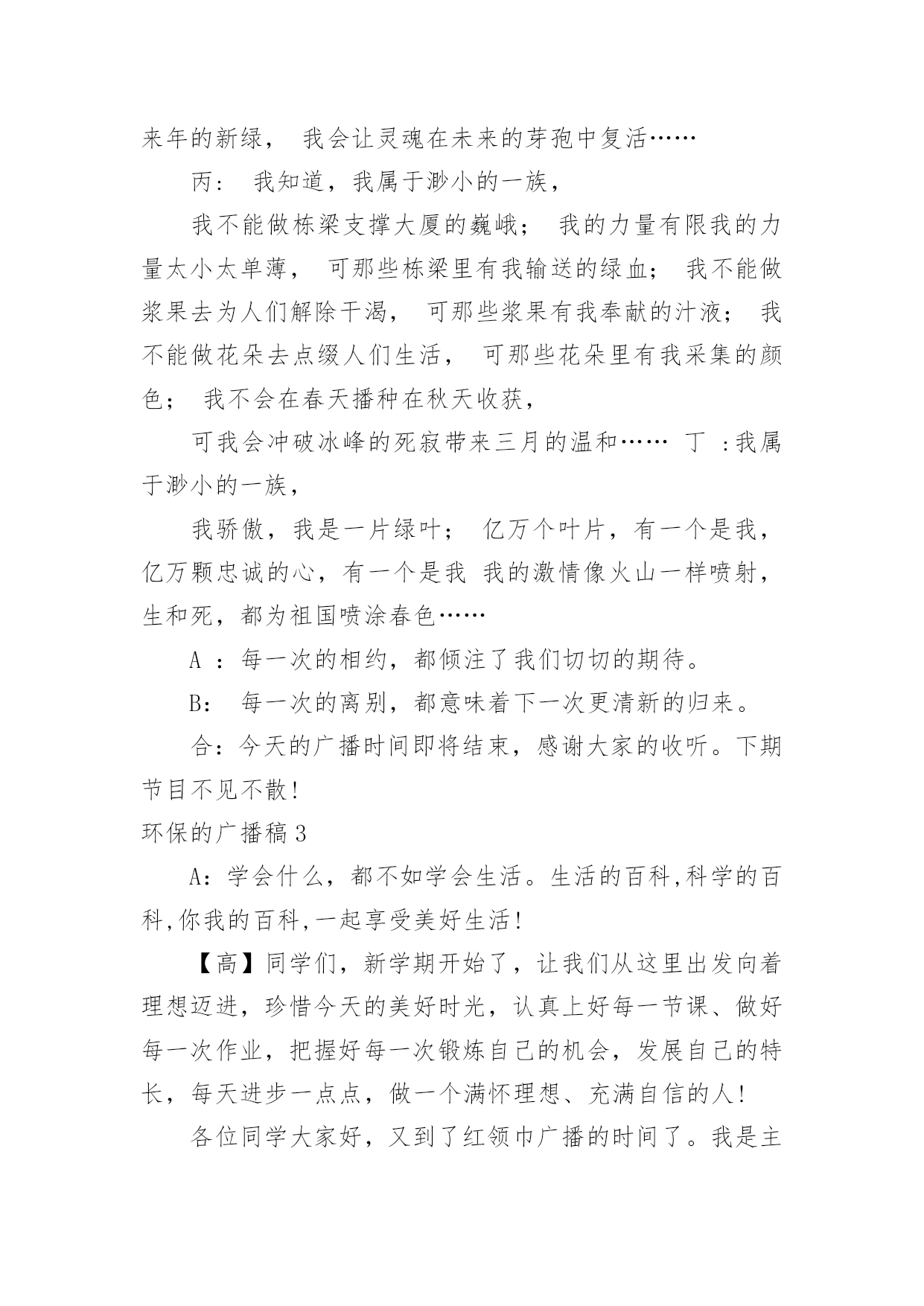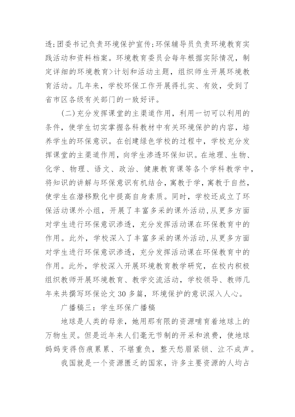 环保的广播稿环保的广播稿有在学校广播站锻炼的同学们,我们广播前一般都会预先做好广播稿,没有广播稿就不会有好的节目效果,那么你有了解过广播稿吗?下面是小编收集整理的环保的广播稿,仅供参考,欢迎大家阅读。环保的广播稿1亲爱的同学们:你们听过鸟儿的哭泣吗?听过地球妈妈的哭泣吗?相信你们和我一样,一定听到了。当人类无止境的把工业"三废"随意的进行排放时,地球妈妈哭了。她哭着说:"那一团团废气、烟尘,那一股股污水、废渣,就像一群群癌细胞张牙舞爪的向她扑去,侵袭着她身体的健康,人类甚至还把臭氧层面纱撕了两个大洞,使紫外线无情的灼伤她的皮肤。当森林植被被盲目、无情的砍伐时,小鸟哭了,它哭泣着说:"它好想有个家"。地球妈妈哭了,哭泣着说:"她的身体越来越来虚弱,红润的变得蜡黄,明亮的眼睛变得呆板无光。洪水、冰雹、狂风、沙漠等妖魔也趁此机会兴风作浪,在她的脸上刻下了无数道深深的皱纹。她越来越疲乏,越来越感到力不从心,可是人类还在不断的增加人口,减少耕地面积。估计到了20xx年,人类吃饭都会成为大问题。"亲爱的同学们,请想一想洪水泛滥成灾的悲剧吧!想一想二氧化碳过多造成的温室效应吧!想想自古就有"八水绕长安"的西安已成为历史!想想鸟儿伤心的哭泣:"我想有个家"。我想,这不但是小鸟的呐喊,这也是人类的呐喊。人类更需要一个环境优美的家。亲爱的同学们,我们的衣、食、住、行无不依赖于大自然的恩赐。大气、森林、湖海、草原无不是我们人类赖以生存的基本条件,破坏了自然环境,就等于自毁家园,制造饥饿。亲爱的同学们,赶快行动起来吧!从你做起,从我做起,转告你身边的每一个人,让我们携起手来,从一点一滴的环保行为做起,多种一棵树,不乱丢垃圾...让地球妈妈早日重现青春光彩,让人类生活得更加幸福、美好吧!谢谢大家!广播稿二:学生环保广播稿如今,通过各种媒体,每个人都越来越多地意识到环境和发展问题的存在。许多人都听说过热带雨林的消失、酸雨、臭氧层破坏、全球变暖、生物多样性锐减、贫困、难民潮、食物危机等问题。但对许多人而言,这些事都发生在遥远的地方,不会发生在本地的环境中。可是,仔细观察就会发现,这些问题有许多就发生在当地,甚至在校园里。学校的学生和教师都是资源的消费者。同时,作为社区的成员和现在的或未来的公民,教师和学生同时又是社区发展的负责人,有责任对社区的可持续发展作出贡献如果把可持续发展的道路比作一条跑道的话,那么在这条跑道之外是没有观众的,所有的人都是运动员。环境和发展问题不仅是政府的事,更是大家的事,个人的事,。环保知识是二十一世纪人才的必备素质之一。为了使师生深入地认识和理解环境问题的重要性,提高师生环境知识、意识、技能、态度、价值观和行为等环境素养。根据国家环保局、国家教委、中央宣传部下发的《关于环境教育行动纲要》及上级有关部门的指示和要求,结合学校实际,近几年,开发区中学全面开展了创建绿色学校的活动。把环保教育列入学校的一件大事常抓不懈,真正将对环境教育的认识融入到师生们的心中。在创建绿色学校的活动中,学校始终重视对学生的环境保护教育工作,在学校、家庭中倡导绿色文明,落实环保行动。在抓好普及的同时,更加注重内涵,坚持在德育、科技活动、团队活动、社会实践等各领域对学生灌输环境意识和环境道德观念。经过几年的探索和实践,取得了较好的成效,积累了一些值得推广的经验。(一)学校领导重视环保工作,建立健全环境教育组织,把环境教育列为学校的重要议事内容。学校成立了环境教育委员会,由校长主抓环境教育工作,负责工作>计划的制定和组织实施;总务主任负责校园环境的保护和绿化美化工作;政教处主任负责专题教育;教务处主任负责课堂教学渗透;团委书记负责环境保护宣传;环保辅导员负责环境教育实践活动和资料档案。环境教育委员会每年根据实际情况,制定详细的环境教育>计划和活动主题,组织师生开展环境教育活动。几年来,学校环保工作开展得扎实、有效,受到了省市区各级有关部门的一致好评。(二)充分发挥课堂的主渠道作用,利用一切可以利用的条件,使学生切实掌握各科教材中有关环境保护的内容,培养学生的环保意识。在创建绿色学校的过程中,学校充分发挥课堂的主渠道作用,向学生渗透环保知识。在地理、生物、化学、物理、语文、政治、健康教育课等各个学科教学中,将知识的讲解与环保意识有机结合,寓教于学,寓教于自然,使学生在潜移默化中提高自身素质。同时,学校还成立了环保活动课外小组,开展了丰富多采的课外活动,从更多方面对学生进行环保意识渗透,充分发挥活动课在环保教育中的作用。此外,学校深入了丰富多采的课外活动,从更多方面对学生进行环保意识渗透,充分发挥活动课在环保教育中的作用。此外,学校深入开展环境教育教学研究,在校内积极组织教师开展环境教育、教学交流活动,学校领导、教师几年来共撰写环保论文30多篇,环境保护的意识深