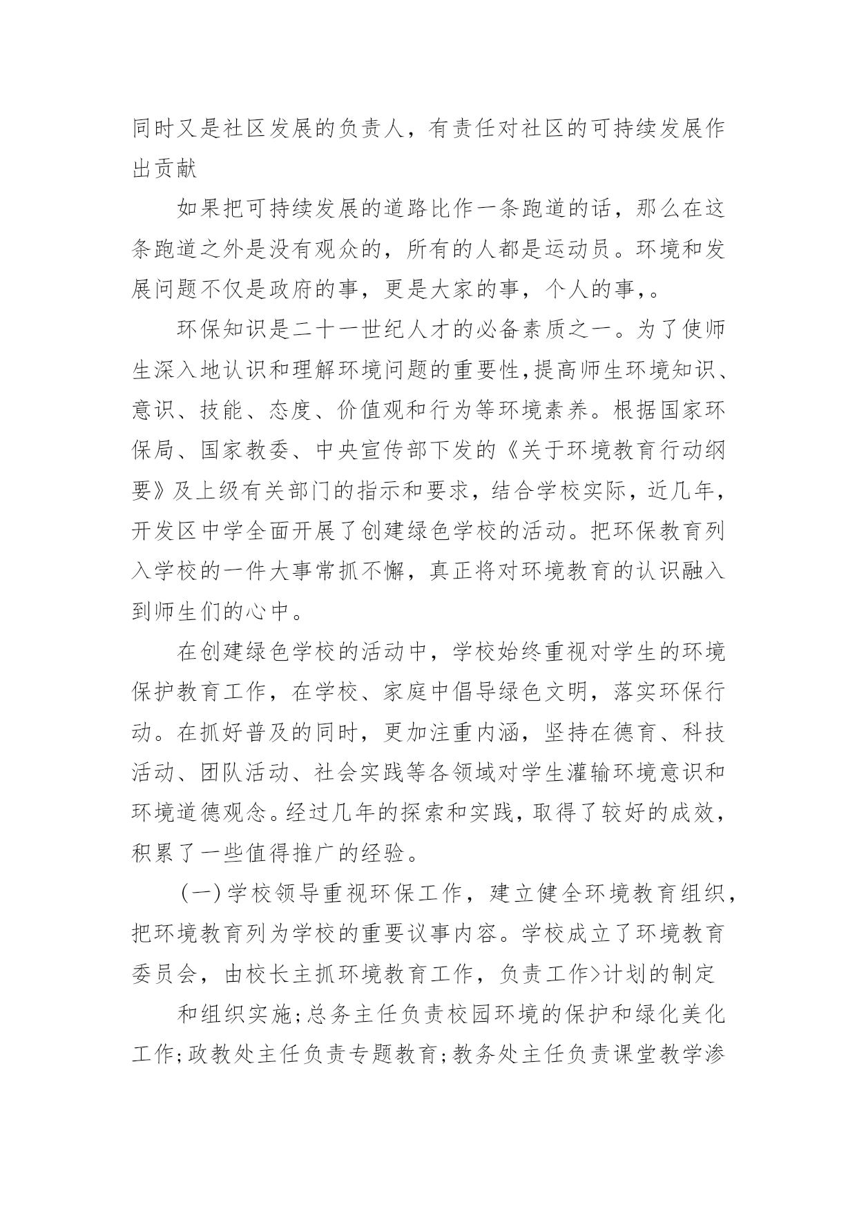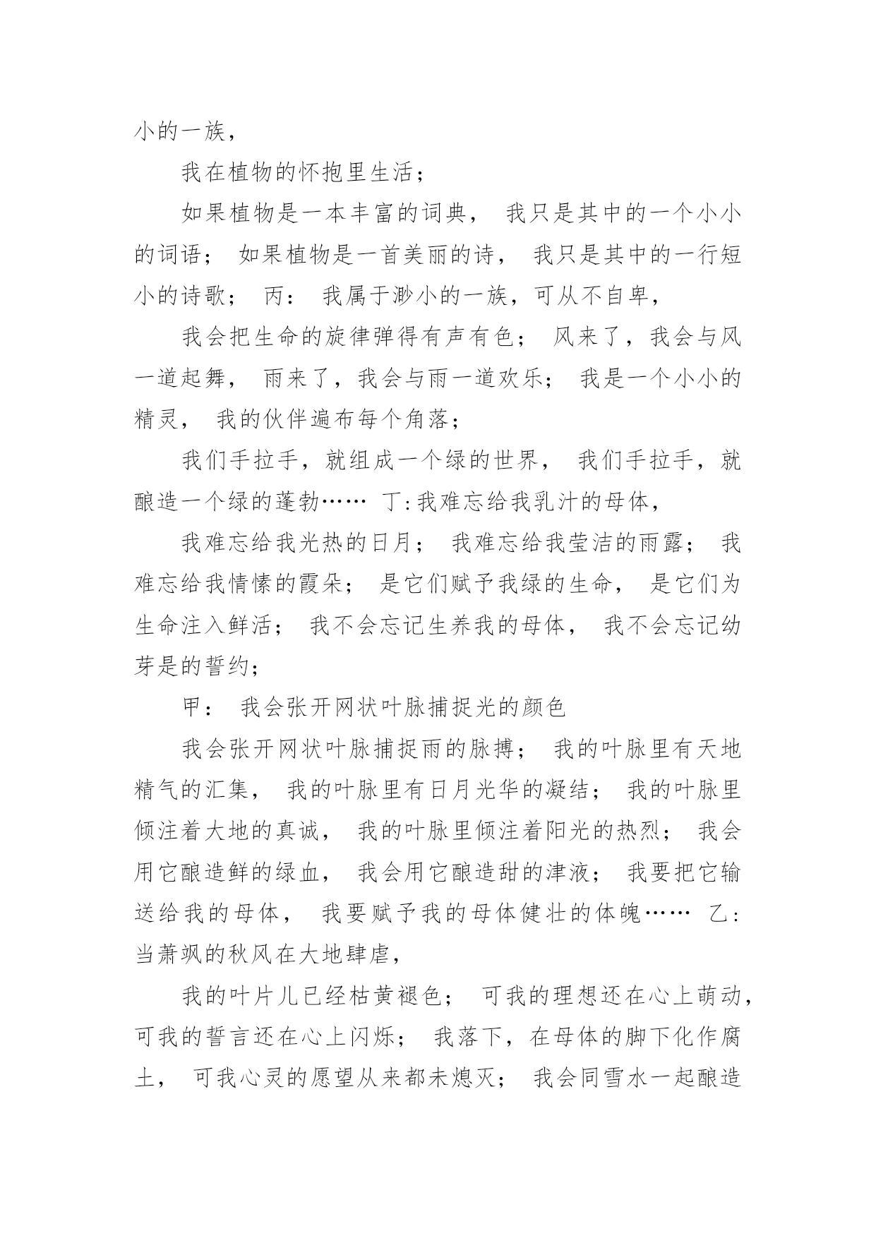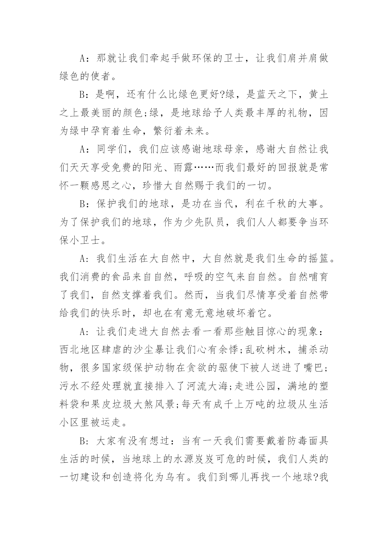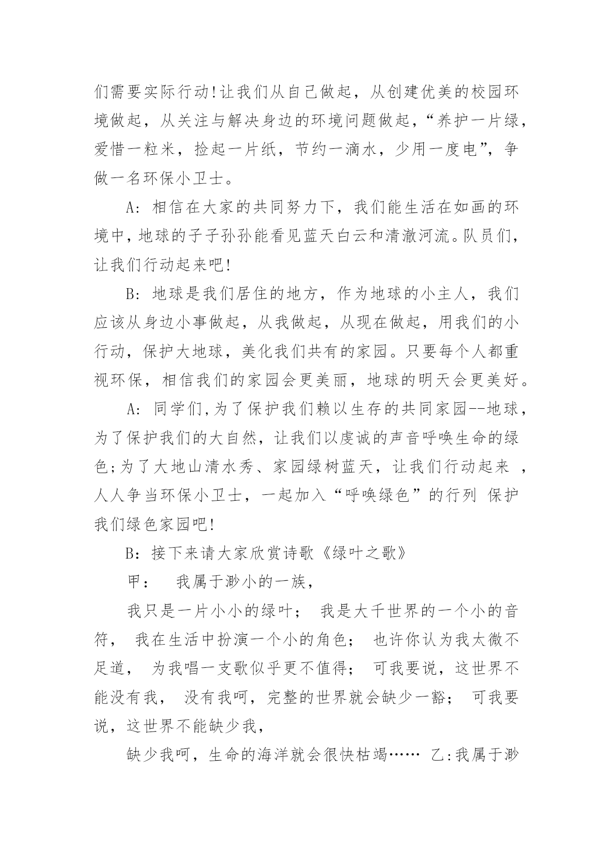 环保的广播稿环保的广播稿有在学校广播站锻炼的同学们,我们广播前一般都会预先做好广播稿,没有广播稿就不会有好的节目效果,那么你有了解过广播稿吗?下面是小编收集整理的环保的广播稿,仅供参考,欢迎大家阅读。环保的广播稿1亲爱的同学们:你们听过鸟儿的哭泣吗?听过地球妈妈的哭泣吗?相信你们和我一样,一定听到了。当人类无止境的把工业"三废"随意的进行排放时,地球妈妈哭了。她哭着说:"那一团团废气、烟尘,那一股股污水、废渣,就像一群群癌细胞张牙舞爪的向她扑去,侵袭着她身体的健康,人类甚至还把臭氧层面纱撕了两个大洞,使紫外线无情的灼伤她的皮肤。当森林植被被盲目、无情的砍伐时,小鸟哭了,它哭泣着说:"它好想有个家"。地球妈妈哭了,哭泣着说:"她的身体越来越来虚弱,红润的变得蜡黄,明亮的眼睛变得呆板无光。洪水、冰雹、狂风、沙漠等妖魔也趁此机会兴风作浪,在她的脸上刻下了无数道深深的皱纹。她越来越疲乏,越来越感到力不从心,可是人类还在不断的增加人口,减少耕地面积。估计到了20xx年,人类吃饭都会成为大问题。"亲爱的同学们,请想一想洪水泛滥成灾的悲剧吧!想一想二氧化碳过多造成的温室效应吧!想想自古就有"八水绕长安"的西安已成为历史!想想鸟儿伤心的哭泣:"我想有个家"。我想,这不但是小鸟的呐喊,这也是人类的呐喊。人类更需要一个环境优美的家。亲爱的同学们,我们的衣、食、住、行无不依赖于大自然的恩赐。大气、森林、湖海、草原无不是我们人类赖以生存的基本条件,破坏了自然环境,就等于自毁家园,制造饥饿。亲爱的同学们,赶快行动起来吧!从你做起,从我做起,转告你身边的每一个人,让我们携起手来,从一点一滴的环保行为做起,多种一棵树,不乱丢垃圾...让地球妈妈早日重现青春光彩,让人类生活得更加幸福、美好吧!谢谢大家!广播稿二:学生环保广播稿如今,通过各种媒体,每个人都越来越多地意识到环境和发展问题的存在。许多人都听说过热带雨林的消失、酸雨、臭氧层破坏、全球变暖、生物多样性锐减、贫困、难民潮、食物危机等问题。但对许多人而言,这些事都发生在遥远的地方,不会发生在本地的环境中。可是,仔细观察就会发现,这些问题有许多就发生在当地,甚至在校园里。学校的学生和教师都是资源的消费者。同时,作为社区的成员和现在的或未来的公民,教师和学生同时又是社区发展的负责人,有责任对社区的可持续发展作出贡献如果把可持续发展的道路比作一条跑道的话,那么在这条跑道之外是没有观众的,所有的人都是运动员。环境和发展问题不仅是政府的事,更是大家的事,个人的事,。环保知识是二十一世纪人才的必备素质之一。为了使师生深入地认识和理解环境问题的重要性,提高师生环境知识、意识、技能、态度、价值观和行为等环境素养。根据国家环保局、国家教委、中央宣传部下发的《关于环境教育行动纲要》及上级有关部门的指示和要求,结合学校实际,近几年,开发区中学全面开展了创建绿色学校的活动。把环保教育列入学校的一件大事常抓不懈,真正将对环境教育的认识融入到师生们的心中。在创建绿色学校的活动中,学校始终重视对学生的环境保护教育工作,在学校、家庭中倡导绿色文明,落实环保行动。在抓好普及的同时,更加注重内涵,坚持在德育、科技活动、团队活动、社会实践等各领域对学生灌输环境意识和环境道德观念。经过几年的探索和实践,取得了较好的成效,积累了一些值得推广的经验。(一)学校领导重视环保工作,建立健全环境教育组织,把环境教育列为学校的重要议事内容。学校成立了环境教育委员会,由校长主抓环境教育工作,负责工作>计划的制定和组织实施;总务主任负责校园环境的保护和绿化美化工作;政教处主任负责专题教育;教务处主任负责课堂教学渗透;团委书记负责环境保护宣传;环保辅导员负责环境教育实践活动和资料档案。环境教育委员会每年根据实际情况,制定详细的环境教育>计划和活动主题,组织师生开展环境教育活动。几年来,学校环保工作开展得扎实、有效,受到了省市区各级有关部门的一致好评。(二)充分发挥课堂的主渠道作用,利用一切可以利用的条件,使学生切实掌握各科教材中有关环境保护的内容,培养学生的环保意识。在创建绿色学校的过程中,学校充分发挥课堂的主渠道作用,向学生渗透环保知识。在地理、生物、化学、物理、语文、政治、健康教育课等各个学科教学中,将知识的讲解与环保意识有机结合,寓教于学,寓教于自然,使学生在潜移默化中提高自身素质。同时,学校还成立了环保活动课外小组,开展了丰富多采的课外活动,从更多方面对学生进行环保意识渗透,充分发挥活动课在环保教育中的作用。此外,学校深入了丰富多采的课外活动,从更多方面对学生进行环保意识渗透,充分发挥活动课在环保教育中的作用。此外,学校深入开展环境教育教学研究,在校内积极组织教师开展环境教育、教学交流活动,学校领导、教师几年来共撰写环保论文30多篇,环境保护的意识深