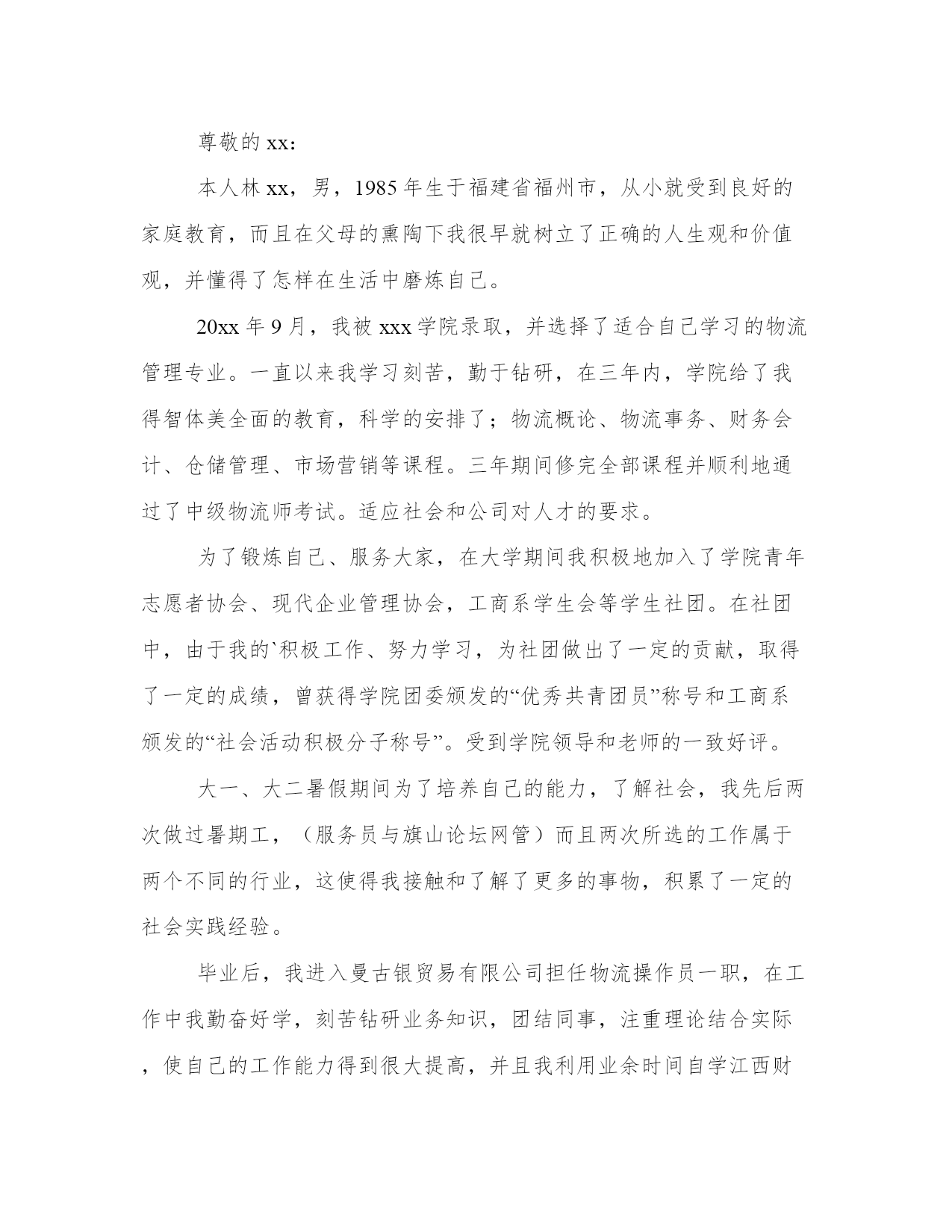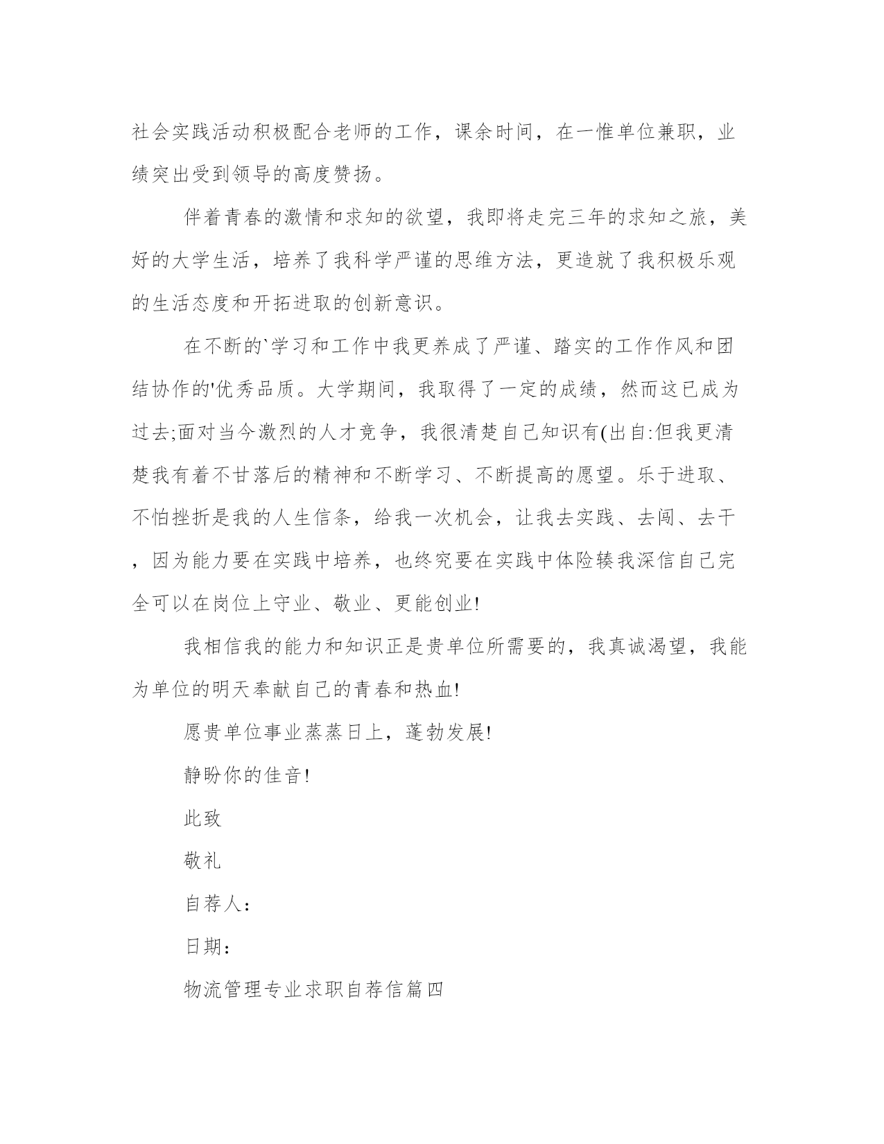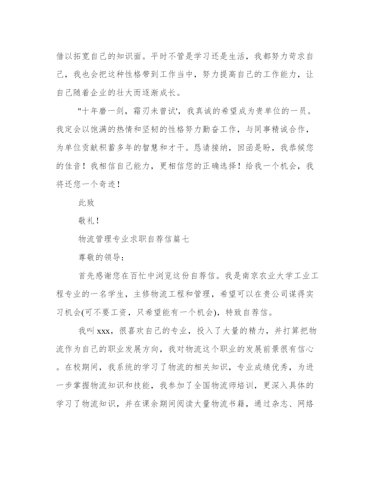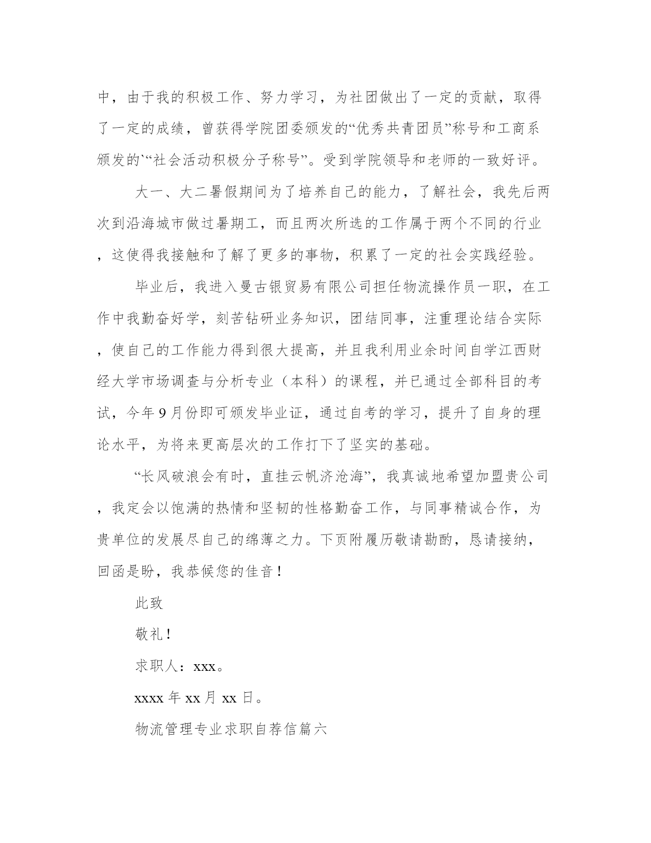 物流管理专业求职自荐信(大全15篇)总结是对自己的一种鞭策,让我们不断追求更好的自己。完美的总结需要我们善于提炼,将繁杂的内容归纳到几个关键的观点中。这是一些总结优秀范文的精选,希望能够对大家的写作有所启示。物流管理专业求职自荐信篇一尊敬的.领导:您好!我是福州外语外贸学院的大学生,我很荣幸有机会在您百忙之中向您呈上我的个人资料,在投身社会之际,为了找到符合自己专业和兴趣的工作,更好的发挥自己的才能,实现自己的人生,我向各位领导做一下自我推荐:我的专业是物流管理,在学习专业课的同时我还一直到校外兼职工作,我利用课余时间从事了很多的兼职工作,从这些兼职工作中我不仅得到了锻炼,更为自己踏入社会打下了良好的基础。我正处于人生中精力充沛的时期,我期望在更广阔的天地里展露自己的才能。我不满足自己现在的知识水平,期望在实践中得到锻炼和提高。因此,我希望能加入贵单位,我会脚踏实地做好我的本职工作,竭尽全力的在工作中取得好成绩,我相信经过自己的努力和您的支持定会为贵单位做出应有的贡献。经过多年的学习和竞争,我深知学无止境,适者生存。如果能为贵单位效劳,在今后的工作中,我将不断学习进取,在努力工作中实现我的人生价值,也为贵单位的发展贡献自己的微薄之力。“羡慕别人的才华,不如学习别人的勤奋。”“没有真正的失败,除非自己放弃了。”这是我的人生信条。“良禽择木而栖”贵校良好的形象,正确的宗旨深深的吸引了我。恳请贵单位能给我一次实现自己人生价值的机会,我坚信,在一个精诚团结,锐意进取的集体中;在一个仁爱领导的润泽和提携下,初涉世事的学子定能兵可成将,木可成才。兹奉送上个人简历和相关资料以供参考。诚祝贵单位万事亨通,前程似锦!此致敬礼自荐者:20xx年x月x日物流管理专业求职自荐信篇二尊敬的领导:您好!首先感谢您在百忙之中抽出时间来阅读我的自荐材料。新世纪,风云际会,机会与挑战,两相并存。我是一名即将毕业的大二学生,现需要一份工作来完善我的大学生涯。大学两年,在学习上我全身心投入到本专业物流管理的学习中外,还学习了感兴趣的心理知识,课余时间基本都在图书馆阅读喜欢的书籍,从中找寻读书的'乐趣。此外,我还积极地参加各种社会活动,加入院学生会学习部、校文学社、校英文广播电台等社团,结交了许多值得相互学习的同学,赢得了人生又一笔宝贵的财富。此外,在服务他人的同时积极培养了自己的社交能力,抓住每一个机会,锻炼自己。大学两年,我深深地感受到,与优秀学生共事,能使我在竞争中获益;向实际困难挑战,让我在挫折中成长。祖辈们教我勤奋、尽责、善良、正直;黄冈职业技术学院培养了我崇德、强能、务实、创新的的良好信念。我热爱贵公司所从事的事业,殷切地期望能够在您的领导下,为这一光荣的事业添砖加瓦,且能有机会继续从各方面提升自己。我没有过人的优势,只有一颗真诚的心和一副勤劳的身躯,两年中我养成早睡早起的良。好作息习惯。在书本与社会实践中制造完善自我的机会。从学校到社会,我知道有一个成长的过程。但这个乘风破浪的时代需要我们勇敢向前,无所畏惧。我相信只要有奋斗不息的精神和和强大的内心,前进的动力不衰,凭着对未来的追求和探索,对事业的执着和热爱,我自信能在一个文明、团结、进步的集体中,竭尽所能,再添辉煌。面对挑战,我愿一展所学,开创未来!我很期望能进入贵公司,并为公司的发展贡献自己的一份力量。祝您工作顺利。身体健康。求职人:xxx。xxxx年xx月xx日。物流管理专业求职自荐信篇三尊敬的领导:你好!非常感谢你能在百忙之中抽出时间审阅我的自荐书!我是兰州外语职业学院物流管理的学生,将在20xx年6月毕业。在即将踏上征程之际,在此呈上自己的求职信息,特毛遂自荐,愿意接受贵公司的考核与挑选。我通过各种渠道大致了解了贵公司的情况,知道贵公司是个很有发展前途的具有现代潮流的公司,具有很大的活力,而我也非常希望能加入这样的企业,尽自己最大努力为公司的发展奉献自己的微薄之力。同时能对自己的发展起到积极的作用,希望能在贵公司的帮助下、在贵公司大发展的环境下促进自己的发展。现谨向你作一下自我推荐:在大学生活中,我很好的掌握了专业知识,主修了物流概论、企业物流管理、仓储与配送管理、物流经济学、物流信息管理、供应链管理、运输实务管理、电子商务、财务会计、数据库、市场营销等课程,并都取得了较为优秀的成绩。21世纪呼唤综合性人才我知道光是有好的理论知识是不够的。所以在学有余力的情况下我一直积极参与社会实践活动积极配合老师的工作,课余时间,在一惟单位兼职,业绩突出受到领导的高度赞扬。伴着青春的激情和求知的欲望,我即将走完三年的求知之旅,美好的大学生活,培养了我科学严谨的思维方法,更造就了我积极乐观的生活态度和开拓进取的创新意识。在不断的`学习和工作