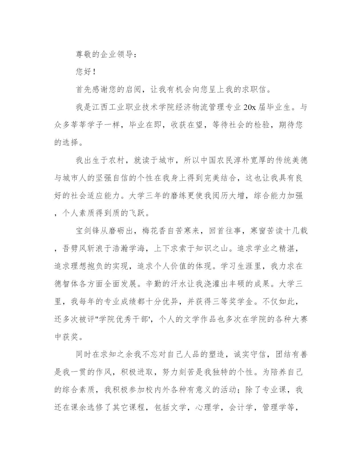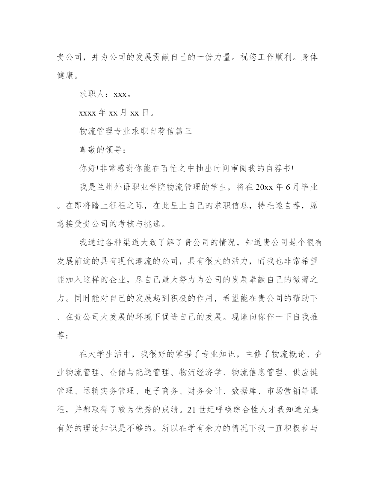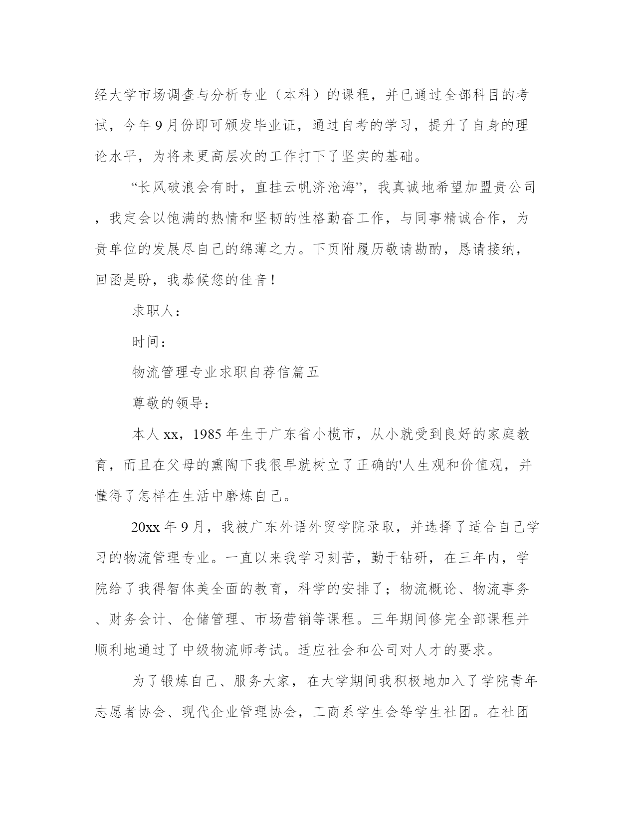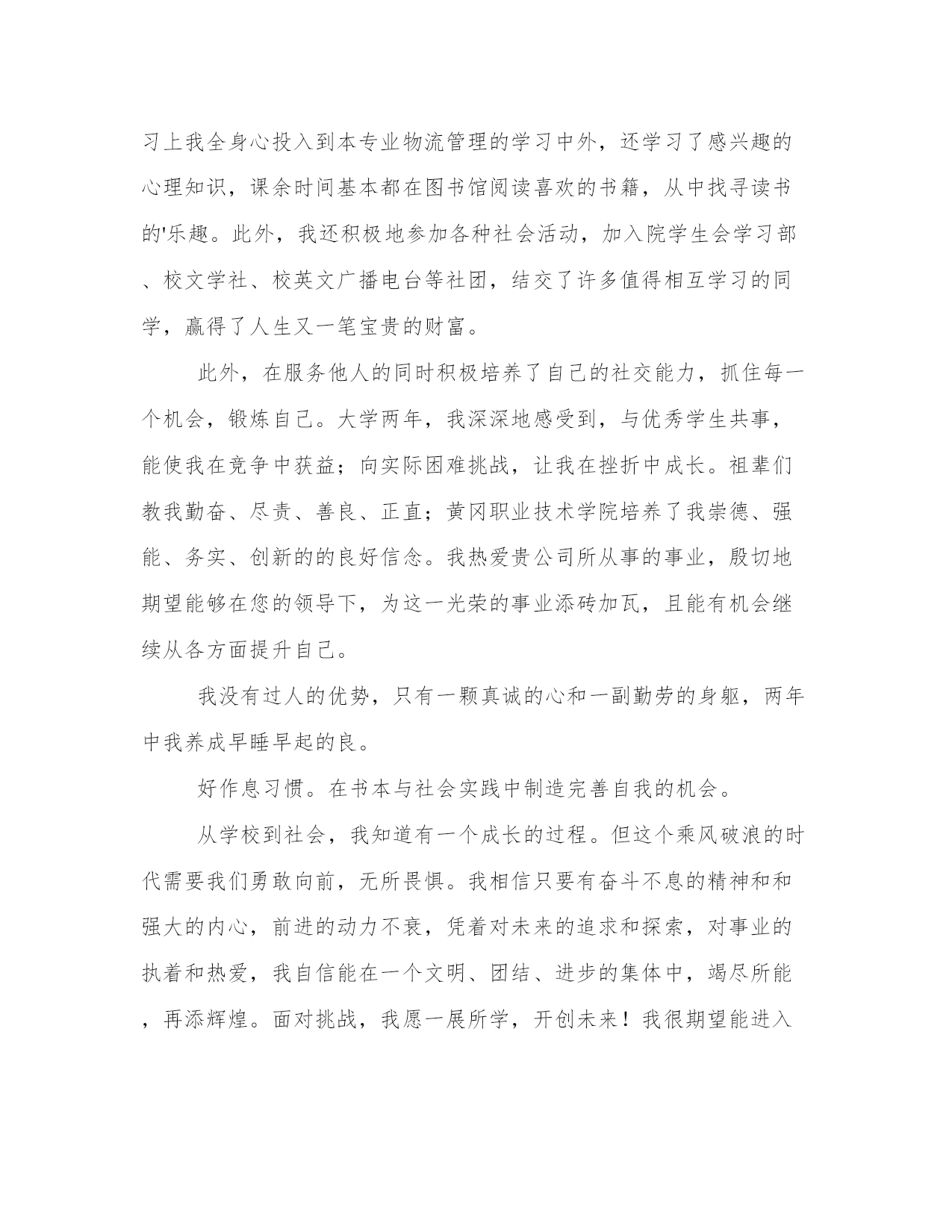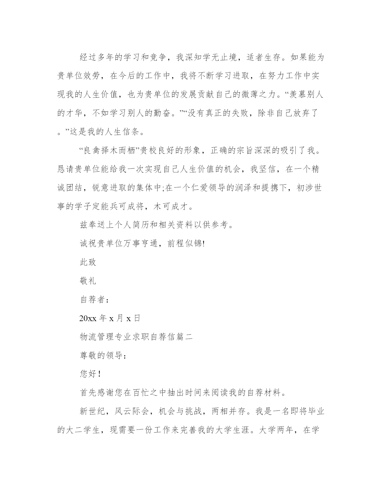 物流管理专业求职自荐信(大全15篇)总结是对自己的一种鞭策,让我们不断追求更好的自己。完美的总结需要我们善于提炼,将繁杂的内容归纳到几个关键的观点中。这是一些总结优秀范文的精选,希望能够对大家的写作有所启示。物流管理专业求职自荐信篇一尊敬的.领导:您好!我是福州外语外贸学院的大学生,我很荣幸有机会在您百忙之中向您呈上我的个人资料,在投身社会之际,为了找到符合自己专业和兴趣的工作,更好的发挥自己的才能,实现自己的人生,我向各位领导做一下自我推荐:我的专业是物流管理,在学习专业课的同时我还一直到校外兼职工作,我利用课余时间从事了很多的兼职工作,从这些兼职工作中我不仅得到了锻炼,更为自己踏入社会打下了良好的基础。我正处于人生中精力充沛的时期,我期望在更广阔的天地里展露自己的才能。我不满足自己现在的知识水平,期望在实践中得到锻炼和提高。因此,我希望能加入贵单位,我会脚踏实地做好我的本职工作,竭尽全力的在工作中取得好成绩,我相信经过自己的努力和您的支持定会为贵单位做出应有的贡献。经过多年的学习和竞争,我深知学无止境,适者生存。如果能为贵单位效劳,在今后的工作中,我将不断学习进取,在努力工作中实现我的人生价值,也为贵单位的发展贡献自己的微薄之力。“羡慕别人的才华,不如学习别人的勤奋。”“没有真正的失败,除非自己放弃了。”这是我的人生信条。“良禽择木而栖”贵校良好的形象,正确的宗旨深深的吸引了我。恳请贵单位能给我一次实现自己人生价值的机会,我坚信,在一个精诚团结,锐意进取的集体中;在一个仁爱领导的润泽和提携下,初涉世事的学子定能兵可成将,木可成才。兹奉送上个人简历和相关资料以供参考。诚祝贵单位万事亨通,前程似锦!此致敬礼自荐者:20xx年x月x日物流管理专业求职自荐信篇二尊敬的领导:您好!首先感谢您在百忙之中抽出时间来阅读我的自荐材料。新世纪,风云际会,机会与挑战,两相并存。我是一名即将毕业的大二学生,现需要一份工作来完善我的大学生涯。大学两年,在学习上我全身心投入到本专业物流管理的学习中外,还学习了感兴趣的心理知识,课余时间基本都在图书馆阅读喜欢的书籍,从中找寻读书的'乐趣。此外,我还积极地参加各种社会活动,加入院学生会学习部、校文学社、校英文广播电台等社团,结交了许多值得相互学习的同学,赢得了人生又一笔宝贵的财富。此外,在服务他人的同时积极培养了自己的社交能力,抓住每一个机会,锻炼自己。大学两年,我深深地感受到,与优秀学生共事,能使我在竞争中获益;向实际困难挑战,让我在挫折中成长。祖辈们教我勤奋、尽责、善良、正直;黄冈职业技术学院培养了我崇德、强能、务实、创新的的良好信念。我热爱贵公司所从事的事业,殷切地期望能够在您的领导下,为这一光荣的事业添砖加瓦,且能有机会继续从各方面提升自己。我没有过人的优势,只有一颗真诚的心和一副勤劳的身躯,两年中我养成早睡早起的良。好作息习惯。在书本与社会实践中制造完善自我的机会。从学校到社会,我知道有一个成长的过程。但这个乘风破浪的时代需要我们勇敢向前,无所畏惧。我相信只要有奋斗不息的精神和和强大的内心,前进的动力不衰,凭着对未来的追求和探索,对事业的执着和热爱,我自信能在一个文明、团结、进步的集体中,竭尽所能,再添辉煌。面对挑战,我愿一展所学,开创未来!我很期望能进入贵公司,并为公司的发展贡献自己的一份力量。祝您工作顺利。身体健康。求职人:xxx。xxxx年xx月xx日。物流管理专业求职自荐信篇三尊敬的领导:你好!非常感谢你能在百忙之中抽出时间审阅我的自荐书!我是兰州外语职业学院物流管理的学生,将在20xx年6月毕业。在即将踏上征程之际,在此呈上自己的求职信息,特毛遂自荐,愿意接受贵公司的考核与挑选。我通过各种渠道大致了解了贵公司的情况,知道贵公司是个很有发展前途的具有现代潮流的公司,具有很大的活力,而我也非常希望能加入这样的企业,尽自己最大努力为公司的发展奉献自己的微薄之力。同时能对自己的发展起到积极的作用,希望能在贵公司的帮助下、在贵公司大发展的环境下促进自己的发展。现谨向你作一下自我推荐:在大学生活中,我很好的掌握了专业知识,主修了物流概论、企业物流管理、仓储与配送管理、物流经济学、物流信息管理、供应链管理、运输实务管理、电子商务、财务会计、数据库、市场营销等课程,并都取得了较为优秀的成绩。21世纪呼唤综合性人才我知道光是有好的理论知识是不够的。所以在学有余力的情况下我一直积极参与社会实践活动积极配合老师的工作,课余时间,在一惟单位兼职,业绩突出受到领导的高度赞扬。伴着青春的激情和求知的欲望,我即将走完三年的求知之旅,美好的大学生活,培养了我科学严谨的思维方法,更造就了我积极乐观的生活态度和开拓进取的创新意识。在不断的`学习和工作