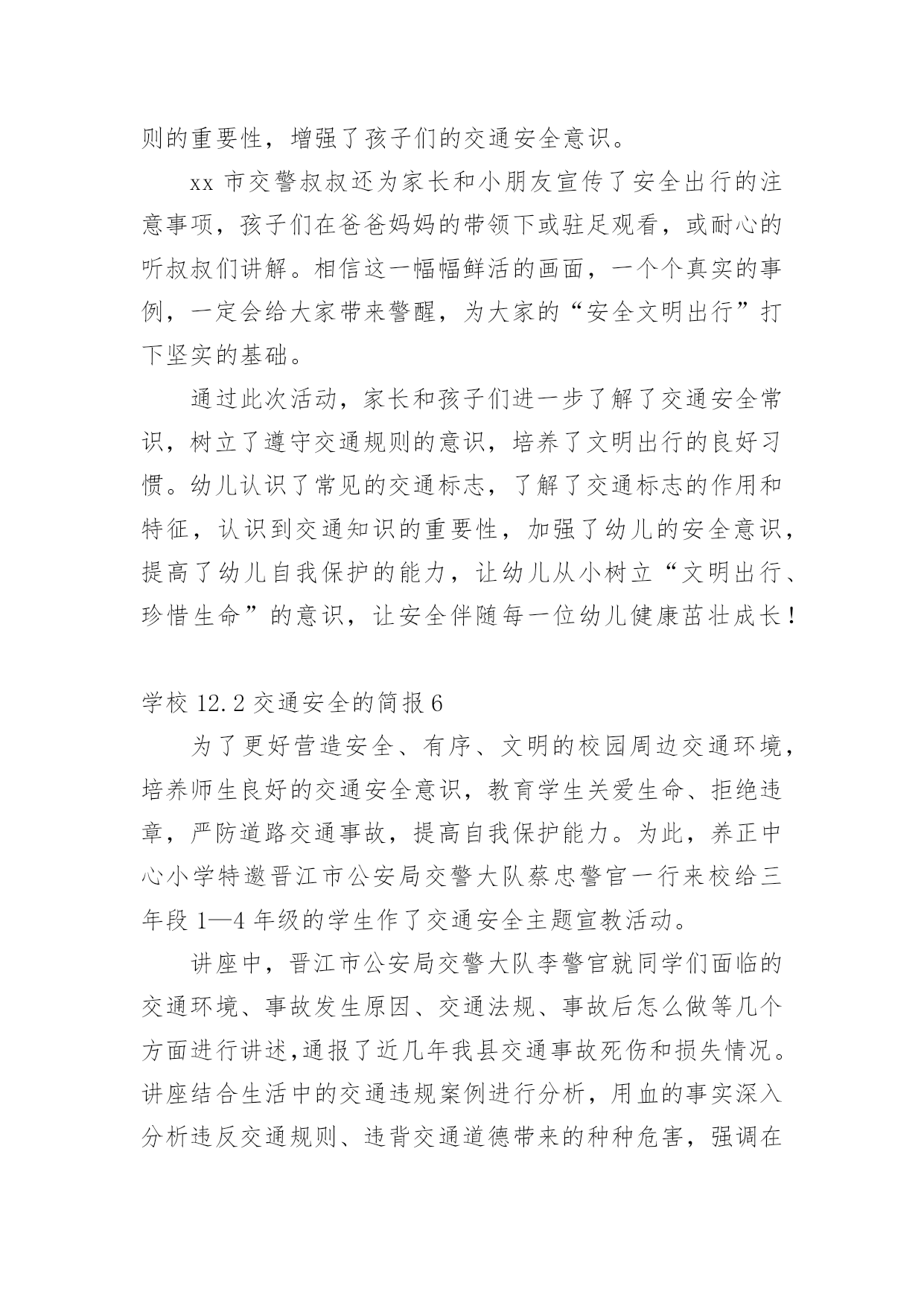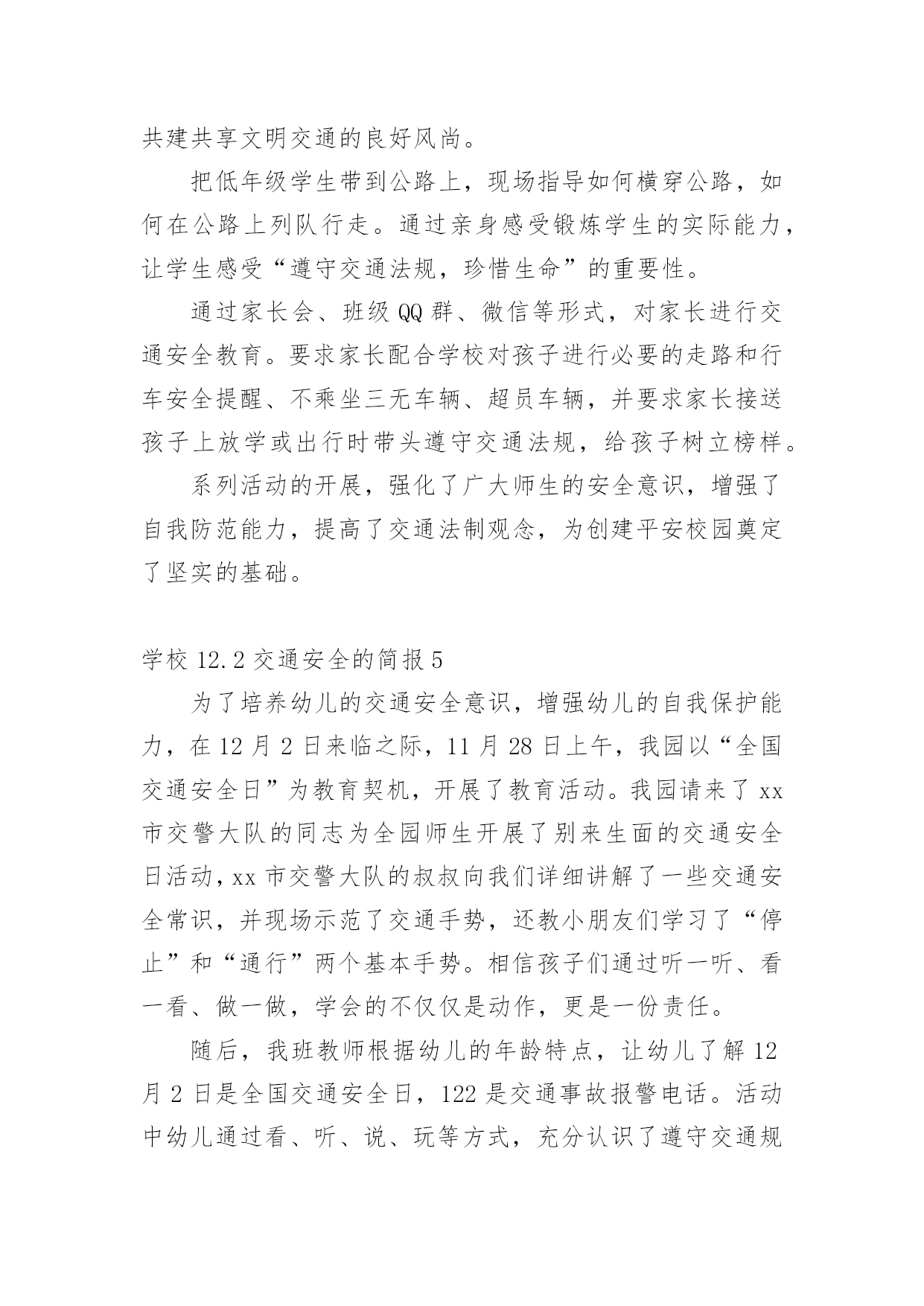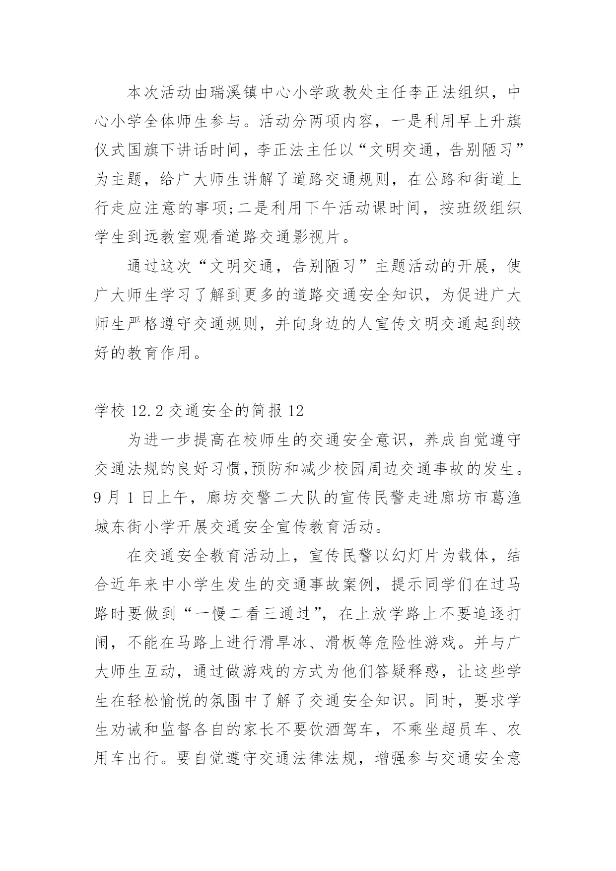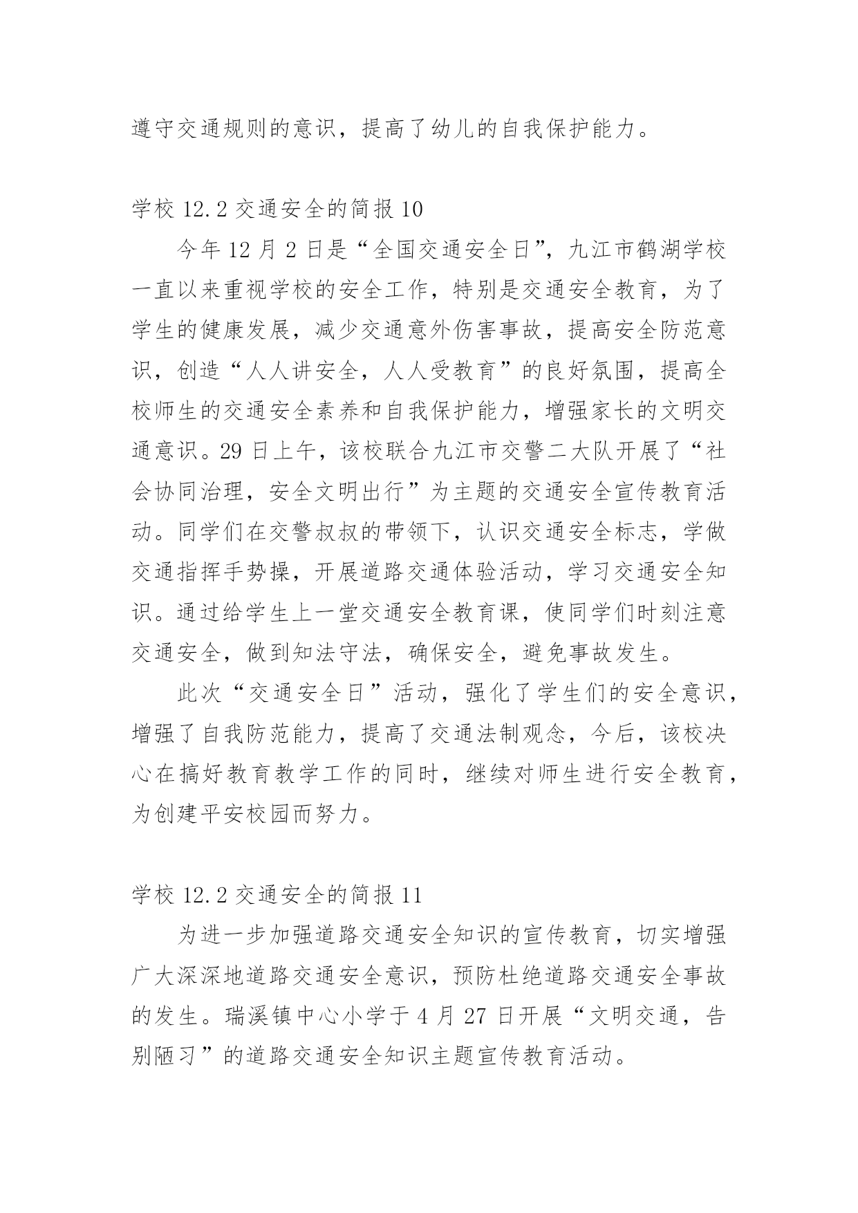 学校12.2交通安全的简报学校12.2交通安全的简报范文(通用14篇)在日常学习、工作抑或是生活中,很多地方都会使用到简报,简报是传递某方面信息的简短的内部小报。什么样的简报才是有效的呢?以下是小编为大家整理的学校12.2交通安全的简报范文(通用14篇),希望对大家有所帮助。学校12.2交通安全的简报1为加强辖区内幼儿园交通安全宣传教育,深入推进学校及周边交通安全管理工作,进入11月份,xx县公安局交警大队组织辖区各中小学及幼儿园负责人召开调度会,开展交通安全知识培训。在会上,为切实从源头杜绝各类违规校车上路行驶,xx交警大队还组织中小学校及幼儿园负责人签订了交通安全承诺书。此次活动,进一步充实了校园交通安全教育的内容,大大增强了交通安全意识、法制意识以及自我保护能力,对保障校车交通安全、维护校园交通安全秩序起到了积极的推动作用。学校12.2交通安全的简报2为深入推进公安交警队伍教育整顿和学习党史教育,近日,峄城交警大队邀请二十八中、苏堂小学、实验小学、荀子学校、匡衡小学、城郊中学相关负责人到大队召开了校园交通安全座谈会。会议指出中小学生交通安全问题,直接关系到千家万户的安宁和社会稳定,多年来交警大队立足本职、发挥职能,采取多种有效措施,努力为中小学生创造了安全祥和的道路交通环境。大队长张文奎与学校负责人进行了面对面交流,询问了学校在道路交通安全方面遇到的难点问题,征求了对公安交通管理工作的意见建议。并表示将紧密结合队伍教育整顿,立足主责主业,扎实开展好“我为群众办实事”活动。深入细致了解学校需求,把学校、家长普遍关心、反映强烈的热点、难点、焦点问题作为工作重点,认真分析调研,全力以赴保障中小学生的交通安全。今后一定会持之以恒的坚持护校岗制度,确保学生上放学期间的交通安全;强化巡逻,确定固定时间段、固定路线、固定巡逻人员,在学校门前和周边巡逻,做到学生上、放学高峰时段“见警车、见警灯、见交警”;定期听取学校的意见和建议,发现问题,及时解决,仅凭自身无力解决的,逐级上报,协调解决。学校12.2交通安全的简报3为确保“国庆节”期间道路交通安全畅通、有序,9月27日上午,建阳区公安局交警大队组织全体民警召开了工作会议,部署节日期间辖区道路交通管理工作。会议上,区公安局副政委、交警大队长王升提出了几点工作要求:一是要提升思想认识,落实责任,要高度重视“国庆节”期间交通安全保卫工作,认清当前道路交通安全的严峻形势,坚决克服松懈、麻痹思想,确保“国庆节”期间道路安全畅通。二是要加强领导带班制度,加强值班备勤,要求全体民警、警察进入一级备勤状态,保持通讯畅通,做到及时出警,快速处置。三是加强路面管控,严厉查处客车超员、酒后驾驶、疲劳驾驶、涉牌涉证、毒驾等交通违法行为,特别是对易燃易爆、危化物品运输车辆的安全检查,及时消除安全隐患。四是要严格文明规范执法,坚决做到依法执法、文明管理。五是加强宣传教育,进一步提升驾驶人及市民群众的安全行车、文明驾驶、安全出行的良好意识。学校12.2交通安全的简报4今年12月2日是国务院批准设立的第xx个“全国交通安全日”,为提升学生交通安全意识、法治意识和文明意识,南江县元潭镇小学开展了一系列宣传教育活动。利用周一的国旗下讲话使全校师生知晓12月2日是“全国交通安全日”。利用学校LED显示屏进行滚动式播放各种交通宣传标语、全国交通安全宣传日的主题和精神。利用班班通设备组织学生观看了交通安全事故案例视频,并到下两派出所索取有关交通安全的图片资料、交通法律、法规、交通标志牌和事故案例图片在学校操场上进行展览。印制、发放了交通安全知识宣传单,采用小手拉大手,让学生把学到的交通安全知识讲给家长听,努力形成全社会共建共享文明交通的良好风尚。把低年级学生带到公路上,现场指导如何横穿公路,如何在公路上列队行走。通过亲身感受锻炼学生的实际能力,让学生感受“遵守交通法规,珍惜生命”的重要性。通过家长会、班级QQ群、微信等形式,对家长进行交通安全教育。要求家长配合学校对孩子进行必要的走路和行车安全提醒、不乘坐三无车辆、超员车辆,并要求家长接送孩子上放学或出行时带头遵守交通法规,给孩子树立榜样。系列活动的开展,强化了广大师生的安全意识,增强了自我防范能力,提高了交通法制观念,为创建平安校园奠定了坚实的基础。学校12.2交通安全的简报5为了培养幼儿的交通安全意识,增强幼儿的自我保护能力,在12月2日来临之际,11月28日上午,我园以“全国交通安全日”为教育契机,开展了教育活动。我园请来了xx市交警大队的同志为全园师生开展了别来生面的交通安全日活动,xx市交警大队的叔叔向我们详细讲解了一些交通安全常识,并现场示范了交通手势,还教小朋友们学习了“停止”和“通行”两个基本手势。相信孩子们通过听一听、看一看、做一做,学会的不仅仅是动作,更
