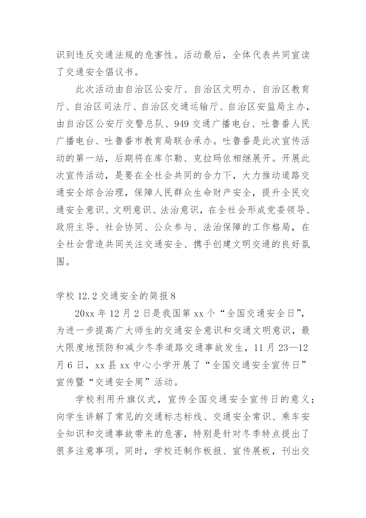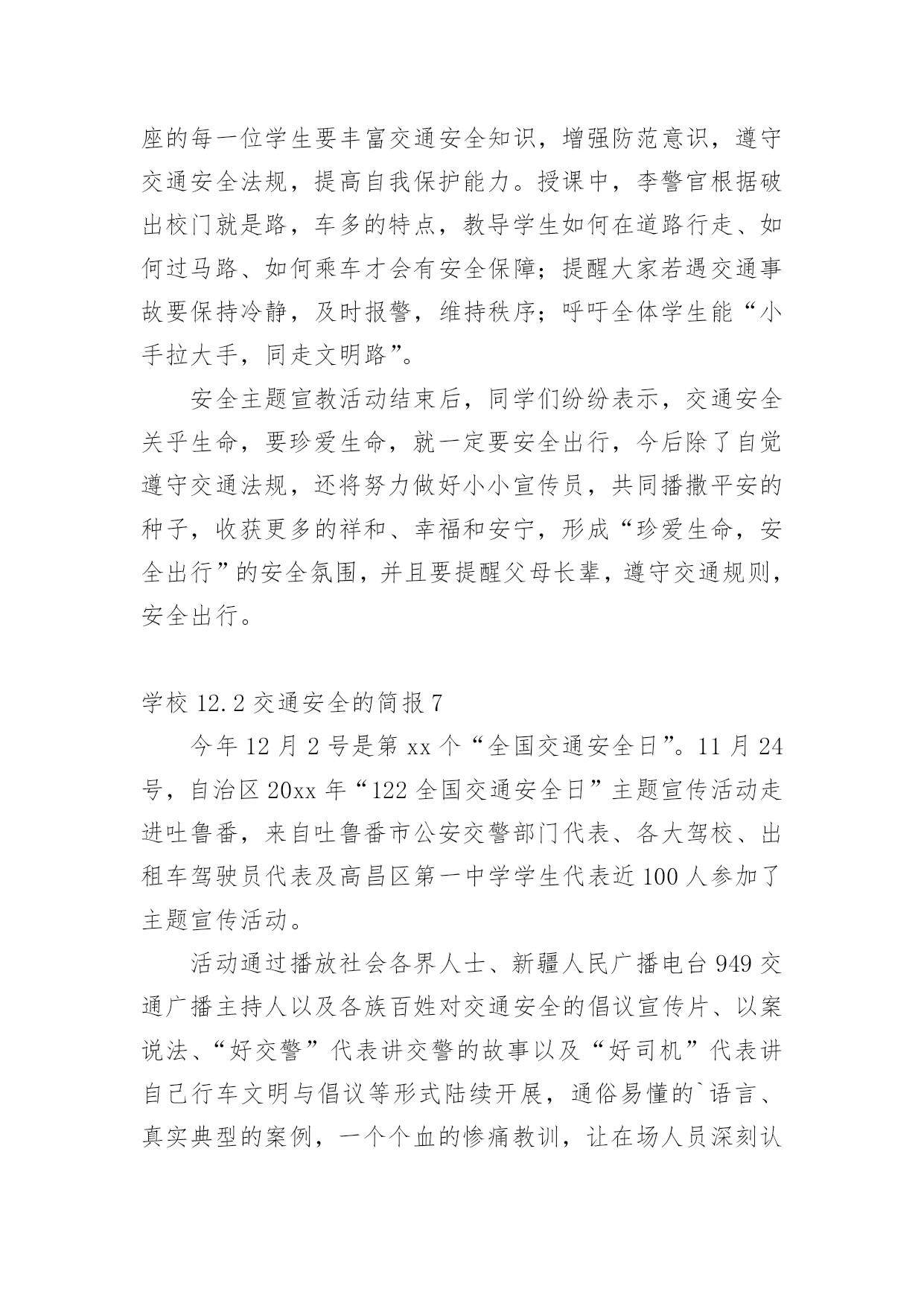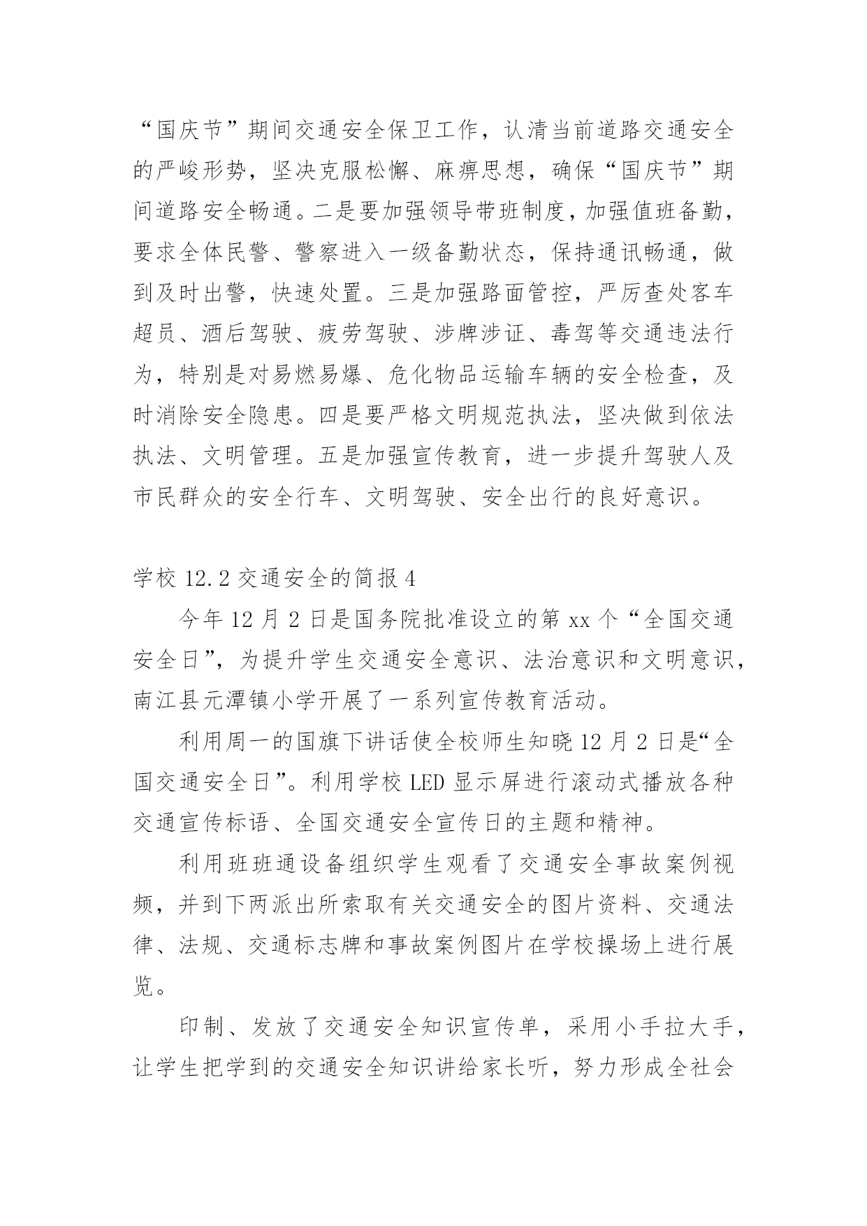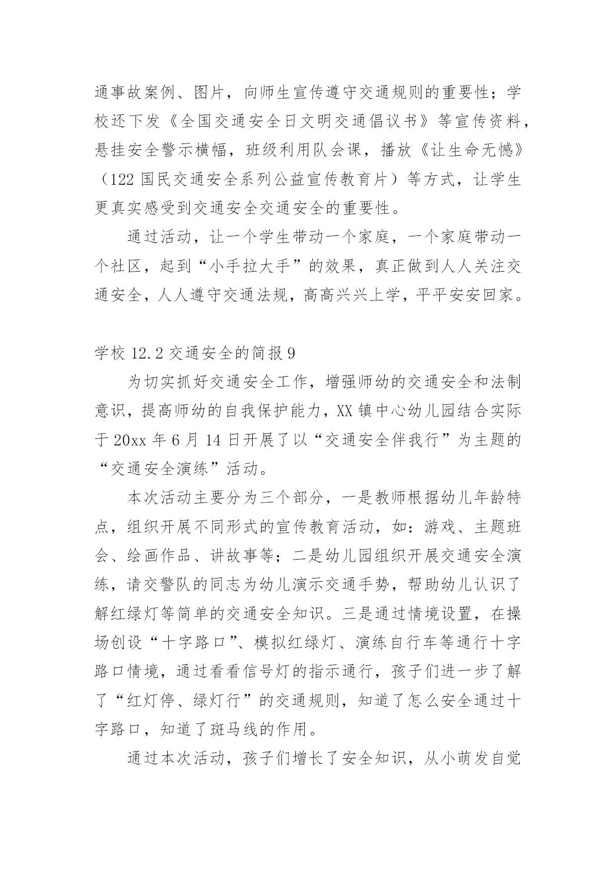学校12.2交通安全的简报学校12.2交通安全的简报范文(通用14篇)在日常学习、工作抑或是生活中,很多地方都会使用到简报,简报是传递某方面信息的简短的内部小报。什么样的简报才是有效的呢?以下是小编为大家整理的学校12.2交通安全的简报范文(通用14篇),希望对大家有所帮助。学校12.2交通安全的简报1为加强辖区内幼儿园交通安全宣传教育,深入推进学校及周边交通安全管理工作,进入11月份,xx县公安局交警大队组织辖区各中小学及幼儿园负责人召开调度会,开展交通安全知识培训。在会上,为切实从源头杜绝各类违规校车上路行驶,xx交警大队还组织中小学校及幼儿园负责人签订了交通安全承诺书。此次活动,进一步充实了校园交通安全教育的内容,大大增强了交通安全意识、法制意识以及自我保护能力,对保障校车交通安全、维护校园交通安全秩序起到了积极的推动作用。学校12.2交通安全的简报2为深入推进公安交警队伍教育整顿和学习党史教育,近日,峄城交警大队邀请二十八中、苏堂小学、实验小学、荀子学校、匡衡小学、城郊中学相关负责人到大队召开了校园交通安全座谈会。会议指出中小学生交通安全问题,直接关系到千家万户的安宁和社会稳定,多年来交警大队立足本职、发挥职能,采取多种有效措施,努力为中小学生创造了安全祥和的道路交通环境。大队长张文奎与学校负责人进行了面对面交流,询问了学校在道路交通安全方面遇到的难点问题,征求了对公安交通管理工作的意见建议。并表示将紧密结合队伍教育整顿,立足主责主业,扎实开展好“我为群众办实事”活动。深入细致了解学校需求,把学校、家长普遍关心、反映强烈的热点、难点、焦点问题作为工作重点,认真分析调研,全力以赴保障中小学生的交通安全。今后一定会持之以恒的坚持护校岗制度,确保学生上放学期间的交通安全;强化巡逻,确定固定时间段、固定路线、固定巡逻人员,在学校门前和周边巡逻,做到学生上、放学高峰时段“见警车、见警灯、见交警”;定期听取学校的意见和建议,发现问题,及时解决,仅凭自身无力解决的,逐级上报,协调解决。学校12.2交通安全的简报3为确保“国庆节”期间道路交通安全畅通、有序,9月27日上午,建阳区公安局交警大队组织全体民警召开了工作会议,部署节日期间辖区道路交通管理工作。会议上,区公安局副政委、交警大队长王升提出了几点工作要求:一是要提升思想认识,落实责任,要高度重视“国庆节”期间交通安全保卫工作,认清当前道路交通安全的严峻形势,坚决克服松懈、麻痹思想,确保“国庆节”期间道路安全畅通。二是要加强领导带班制度,加强值班备勤,要求全体民警、警察进入一级备勤状态,保持通讯畅通,做到及时出警,快速处置。三是加强路面管控,严厉查处客车超员、酒后驾驶、疲劳驾驶、涉牌涉证、毒驾等交通违法行为,特别是对易燃易爆、危化物品运输车辆的安全检查,及时消除安全隐患。四是要严格文明规范执法,坚决做到依法执法、文明管理。五是加强宣传教育,进一步提升驾驶人及市民群众的安全行车、文明驾驶、安全出行的良好意识。学校12.2交通安全的简报4今年12月2日是国务院批准设立的第xx个“全国交通安全日”,为提升学生交通安全意识、法治意识和文明意识,南江县元潭镇小学开展了一系列宣传教育活动。利用周一的国旗下讲话使全校师生知晓12月2日是“全国交通安全日”。利用学校LED显示屏进行滚动式播放各种交通宣传标语、全国交通安全宣传日的主题和精神。利用班班通设备组织学生观看了交通安全事故案例视频,并到下两派出所索取有关交通安全的图片资料、交通法律、法规、交通标志牌和事故案例图片在学校操场上进行展览。印制、发放了交通安全知识宣传单,采用小手拉大手,让学生把学到的交通安全知识讲给家长听,努力形成全社会共建共享文明交通的良好风尚。把低年级学生带到公路上,现场指导如何横穿公路,如何在公路上列队行走。通过亲身感受锻炼学生的实际能力,让学生感受“遵守交通法规,珍惜生命”的重要性。通过家长会、班级QQ群、微信等形式,对家长进行交通安全教育。要求家长配合学校对孩子进行必要的走路和行车安全提醒、不乘坐三无车辆、超员车辆,并要求家长接送孩子上放学或出行时带头遵守交通法规,给孩子树立榜样。系列活动的开展,强化了广大师生的安全意识,增强了自我防范能力,提高了交通法制观念,为创建平安校园奠定了坚实的基础。学校12.2交通安全的简报5为了培养幼儿的交通安全意识,增强幼儿的自我保护能力,在12月2日来临之际,11月28日上午,我园以“全国交通安全日”为教育契机,开展了教育活动。我园请来了xx市交警大队的同志为全园师生开展了别来生面的交通安全日活动,xx市交警大队的叔叔向我们详细讲解了一些交通安全常识,并现场示范了交通手势,还教小朋友们学习了“停止”和“通行”两个基本手势。相信孩子们通过听一听、看一看、做一做,学会的不仅仅是动作,更