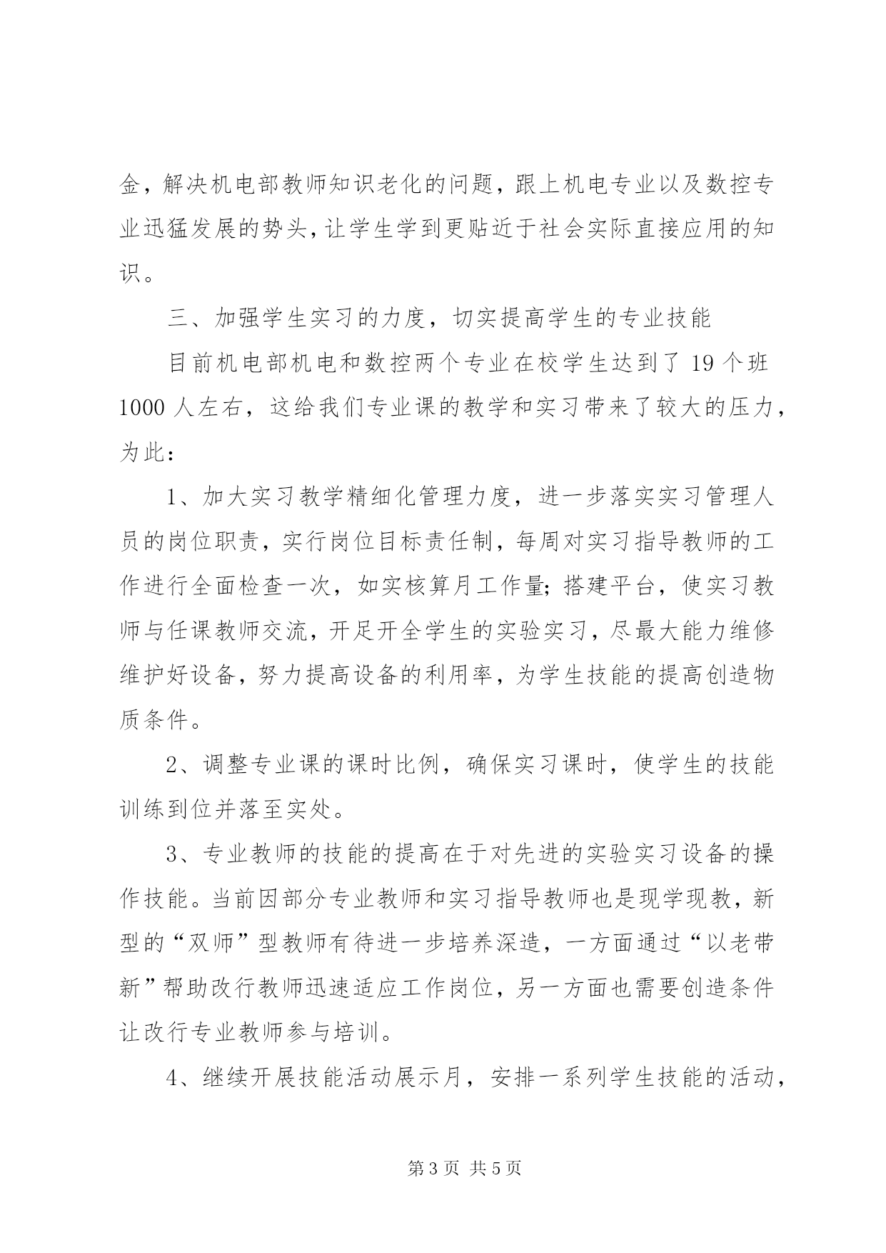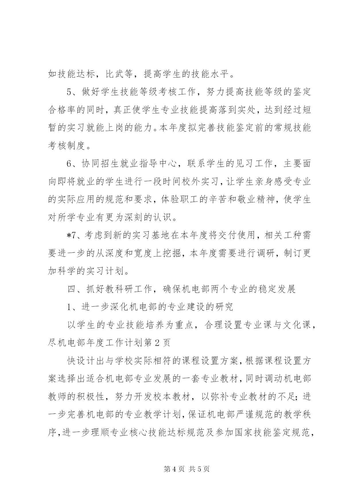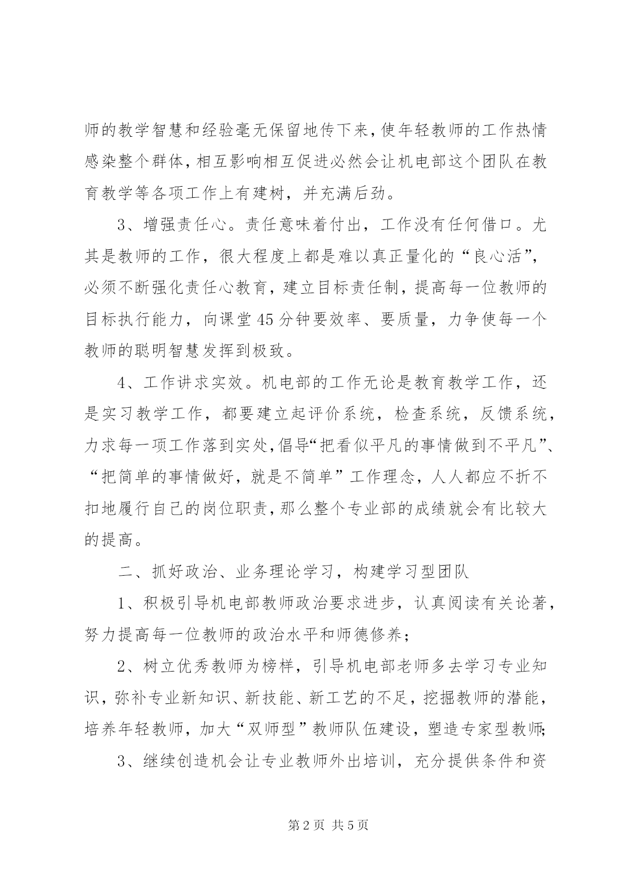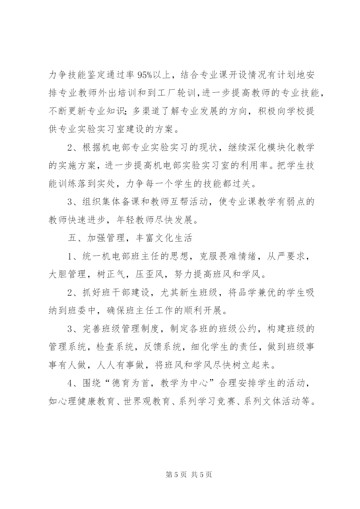 第PAGE\*Arabic\*MERGEFORMAT5页共NUMPAGES\*MERGEFORMAT5页机电部年度工作计划机电部20xx-20xx年度工作计划为了进一步将机电部的学生管理和教学管理工作推向深入,以学校的总体办学理念为指导,倡导尊重的教育,培养学生的实践操作能力和自我管理能力,为社会培养合格的技术人才,现制订20xx-20xx年度工作计划如下。一、更新观念,构建和谐团队,增强凝聚力1、提高服务意识。服务有两种,一种是为赢利而服务,另一种是公益的服务。教师的服务不全为着自利,重在服务于社会公益,作为服务就要服从于服务的规范,因此作为教师,必须抛弃传统的思想的禁锢,放下架子,平等地处理教师、家长、学生的关系。只要人人都建立起了服务意识,才能心甘情愿地为他人服务,而不会去斤斤计较个人得失;才能真诚地去帮助别人,而不会彼此相轻;才能充满阳光,而不会去报怨社会的不公;才能全身心地投入工作,而不会当一天和尚撞一天钟。2、倡导合作精神:团结就是力量,随着专业部管理机制运行逐步成熟,人员几经调整后,机电部的老师达到63名。其中:文化基础教师31名,专业课教师18名,实习指导教师14名。机电部教师数量多、教师之间工作性质存在较大差别。但是分析机电部教师结构特点,老教师工作能力较强,经验丰富,年轻教师活力充沛干劲十足,且谦虚好学,只要加强交流合作,使老教师的教学智慧和经验毫无保留地传下来,使年轻教师的工作热情感染整个群体,相互影响相互促进必然会让机电部这个团队在教育教学等各项工作上有建树,并充满后劲。3、增强责任心。责任意味着付出,工作没有任何借口。尤其是教师的工作,很大程度上都是难以真正量化的“良心活”,必须不断强化责任心教育,建立目标责任制,提高每一位教师的目标执行能力,向课堂45分钟要效率、要质量,力争使每一个教师的聪明智慧发挥到极致。4、工作讲求实效。机电部的工作无论是教育教学工作,还是实习教学工作,都要建立起评价系统,检查系统,反馈系统,力求每一项工作落到实处,倡导“把看似平凡的事情做到不平凡”、“把简单的事情做好,就是不简单”工作理念,人人都应不折不扣地履行自己的岗位职责,那么整个专业部的成绩就会有比较大的提高。二、抓好政治、业务理论学习,构建学习型团队1、积极引导机电部教师政治要求进步,认真阅读有关论著,努力提高每一位教师的政治水平和师德修养;2、树立优秀教师为榜样,引导机电部老师多去学习专业知识,弥补专业新知识、新技能、新工艺的不足,挖掘教师的潜能,培养年轻教师,加大“双师型”教师队伍建设,塑造专家型教师;3、继续创造机会让专业教师外出培训,充分提供条件和资金,解决机电部教师知识老化的问题,跟上机电专业以及数控专业迅猛发展的势头,让学生学到更贴近于社会实际直接应用的知识。三、加强学生实习的力度,切实提高学生的专业技能目前机电部机电和数控两个专业在校学生达到了19个班1000人左右,这给我们专业课的教学和实习带来了较大的压力,为此:1、加大实习教学精细化管理力度,进一步落实实习管理人员的岗位职责,实行岗位目标责任制,每周对实习指导教师的工作进行全面检查一次,如实核算月工作量;搭建平台,使实习教师与任课教师交流,开足开全学生的实验实习,尽最大能力维修维护好设备,努力提高设备的利用率,为学生技能的提高创造物质条件。2、调整专业课的课时比例,确保实习课时,使学生的技能训练到位并落至实处。3、专业教师的技能的提高在于对先进的实验实习设备的操作技能。当前因部分专业教师和实习指导教师也是现学现教,新型的“双师”型教师有待进一步培养深造,一方面通过“以老带新”帮助改行教师迅速适应工作岗位,另一方面也需要创造条件让改行专业教师参与培训。4、继续开展技能活动展示月,安排一系列学生技能的活动,如技能达标,比武等,提高学生的技能水平。5、做好学生技能等级考核工作,努力提高技能等级的鉴定合格率的同时,真正使学生专业技能提高落到实处,达到经过短暂的实习就能上岗的能力。本年度拟完善技能鉴定前的常规技能考核制度。6、协同招生就业指导中心,联系学生的见习工作,主要面向即将就业的学生进行一段时间校外实习,让学生亲身感受专业的实际应用的规范和要求,体验职工的辛苦和敬业精神,使学生对所学专业有更为深刻的认识。*7、考虑到新的实习基地在本年度将交付使用,相关工种需要进一步的从深度和宽度上挖掘,本年度需要进行调研,制订更加科学的实习计划。四、抓好教科研工作,确保机电部两个专业的稳定发展1、进一步深化机电部的专业建设的研究以学生的专业技能培养为重点,合理设置专业课与文化课,尽机电部年度工作计划快设计出与学校实际相符的课程设置方案,根据课程设置方案选择出适合机电部专业发展的一套专业教材,同时调动机电部教师的积极性,努力开发校本教材,以弥补