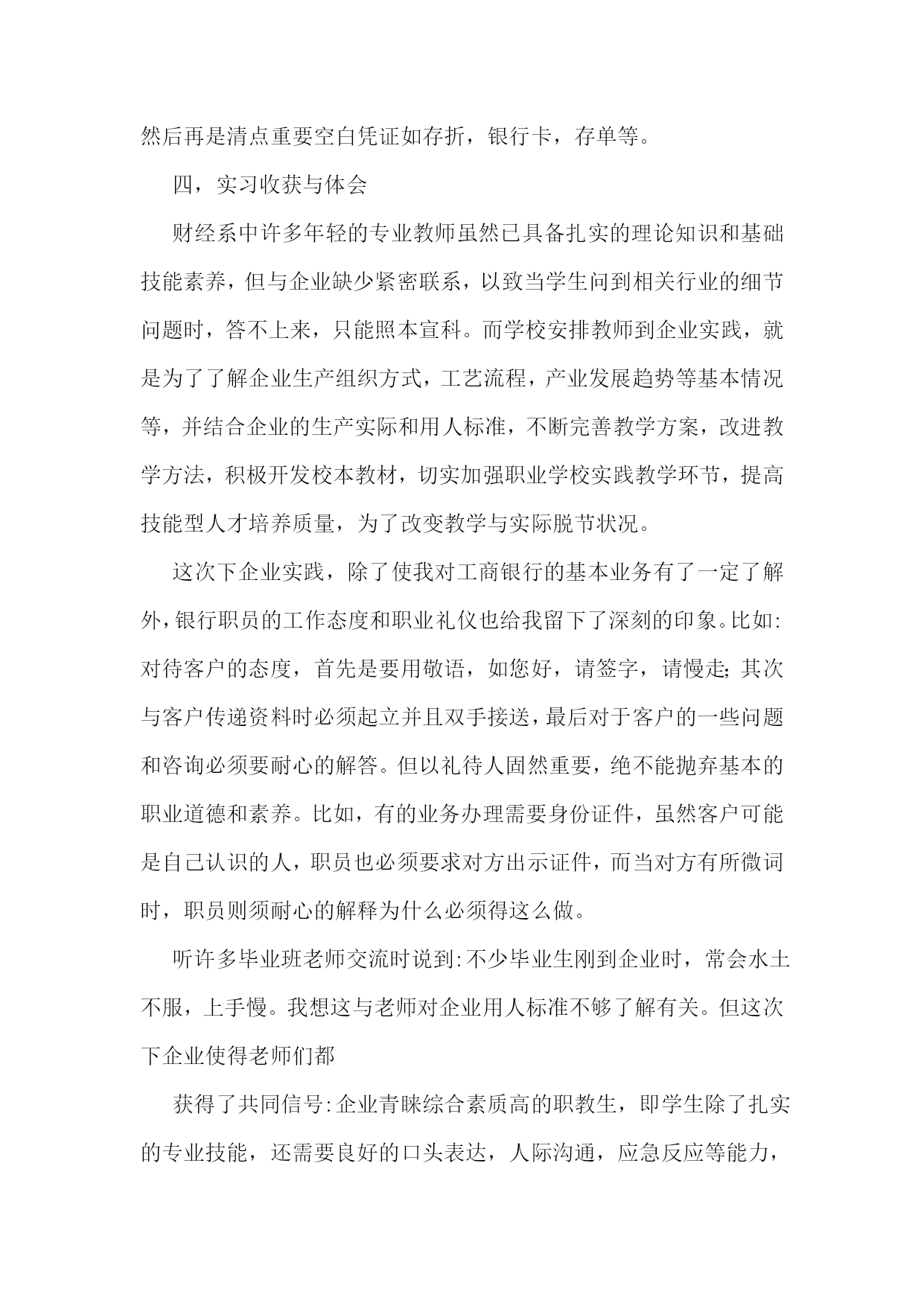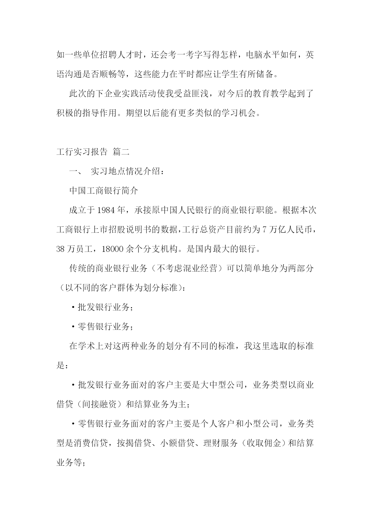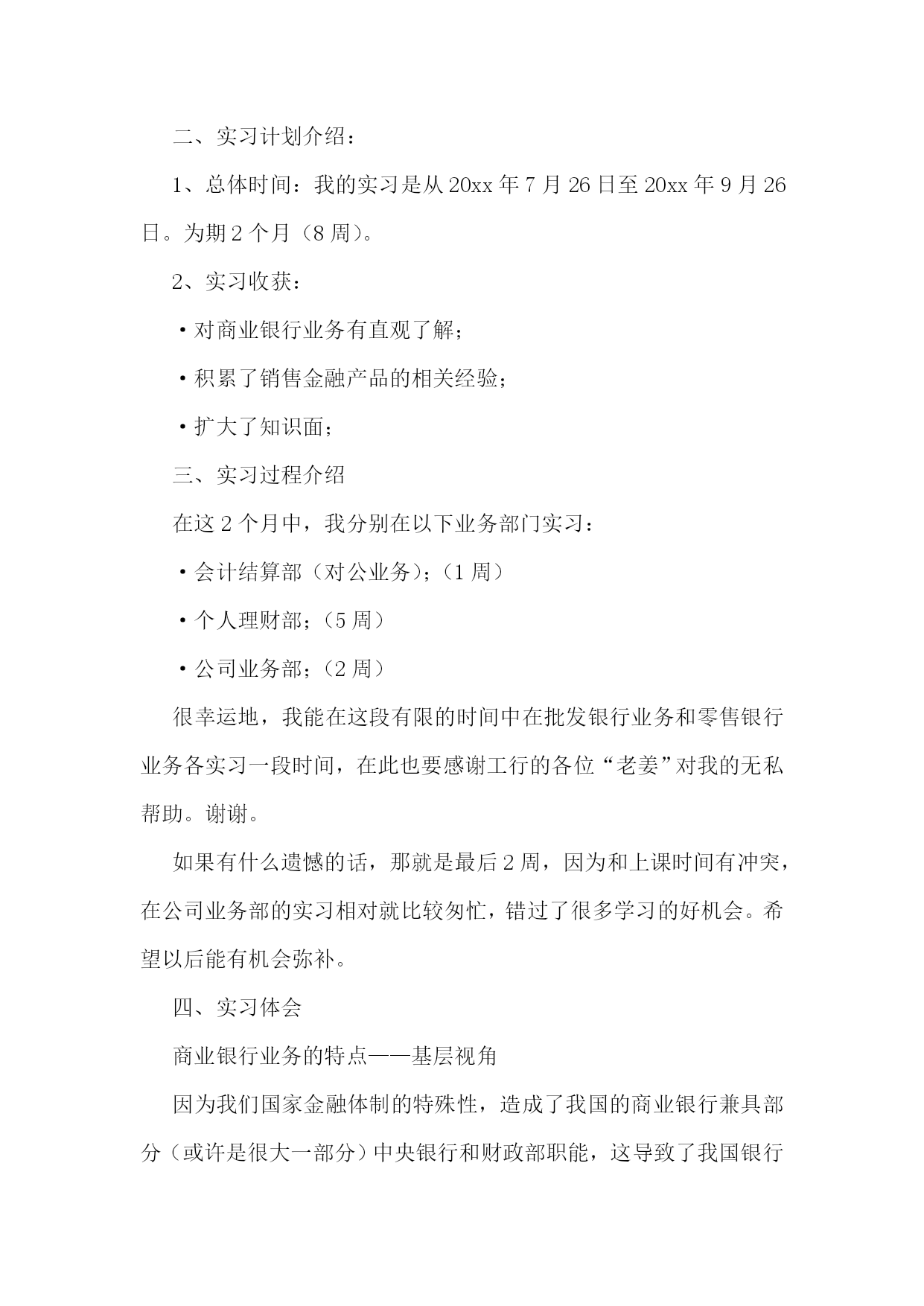 中国工商银行实习报告【精彩3篇】工商银行实习报告精选篇一一,实习单位简介中国工商银行成立于1984年。作为中国资产规模最大的商业银行,经过20几年的改革发展,中国工商银行已经步入质量效益和规模协调发展的轨道。XX年末资产总额近53000亿元人民币,占中国境内银行业金融机构资产总和的近五分之一。XX年英国《银行家》杂志按一级资本排序,中国工商银行名列全球1000家大银行的第十六位,连续五次入围美国《财富》全球500强,并被美国《远东经济评论》评为中国高质量产品(服务)十强。XX年由工商银行自主投产成功的全功能银行(nova)系统,为业务和管理的进步提供了强健的动力。二,实习过程此次实习的目的在于:掌握银行业务的基本技能,熟悉银行日常业务的操作流程以及工作制度等,使教学更有针对性,对学生就业岗位需求把握更灵敏。实习过程主要包括以下几个阶段:(一)了解实习单位基本情况和机构设置,人员配备等。(二)了解银行的基本业务流程,主要包括以下方面:银行业务基本技能训练,如点钞,珠算,五笔字型输入,捆扎等;银行的储蓄业务,如活期存款,整存整取,定活两便等;银行的对公业务,如受理现金支票,签发银行汇票等;银行的信用卡业务,如贷记卡的开户,销户,现金存取等。(三)了解银行会计核算方法,科目设置与账户设置,记账方法的确定等,区别与比较银行会计科目账户与企业的异同。(四)总结实习经过。三,实习内容在分行领导的指导,帮助下,我们首先就银行工作中所必需的基本技能,包括点钞,捆钞,珠算,五笔字型输入法,数字小键盘使用等进行了详细了解和现场观摩。特别要说的是珠算,很多学生包括我自己都无法理解在这个信息技术高速发展的时代,为什么还要苦练珠算,为什么不用计算器原来银行柜员经常需要查点现金,看是否能账实相符,而人民币有多种卷别,在点钞时需要累加,这时使用算盘就要比计算器方便,因为计算器显示的结果超过一定时间便会消失。接下来,我们又在个人理财中心观摩了银行柜面业务的全过程。工行柜面业务实行的是柜员负责制,就是每个柜员都可以办理所有的储蓄业务,即开户,存取现金,挂失,解挂,大小钞兑换,受理中间业务等。对于每一笔业务,都必须进入nova系统办理。此外营业终了时需要进行的nova轧账和中间业务轧账,柜员必须学习如何打印流水,平账报告表,重要空白凭证销号表,重要空白凭证明细核对表,审查传票号是否连续,金额是否准确,凭证要素是否齐全等。在银行,柜员间每天交接工作时的对账是必不可少的,对账时除了要核对现金账实是否相符外,还要查看重要空白凭证是否缺失,传票是否连续等等。而柜员间对账也是很有程序的,一般先清点现金,然后再是清点重要空白凭证如存折,银行卡,存单等。四,实习收获与体会财经系中许多年轻的专业教师虽然已具备扎实的理论知识和基础技能素养,但与企业缺少紧密联系,以致当学生问到相关行业的细节问题时,答不上来,只能照本宣科。而学校安排教师到企业实践,就是为了了解企业生产组织方式,工艺流程,产业发展趋势等基本情况等,并结合企业的生产实际和用人标准,不断完善教学方案,改进教学方法,积极开发校本教材,切实加强职业学校实践教学环节,提高技能型人才培养质量,为了改变教学与实际脱节状况。这次下企业实践,除了使我对工商银行的基本业务有了一定了解外,银行职员的工作态度和职业礼仪也给我留下了深刻的印象。比如:对待客户的态度,首先是要用敬语,如您好,请签字,请慢走;其次与客户传递资料时必须起立并且双手接送,最后对于客户的一些问题和咨询必须要耐心的解答。但以礼待人固然重要,绝不能抛弃基本的职业道德和素养。比如,有的业务办理需要身份证件,虽然客户可能是自己认识的人,职员也必须要求对方出示证件,而当对方有所微词时,职员则须耐心的解释为什么必须得这么做。听许多毕业班老师交流时说到:不少毕业生刚到企业时,常会水土不服,上手慢。我想这与老师对企业用人标准不够了解有关。但这次下企业使得老师们都获得了共同信号:企业青睐综合素质高的职教生,即学生除了扎实的专业技能,还需要良好的口头表达,人际沟通,应急反应等能力,如一些单位招聘人才时,还会考一考字写得怎样,电脑水平如何,英语沟通是否顺畅等,这些能力在平时都应让学生有所储备。此次的下企业实践活动使我受益匪浅,对今后的教育教学起到了积极的指导作用。期望以后能有更多类似的学习机会。工行实习报告篇二一、实习地点情况介绍:中国工商银行简介成立于1984年,承接原中国人民银行的商业银行职能。根据本次工商银行上市招股说明书的数据,工行总资产目前约为7万亿人民币,38万员工,18000余个分支机构。是国内最大的银行。传统的商业银行业务(不考虑混业经营)可以简单地分为两部分(以不同的客户群体为划分标准):·批发银行业务;·零售银行业