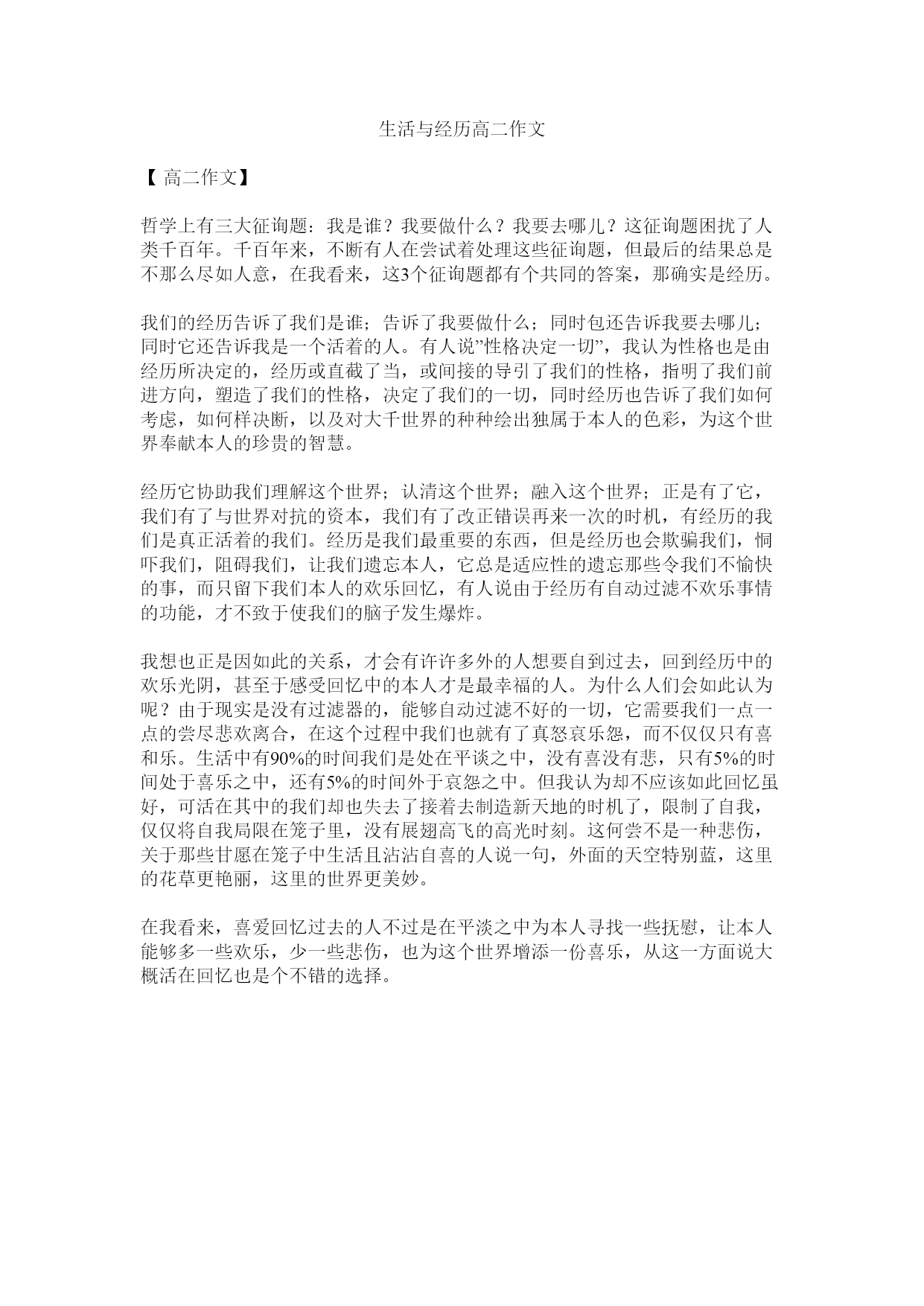 生活与经历高二作文【高二作文】哲学上有三大征询题:我是谁?我要做什么?我要去哪儿?这征询题困扰了人类千百年。千百年来,不断有人在尝试着处理这些征询题,但最后的结果总是不那么尽如人意,在我看来,这3个征询题都有个共同的答案,那确实是经历。我们的经历告诉了我们是谁;告诉了我要做什么;同时包还告诉我要去哪儿;同时它还告诉我是一个活着的人。有人说”性格决定一切”,我认为性格也是由经历所决定的,经历或直截了当,或间接的导引了我们的性格,指明了我们前进方向,塑造了我们的性格,决定了我们的一切,同时经历也告诉了我们如何考虑,如何样决断,以及对大千世界的种种绘出独属于本人的色彩,为这个世界奉献本人的珍贵的智慧。经历它协助我们理解这个世界;认清这个世界;融入这个世界;正是有了它,我们有了与世界对抗的资本,我们有了改正错误再来一次的时机,有经历的我们是真正活着的我们。经历是我们最重要的东西,但是经历也会欺骗我们,恫吓我们,阻碍我们,让我们遗忘本人,它总是适应性的遗忘那些令我们不愉快的事,而只留下我们本人的欢乐回忆,有人说由于经历有自动过滤不欢乐事情的功能,才不致于使我们的脑子发生爆炸。我想也正是因如此的关系,才会有许许多外的人想要自到过去,回到经历中的欢乐光阴,甚至于感受回忆中的本人才是最幸福的人。为什么人们会如此认为呢?由于现实是没有过滤器的,能够自动过滤不好的一切,它需要我们一点一点的尝尽悲欢离合,在这个过程中我们也就有了真怒哀乐怨,而不仅仅只有喜和乐。生活中有90%的时间我们是处在平谈之中,没有喜没有悲,只有5%的时间处于喜乐之中,还有5%的时间外于哀怨之中。但我认为却不应该如此回忆虽好,可活在其中的我们却也失去了接着去制造新天地的时机了,限制了自我,仅仅将自我局限在笼子里,没有展翅高飞的高光时刻。这何尝不是一种悲伤,关于那些甘愿在笼子中生活且沾沾自喜的人说一句,外面的天空特别蓝,这里的花草更艳丽,这里的世界更美妙。在我看来,喜爱回忆过去的人不过是在平淡之中为本人寻找一些抚慰,让本人能够多一些欢乐,少一些悲伤,也为这个世界增添一份喜乐,从这一方面说大概活在回忆也是个不错的选择。