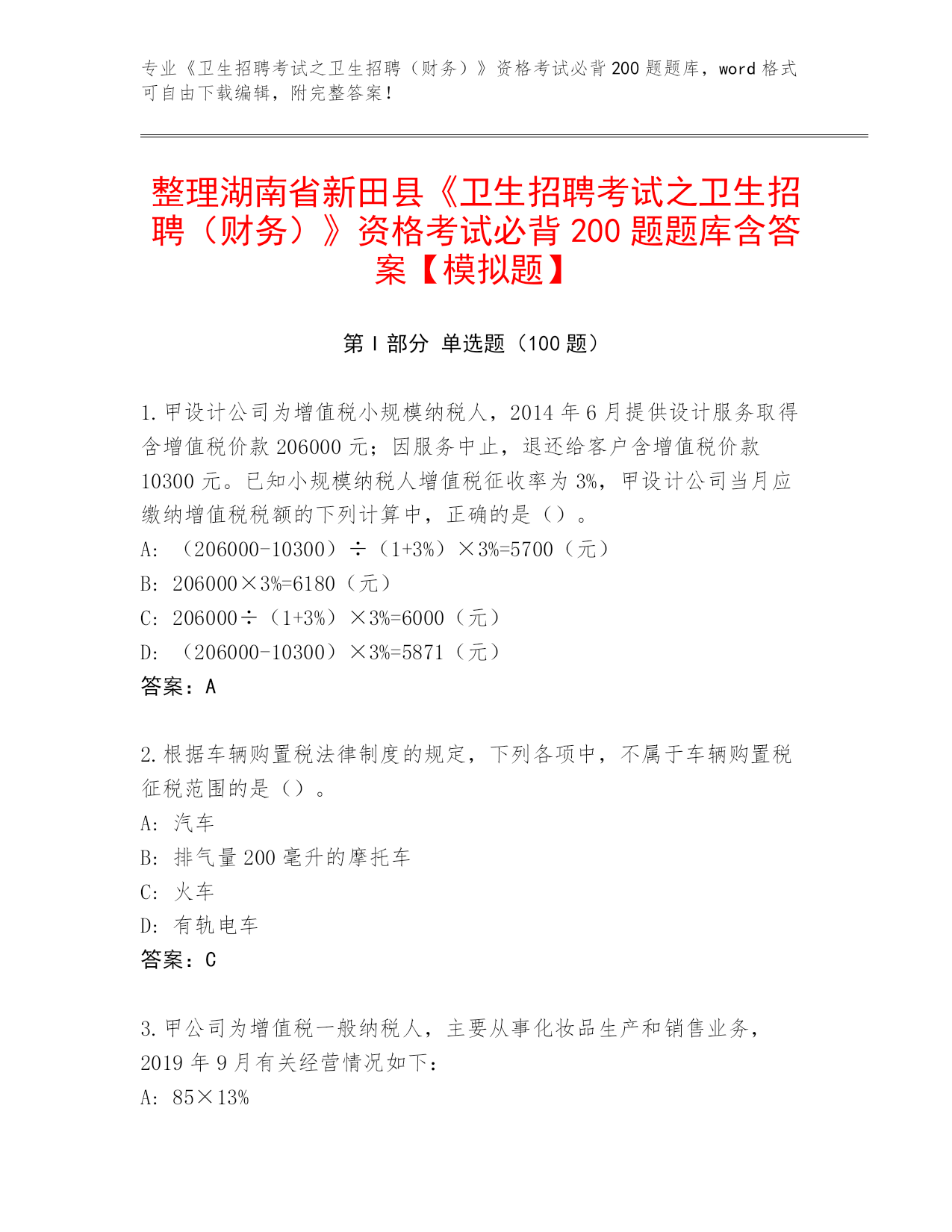 2024年湖南省新田县《卫生招聘考试之卫生招聘(财务)》资格考试必背200题含答案(考试直接用)