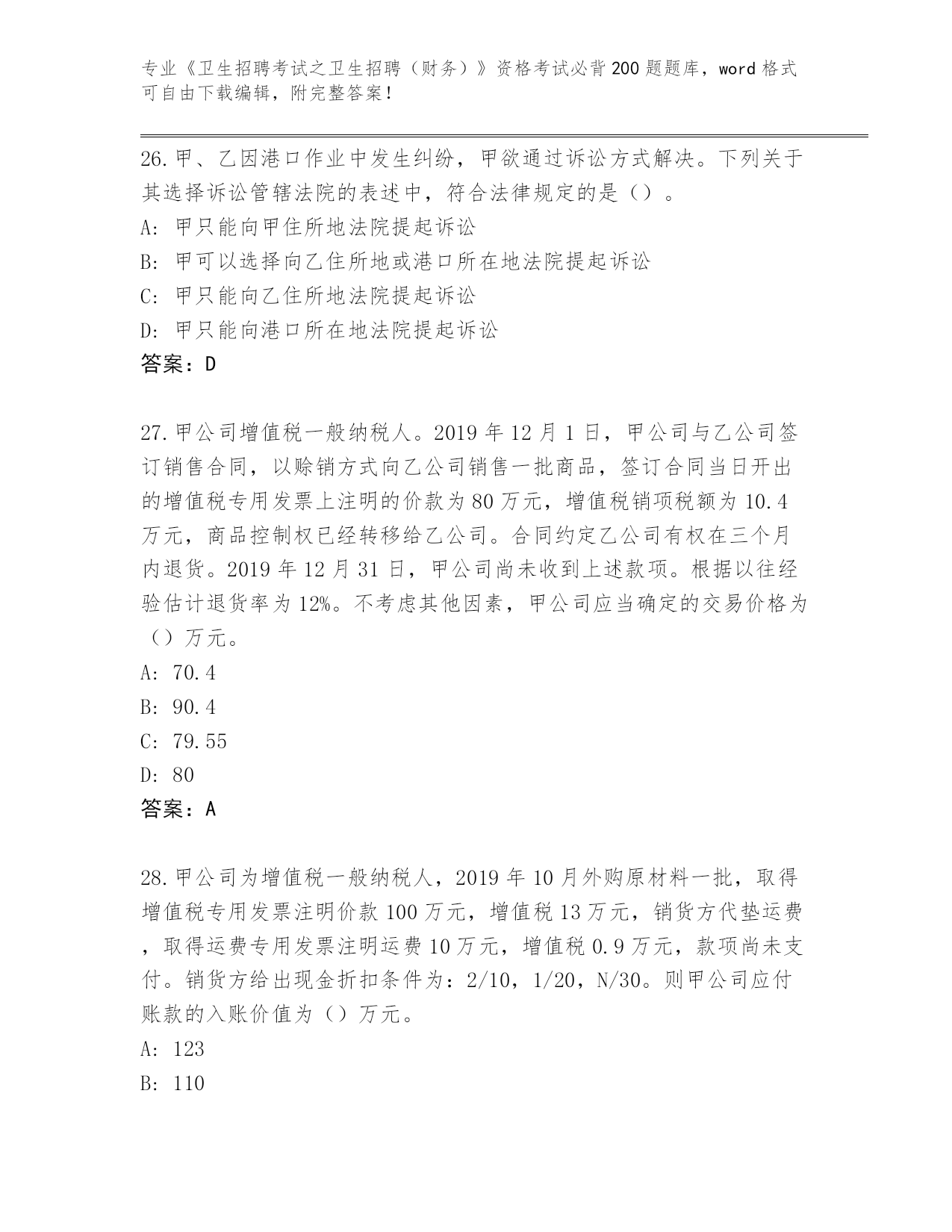 整理湖南省岳麓区《卫生招聘考试之卫生招聘(财务)》考试必背200题【模拟题】