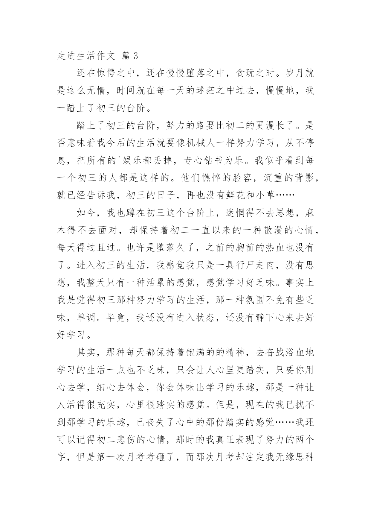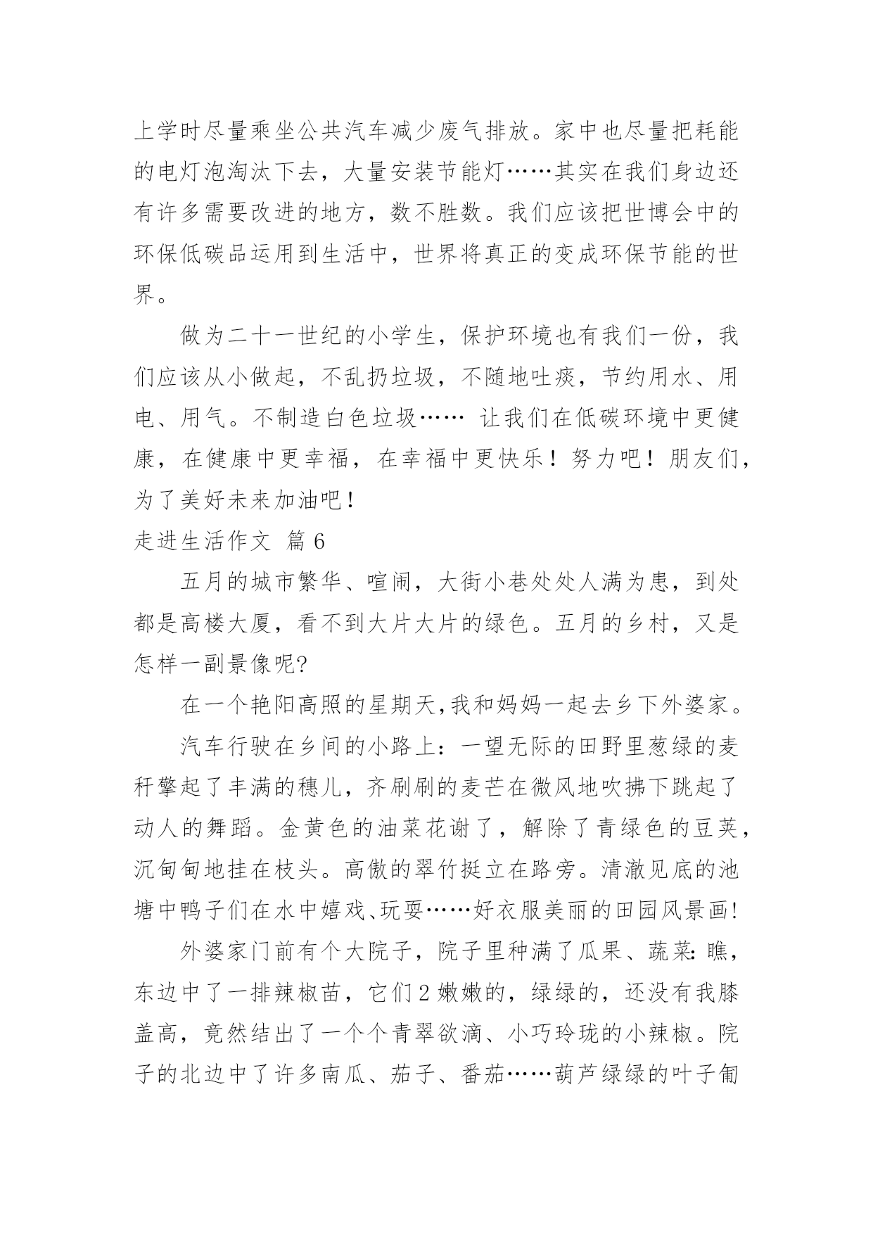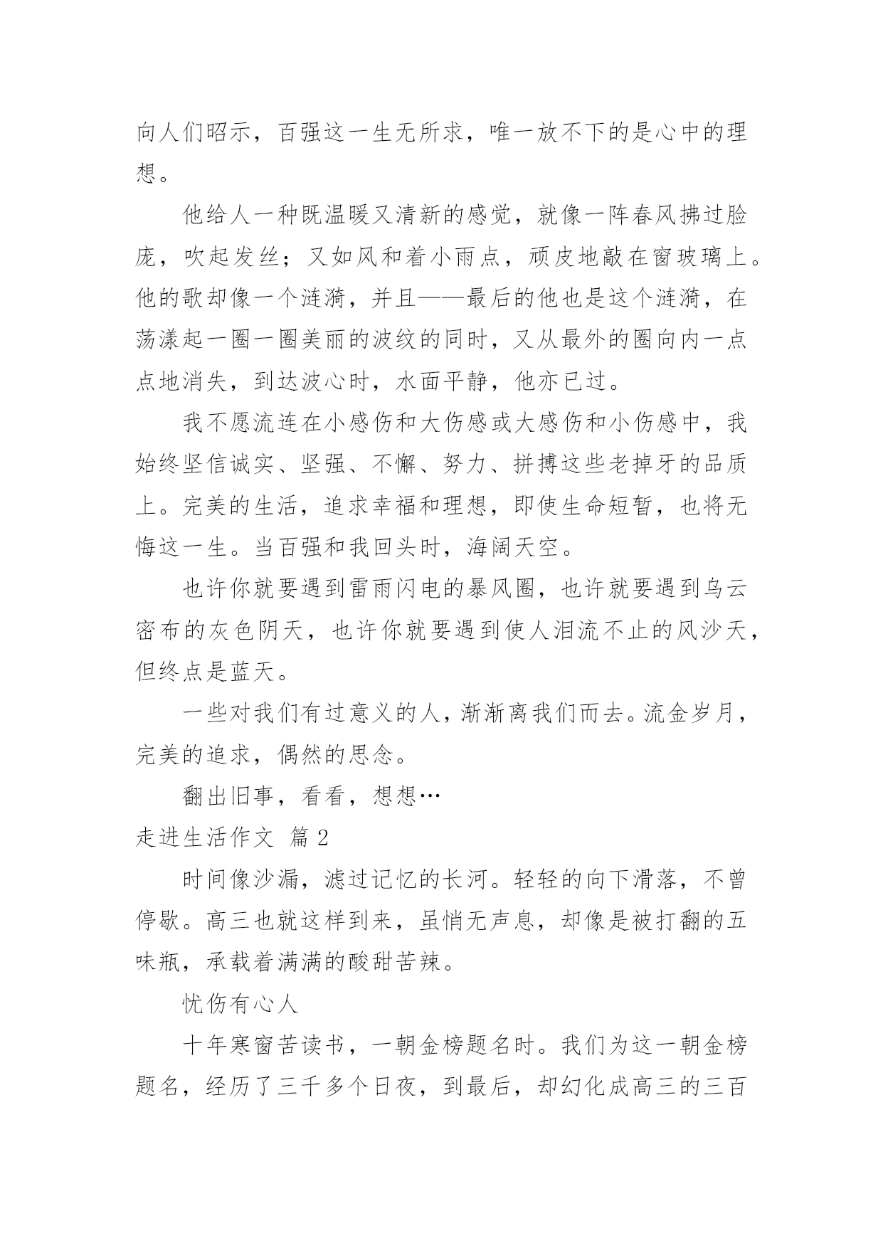 走进生活作文精选走进生活作文合集八篇在日常生活或是工作学习中,大家总免不了要接触或使用作文吧,作文可分为小学作文、中学作文、大学作文(论文)。相信许多人会觉得作文很难写吧,以下是小编帮大家整理的走进生活作文8篇,仅供参考,欢迎大家阅读。走进生活作文篇1一个初秋的早晨,我睁开眼醒来,望向窗外,天空微露淡蓝的晴。不知名的鸟儿在啁啾,圆润悦耳。风很清爽,吹送来秋天特有的那种气息。我突然想起了他,一个闪光的名字,一段一段逝去的故事,在旧时光里连成一片却依旧清晰如昨。陈百强,仿佛是一个忧郁的注解。文质彬彬,浅笑,追求完美。会因为一个钮扣的掉落而拒绝赴宴。完美本是人生奢求,没有人能够做到,于是他选择忧郁地离开,让他爱的人和爱他的人深深遗憾——他始终没有学会放下。但他追求梦想,牢牢抓住心中的梦想,一刻也不停地向前冲,他唱道:“没有泪光/风里劲闯/怀着心中梦想/能闯一次/就一次/不息自强。”“一生何求/迷惘里什么都看不透/没想到我失去的竟是我的所有/不愿我的梦想被划破”,这首百强临终前的一首歌,轻慢、舒缓,当中又有一丝“剪不断,理还乱”的愁绪。它向人们昭示,百强这一生无所求,唯一放不下的是心中的理想。他给人一种既温暖又清新的感觉,就像一阵春风拂过脸庞,吹起发丝;又如风和着小雨点,顽皮地敲在窗玻璃上。他的歌却像一个涟漪,并且——最后的他也是这个涟漪,在荡漾起一圈一圈美丽的波纹的同时,又从最外的圈向内一点点地消失,到达波心时,水面平静,他亦已过。我不愿流连在小感伤和大伤感或大感伤和小伤感中,我始终坚信诚实、坚强、不懈、努力、拼搏这些老掉牙的品质上。完美的生活,追求幸福和理想,即使生命短暂,也将无悔这一生。当百强和我回头时,海阔天空。也许你就要遇到雷雨闪电的暴风圈,也许就要遇到乌云密布的灰色阴天,也许你就要遇到使人泪流不止的风沙天,但终点是蓝天。一些对我们有过意义的人,渐渐离我们而去。流金岁月,完美的追求,偶然的思念。翻出旧事,看看,想想…走进生活作文篇2时间像沙漏,滤过记忆的长河。轻轻的向下滑落,不曾停歇。高三也就这样到来,虽悄无声息,却像是被打翻的五味瓶,承载着满满的酸甜苦辣。忧伤有心人十年寒窗苦读书,一朝金榜题名时。我们为这一朝金榜题名,经历了三千多个日夜,到最后,却幻化成高三的三百多个日夜,那其中,隐藏着太多不为人知的酸楚与离别,纠痛着我们的心。高三的生活,有着永远看不完的复习资料,做不完的高考题,考不完的月考、会考、模拟考。每个人都小心翼翼地捧着一个水晶球,争先恐后的向前跑,生怕落在后面。日子似乎也就这样永无止境的重复下去了,枯燥得让人不敢相信。而这所有的一切,就像是一次单程的旅行,只能向前走,不能后退,也没有选择。走进高三,是一种无奈。我总是在高三的生活中回想起小时侯在爷爷奶奶家长大的日子,心中忍不住牵挂起他们。我已经太久都没有回去过了,想念每次我回家吃饭时他们为我忙碌的样子,想念他们为我烧的菜,想念他们宠爱我的种种。可是高三的忙碌,已经没有了让我可以伤感的时间,于是更多的时候,我不敢去触碰这些心中最柔软的地方,因为我知道,所有的思念会在瞬间爆发,一下一下的啃噬着我的心脉,让我红了眼眶。走进高三,是一种疼痛。我依然眷恋从前看了一半的电影,听了一半的歌,走了一半的路。可是高三的生活紧紧束缚着我,剪不断,也挣扎不开。就连每天伴我回家的夜,也深得好似泼墨。月影横斜中,只有昏黄的路灯映着落寞的身影,就像是被羁绊的风筝,没有自由,并且完完全全的被控制着。走进高三,是一种苦涩。春花开了夏虫鸣,秋月清了冬阳落。时间似乎在高三这里凝固,像所有难舍的经历一样沉淀下来,在我们俯瞰的记忆里浸透了忧伤。勒着青藤的成长高三的生活,就如同一条条坚韧的青藤,而我们就是青藤上那些被勒出了道道伤痕的瓜果。我们只看见青藤是瓜果们成长的束缚,却不知道它才是瓜果生命的支柱。而我们也因为被高三的生活束缚着,所以这一刻的生命才能晶莹如玉,永不磨灭。蓝的天,白的云。高三生活中的一颦一笑,都令人记忆犹新。我总是喜欢用手框出一个四角的天空,然后看傍晚一抹艳色的暮日西沉和天边纠结涌动如流的云,一种无法言传的感动在周围扩散。偶尔走在回家的路上还思考着上课没有完成的题,一声呼唤,转过头去,是同伴那张如同冬日灿烂阳光般的笑脸,猛然间惊醒,才想起在这漫漫的一年生活中,她们的鼓励、快乐曾陪我一起走过。走进高三,是一种幸福。每当我深夜回到家时,永远不变的是放在桌子上已经削好的水果和一杯微波过的温热牛奶。还有,一盏点亮的灯,尽管许多时候他们已经睡着了,可正是这盏灯,为我在无数个漆黑的深夜中驱散不安与寒冷。我总是可以看到爸爸给我送饭时有些弯曲的背影,感觉到睡觉时妈妈在我额头上的轻轻一吻,想着上学前他们告别时温柔的语气的浅浅的一声叹息。这些所有的一切都将成为我心中最美的回忆。走进高三,是一种温暖。走进