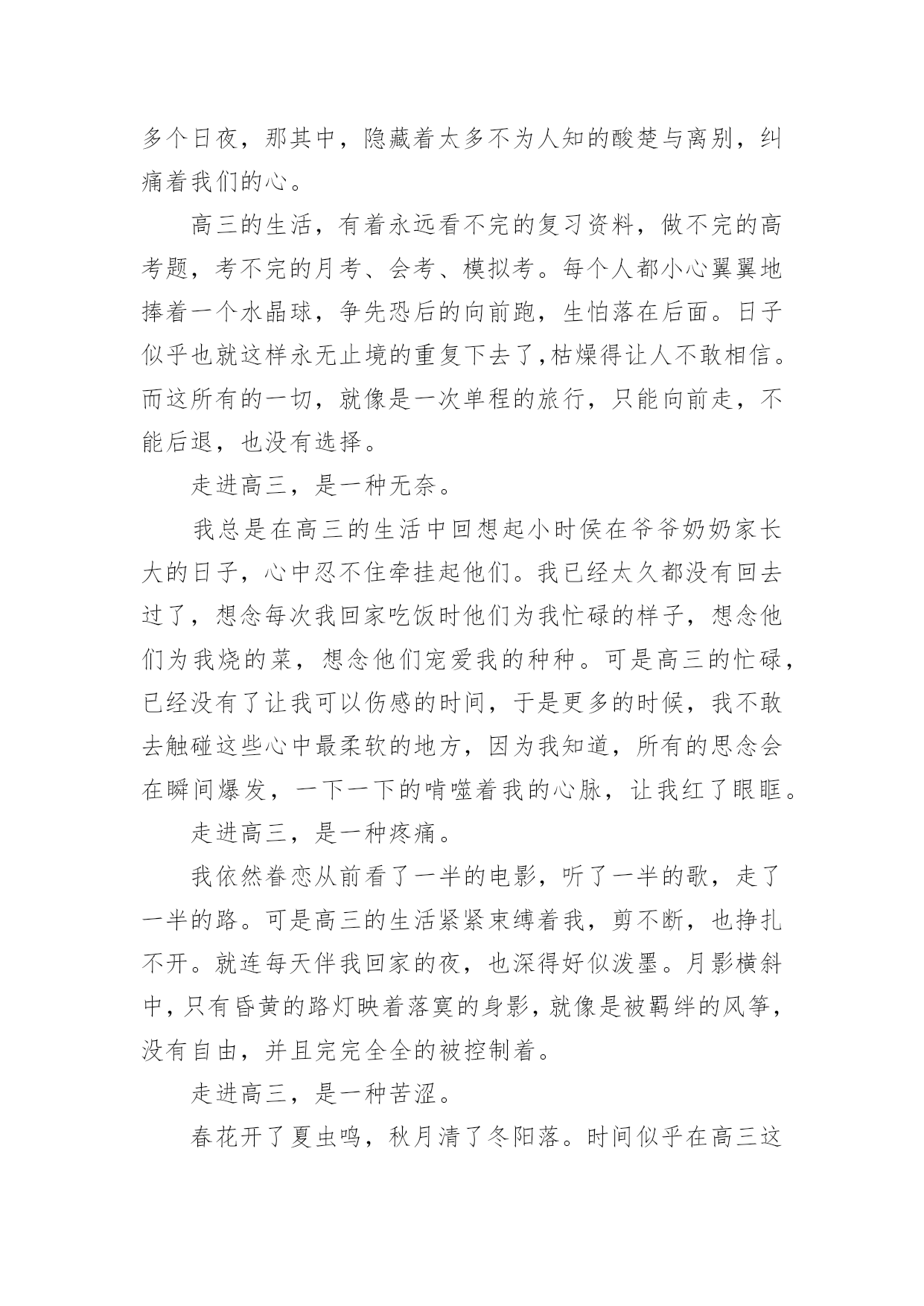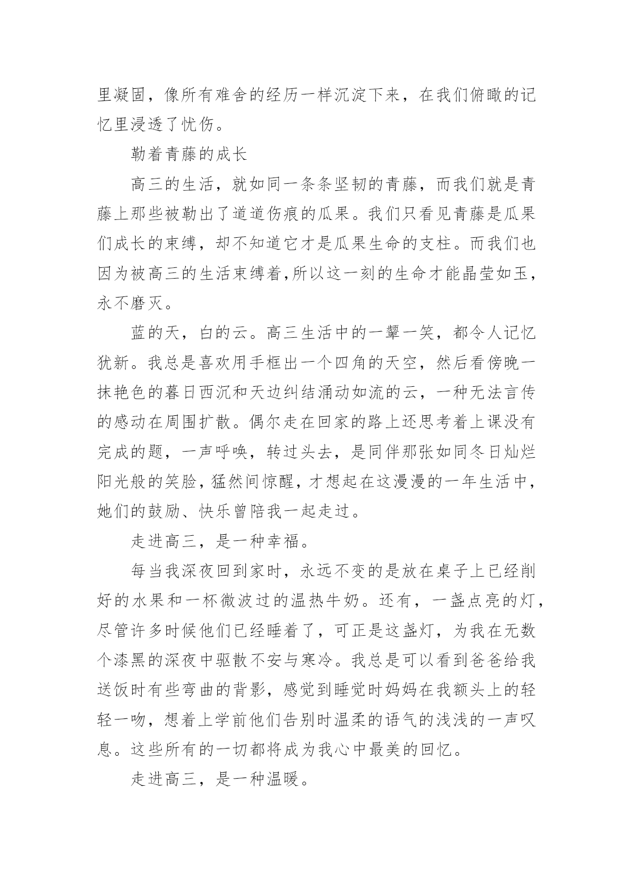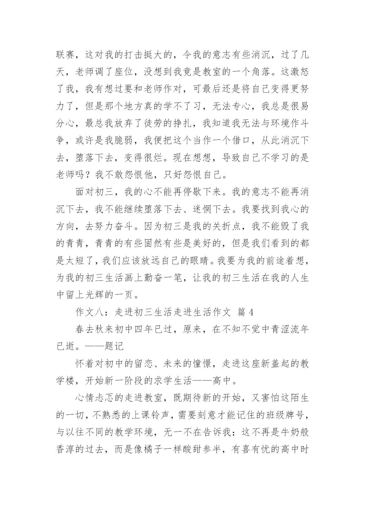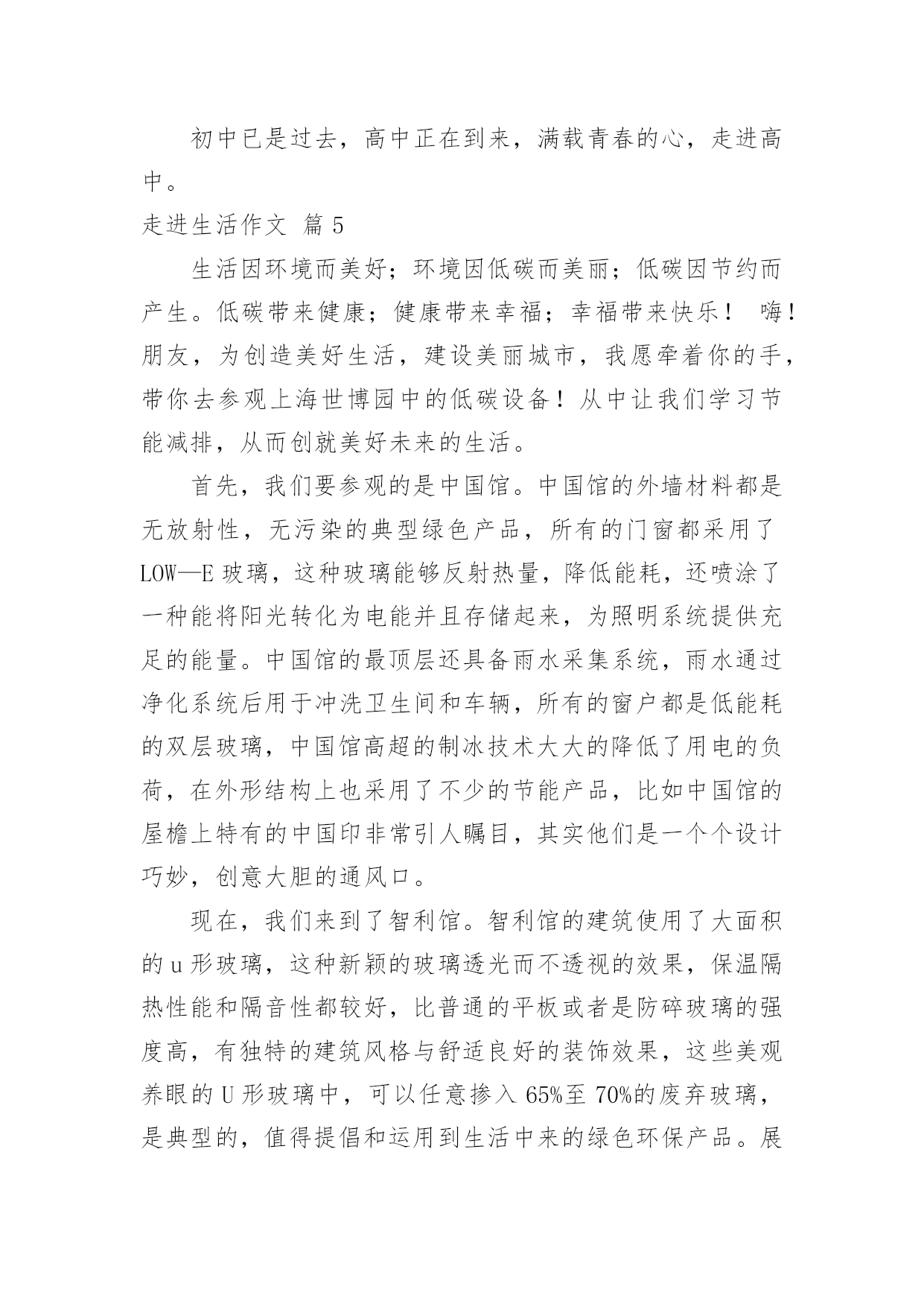 走进生活作文精选走进生活作文合集八篇在日常生活或是工作学习中,大家总免不了要接触或使用作文吧,作文可分为小学作文、中学作文、大学作文(论文)。相信许多人会觉得作文很难写吧,以下是小编帮大家整理的走进生活作文8篇,仅供参考,欢迎大家阅读。走进生活作文篇1一个初秋的早晨,我睁开眼醒来,望向窗外,天空微露淡蓝的晴。不知名的鸟儿在啁啾,圆润悦耳。风很清爽,吹送来秋天特有的那种气息。我突然想起了他,一个闪光的名字,一段一段逝去的故事,在旧时光里连成一片却依旧清晰如昨。陈百强,仿佛是一个忧郁的注解。文质彬彬,浅笑,追求完美。会因为一个钮扣的掉落而拒绝赴宴。完美本是人生奢求,没有人能够做到,于是他选择忧郁地离开,让他爱的人和爱他的人深深遗憾——他始终没有学会放下。但他追求梦想,牢牢抓住心中的梦想,一刻也不停地向前冲,他唱道:“没有泪光/风里劲闯/怀着心中梦想/能闯一次/就一次/不息自强。”“一生何求/迷惘里什么都看不透/没想到我失去的竟是我的所有/不愿我的梦想被划破”,这首百强临终前的一首歌,轻慢、舒缓,当中又有一丝“剪不断,理还乱”的愁绪。它向人们昭示,百强这一生无所求,唯一放不下的是心中的理想。他给人一种既温暖又清新的感觉,就像一阵春风拂过脸庞,吹起发丝;又如风和着小雨点,顽皮地敲在窗玻璃上。他的歌却像一个涟漪,并且——最后的他也是这个涟漪,在荡漾起一圈一圈美丽的波纹的同时,又从最外的圈向内一点点地消失,到达波心时,水面平静,他亦已过。我不愿流连在小感伤和大伤感或大感伤和小伤感中,我始终坚信诚实、坚强、不懈、努力、拼搏这些老掉牙的品质上。完美的生活,追求幸福和理想,即使生命短暂,也将无悔这一生。当百强和我回头时,海阔天空。也许你就要遇到雷雨闪电的暴风圈,也许就要遇到乌云密布的灰色阴天,也许你就要遇到使人泪流不止的风沙天,但终点是蓝天。一些对我们有过意义的人,渐渐离我们而去。流金岁月,完美的追求,偶然的思念。翻出旧事,看看,想想…走进生活作文篇2时间像沙漏,滤过记忆的长河。轻轻的向下滑落,不曾停歇。高三也就这样到来,虽悄无声息,却像是被打翻的五味瓶,承载着满满的酸甜苦辣。忧伤有心人十年寒窗苦读书,一朝金榜题名时。我们为这一朝金榜题名,经历了三千多个日夜,到最后,却幻化成高三的三百多个日夜,那其中,隐藏着太多不为人知的酸楚与离别,纠痛着我们的心。高三的生活,有着永远看不完的复习资料,做不完的高考题,考不完的月考、会考、模拟考。每个人都小心翼翼地捧着一个水晶球,争先恐后的向前跑,生怕落在后面。日子似乎也就这样永无止境的重复下去了,枯燥得让人不敢相信。而这所有的一切,就像是一次单程的旅行,只能向前走,不能后退,也没有选择。走进高三,是一种无奈。我总是在高三的生活中回想起小时侯在爷爷奶奶家长大的日子,心中忍不住牵挂起他们。我已经太久都没有回去过了,想念每次我回家吃饭时他们为我忙碌的样子,想念他们为我烧的菜,想念他们宠爱我的种种。可是高三的忙碌,已经没有了让我可以伤感的时间,于是更多的时候,我不敢去触碰这些心中最柔软的地方,因为我知道,所有的思念会在瞬间爆发,一下一下的啃噬着我的心脉,让我红了眼眶。走进高三,是一种疼痛。我依然眷恋从前看了一半的电影,听了一半的歌,走了一半的路。可是高三的生活紧紧束缚着我,剪不断,也挣扎不开。就连每天伴我回家的夜,也深得好似泼墨。月影横斜中,只有昏黄的路灯映着落寞的身影,就像是被羁绊的风筝,没有自由,并且完完全全的被控制着。走进高三,是一种苦涩。春花开了夏虫鸣,秋月清了冬阳落。时间似乎在高三这里凝固,像所有难舍的经历一样沉淀下来,在我们俯瞰的记忆里浸透了忧伤。勒着青藤的成长高三的生活,就如同一条条坚韧的青藤,而我们就是青藤上那些被勒出了道道伤痕的瓜果。我们只看见青藤是瓜果们成长的束缚,却不知道它才是瓜果生命的支柱。而我们也因为被高三的生活束缚着,所以这一刻的生命才能晶莹如玉,永不磨灭。蓝的天,白的云。高三生活中的一颦一笑,都令人记忆犹新。我总是喜欢用手框出一个四角的天空,然后看傍晚一抹艳色的暮日西沉和天边纠结涌动如流的云,一种无法言传的感动在周围扩散。偶尔走在回家的路上还思考着上课没有完成的题,一声呼唤,转过头去,是同伴那张如同冬日灿烂阳光般的笑脸,猛然间惊醒,才想起在这漫漫的一年生活中,她们的鼓励、快乐曾陪我一起走过。走进高三,是一种幸福。每当我深夜回到家时,永远不变的是放在桌子上已经削好的水果和一杯微波过的温热牛奶。还有,一盏点亮的灯,尽管许多时候他们已经睡着了,可正是这盏灯,为我在无数个漆黑的深夜中驱散不安与寒冷。我总是可以看到爸爸给我送饭时有些弯曲的背影,感觉到睡觉时妈妈在我额头上的轻轻一吻,想着上学前他们告别时温柔的语气的浅浅的一声叹息。这些所有的一切都将成为我心中最美的回忆。走进高三,是一种温暖。走进