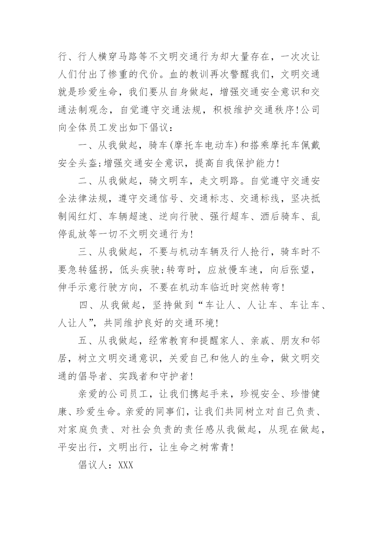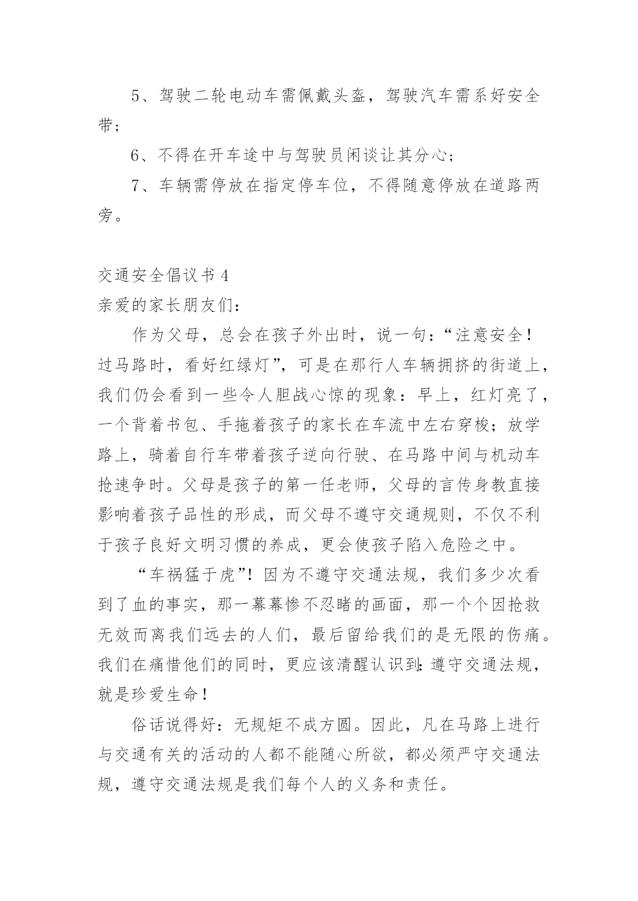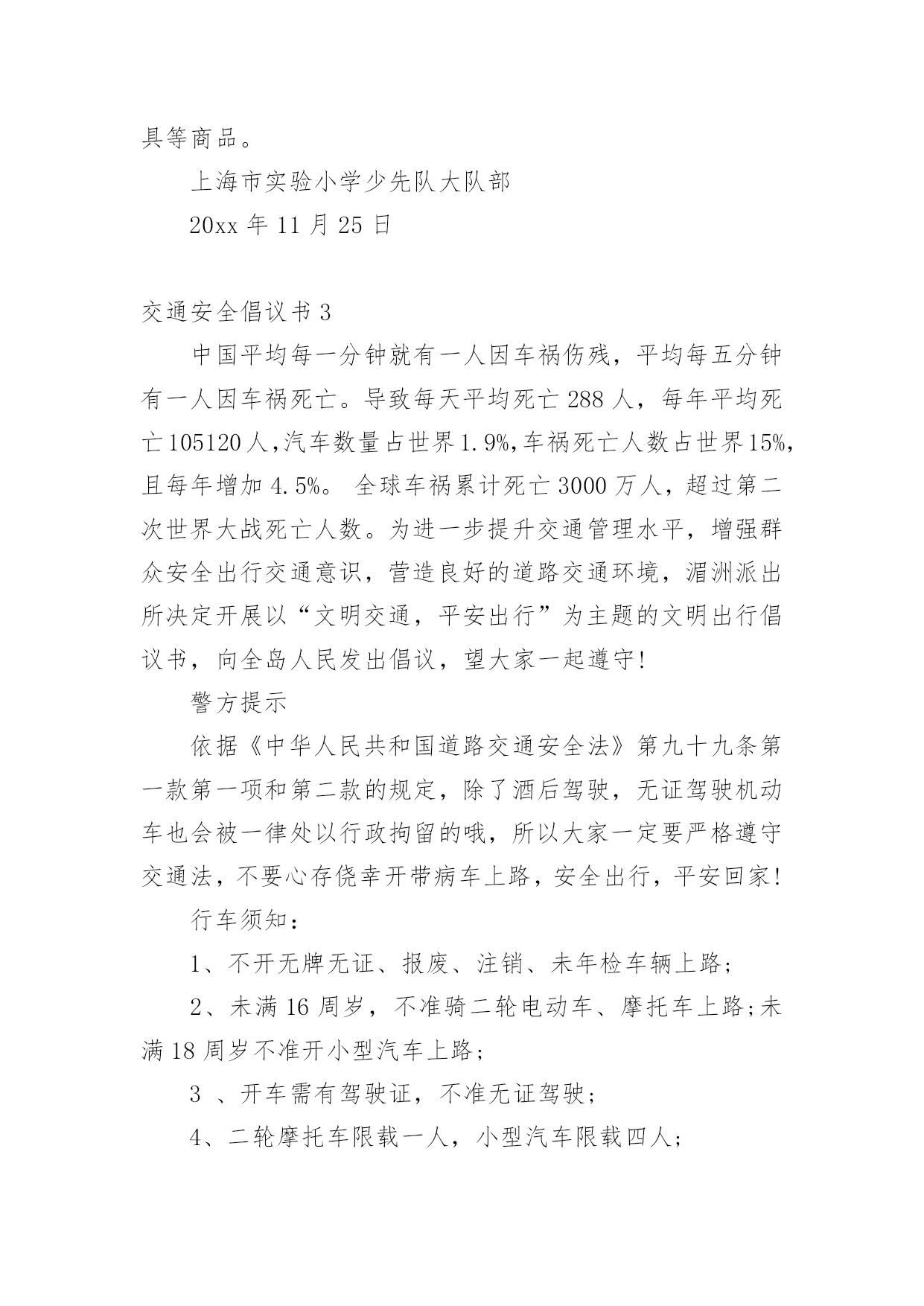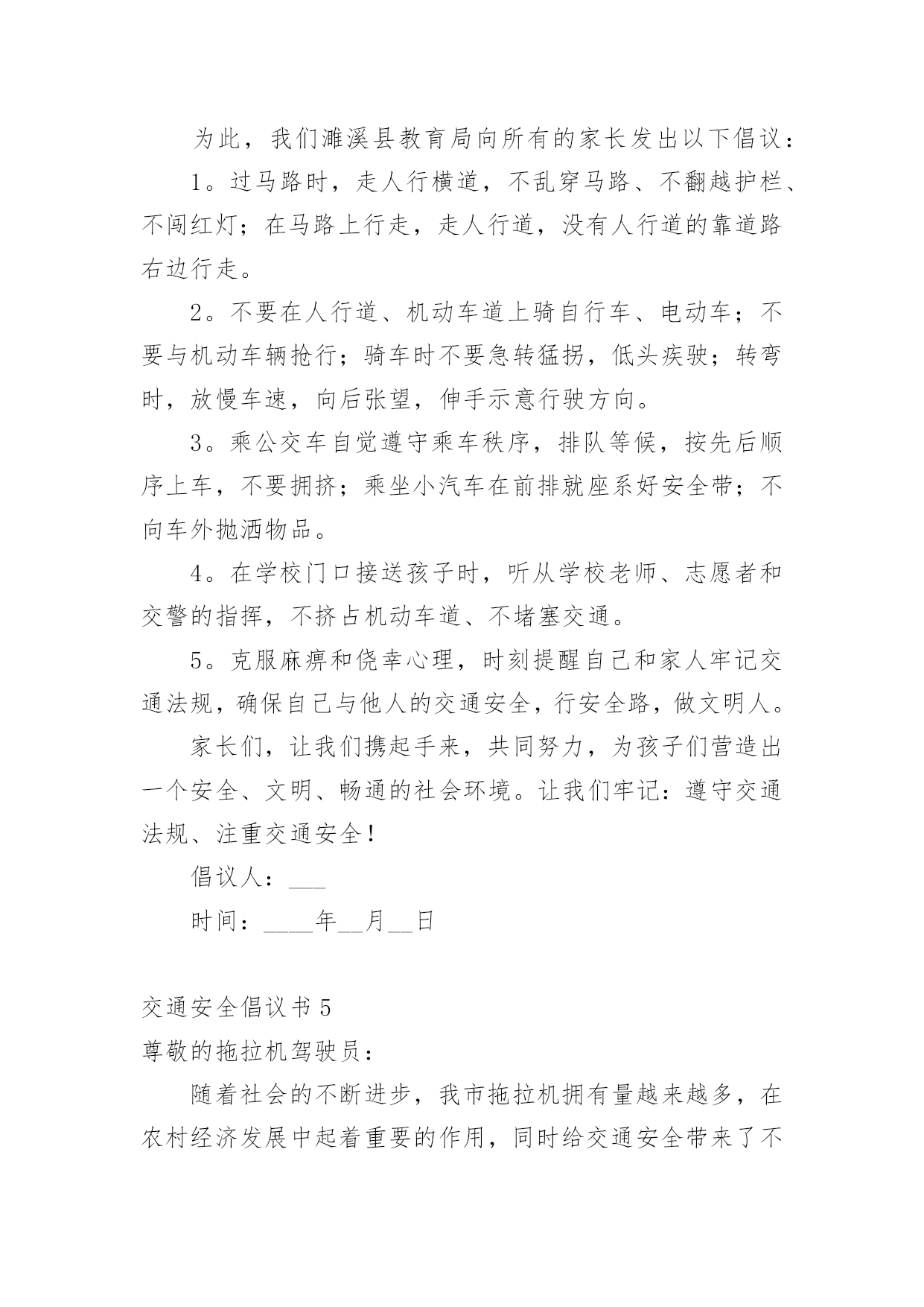 交通安全倡议书交通安全倡议书汇编15篇在我们平凡的日常里,用到倡议书的地方越来越多,倡议书具有响应者不确定性的特征。相信很多朋友都对写倡议书感到非常苦恼吧,下面是小编精心整理的交通安全倡议书,希望对大家有所帮助。交通安全倡议书1亲爱的全体员工:你们好!生活在这个喧嚣繁华的城镇让我们的生活变得精彩而便利,然而随着大家生活水平的不断提升只要我们走上马路,拥挤的车辆便在我们眼前来来往往。你是否感受到潜伏在我们周围的危险呢?因为上下班赶时间不遵守交通法规或存有麻痹和侥幸心理,我们看到了血的事实,经受了血的教训,那一幕幕令人心痛、惨不忍睹的场景,那一个个因抢救无效而离去的人们,最后留下的都是心灵上的创伤和对离去者无尽的痛惜。在痛惜他们的同时,更应该清醒地认识到:遵守交通法规,就是珍爱生命!营造安全、文明、畅通的交通环境,是我们生命安全的重要保障。但在我们身边,车辆乱停乱放、占道、抢道、逆行、行人横穿马路等不文明交通行为却大量存在,一次次让人们付出了惨重的代价。血的教训再次警醒我们,文明交通就是珍爱生命,我们要从自身做起,增强交通安全意识和交通法制观念,自觉遵守交通法规,积极维护交通秩序!公司向全体员工发出如下倡议:一、从我做起,骑车(摩托车电动车)和搭乘摩托车佩戴安全头盔;增强交通安全意识,提高自我保护能力!二、从我做起,骑文明车,走文明路。自觉遵守交通安全法律法规,遵守交通信号、交通标志、交通标线,坚决抵制闯红灯、车辆超速、逆向行驶、强行超车、酒后骑车、乱停乱放等一切不文明交通行为!三、从我做起,不要与机动车辆及行人抢行,骑车时不要急转猛拐,低头疾驶;转弯时,应放慢车速,向后张望,伸手示意行驶方向,不要在机动车临近时突然转弯!四、从我做起,坚持做到“车让人、人让车、车让车、人让人”,共同维护良好的交通环境!五、从我做起,经常教育和提醒家人、亲戚、朋友和邻居,树立文明交通意识,关爱自己和他人的生命,做文明交通的倡导者、实践者和守护者!亲爱的公司员工,让我们携起手来,珍视安全、珍惜健康、珍爱生命。亲爱的同事们,让我们共同树立对自己负责、对家庭负责、对社会负责的责任感从我做起,从现在做起,平安出行,文明出行,让生命之树常青!倡议人:XXX时间:XXXX年XX月XX日交通安全倡议书2亲爱的同学们:随着社会的进步,人们的交通条件也日趋完善。可我们在享受这种便利的同时,也看到一些破坏交通秩序的行为:擅自闯红灯、乱穿马路、逆向行驶、双手脱把、互相飙车。由此,我们联想到每天上、下学时看到的危险状况:一些学校附近人行道被占用,一些车辆驾驶员和骑车人不让行人,一些骑自行车和助动车穿越红灯甚至逆向行驶,一些家长不顾川流的车辆带孩子闯红灯,不少学校每天上下学时,无证摊贩、接送孩子的车辆拥堵在校门口,使广大同学难以安全行走。为了你我的生命安全,上海市实验小学全体同学向上海的中小学生倡议:■认真学习交通安全课程,牢牢树立安全行路的意识。■严格遵守交通规则,做到文明行路:必须在人行道上行走,没有人行道的靠路边行走;不在马路上追逐打闹,急拐猛跑或游戏。■在自己严格遵守交通规则的同时,要学会分辨危险,并且学会避免危险。■从影响自己的家人开始,劝告自己的家人、亲戚要珍爱生命,严格遵守交通规则,文明行路。■不食用、不购买校门口无证设摊上出售的食品和小玩具等商品。上海市实验小学少先队大队部20xx年11月25日交通安全倡议书3中国平均每一分钟就有一人因车祸伤残,平均每五分钟有一人因车祸死亡。导致每天平均死亡288人,每年平均死亡105120人,汽车数量占世界1.9%,车祸死亡人数占世界15%,且每年增加4.5%。全球车祸累计死亡3000万人,超过第二次世界大战死亡人数。为进一步提升交通管理水平,增强群众安全出行交通意识,营造良好的道路交通环境,湄洲派出所决定开展以“文明交通,平安出行”为主题的文明出行倡议书,向全岛人民发出倡议,望大家一起遵守!警方提示依据《中华人民共和国道路交通安全法》第九十九条第一款第一项和第二款的规定,除了酒后驾驶,无证驾驶机动车也会被一律处以行政拘留的哦,所以大家一定要严格遵守交通法,不要心存侥幸开带病车上路,安全出行,平安回家!行车须知:1、不开无牌无证、报废、注销、未年检车辆上路;2、未满16周岁,不准骑二轮电动车、摩托车上路;未满18周岁不准开小型汽车上路;3、开车需有驾驶证,不准无证驾驶;4、二轮摩托车限载一人,小型汽车限载四人;5、驾驶二轮电动车需佩戴头盔,驾驶汽车需系好安全带;6、不得在开车途中与驾驶员闲谈让其分心;7、车辆需停放在指定停车位,不得随意停放在道路两旁。交通安全倡议书4亲爱的家长朋友们:作为父母,总会在孩子外出时,说一句:“注意安全!过马路时,看好红绿灯”,可是在那行人车辆拥挤的街道上,我们仍会看到一些令人胆战心惊的现象