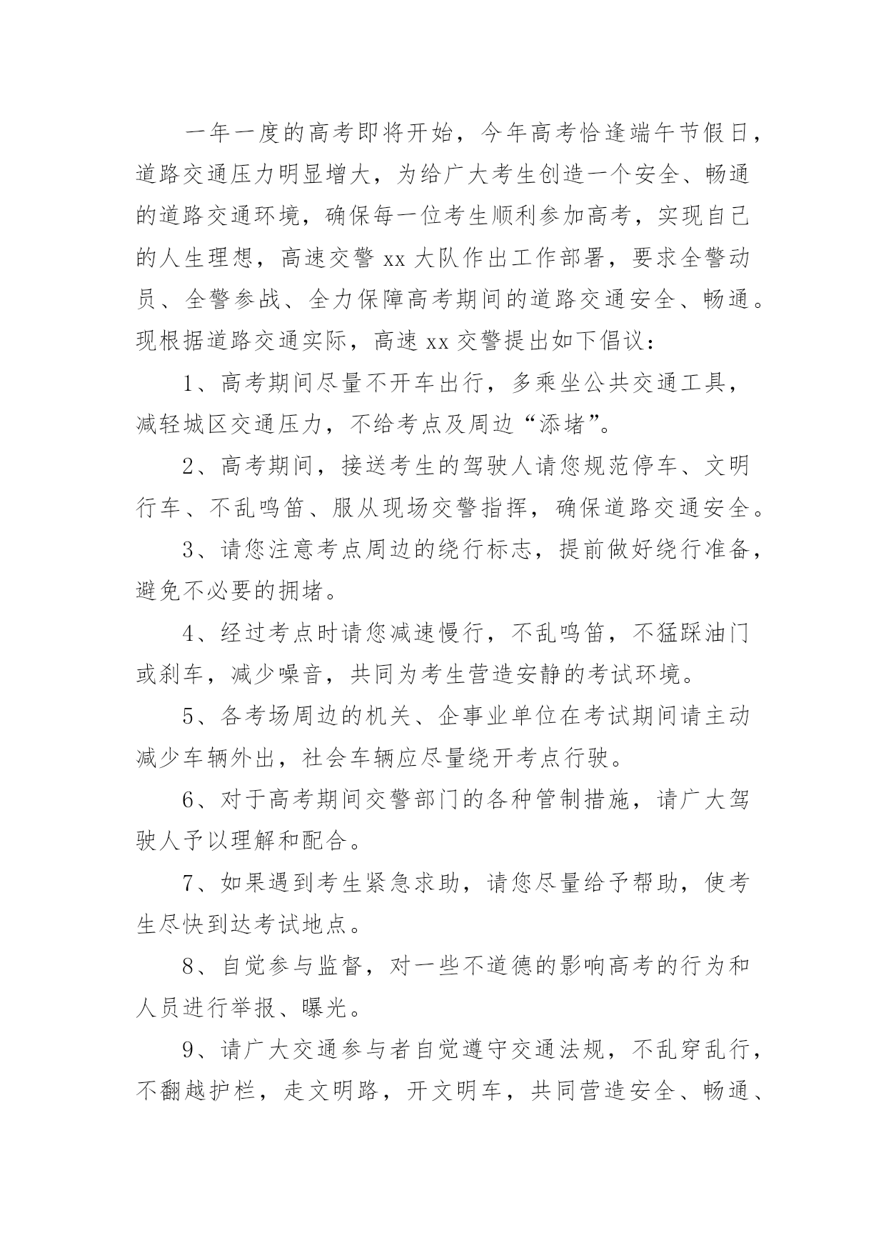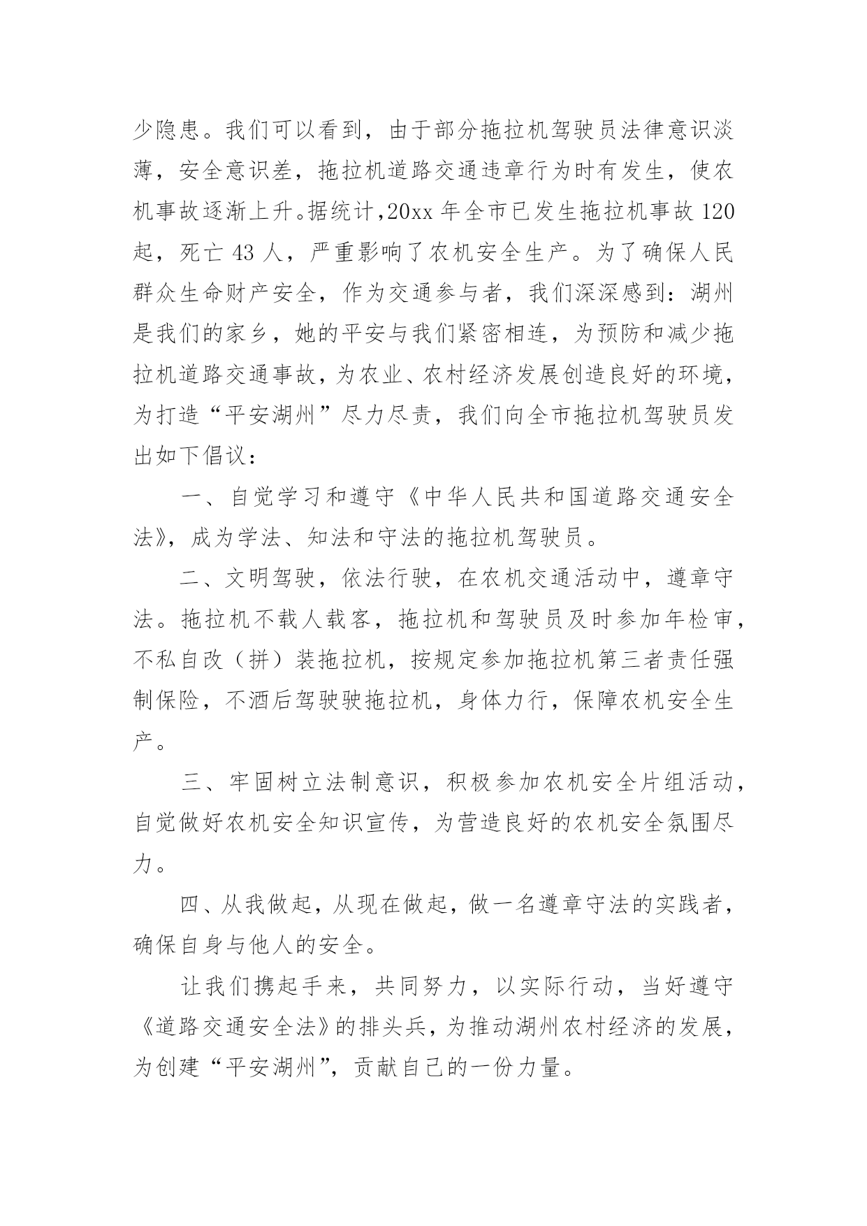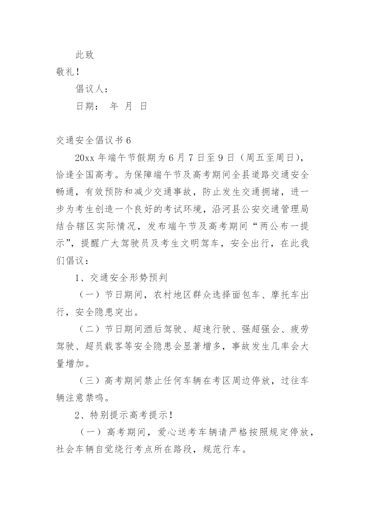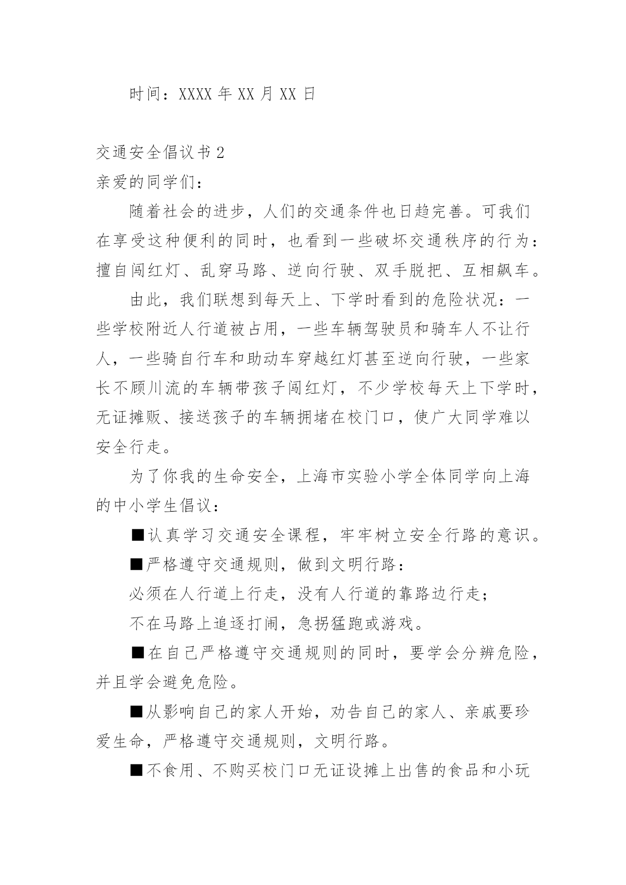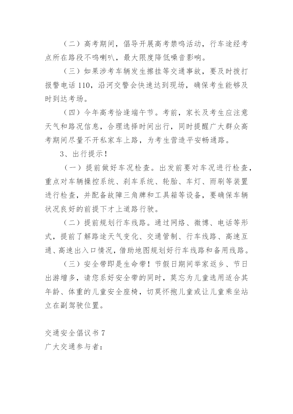 交通安全倡议书交通安全倡议书汇编15篇在我们平凡的日常里,用到倡议书的地方越来越多,倡议书具有响应者不确定性的特征。相信很多朋友都对写倡议书感到非常苦恼吧,下面是小编精心整理的交通安全倡议书,希望对大家有所帮助。交通安全倡议书1亲爱的全体员工:你们好!生活在这个喧嚣繁华的城镇让我们的生活变得精彩而便利,然而随着大家生活水平的不断提升只要我们走上马路,拥挤的车辆便在我们眼前来来往往。你是否感受到潜伏在我们周围的危险呢?因为上下班赶时间不遵守交通法规或存有麻痹和侥幸心理,我们看到了血的事实,经受了血的教训,那一幕幕令人心痛、惨不忍睹的场景,那一个个因抢救无效而离去的人们,最后留下的都是心灵上的创伤和对离去者无尽的痛惜。在痛惜他们的同时,更应该清醒地认识到:遵守交通法规,就是珍爱生命!营造安全、文明、畅通的交通环境,是我们生命安全的重要保障。但在我们身边,车辆乱停乱放、占道、抢道、逆行、行人横穿马路等不文明交通行为却大量存在,一次次让人们付出了惨重的代价。血的教训再次警醒我们,文明交通就是珍爱生命,我们要从自身做起,增强交通安全意识和交通法制观念,自觉遵守交通法规,积极维护交通秩序!公司向全体员工发出如下倡议:一、从我做起,骑车(摩托车电动车)和搭乘摩托车佩戴安全头盔;增强交通安全意识,提高自我保护能力!二、从我做起,骑文明车,走文明路。自觉遵守交通安全法律法规,遵守交通信号、交通标志、交通标线,坚决抵制闯红灯、车辆超速、逆向行驶、强行超车、酒后骑车、乱停乱放等一切不文明交通行为!三、从我做起,不要与机动车辆及行人抢行,骑车时不要急转猛拐,低头疾驶;转弯时,应放慢车速,向后张望,伸手示意行驶方向,不要在机动车临近时突然转弯!四、从我做起,坚持做到“车让人、人让车、车让车、人让人”,共同维护良好的交通环境!五、从我做起,经常教育和提醒家人、亲戚、朋友和邻居,树立文明交通意识,关爱自己和他人的生命,做文明交通的倡导者、实践者和守护者!亲爱的公司员工,让我们携起手来,珍视安全、珍惜健康、珍爱生命。亲爱的同事们,让我们共同树立对自己负责、对家庭负责、对社会负责的责任感从我做起,从现在做起,平安出行,文明出行,让生命之树常青!倡议人:XXX时间:XXXX年XX月XX日交通安全倡议书2亲爱的同学们:随着社会的进步,人们的交通条件也日趋完善。可我们在享受这种便利的同时,也看到一些破坏交通秩序的行为:擅自闯红灯、乱穿马路、逆向行驶、双手脱把、互相飙车。由此,我们联想到每天上、下学时看到的危险状况:一些学校附近人行道被占用,一些车辆驾驶员和骑车人不让行人,一些骑自行车和助动车穿越红灯甚至逆向行驶,一些家长不顾川流的车辆带孩子闯红灯,不少学校每天上下学时,无证摊贩、接送孩子的车辆拥堵在校门口,使广大同学难以安全行走。为了你我的生命安全,上海市实验小学全体同学向上海的中小学生倡议:■认真学习交通安全课程,牢牢树立安全行路的意识。■严格遵守交通规则,做到文明行路:必须在人行道上行走,没有人行道的靠路边行走;不在马路上追逐打闹,急拐猛跑或游戏。■在自己严格遵守交通规则的同时,要学会分辨危险,并且学会避免危险。■从影响自己的家人开始,劝告自己的家人、亲戚要珍爱生命,严格遵守交通规则,文明行路。■不食用、不购买校门口无证设摊上出售的食品和小玩具等商品。上海市实验小学少先队大队部20xx年11月25日交通安全倡议书3中国平均每一分钟就有一人因车祸伤残,平均每五分钟有一人因车祸死亡。导致每天平均死亡288人,每年平均死亡105120人,汽车数量占世界1.9%,车祸死亡人数占世界15%,且每年增加4.5%。全球车祸累计死亡3000万人,超过第二次世界大战死亡人数。为进一步提升交通管理水平,增强群众安全出行交通意识,营造良好的道路交通环境,湄洲派出所决定开展以“文明交通,平安出行”为主题的文明出行倡议书,向全岛人民发出倡议,望大家一起遵守!警方提示依据《中华人民共和国道路交通安全法》第九十九条第一款第一项和第二款的规定,除了酒后驾驶,无证驾驶机动车也会被一律处以行政拘留的哦,所以大家一定要严格遵守交通法,不要心存侥幸开带病车上路,安全出行,平安回家!行车须知:1、不开无牌无证、报废、注销、未年检车辆上路;2、未满16周岁,不准骑二轮电动车、摩托车上路;未满18周岁不准开小型汽车上路;3、开车需有驾驶证,不准无证驾驶;4、二轮摩托车限载一人,小型汽车限载四人;5、驾驶二轮电动车需佩戴头盔,驾驶汽车需系好安全带;6、不得在开车途中与驾驶员闲谈让其分心;7、车辆需停放在指定停车位,不得随意停放在道路两旁。交通安全倡议书4亲爱的家长朋友们:作为父母,总会在孩子外出时,说一句:“注意安全!过马路时,看好红绿灯”,可是在那行人车辆拥挤的街道上,我们仍会看到一些令人胆战心惊的现象