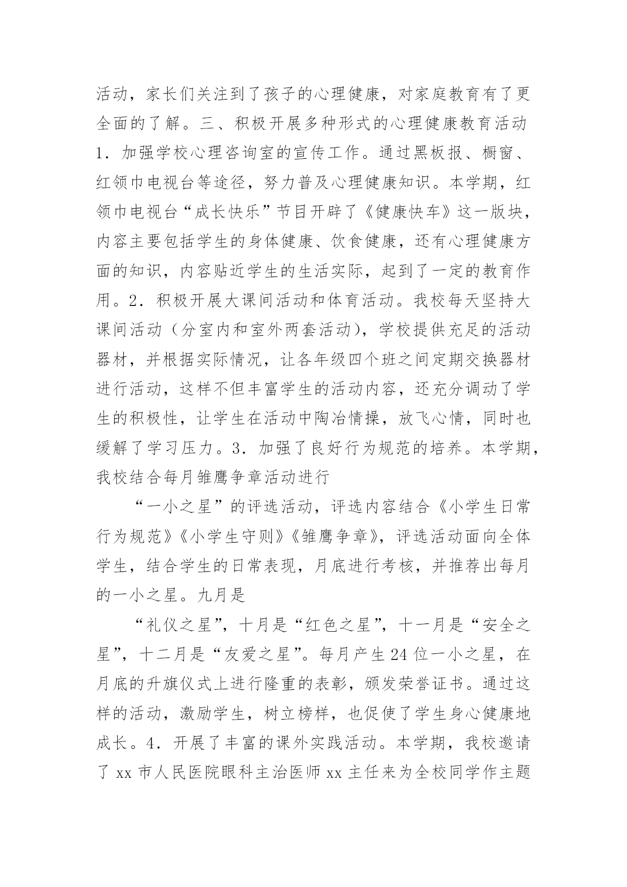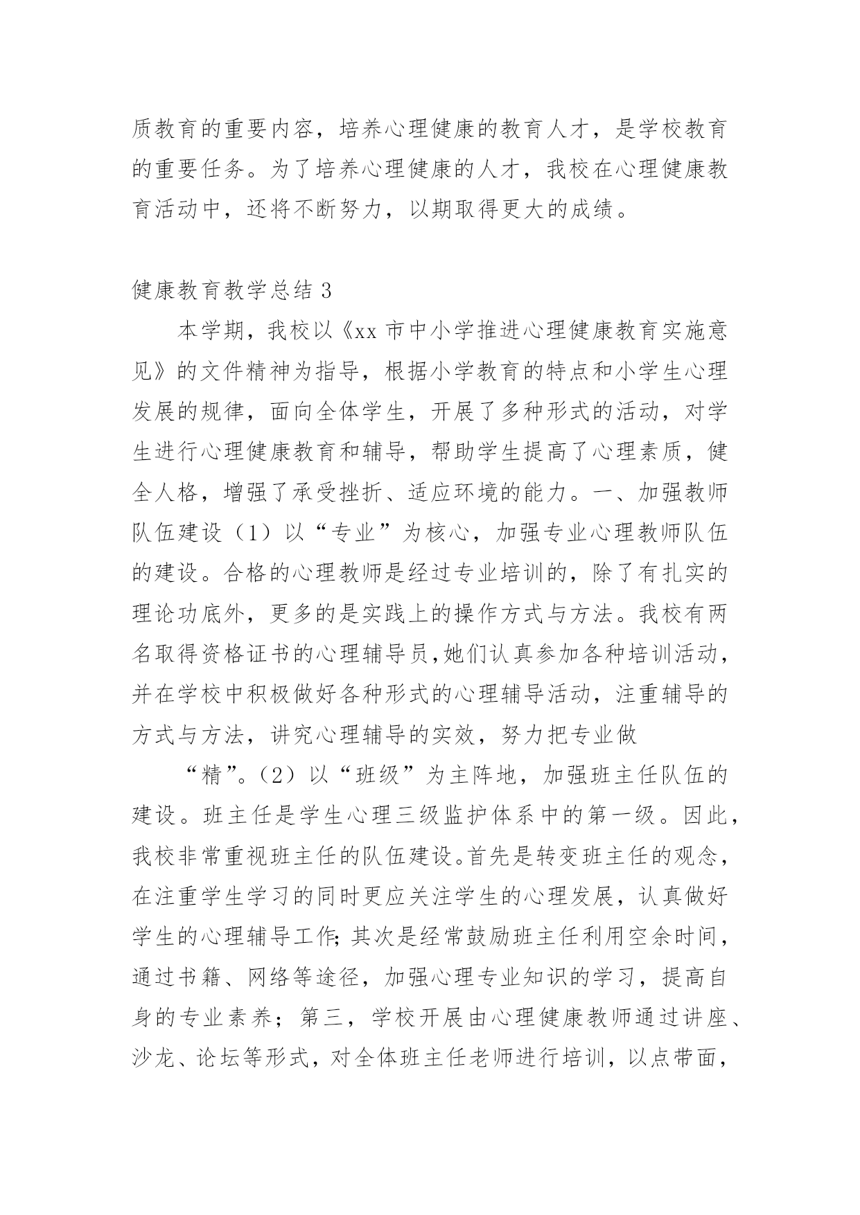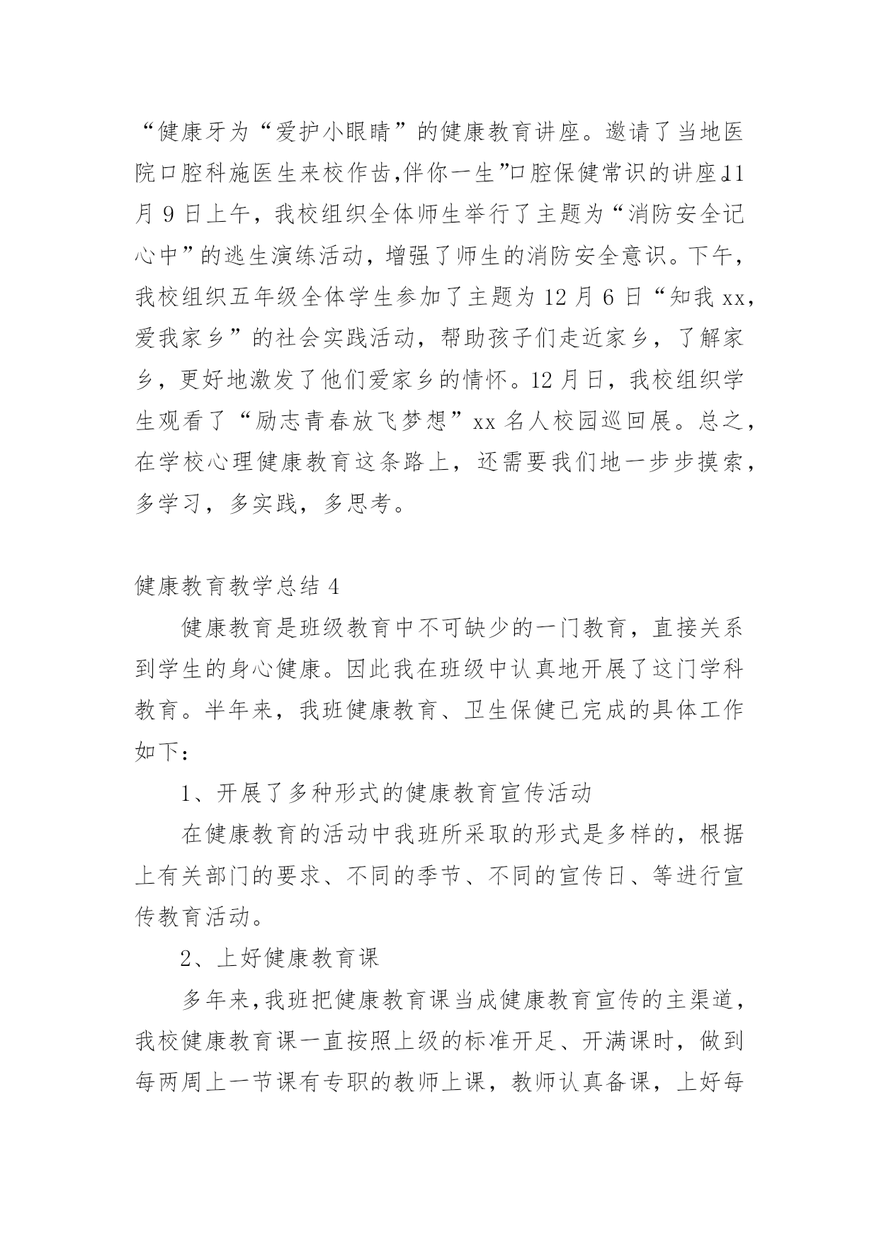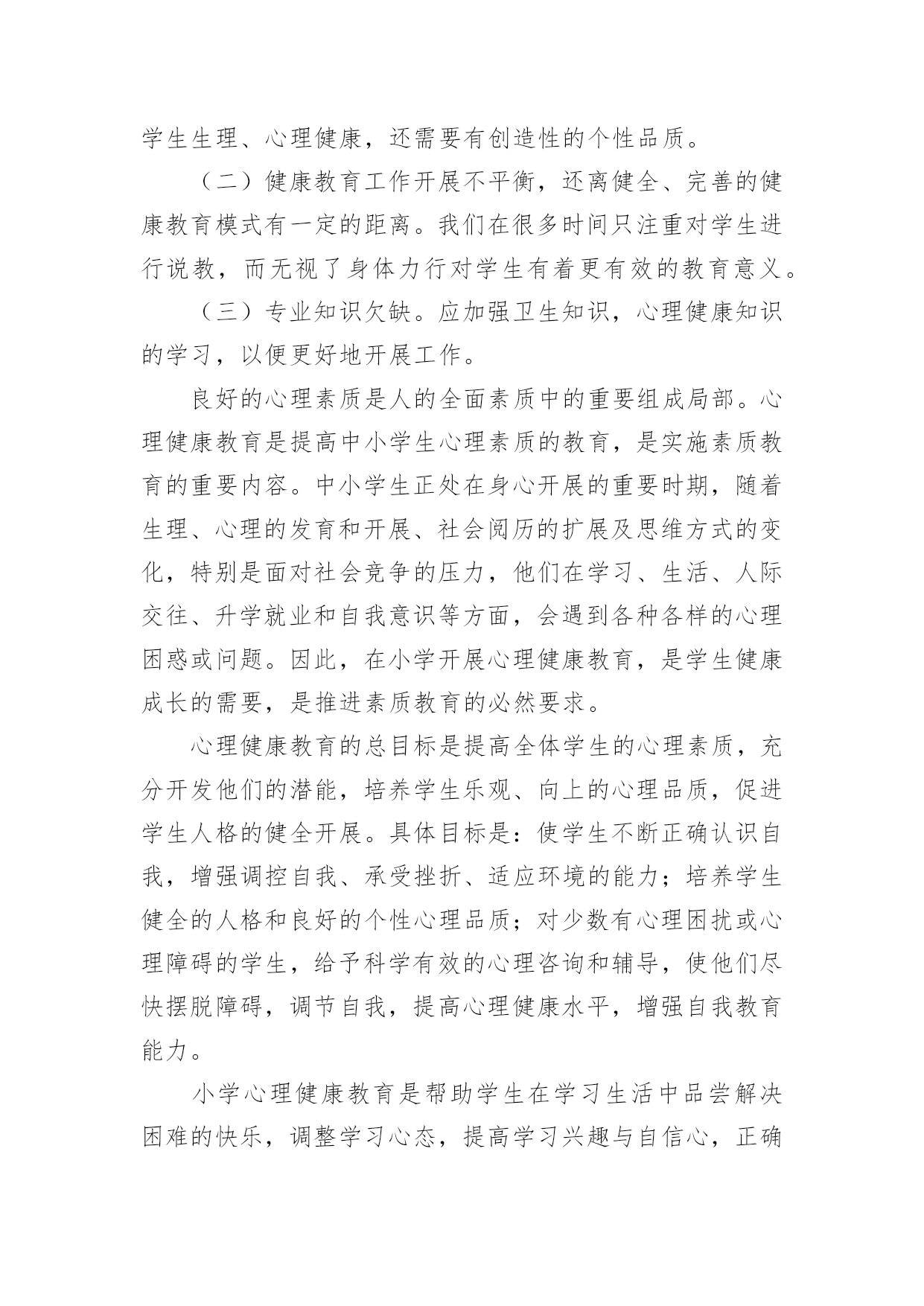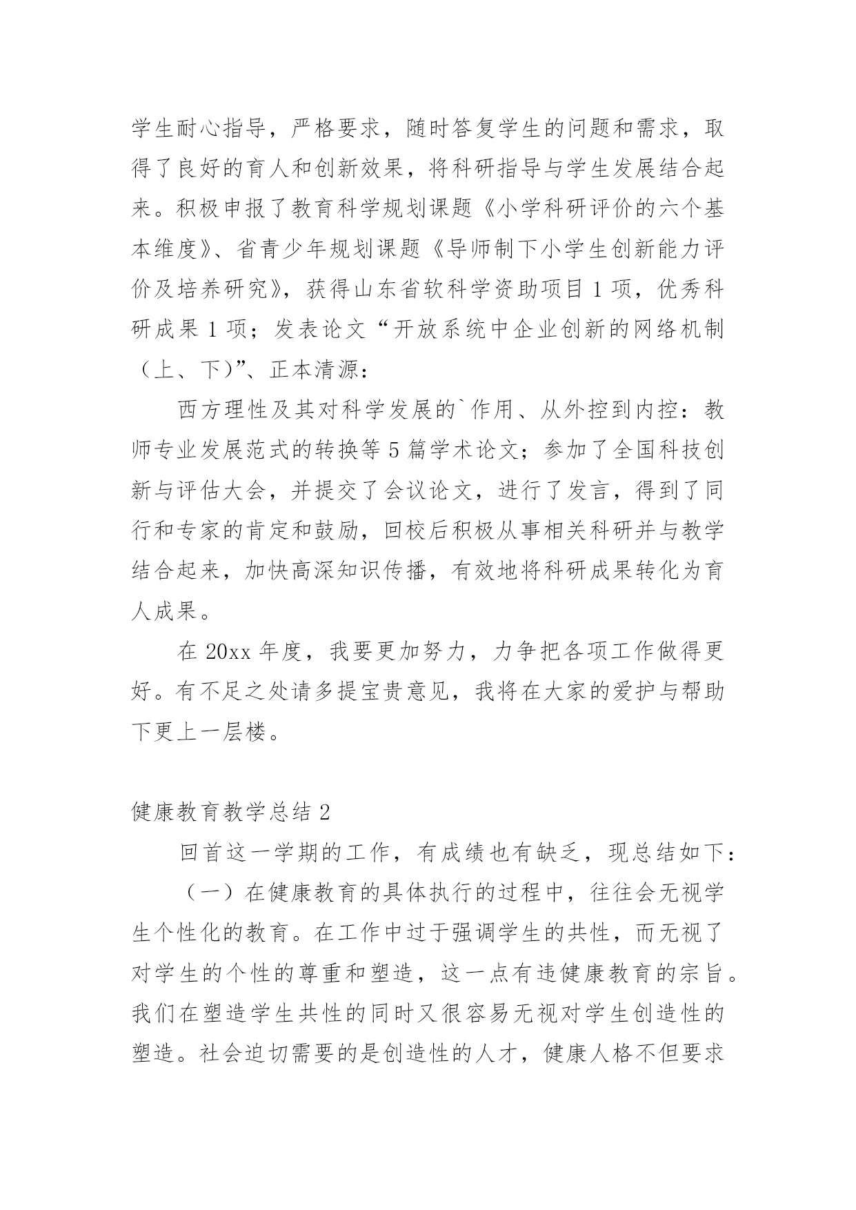 健康教育教学总结总结是在某一时期、某一项目或某些工作告一段落或者全部完成后进行回顾检查、分析评价,从而得出教训和一些规律性认识的一种书面材料,它能帮我们理顺知识结构,突出重点,突破难点,我想我们需要写一份总结了吧。那么你真的懂得怎么写总结吗?以下是小编为大家整理的健康教育教学总结,欢迎大家分享。健康教育教学总结1一年来,在各级领导的关心和帮助下,我顺利地完成了各项教学、科研和学生论文及职业生涯指导工作,积极参与学校、小学开展的各项活动,并取得了可喜的成绩。作为一名小学教师,我认真履行小学教师职责,热爱教育事业,热爱学生,为人师表,教书育人,团结同志,遵纪守法,静心研究,向着更高的学术水准进军。教学中,兢兢业业、勤勤恳恳,始终保持严谨认真的工作态度和一丝不苟的工作作风。本年度先后担任《普通心理学》、《小学英语课程与教学》、《小学生心理健康教育》等课程,共计468课时;严格执行教学计划,认真备课上课,及时辅导。能够将教学建立在科研基础上,将研究与教学有机结合起来,取得了良好的育人效果,激发了学生学习专业知识的热情,培养了创新思维。专注于科研积累,不断提升专业水准。本年度,我指导本科生论文和职业生涯规划17人,对学生耐心指导,严格要求,随时答复学生的问题和需求,取得了良好的育人和创新效果,将科研指导与学生发展结合起来。积极申报了教育科学规划课题《小学科研评价的六个基本维度》、省青少年规划课题《导师制下小学生创新能力评价及培养研究》,获得山东省软科学资助项目1项,优秀科研成果1项;发表论文“开放系统中企业创新的网络机制(上、下)”、正本清源:西方理性及其对科学发展的`作用、从外控到内控:教师专业发展范式的转换等5篇学术论文;参加了全国科技创新与评估大会,并提交了会议论文,进行了发言,得到了同行和专家的肯定和鼓励,回校后积极从事相关科研并与教学结合起来,加快高深知识传播,有效地将科研成果转化为育人成果。在20xx年度,我要更加努力,力争把各项工作做得更好。有不足之处请多提宝贵意见,我将在大家的爱护与帮助下更上一层楼。健康教育教学总结2回首这一学期的工作,有成绩也有缺乏,现总结如下:(一)在健康教育的具体执行的过程中,往往会无视学生个性化的教育。在工作中过于强调学生的共性,而无视了对学生的个性的尊重和塑造,这一点有违健康教育的宗旨。我们在塑造学生共性的同时又很容易无视对学生创造性的塑造。社会迫切需要的是创造性的人才,健康人格不但要求学生生理、心理健康,还需要有创造性的个性品质。(二)健康教育工作开展不平衡,还离健全、完善的健康教育模式有一定的距离。我们在很多时间只注重对学生进行说教,而无视了身体力行对学生有着更有效的教育意义。(三)专业知识欠缺。应加强卫生知识,心理健康知识的学习,以便更好地开展工作。良好的心理素质是人的全面素质中的重要组成局部。心理健康教育是提高中小学生心理素质的教育,是实施素质教育的重要内容。中小学生正处在身心开展的重要时期,随着生理、心理的发育和开展、社会阅历的扩展及思维方式的变化,特别是面对社会竞争的压力,他们在学习、生活、人际交往、升学就业和自我意识等方面,会遇到各种各样的心理困惑或问题。因此,在小学开展心理健康教育,是学生健康成长的需要,是推进素质教育的必然要求。心理健康教育的总目标是提高全体学生的心理素质,充分开发他们的潜能,培养学生乐观、向上的心理品质,促进学生人格的健全开展。具体目标是:使学生不断正确认识自我,增强调控自我、承受挫折、适应环境的能力;培养学生健全的人格和良好的个性心理品质;对少数有心理困扰或心理障碍的学生,给予科学有效的心理咨询和辅导,使他们尽快摆脱障碍,调节自我,提高心理健康水平,增强自我教育能力。小学心理健康教育是帮助学生在学习生活中品尝解决困难的快乐,调整学习心态,提高学习兴趣与自信心,正确对待自己的学习成绩,克服厌学心理,体验学习成功的乐趣,培养面临毕业升学的进取态度;培养集体意识,在班级活动中,善于与更多的同学交往,健全开朗、合群、乐学、自立的健康人格,培养自主自动参与活动的能力。我校根据学校的实际情况开展了丰富的心理健康教育活动,注意发挥各种方式和途径的综合作用,增强心理健康教育的效果。如:我校定期开展心理知识讲座,普及心理健康科学常识,帮助学生掌握一般的心理保健知识,培养良好的心理素质。诚然,个别生在心理健康开展方面需要得到特别的教育和帮助。但是,心理健康是全员性的问题,是每一位学生在成长与开展中都必然会面临的挑战,包括那些学习优秀、在教师看来是“好”孩子的学生,也同样需要心理健康教育。许多研究与实践证明,有时这些“好”学生反而更需要心理健康教育。因为,往往由于学习成绩好,这些“好”学生心理开展中不健康的侧面就常常被无视,得不到教师的重视和及时的帮助教育。如,一些“好”学