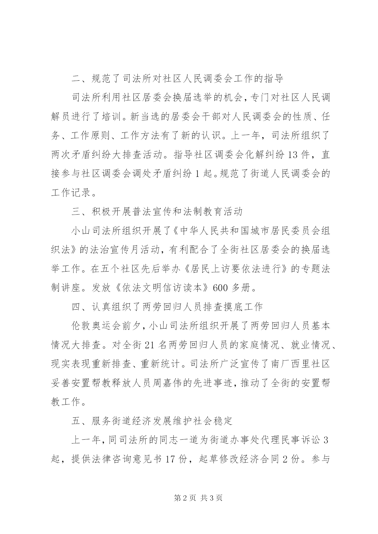 第PAGE\*Arabic\*MERGEFORMAT3页共NUMPAGES\*MERGEFORMAT3页司法人员年终工作总结范文一年来,在区司法局、小山街道党工委的正确领导下,紧紧围绕中心工作,充分发挥个人优势,较好地完成了年初的工作计划和领导交办的临时工作任务,为街道的经济发展和社会稳定做出了一定贡献。一、加强学习,不断提高政治觉悟和业务水平。1、积极参加科学发展观学习实践活动,用科学发展的理念武装自己,指导个人的工作实践,敢于创新工作方法。2、为了加强司法所与社区工作人员、居民群众联系,提高工作效率,公开了小山司法所的电子信箱,创建了小山法所网易博客,主办了司法所建设、社区工作信息、普法宣传和法制教育、安置帮教社区矫正、人民调解、依法治街社区依法治理、法律咨询、司法所上站学习等十几个栏目。加强了对社区工作的指导,也给社区干部一个交流工作经验,展示个人才华的平台,最突出的作用在于方便了干部群众的法律咨询,规范了司法所服务行为。凡是境内干部居民向司法所咨询法律问题,小山司法所都会给一份较规范的法律咨询意见书。3、改进了司法所上站学习的形式。司法所上站的地点由办事处改为居委会,支持和主讲由司法所长改为社区工作人员,方式由开会授课式改为工作经验介绍、讨论的方式。司法所只是侧面指导。这样大大调动了社区干部的积极性和工作的主动性。二、规范了司法所对社区人民调委会工作的指导司法所利用社区居委会换届选举的机会,专门对社区人民调解员进行了培训。新当选的居委会干部对人民调委会的性质、任务、工作原则、工作方法有了新的认识。上一年,司法所组织了两次矛盾纠纷大排查活动。指导社区调委会化解纠纷13件,直接参与社区调委会调处矛盾纠纷1起。规范了街道人民调委会的工作记录。三、积极开展普法宣传和法制教育活动小山司法所组织开展了《中华人民共和国城市居民委员会组织法》的法治宣传月活动,有利配合了全街社区居委会的换届选举工作。在五个社区先后举办《居民上访要依法进行》的专题法制讲座。发放《依法文明信访读本》600多册。四、认真组织了两劳回归人员排查摸底工作伦敦奥运会前夕,小山司法所组织开展了两劳回归人员基本情况大排查。对全街21名两劳回归人员的家庭情况、就业情况、现实表现重新排查、重新统计。司法所广泛宣传了南厂西里社区妥善安置帮教释放人员周嘉伟的先进事迹,推动了全街的安置帮教工作。五、服务街道经济发展维护社会稳定上一年,同司法所的同志一道为街道办事处代理民事诉讼3起,提供法律咨询意见书17份,起草修改经济合同2份。参与接待上访群众7起,入户走访居民群众63户次,给信访者讲法律法规和党的政策,认真细致地做群众工作。与上访户签订信访代理合同,并逐项落实,也得到领导肯定,社区居民群众的理解。总之,一年来为街道做了些实实在在的工作,但同人民群众的期望还有差距。今后,一定要发扬成绩,弥补不足,依先进的同志为榜样,力争把工作干得更好。
