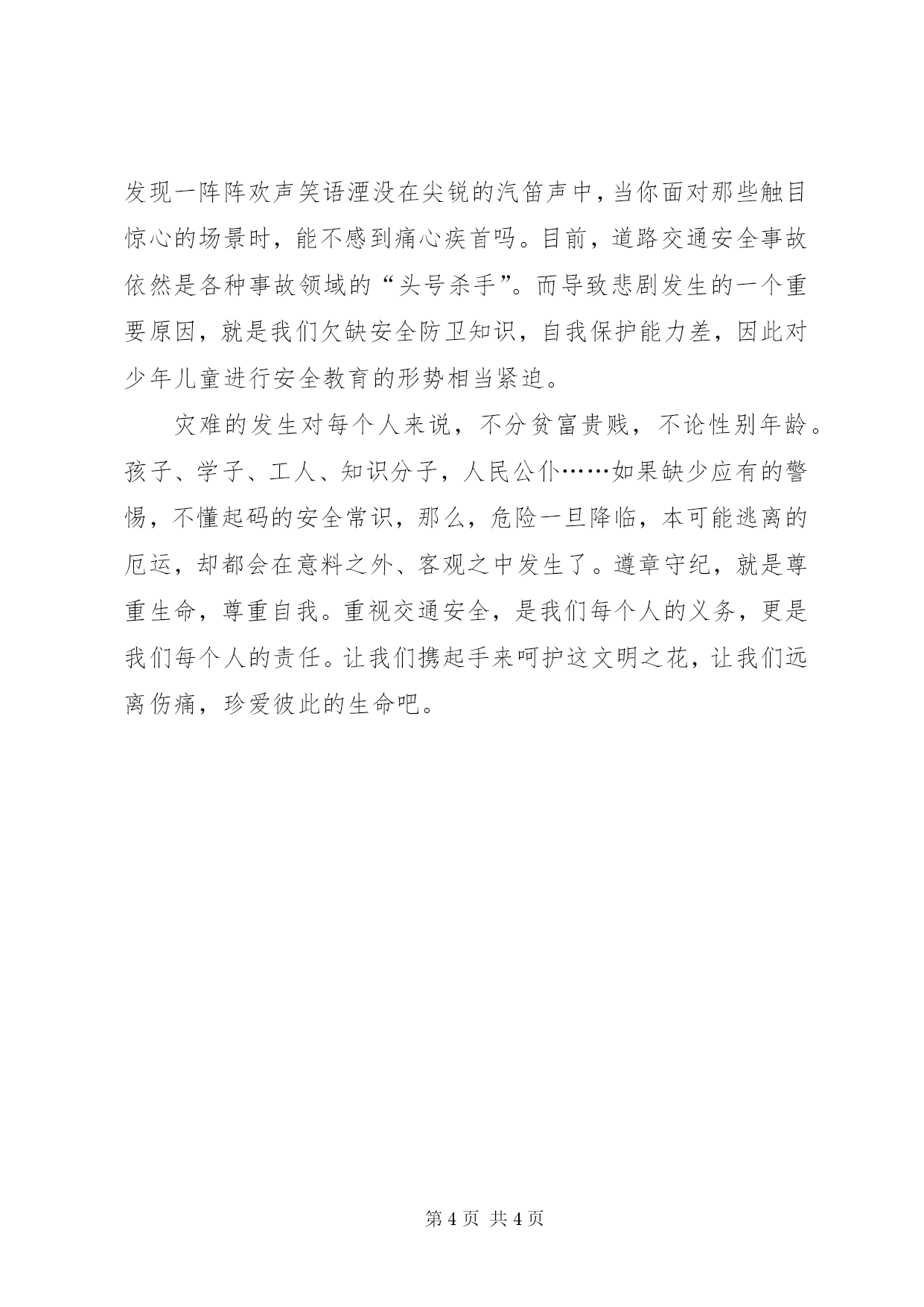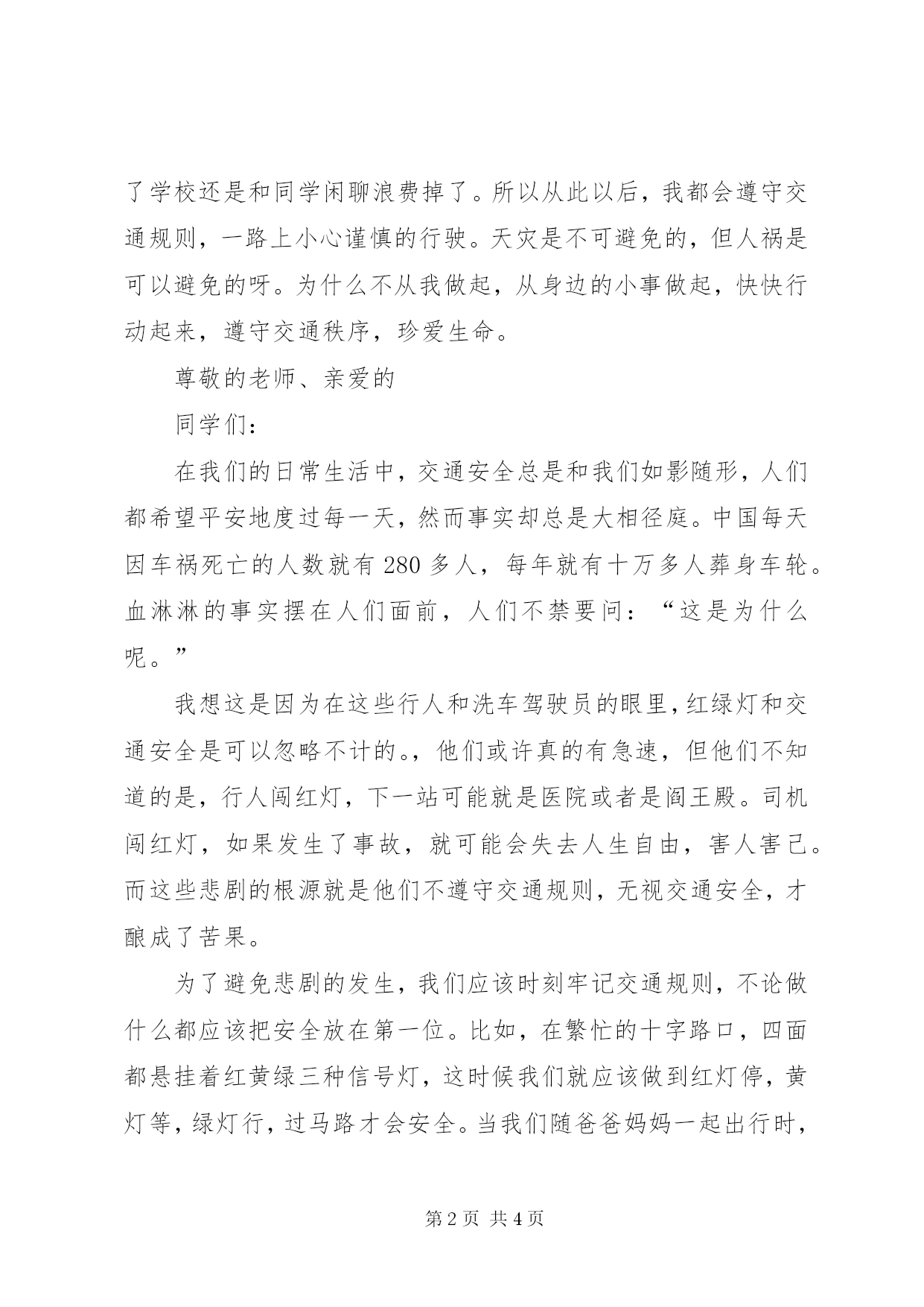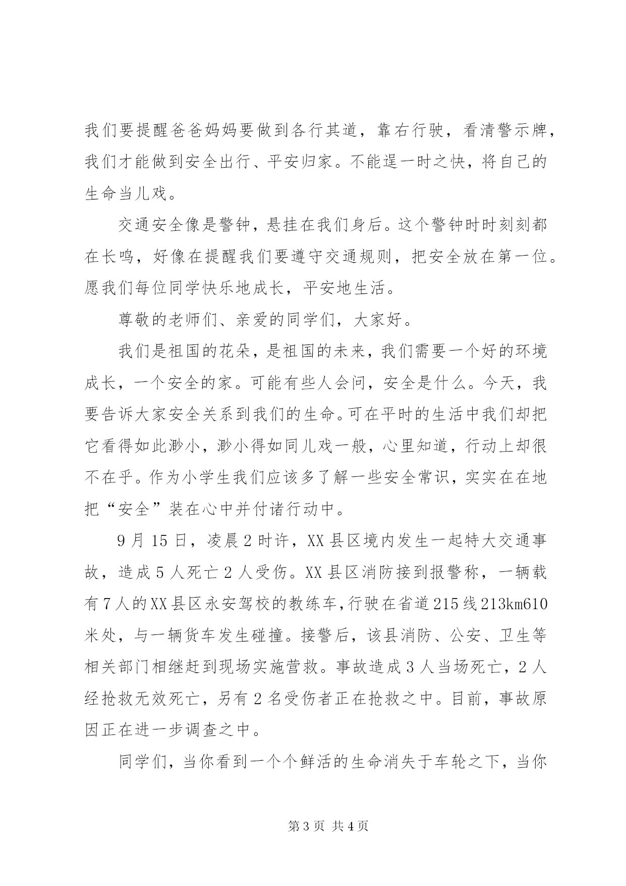 第PAGE\*Arabic\*MERGEFORMAT4页共NUMPAGES\*MERGEFORMAT4页交通安全发言稿交通安全班会发言稿交通安全,学校老师讲,校长讲,家里父母讲,我想这四个字大家已不陌生了吧。哦,应该说是听得不耐烦了。可是,我要问一句,这四个字,大家都记在心里了吗。走路不要闯红绿灯,这句话连幼儿园小朋友都知道。可是,又有多少人真正做到了呢。为什么马路要设置红绿灯。不就是为了让交通秩序井然吗。其实遵守交通规则就是对自己的生命负责。我们活着,不仅是为自己而活,更是对关心你、爱护你的人负责。再说,现在我们青少年正处于青春似的年华,为什么我们不能善待生命,开开心心过好每一天。据说,在国外,几乎没有人横穿马路,就算马路上没有汽车,也没有人闯红绿灯。而在中国,横穿马路的人多的是。遵守交通规则还是道德的表现。所以我们要懂得谦让:一条马路上,除了车就是人,只要双方相互忍让,那么我们社会将多么和谐。俗话说:让一步海阔天空。可见,交通安全,无论是生活中还是学习上都是值得大家虚心借鉴的。只要出门在外就会有红绿灯,一路上也不是只有一个红绿灯,闯得了一个总不能个个都闯吧。除非你要当亡命之徒。其实,乱闯红绿灯省不了多少时间。我天天骑自行车上学就深有体会,一路上横冲直撞,闯了一个红绿灯,到了另一个路口还是要等,况且剩下的这几分钟,到了学校还是和同学闲聊浪费掉了。所以从此以后,我都会遵守交通规则,一路上小心谨慎的行驶。天灾是不可避免的,但人祸是可以避免的呀。为什么不从我做起,从身边的小事做起,快快行动起来,遵守交通秩序,珍爱生命。尊敬的老师、亲爱的同学们:在我们的日常生活中,交通安全总是和我们如影随形,人们都希望平安地度过每一天,然而事实却总是大相径庭。中国每天因车祸死亡的人数就有280多人,每年就有十万多人葬身车轮。血淋淋的事实摆在人们面前,人们不禁要问:“这是为什么呢。”我想这是因为在这些行人和洗车驾驶员的眼里,红绿灯和交通安全是可以忽略不计的。,他们或许真的有急速,但他们不知道的是,行人闯红灯,下一站可能就是医院或者是阎王殿。司机闯红灯,如果发生了事故,就可能会失去人生自由,害人害己。而这些悲剧的根源就是他们不遵守交通规则,无视交通安全,才酿成了苦果。为了避免悲剧的发生,我们应该时刻牢记交通规则,不论做什么都应该把安全放在第一位。比如,在繁忙的十字路口,四面都悬挂着红黄绿三种信号灯,这时候我们就应该做到红灯停,黄灯等,绿灯行,过马路才会安全。当我们随爸爸妈妈一起出行时,我们要提醒爸爸妈妈要做到各行其道,靠右行驶,看清警示牌,我们才能做到安全出行、平安归家。不能逞一时之快,将自己的生命当儿戏。交通安全像是警钟,悬挂在我们身后。这个警钟时时刻刻都在长鸣,好像在提醒我们要遵守交通规则,把安全放在第一位。愿我们每位同学快乐地成长,平安地生活。尊敬的老师们、亲爱的同学们,大家好。我们是祖国的花朵,是祖国的未来,我们需要一个好的环境成长,一个安全的家。可能有些人会问,安全是什么。今天,我要告诉大家安全关系到我们的生命。可在平时的生活中我们却把它看得如此渺小,渺小得如同儿戏一般,心里知道,行动上却很不在乎。作为小学生我们应该多了解一些安全常识,实实在在地把“安全”装在心中并付诸行动中。9月15日,凌晨2时许,XX县区境内发生一起特大交通事故,造成5人死亡2人受伤。XX县区消防接到报警称,一辆载有7人的XX县区永安驾校的教练车,行驶在省道215线213km610米处,与一辆货车发生碰撞。接警后,该县消防、公安、卫生等相关部门相继赶到现场实施营救。事故造成3人当场死亡,2人经抢救无效死亡,另有2名受伤者正在抢救之中。目前,事故原因正在进一步调查之中。同学们,当你看到一个个鲜活的生命消失于车轮之下,当你发现一阵阵欢声笑语湮没在尖锐的汽笛声中,当你面对那些触目惊心的场景时,能不感到痛心疾首吗。目前,道路交通安全事故依然是各种事故领域的“头号杀手”。而导致悲剧发生的一个重要原因,就是我们欠缺安全防卫知识,自我保护能力差,因此对少年儿童进行安全教育的形势相当紧迫。灾难的发生对每个人来说,不分贫富贵贱,不论性别年龄。孩子、学子、工人、知识分子,人民公仆……如果缺少应有的警惕,不懂起码的安全常识,那么,危险一旦降临,本可能逃离的厄运,却都会在意料之外、客观之中发生了。遵章守纪,就是尊重生命,尊重自我。重视交通安全,是我们每个人的义务,更是我们每个人的责任。让我们携起手来呵护这文明之花,让我们远离伤痛,珍爱彼此的生命吧。