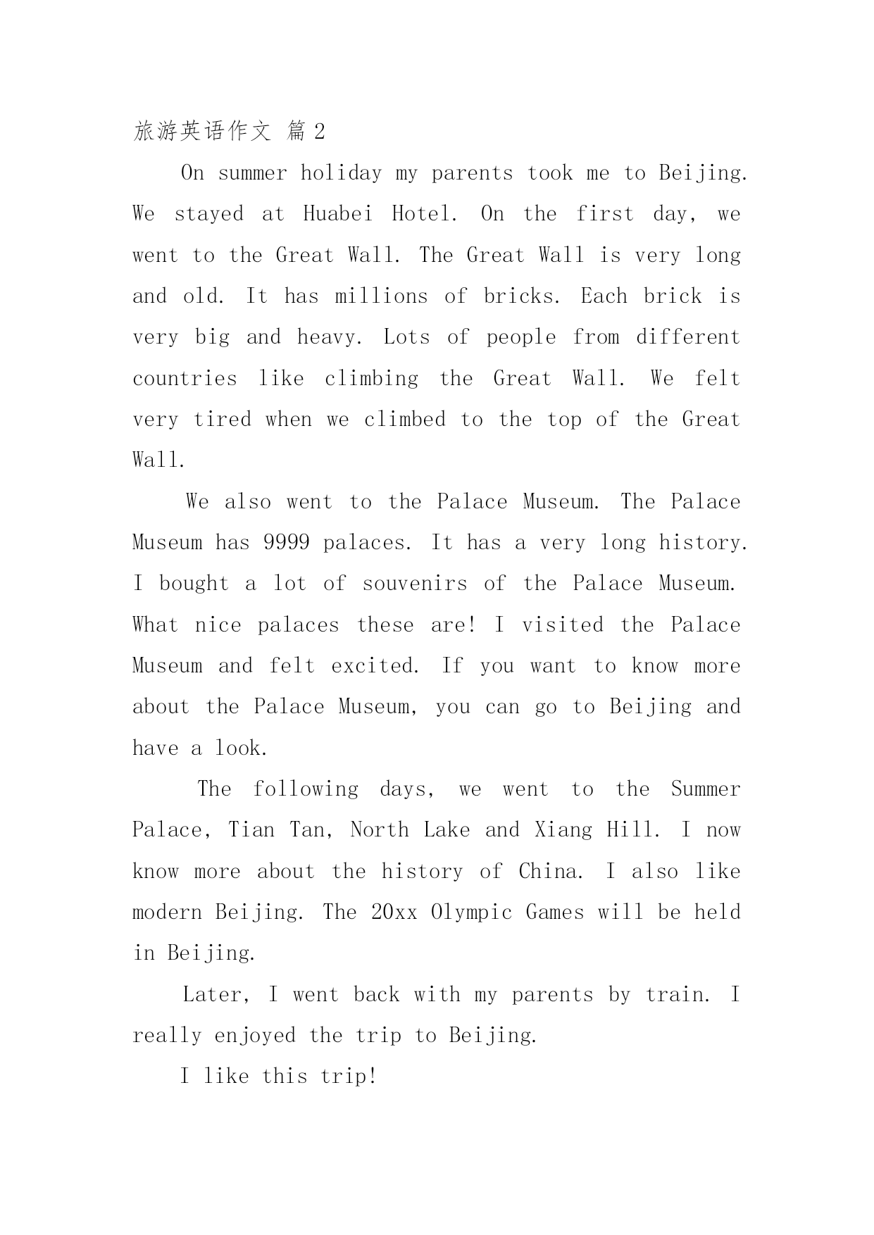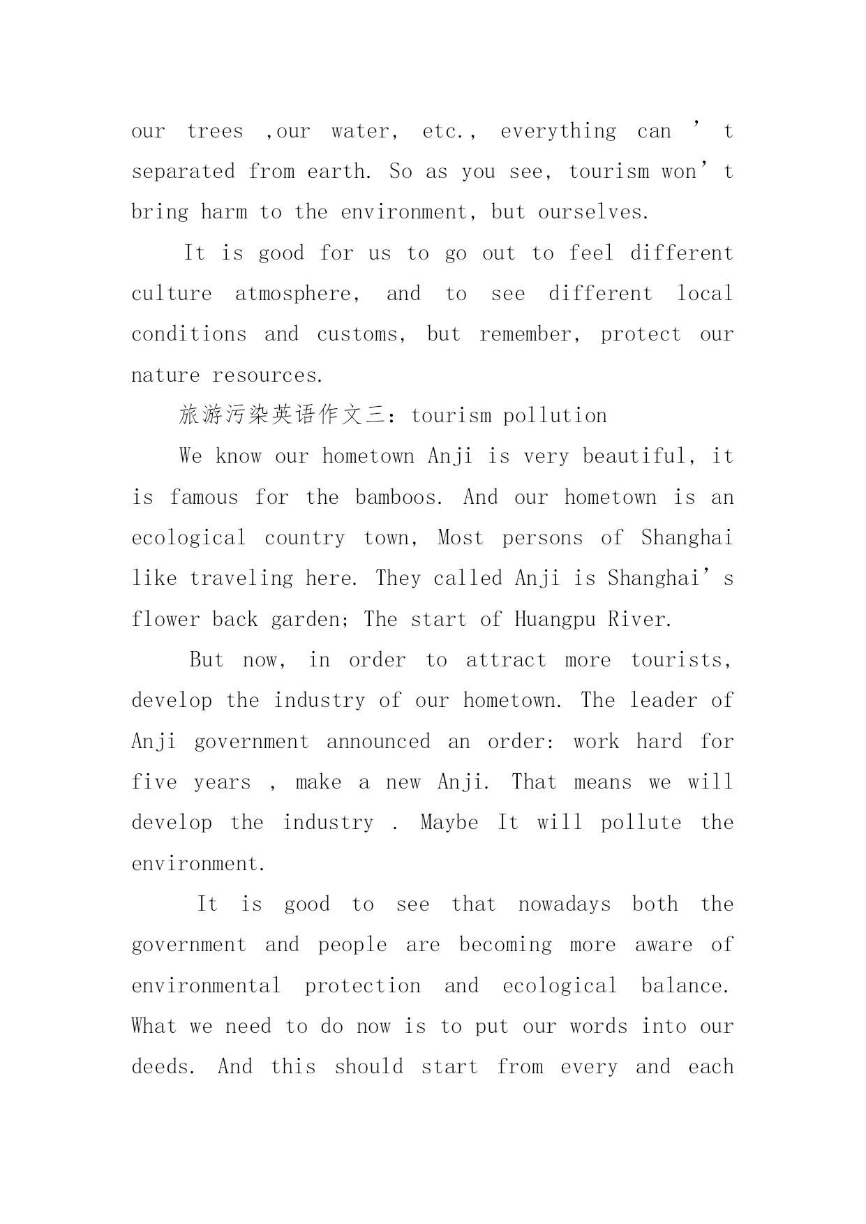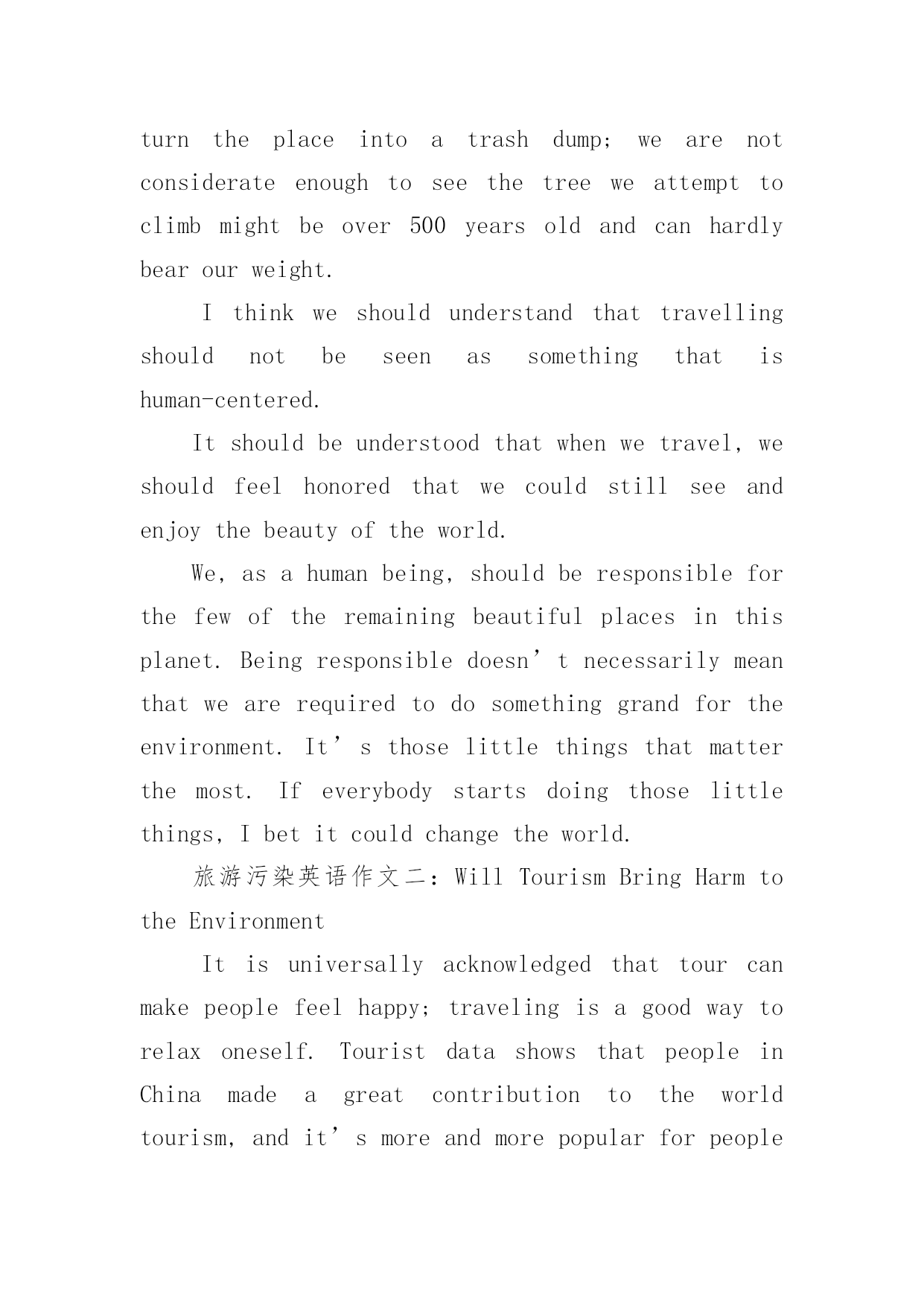 旅游英语作文【精选】旅游英语作文汇编九篇在学习、工作乃至生活中,大家都不可避免地会接触到作文吧,借助作文可以提高我们的语言组织能力。你所见过的作文是什么样的呢?以下是小编为大家整理的旅游英语作文9篇,供大家参考借鉴,希望可以帮助到有需要的朋友。旅游英语作文篇1旅游污染英语作文一:tourismpollutionResponsibletravelisverywellexpressedinthefamoustravelerssaying:Takenothingbutpictures,leavenothingbutfootprints,killnothingbuttime.Travellingiseveryone’swayofgettingawayfromthehustleandbustleoflifeandsometimes,becausewearesoengrossedinourdesiretoenjoyandhavefun,wetendtoforgetthattheweonlyhaveoneearthtoliveonandthatweareallresponsibleforit.Veryoften,wearenotconsciousenoughtorealizethatonelittlecandywrapperthatwethrewoutsidethebuswhiletravellingcouldonedaycontributetotheblockingofthedrainagesystemandcouldcausefloodinginthearea;wearenotawareenoughofthefactthatthelitterwethrowawaycarelesslymightonedayturntheplaceintoatrashdump;wearenotconsiderateenoughtoseethetreeweattempttoclimbmightbeover500yearsoldandcanhardlybearourweight.Ithinkweshouldunderstandthattravellingshouldnotbeseenassomethingthatishuman-centered.Itshouldbeunderstoodthatwhenwetravel,weshouldfeelhonoredthatwecouldstillseeandenjoythebeautyoftheworld.We,asahumanbeing,shouldberesponsibleforthefewoftheremainingbeautifulplacesinthisplanet.Beingresponsibledoesn’tnecessarilymeanthatwearerequiredtodosomethinggrandfortheenvironment.It’sthoselittlethingsthatmatterthemost.Ifeverybodystartsdoingthoselittlethings,Ibetitcouldchangetheworld.旅游污染英语作文二:WillTourismBringHarmtotheEnvironmentItisuniversallyacknowledgedthattourcanmakepeoplefeelhappy;travelingisagoodwaytorelaxoneself.TouristdatashowsthatpeopleinChinamadeagreatcontributiontotheworldtourism,andit’smoreandmorepopularforpeopletogooutforvocation.Thoughreportscriticizedthattourismhadbroughtharmtotheenvironment,Istillbelieveintherisingpaceoftourism.Well,thereisnodenyingthatatthismoment,tourismhascausedsomeproblemtotheenvironment,butwhatIwanttoemphasizeisthatsuchdamageareraisedbypeople,aslongasweimprovetheenvironmentalconsciousnessofourcitizens,aswellasperfectthepublicfacilities,suchasaddingmoredustbinstoconveniencet