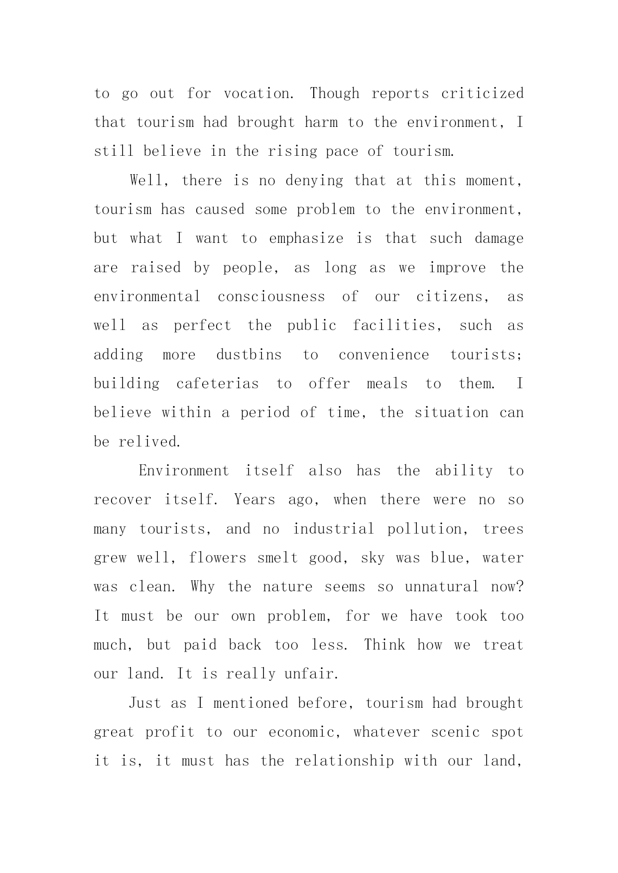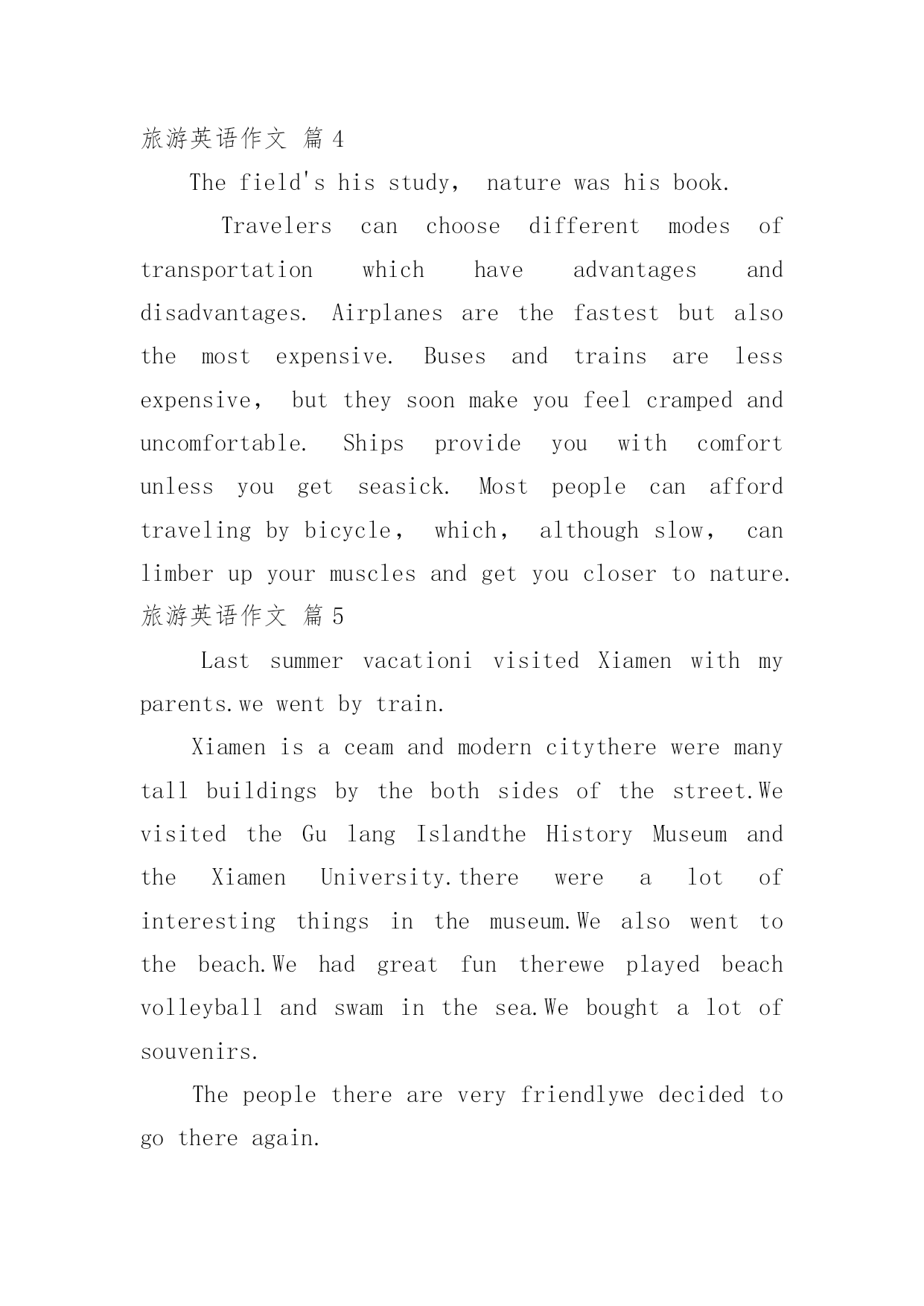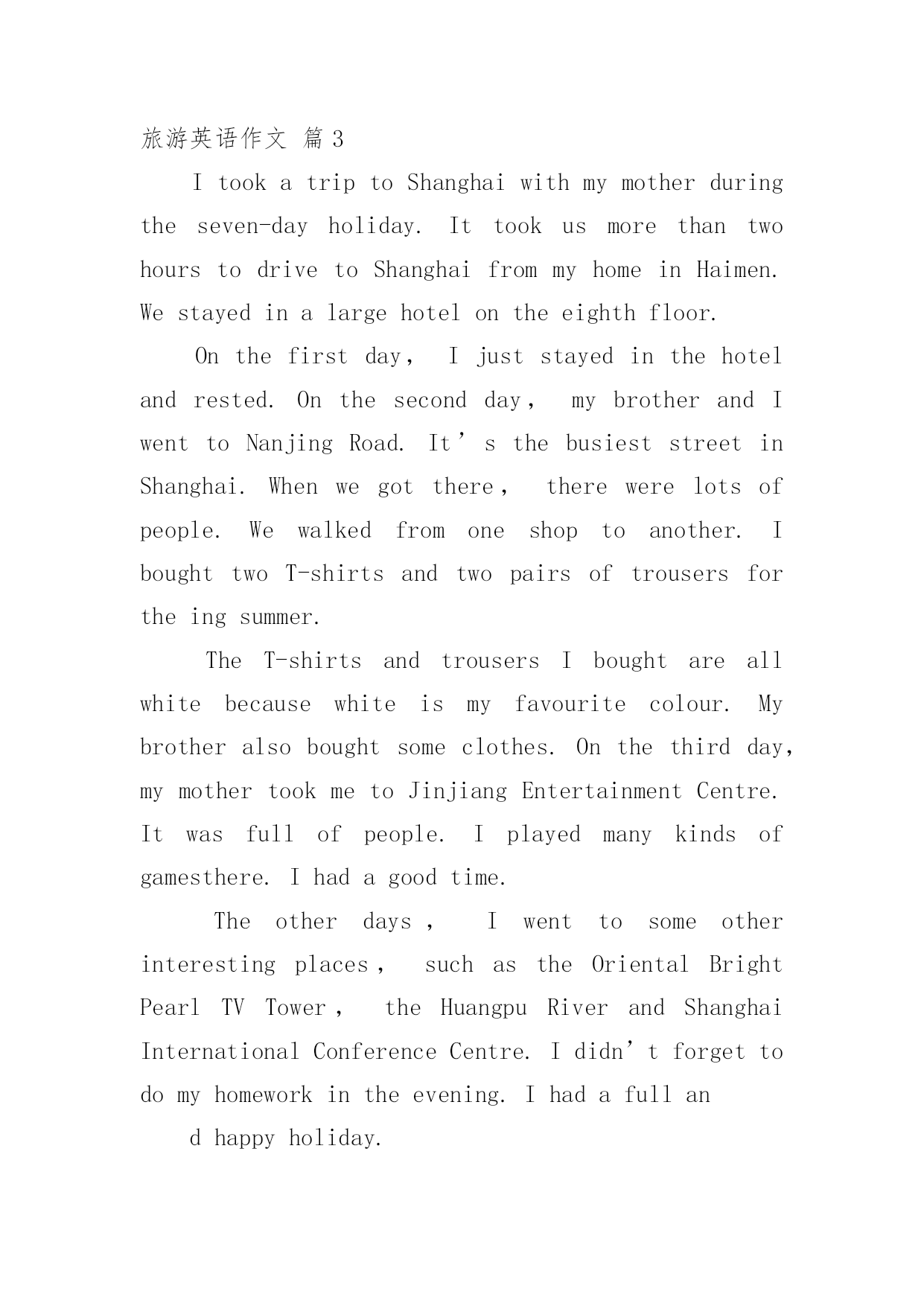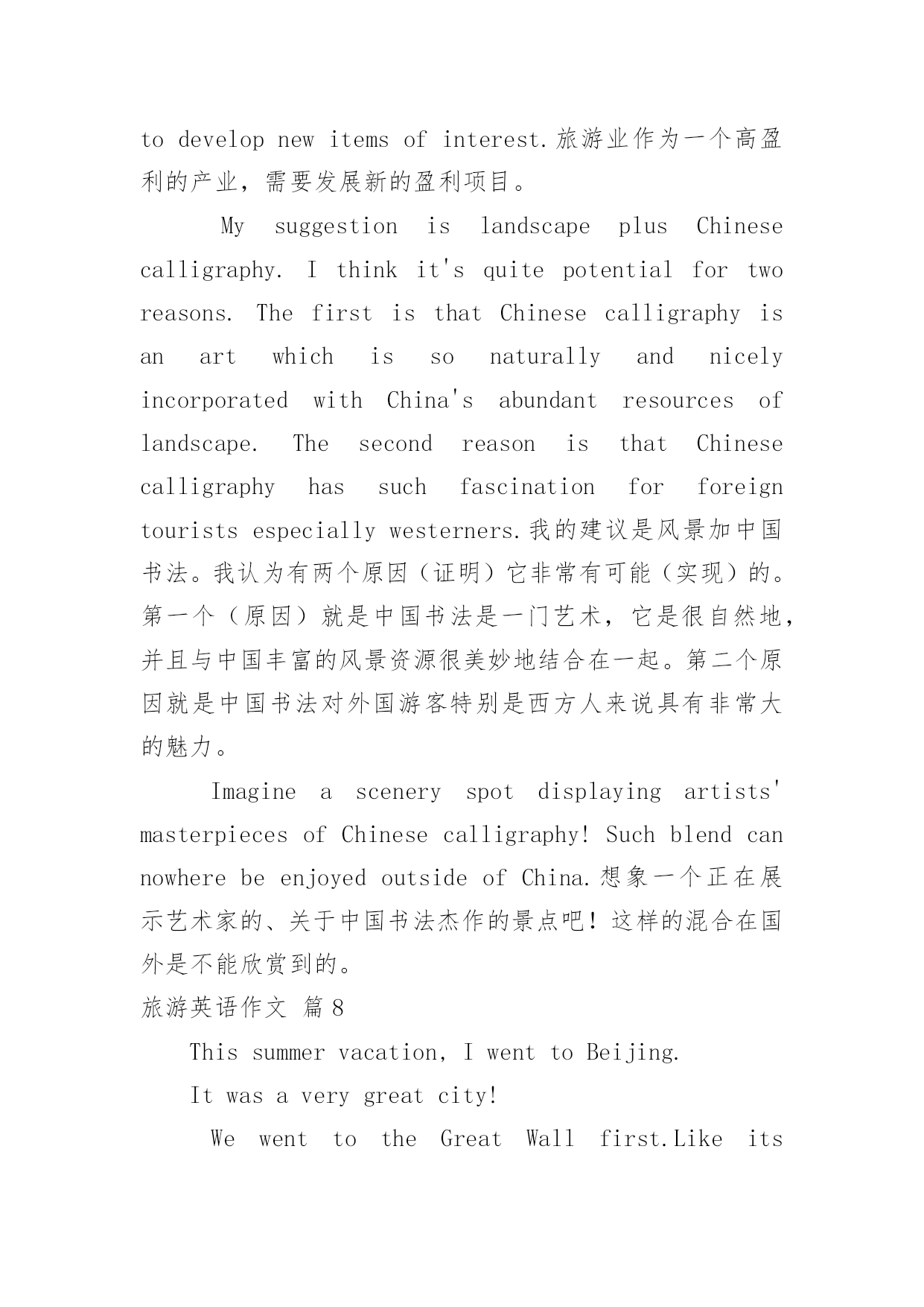 旅游英语作文【精选】旅游英语作文汇编九篇在学习、工作乃至生活中,大家都不可避免地会接触到作文吧,借助作文可以提高我们的语言组织能力。你所见过的作文是什么样的呢?以下是小编为大家整理的旅游英语作文9篇,供大家参考借鉴,希望可以帮助到有需要的朋友。旅游英语作文篇1旅游污染英语作文一:tourismpollutionResponsibletravelisverywellexpressedinthefamoustravelerssaying:Takenothingbutpictures,leavenothingbutfootprints,killnothingbuttime.Travellingiseveryone’swayofgettingawayfromthehustleandbustleoflifeandsometimes,becausewearesoengrossedinourdesiretoenjoyandhavefun,wetendtoforgetthattheweonlyhaveoneearthtoliveonandthatweareallresponsibleforit.Veryoften,wearenotconsciousenoughtorealizethatonelittlecandywrapperthatwethrewoutsidethebuswhiletravellingcouldonedaycontributetotheblockingofthedrainagesystemandcouldcausefloodinginthearea;wearenotawareenoughofthefactthatthelitterwethrowawaycarelesslymightonedayturntheplaceintoatrashdump;wearenotconsiderateenoughtoseethetreeweattempttoclimbmightbeover500yearsoldandcanhardlybearourweight.Ithinkweshouldunderstandthattravellingshouldnotbeseenassomethingthatishuman-centered.Itshouldbeunderstoodthatwhenwetravel,weshouldfeelhonoredthatwecouldstillseeandenjoythebeautyoftheworld.We,asahumanbeing,shouldberesponsibleforthefewoftheremainingbeautifulplacesinthisplanet.Beingresponsibledoesn’tnecessarilymeanthatwearerequiredtodosomethinggrandfortheenvironment.It’sthoselittlethingsthatmatterthemost.Ifeverybodystartsdoingthoselittlethings,Ibetitcouldchangetheworld.旅游污染英语作文二:WillTourismBringHarmtotheEnvironmentItisuniversallyacknowledgedthattourcanmakepeoplefeelhappy;travelingisagoodwaytorelaxoneself.TouristdatashowsthatpeopleinChinamadeagreatcontributiontotheworldtourism,andit’smoreandmorepopularforpeopletogooutforvocation.Thoughreportscriticizedthattourismhadbroughtharmtotheenvironment,Istillbelieveintherisingpaceoftourism.Well,thereisnodenyingthatatthismoment,tourismhascausedsomeproblemtotheenvironment,butwhatIwanttoemphasizeisthatsuchdamageareraisedbypeople,aslongasweimprovetheenvironmentalconsciousnessofourcitizens,aswellasperfectthepublicfacilities,suchasaddingmoredustbinstoconveniencet