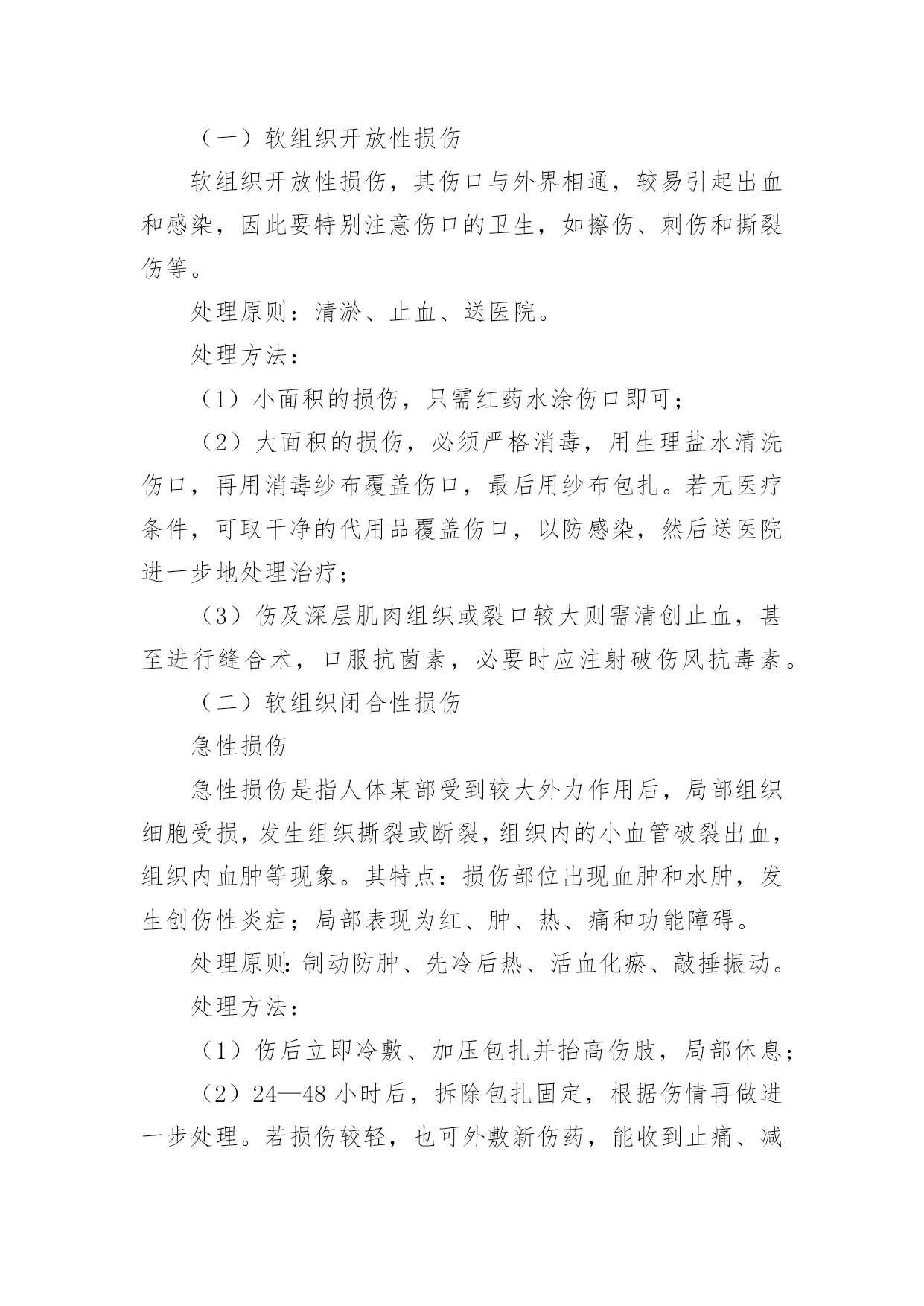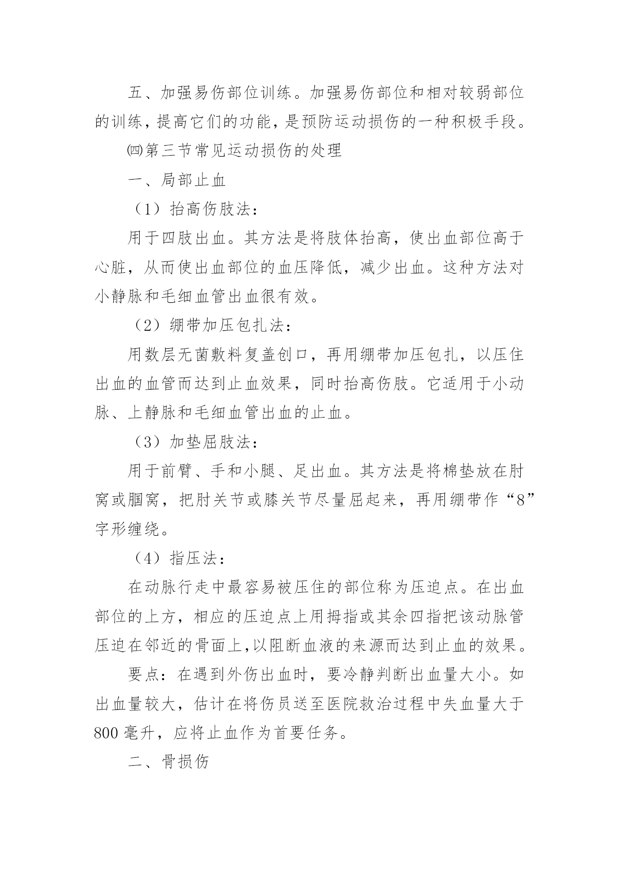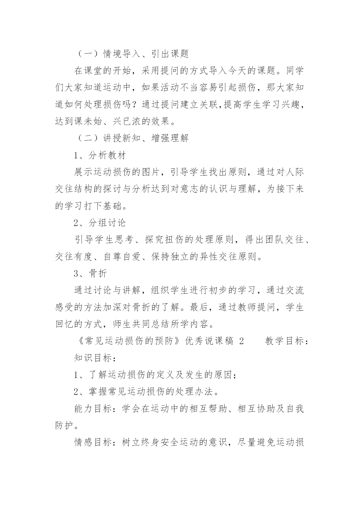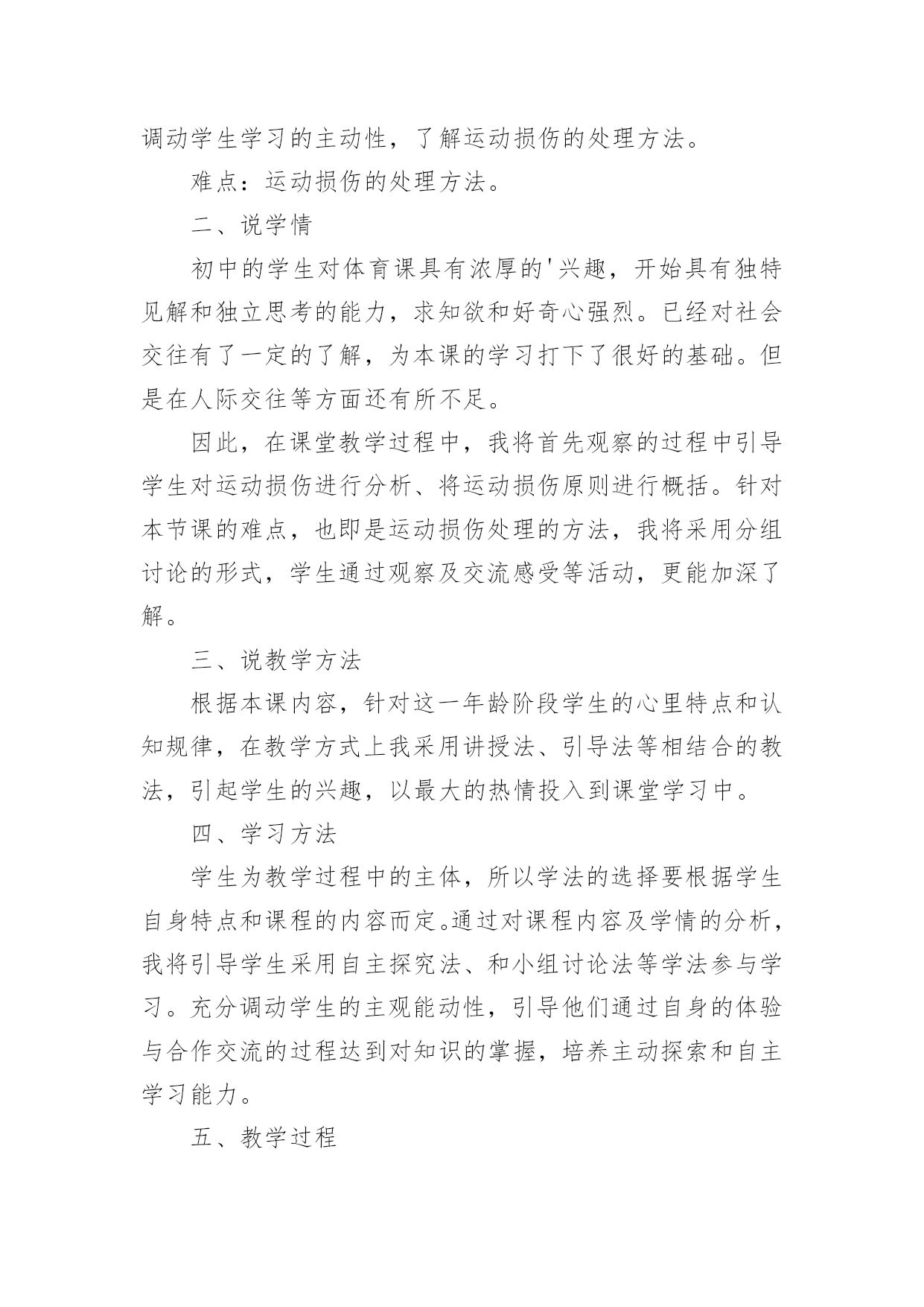 《常见运动损伤的预防》优秀说课稿《常见运动损伤的预防》优秀说课稿(通用10篇)作为一无名无私奉献的教育工作者,就难以避免地要准备说课稿,编写说课稿是提高业务素质的有效途径。那么大家知道正规的说课稿是怎么写的吗?下面是小编帮大家整理的《常见运动损伤的预防》优秀说课稿,欢迎大家分享。《常见运动损伤的预防》优秀说课稿1一、说教材1、地位和作用常见运动损伤预防是人教版体育与健康水平四,属于健康知识领域。教材的意图是让学生进一步认识人际交往的作用,引导学生了解和掌握一些基本的人际交往方法。通过本课程的教学活动,学生更加的关注人际交往,培养了热爱生活的情感,引导学生养成健康的生活方法。2、教学目标知识与技能目标:了解有关运动损伤的一些基本知识。过程与方法目标:通过对运动损伤的掌握,学生能够增强与他人交往的意识,通过小组合作讨论交流发展团队合作能力。情感态度与价值观目标:学生进一步认识人际交往的重要性,培养团结协作意识,热爱自然、热爱健康。3、教学重难点重点:通过对教材分析,以及教师的演示和师生互动,调动学生学习的主动性,了解运动损伤的处理方法。难点:运动损伤的处理方法。二、说学情初中的学生对体育课具有浓厚的'兴趣,开始具有独特见解和独立思考的能力,求知欲和好奇心强烈。已经对社会交往有了一定的了解,为本课的学习打下了很好的基础。但是在人际交往等方面还有所不足。因此,在课堂教学过程中,我将首先观察的过程中引导学生对运动损伤进行分析、将运动损伤原则进行概括。针对本节课的难点,也即是运动损伤处理的方法,我将采用分组讨论的形式,学生通过观察及交流感受等活动,更能加深了解。三、说教学方法根据本课内容,针对这一年龄阶段学生的心里特点和认知规律,在教学方式上我采用讲授法、引导法等相结合的教法,引起学生的兴趣,以最大的热情投入到课堂学习中。四、学习方法学生为教学过程中的主体,所以学法的选择要根据学生自身特点和课程的内容而定。通过对课程内容及学情的分析,我将引导学生采用自主探究法、和小组讨论法等学法参与学习。充分调动学生的主观能动性,引导他们通过自身的体验与合作交流的过程达到对知识的掌握,培养主动探索和自主学习能力。五、教学过程(一)情境导入、引出课题在课堂的开始,采用提问的方式导入今天的课题。同学们大家知道运动中,如果活动不当容易引起损伤,那大家知道如何处理损伤吗?通过提问建立关联,提高学生学习兴趣,达到课未始、兴已浓的效果。(二)讲授新知、增强理解1、分析教材展示运动损伤的图片,引导学生找出原则,通过对人际交往结构的探讨与分析达到对意志的认识与理解,为接下来的学习打下基础。2、分组讨论引导学生思考、探究扭伤的处理原则,得出团队交往、交往有度、自尊自爱、保持独立的异性交往原则。3、骨折通过讨论与讲解,组织学生进行初步的学习,通过交流感受的方法加深对骨折的了解。最后,通过教师提问,学生回忆的方式,师生共同总结所学内容。《常见运动损伤的预防》优秀说课稿2教学目标:知识目标:1、了解运动损伤的定义及发生的原因;2、掌握常见运动损伤的处理办法。能力目标:学会在运动中的相互帮助、相互协助及自我防护。情感目标:树立终身安全运动的意识,尽量避免运动损伤的发生。教材分析:现今高中学生十分热爱体育运动,但由于缺乏一定的运动与安全知识,容易导致损伤事件的发生,在体育与健康课程标准运动技能学习领域中,要采取相应的安全措施预防伤害事故的发生,使学生知道如何在运动中避免危险,掌握运动创伤时和紧急情况下的简易处理方法,安全地进行体育活动,提高处理安全问题的能力。教学重难点:1、教学重点:常见运动损伤的急救措施。2、教学难点:终身安全运动意识的培养。教学方法:讲授法、询问法、演示法、多媒体教学法。教学过程:㈠导入课程:通过设计问题导入授课课程。㈡第一节体育锻炼中常见问题概述一、常见问题种类在体育锻炼和日常生活中,常见的运动性问题可归纳两类,其一运动性疾病(亦称运动生理反应),它是指由于运动而造成的人体生理活动过程的有序性受到暂时破坏,而出现的反应,如腹痛、肌肉痉挛、运动性昏阙和极点等。其二运动性损伤,它是指体育运动中机体的内部或外部所发生的损伤,如开放性软组织损伤、闭合性软组织损伤、骨折等。二、常见问题发生原因①缺乏合理的准备活动②身体机能较差③运动量安排不合理④运动环境较差⑤心理素质较差⑥解剖生理学特点㈢第二节运动损伤的预防参加体育锻炼的目的是为了增强体能,促进身心健康,而运动损伤的发生往往会使锻炼者的身心都受到一定的损害,因此,预防于未然就显得特别重要。锻炼者应采取一些运动损伤的预防措施,从而使体育锻炼健康安全而富有成效。一、锻炼前应作好准备活动。准备活动不但能使基础体温升高、肌肉深部的血液循环增加、肌肉的应激性提高和关节柔软性增强等,也能减少锻炼前的紧张感和压力感。二、锻炼后