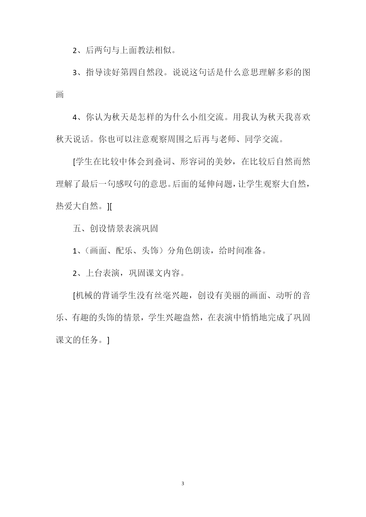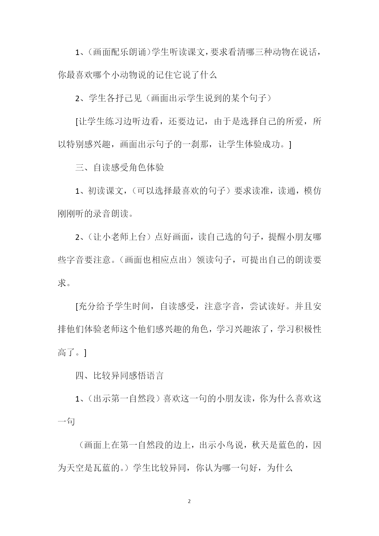 PAGEPAGE3《秋天》教学【设计理念】由于低年级学生注意力易分散,并且好动、持久性较差。本课设计时注意到这些,采用多媒体现代化的教学手段,充分吸引学生的兴趣。利用学生感兴趣的问题,拉他们走上学习的主体地位,在自然、自如、自娱、自悟中完成学习任务。【设计特色】教师教,重在引导;学生学,重在自主【教学流程及设计意图】一、画面激趣谈话导入。1、你知道一年有哪四个季节(春、夏、秋、冬)2、(画面)这里的风景到底是哪个季节呢(学生根据画面上的红色枫叶、金黄的稻田、往南飞的大雁、穿上毛衣的小朋友回答是秋天)画面上出示课题:秋天[利用多媒体生动逼真的有声画面,激起学生的兴趣,轻松的谈话让他们无拘无束地进入课堂,并且自己揭开了题目。]二、读课文初步感知1、(画面配乐朗诵)学生听读课文,要求看清哪三种动物在说话,你最喜欢哪个小动物说的记住它说了什么2、学生各抒己见(画面出示学生说到的某个句子)[让学生练习边听边看,还要边记,由于是选择自己的所爱,所以特别感兴趣,画面出示句子的一刹那,让学生体验成功。]三、自读感受角色体验1、初读课文,(可以选择最喜欢的句子)要求读准,读通,模仿刚刚听的录音朗读。2、(让小老师上台)点好画面,读自己选的句子,提醒小朋友哪些字音要注意。(画面也相应点出)领读句子,可提出自己的朗读要求。[充分给予学生时间,自读感受,注意字音,尝试读好。并且安排他们体验老师这个他们感兴趣的角色,学习兴趣浓了,学习积极性高了。]四、比较异同感悟语言1、(出示第一自然段)喜欢这一句的小朋友读,你为什么喜欢这一句(画面上在第一自然段的边上,出示小鸟说,秋天是蓝色的,因为天空是瓦蓝的。)学生比较异同,你认为哪一句好,为什么2、后两句与上面教法相似。3、指导读好第四自然段。说说这句话是什么意思理解多彩的图画4、你认为秋天是怎样的为什么小组交流。用我认为秋天我喜欢秋天说话。你也可以注意观察周围之后再与老师、同学交流。[学生在比较中体会到叠词、形容词的美妙,在比较后自然而然理解了最后一句感叹句的意思。后面的延伸问题,让学生观察大自然,热爱大自然。][五、创设情景表演巩固1、(画面、配乐、头饰)分角色朗读,给时间准备。2、上台表演,巩固课文内容。[机械的背诵学生没有丝毫兴趣,创设有美丽的画面、动听的音乐、有趣的头饰的情景,学生兴趣盎然,在表演中悄悄地完成了巩固课文的任务。]