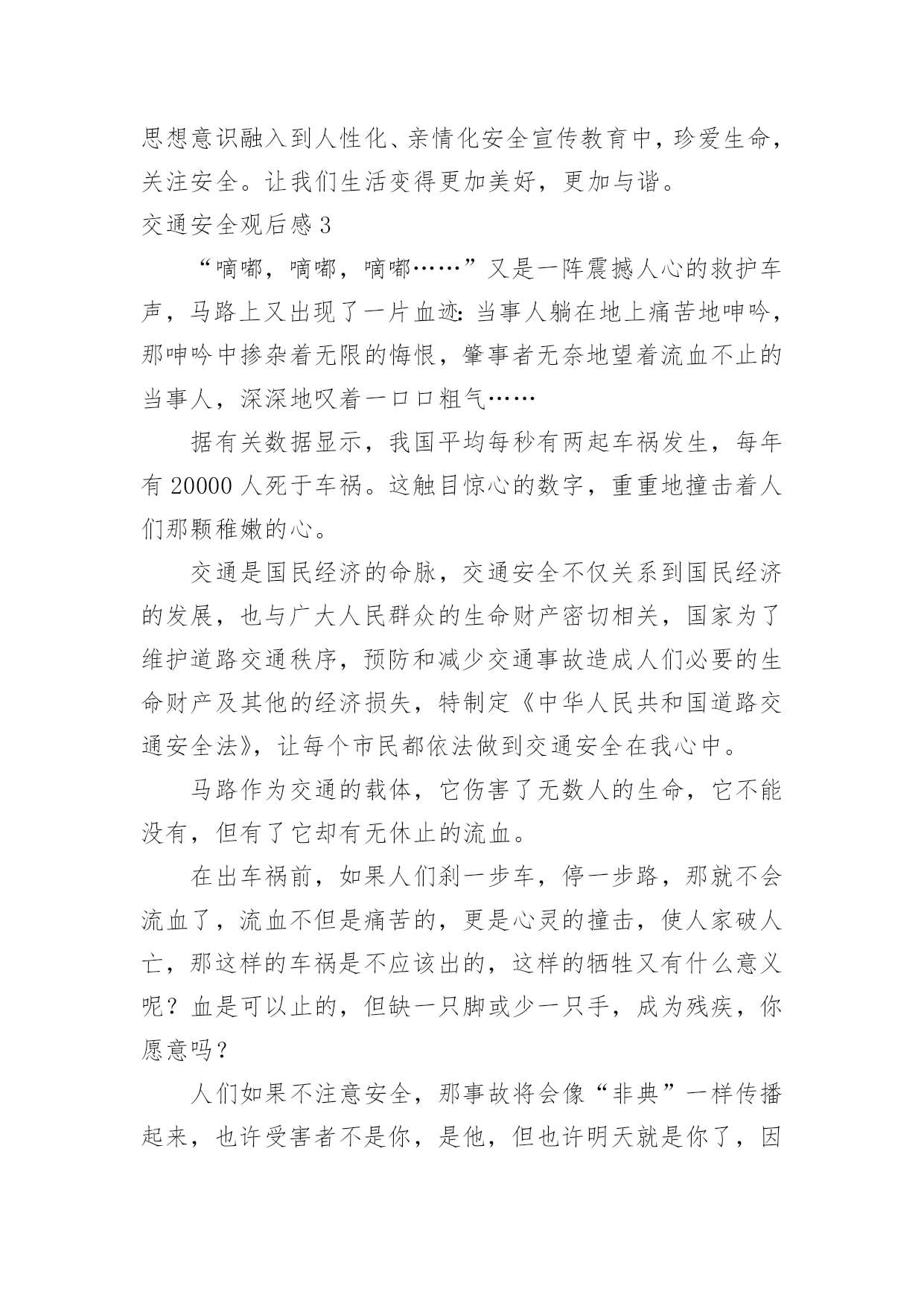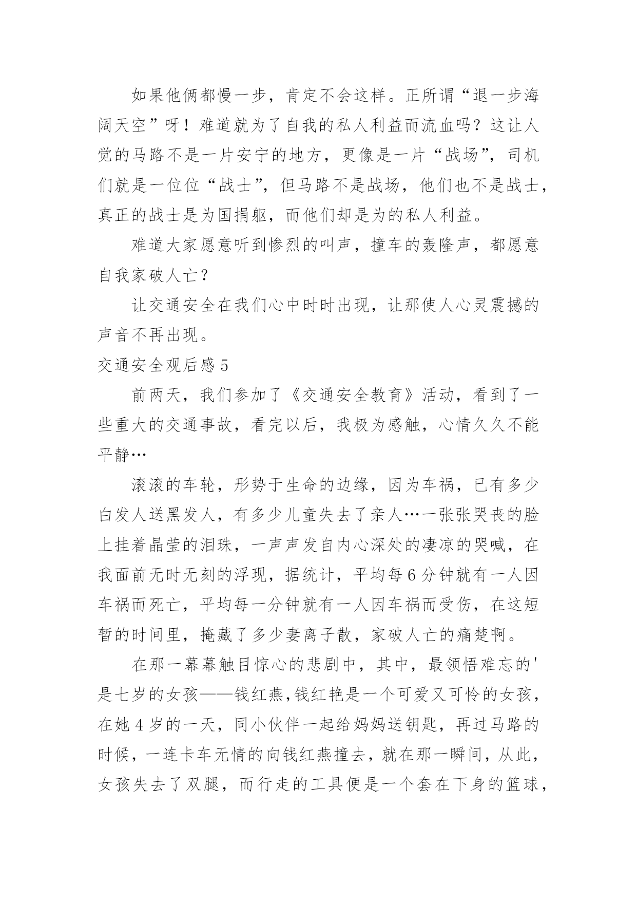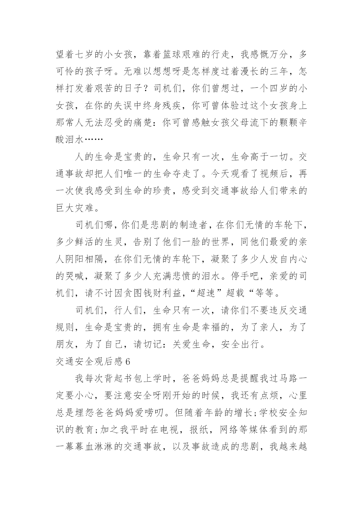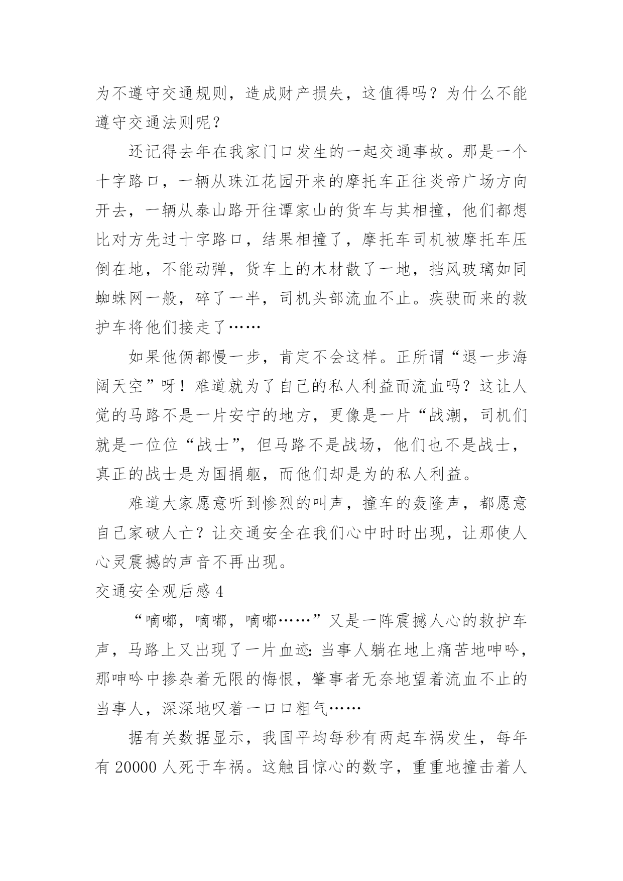 交通安全观后感交通安全观后感看完一部作品以后,大家一定收获不少吧,这时候,最关键的观后感怎么能落下!那么你真的懂得怎么写观后感吗?下面是小编收集整理的交通安全观后感,仅供参考,大家一起来看看吧。交通安全观后感1以前我就知道交通安全非常重要,可是从今天的安全教育中,看见那一个个发生在我们身边,活生生的例子,才让我真正体会到了安全的重要性。行人最关注的就是行路安全的问题,横穿马路时,要走人行穿越道,穿越马路时,养成看交通信号的好习惯。同时,还要注意来往车辆,不要追逐,猛跑,斜穿或突然改变行路方向,大中城市的马路,一般都分成机动车行驶的快车道,自行车,人力三轮车和其他慢行车道。及行人走的人行道。行路时,必须走人行道。在人行道行走时,不要多人并行,在没有划出人行道的路段,要尽量靠边走,这样才能确保行路的安全。在说骑车安全,按照交通部门的规定,不要不满12周岁的儿童,不准骑自行车,三轮车和推拉各种人力车上街,就算满了12周岁,骑自行车上街也要走慢车道,不能进入机动车行驶的快车道,也不能在人行道上骑自行车。在没有划分机动车,非机动车到的路段,要尽量靠右行驶,不能逆行,也不能到路中间去骑,这样骑车安全就不成问题了。还有乘汽车安全,坐公共汽车时,要遵守秩序,在指定地点依次候车,等车停后,先上后下,不要拥挤,不能在车还没停稳时就抢先上,要扶好把手或椅背防止急刹车,摔倒或撞伤,还有乘车时不能向车外,乱扔杂物,也不能把头,胳膊,或身体任何部分伸出动车辆外,因为这样容易被对面来的车或路边的树枝刮伤,坐汽车特别是坐长途汽车,不能携带鞭炮,汽油,一类的易燃易爆的物品上车。而且下了汽车,要先走到便道上去,如果需要横穿马路就必须从人行道通过。绝不能一下汽车就急忙奔到马路中间,更不能不等汽车开走就从车前车后往马路中间跑,那样看不见路上来往的车辆,很容易出事。那些如流星般消失的生命为我们敲响了警钟,千万不要像他们一样,为了少走几步路,节约几分钟,而忽视了自己的安全。交通安全观后感220__年3月13日,公司组织全体人工员集中到土桥车辆段,观看了《安全生产》安全展。安全展鲜活事例,悲惨场面,为我们上了一堂真实生动地安全警示教育课。观看安全展后,我感触良多,安全对于企业来说是最大效益,对于个人来说,安全就如健康平安一样,是人生最大财富。其实,人对于自然界来说是非常渺小,人生命也很脆弱,所以珍爱生命,关注安全是我们时时刻刻要铭记于心一项重要事情。工作中,我们要按章操作,多想几个“万一”,并养成严谨认真,一丝不苟工作习惯;平日里、生活中,也要时时警示自我规避不安全隐患,上下班遵守交通安全规则,做到“宁等三分,不抢一秒”,出门上班人走要关闭电源、燃气具开关等,并教育家人注意安全。也许我们一个提醒,就会给自我与他人带来一辈子幸福。在我看来,除了这些,安全还是一种责任,为了自我家庭幸福责任,在我们身边,每发生一起人身事故都可能增加一个或几个不幸家庭,所以我们不能忽视这样重要前提:一名员工虽然只是企业或社会一分子,但对于一个家庭来说,可能就是上有老、下有小“顶梁柱”,一个员工不幸就是家庭整体不幸,所受到伤害都会影响到全家幸福与美满。“高高兴兴上班,平平安安回家”,不仅是企业要求,更是家人期盼,没有什么比人身平安再幸福了。要使企业与家庭成员能够放心、安心、舒心,员工首先要真正认识自我安全保护价值,注意养成良好职业安全习惯;企业在抓安全教育管理时,也要从传统说教方式中走出来,改变安全教育方法,体现有人情味关爱精神。“安全我一个,幸福全家人”。我们要通过开展以人为本“爱心活动”与“平安工程”,真正建立起“人人想要安全、人人有能力安全、人人做到安全”企业安全文化体系,扎扎实实地营造出与谐、稳定安全工作氛围。安全展里,血教育又一次警示我们,在工作、生活中,一定要时刻注意安全,并要把“不怕一万、就怕万一”安全思想意识融入到人性化、亲情化安全宣传教育中,珍爱生命,关注安全。让我们生活变得更加美好,更加与谐。交通安全观后感3“嘀嘟,嘀嘟,嘀嘟……”又是一阵震撼人心的救护车声,马路上又出现了一片血迹:当事人躺在地上痛苦地呻吟,那呻吟中掺杂着无限的悔恨,肇事者无奈地望着流血不止的当事人,深深地叹着一口口粗气……据有关数据显示,我国平均每秒有两起车祸发生,每年有20000人死于车祸。这触目惊心的数字,重重地撞击着人们那颗稚嫩的心。交通是国民经济的命脉,交通安全不仅关系到国民经济的发展,也与广大人民群众的生命财产密切相关,国家为了维护道路交通秩序,预防和减少交通事故造成人们必要的生命财产及其他的经济损失,特制定《中华人民共和国道路交通安全法》,让每个市民都依法做到交通安全在我心中。马路作为交通的载体,它伤害了无数人的生命,它不能没有,但有了它却有无休止的流血。在出车祸前,如果人们刹一步车,停一步路