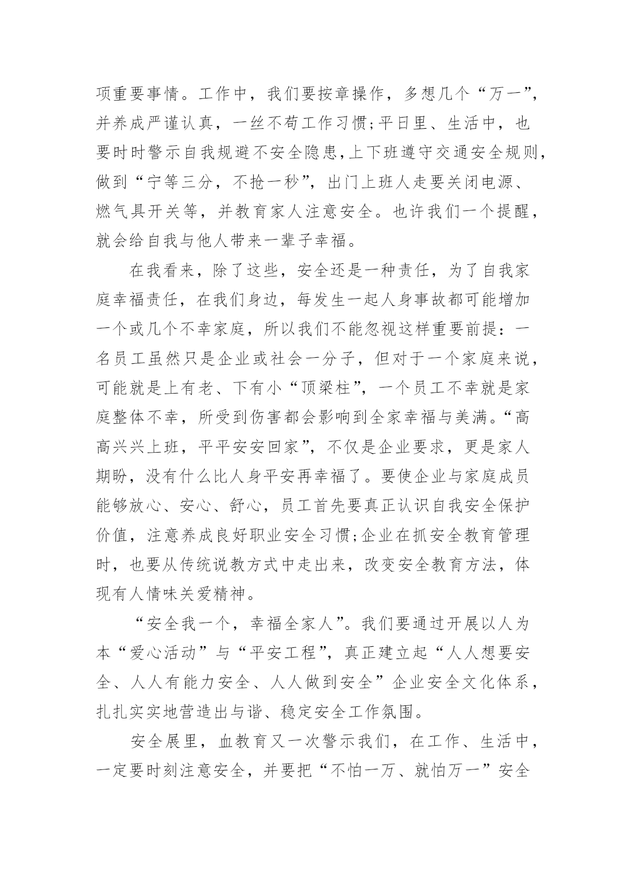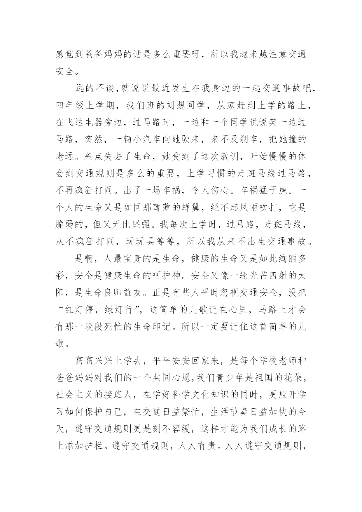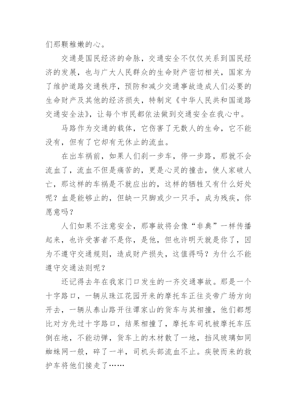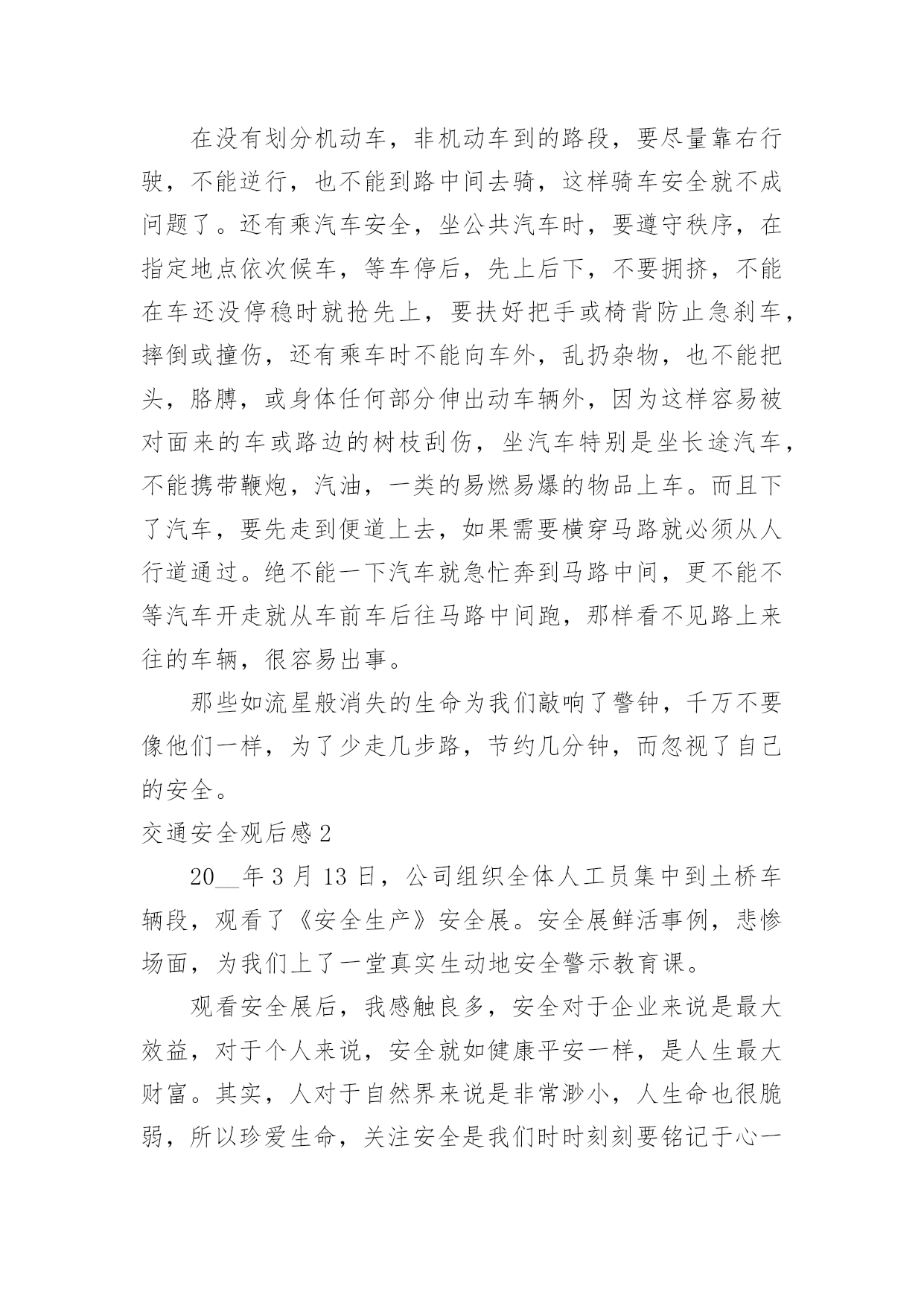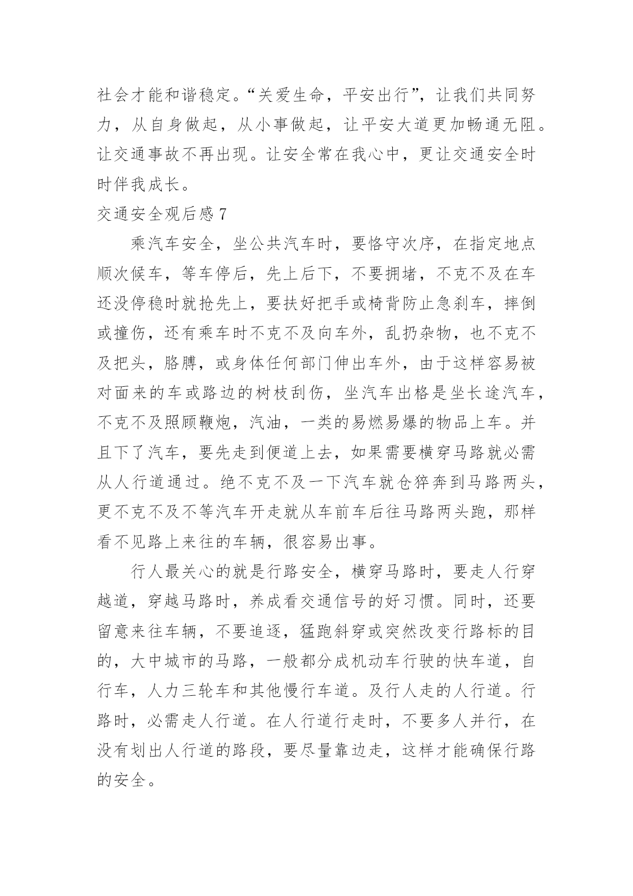 交通安全观后感交通安全观后感看完一部作品以后,大家一定收获不少吧,这时候,最关键的观后感怎么能落下!那么你真的懂得怎么写观后感吗?下面是小编收集整理的交通安全观后感,仅供参考,大家一起来看看吧。交通安全观后感1以前我就知道交通安全非常重要,可是从今天的安全教育中,看见那一个个发生在我们身边,活生生的例子,才让我真正体会到了安全的重要性。行人最关注的就是行路安全的问题,横穿马路时,要走人行穿越道,穿越马路时,养成看交通信号的好习惯。同时,还要注意来往车辆,不要追逐,猛跑,斜穿或突然改变行路方向,大中城市的马路,一般都分成机动车行驶的快车道,自行车,人力三轮车和其他慢行车道。及行人走的人行道。行路时,必须走人行道。在人行道行走时,不要多人并行,在没有划出人行道的路段,要尽量靠边走,这样才能确保行路的安全。在说骑车安全,按照交通部门的规定,不要不满12周岁的儿童,不准骑自行车,三轮车和推拉各种人力车上街,就算满了12周岁,骑自行车上街也要走慢车道,不能进入机动车行驶的快车道,也不能在人行道上骑自行车。在没有划分机动车,非机动车到的路段,要尽量靠右行驶,不能逆行,也不能到路中间去骑,这样骑车安全就不成问题了。还有乘汽车安全,坐公共汽车时,要遵守秩序,在指定地点依次候车,等车停后,先上后下,不要拥挤,不能在车还没停稳时就抢先上,要扶好把手或椅背防止急刹车,摔倒或撞伤,还有乘车时不能向车外,乱扔杂物,也不能把头,胳膊,或身体任何部分伸出动车辆外,因为这样容易被对面来的车或路边的树枝刮伤,坐汽车特别是坐长途汽车,不能携带鞭炮,汽油,一类的易燃易爆的物品上车。而且下了汽车,要先走到便道上去,如果需要横穿马路就必须从人行道通过。绝不能一下汽车就急忙奔到马路中间,更不能不等汽车开走就从车前车后往马路中间跑,那样看不见路上来往的车辆,很容易出事。那些如流星般消失的生命为我们敲响了警钟,千万不要像他们一样,为了少走几步路,节约几分钟,而忽视了自己的安全。交通安全观后感220__年3月13日,公司组织全体人工员集中到土桥车辆段,观看了《安全生产》安全展。安全展鲜活事例,悲惨场面,为我们上了一堂真实生动地安全警示教育课。观看安全展后,我感触良多,安全对于企业来说是最大效益,对于个人来说,安全就如健康平安一样,是人生最大财富。其实,人对于自然界来说是非常渺小,人生命也很脆弱,所以珍爱生命,关注安全是我们时时刻刻要铭记于心一项重要事情。工作中,我们要按章操作,多想几个“万一”,并养成严谨认真,一丝不苟工作习惯;平日里、生活中,也要时时警示自我规避不安全隐患,上下班遵守交通安全规则,做到“宁等三分,不抢一秒”,出门上班人走要关闭电源、燃气具开关等,并教育家人注意安全。也许我们一个提醒,就会给自我与他人带来一辈子幸福。在我看来,除了这些,安全还是一种责任,为了自我家庭幸福责任,在我们身边,每发生一起人身事故都可能增加一个或几个不幸家庭,所以我们不能忽视这样重要前提:一名员工虽然只是企业或社会一分子,但对于一个家庭来说,可能就是上有老、下有小“顶梁柱”,一个员工不幸就是家庭整体不幸,所受到伤害都会影响到全家幸福与美满。“高高兴兴上班,平平安安回家”,不仅是企业要求,更是家人期盼,没有什么比人身平安再幸福了。要使企业与家庭成员能够放心、安心、舒心,员工首先要真正认识自我安全保护价值,注意养成良好职业安全习惯;企业在抓安全教育管理时,也要从传统说教方式中走出来,改变安全教育方法,体现有人情味关爱精神。“安全我一个,幸福全家人”。我们要通过开展以人为本“爱心活动”与“平安工程”,真正建立起“人人想要安全、人人有能力安全、人人做到安全”企业安全文化体系,扎扎实实地营造出与谐、稳定安全工作氛围。安全展里,血教育又一次警示我们,在工作、生活中,一定要时刻注意安全,并要把“不怕一万、就怕万一”安全思想意识融入到人性化、亲情化安全宣传教育中,珍爱生命,关注安全。让我们生活变得更加美好,更加与谐。交通安全观后感3“嘀嘟,嘀嘟,嘀嘟……”又是一阵震撼人心的救护车声,马路上又出现了一片血迹:当事人躺在地上痛苦地呻吟,那呻吟中掺杂着无限的悔恨,肇事者无奈地望着流血不止的当事人,深深地叹着一口口粗气……据有关数据显示,我国平均每秒有两起车祸发生,每年有20000人死于车祸。这触目惊心的数字,重重地撞击着人们那颗稚嫩的心。交通是国民经济的命脉,交通安全不仅关系到国民经济的发展,也与广大人民群众的生命财产密切相关,国家为了维护道路交通秩序,预防和减少交通事故造成人们必要的生命财产及其他的经济损失,特制定《中华人民共和国道路交通安全法》,让每个市民都依法做到交通安全在我心中。马路作为交通的载体,它伤害了无数人的生命,它不能没有,但有了它却有无休止的流血。在出车祸前,如果人们刹一步车,停一步路