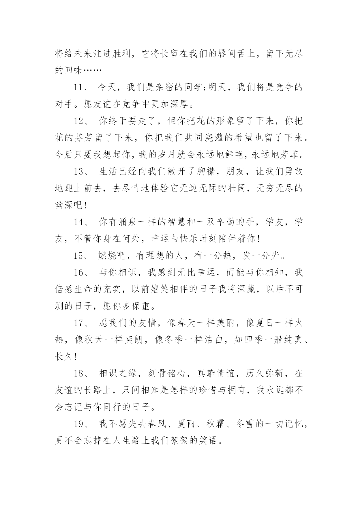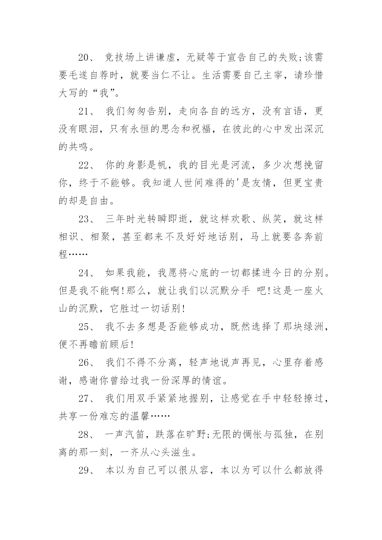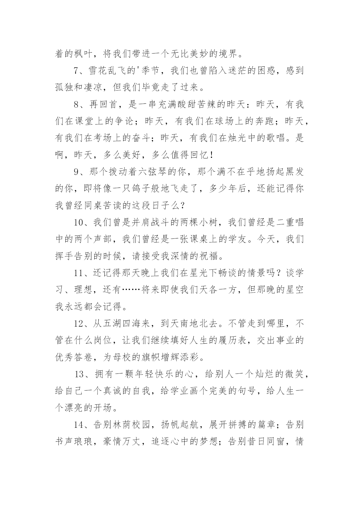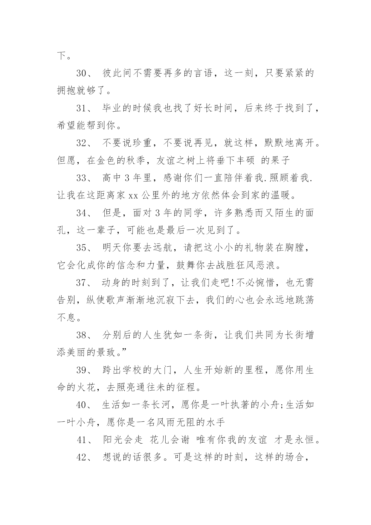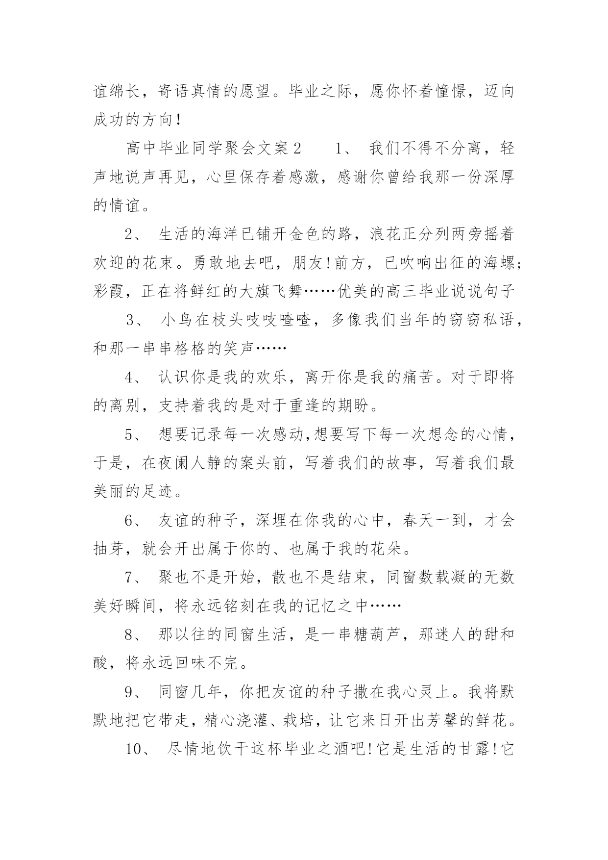 高中毕业同学聚会文案高中毕业同学聚会文案在平日的学习、工作和生活里,越来越多人热衷于在线上发表文案,文案对人们的思维是有一定的感性作用的。什么样的文案才是独特的呢?以下是小编为大家收集的高中毕业同学聚会文案,希望对大家有所帮助。高中毕业同学聚会文案11、还记得吗?军训场上的一顶顶红帽,阅兵场上嘹亮的口号,是的,从那时起,我们共同踏进了这片令人神往的天地……2、还记得那一天的摄影留念吗?我的瞬间意识连同闪光灯一起亮了:你的倩影留在底片上,同时也深深地烙在我的心灵里。3、我的朋友们,我们要暂时分别了;“珍重珍重”的话,我也不再说了。在这欲去未去的夜色里,努力铸造几颗小晨星;虽然没有多大光明,但也能使那早行的人高兴。4、心中没有遗憾,因为友谊不受地域拘限;不愿表达伤感,虽然离别就在眼前;无须描述分散,毕竟相见并不遥远。5、机会就像银燕,经常飞临我们的窗棂;机会就像钟声,时时回荡在我们的屋顶。只是需要我们用目光去捕捉,用耳朵去倾听。6、红叶纷飞的枫林里,我们曾拥有多少回忆。那飘舞着的枫叶,将我们带进一个无比美妙的境界。7、雪花乱飞的'季节,我们也曾陷入迷茫的困惑,感到孤独和凄凉,但我们毕竟走了过来。8、再回首,是一串充满酸甜苦辣的昨天:昨天,有我们在课堂上的争论;昨天,有我们在球场上的奔跑;昨天,有我们在考场上的奋斗;昨天,有我们在烛光中的歌唱。是啊,昨天,多么美好,多么值得回忆!9、那个拨动着六弦琴的你,那个满不在乎地扬起黑发的你,即将像一只鸽子般地飞走了,多少年后,还能记得你我曾经同桌苦读的这段日子么?10、我们曾是并肩战斗的两棵小树,我们曾经是二重唱中的两个声部,我们曾经是一张课桌上的学友。今天,我们挥手告别的时候,请接受我深情的祝福。11、还记得那天晚上我们在星光下畅谈的情景吗?谈学习、理想,还有……将来即使我们天各一方,但那晚的星空我永远都会记得。12、从五湖四海来,到天南地北去。不管走到哪里,不管在什么岗位,让我们继续填好人生的履历表,交出事业的优秀答卷,为母校的旗帜增辉添彩。13、拥有一颗年轻快乐的心,给别人一个灿烂的微笑,给自己一个真诚的自我,给学业画个完美的句号,给人生一个漂亮的开场。14、告别林荫校园,扬帆起航,展开拼搏的篇章;告别书声琅琅,豪情万丈,追逐心中的梦想;告别昔日同窗,情谊绵长,寄语真情的愿望。毕业之际,愿你怀着憧憬,迈向成功的方向!高中毕业同学聚会文案21、我们不得不分离,轻声地说声再见,心里保存着感激,感谢你曾给我那一份深厚的情谊。2、生活的海洋已铺开金色的路,浪花正分列两旁摇着欢迎的花束。勇敢地去吧,朋友!前方,已吹响出征的海螺;彩霞,正在将鲜红的大旗飞舞……优美的高三毕业说说句子3、小鸟在枝头吱吱喳喳,多像我们当年的窃窃私语,和那一串串格格的笑声……4、认识你是我的欢乐,离开你是我的痛苦。对于即将的离别,支持着我的是对于重逢的期盼。5、想要记录每一次感动,想要写下每一次想念的心情,于是,在夜阑人静的案头前,写着我们的故事,写着我们最美丽的足迹。6、友谊的种子,深埋在你我的心中,春天一到,才会抽芽,就会开出属于你的、也属于我的花朵。7、聚也不是开始,散也不是结束,同窗数载凝的无数美好瞬间,将永远铭刻在我的记忆之中……8、那以往的同窗生活,是一串糖葫芦,那迷人的甜和酸,将永远回味不完。9、同窗几年,你把友谊的种子撒在我心灵上。我将默默地把它带走,精心浇灌、栽培,让它来日开出芳馨的鲜花。10、尽情地饮干这杯毕业之酒吧!它是生活的甘露!它将给未来注进胜利,它将长留在我们的唇间舌上,留下无尽的回味……11、今天,我们是亲密的同学;明天,我们将是竞争的对手。愿友谊在竞争中更加深厚。12、你终于要走了,但你把花的形象留了下来,你把花的芬芳留了下来,你把我们共同浇灌的希望也留了下来。今后只要我想起你,我的岁月就会永远地鲜艳,永远地芳菲。13、生活已经向我们敞开了胸襟,朋友,让我们勇敢地迎上前去,去尽情地体验它无边无际的壮阔,无穷无尽的幽深吧!14、你有涌泉一样的智慧和一双辛勤的手,学友,学友,不管你身在何处,幸运与快乐时刻陪伴着你!15、燃烧吧,有理想的人,有一分热,发一分光。16、与你相识,我感到无比幸运,而能与你相知,我倍感生命的充实,以前嬉笑相伴的日子我将深藏,以后不可测的日子,愿你多保重。17、愿我们的友情,像春天一样美丽,像夏日一样火热,像秋天一样爽朗,像冬季一样洁白,如四季一般纯真、长久!18、相识之缘,刻骨铭心,真挚情谊,历久弥新,在友谊的长路上,只问相知是怎样的珍惜与拥有,我永远都不会忘记与你同行的日子。19、我不愿失去春风、夏雨、秋霜、冬雪的一切记忆,更不会忘掉在人生路上我们絮絮的笑语。20、竞技场上讲谦虚,无疑等于宣告自己的失败;该需要毛遂自荐时,就要当仁不让。生活需要自己主宰,请珍惜大