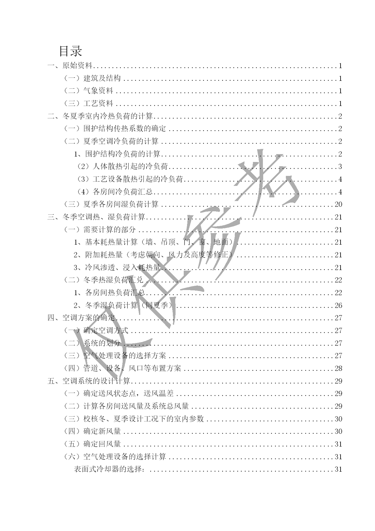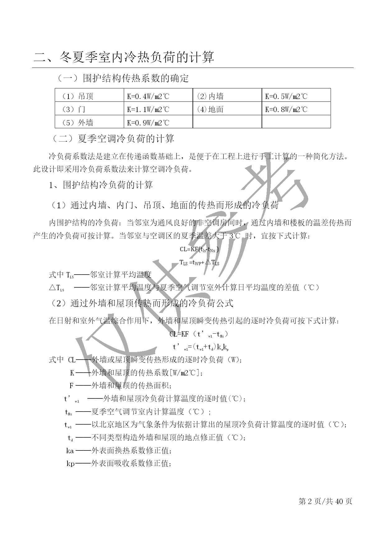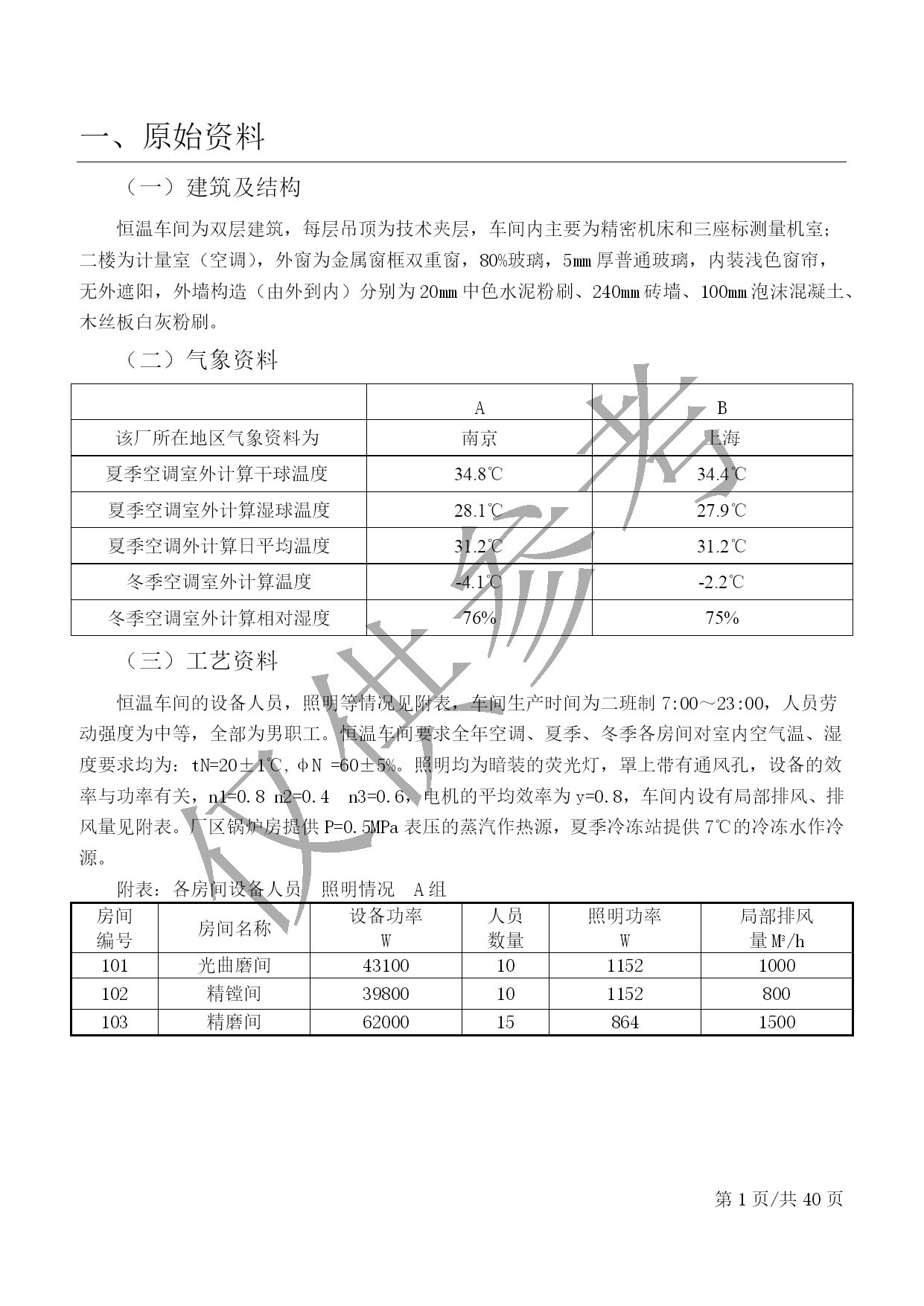 指导老师:马荣生丁兴凤绪论设计目的空调课程设计是《暖通空调》课程的重要教学环节之一,通过这一环节达到了解空调设计的内容、程序和基本原则,学习设计计算的基本步骤和方法,巩固《暖通空调》课程的理论知识,培养独立工作能力和解决实际工程问题的能力。同时,利用与之相关的软件,增强应用与创造能力。如用于辅助设计的CAD,用于编写文档的WORD,用于数据统计的EXCEL,都是帮助我们高效工作的工具,故此,此次课程设计不仅是对《空调工程》的专业知识的应用,也是对当代的我们应用各种计算机软件的一个考验。设计任务整个设计要求完成恒温车间(一层)的空调设计。应将设计结果整理成设计计算说明书,其中包括:原始资料、设计方案、计算公式、数据来源、设备类型、主要设备材料表。设计成果还应能用工程图纸表达出来,必须提供空调平、剖面图、系统图及机房详图。目录TOC\o"1-3"\h\z\uHYPERLINK\l"_Toc453497450"一、原始资料PAGEREF_Toc453497450\h1HYPERLINK\l"_Toc453497451"(一)建筑及结构PAGEREF_Toc453497451\h1HYPERLINK\l"_Toc453497452"(二)气象资料PAGEREF_Toc453497452\h1HYPERLINK\l"_Toc453497453"(三)工艺资料PAGEREF_Toc453497453\h1HYPERLINK\l"_Toc453497454"二、冬夏季室内冷热负荷的计算PAGEREF_Toc453497454\h2HYPERLINK\l"_Toc453497455"(一)围护结构传热系数的确定PAGEREF_Toc453497455\h2HYPERLINK\l"_Toc453497456"(二)夏季空调冷负荷的计算PAGEREF_Toc453497456\h2HYPERLINK\l"_Toc453497457"1、围护结构冷负荷的计算PAGEREF_Toc453497457\h2HYPERLINK\l"_Toc453497458"(2)人体散热引起的冷负荷PAGEREF_Toc453497458\h3HYPERLINK\l"_Toc453497459"(3)工艺设备散热引起的冷负荷PAGEREF_Toc453497459\h4HYPERLINK\l"_Toc453497460"(4)各房间冷负荷汇总PAGEREF_Toc453497460\h4HYPERLINK\l"_Toc453497461"(三)夏季各房间湿负荷计算PAGEREF_Toc453497461\h20HYPERLINK\l"_Toc453497462"三、冬季空调热、湿负荷计算PAGEREF_Toc453497462\h21HYPERLINK\l"_Toc453497463"(一)需要计算的部分PAGEREF_Toc453497463\h21HYPERLINK\l"_Toc453497464"1、基本耗热量计算(墙、吊顶、门、窗、地面)PAGEREF_Toc453497464\h21HYPERLINK\l"_Toc453497465"2、附加耗热量(考虑朝向、风力及高度等修正)PAGEREF_Toc453497465\h21HYPERLINK\l"_Toc453497466"3、冷风渗透、浸入耗热量PAGEREF_Toc453497466\h21HYPERLINK\l"_Toc453497467"(二)冬季热湿负荷汇兑PAGEREF_Toc453497467\h22HYPERLINK\l"_Toc453497468"1、各房间热负荷汇总PAGEREF_Toc453497468\h22HYPERLINK\l"_Toc453497469"2、冬季湿负荷计算(同夏季)PAGEREF_Toc453497469\h26HYPERLINK\l"_Toc453497470"四、空调方案的确定PAGEREF_Toc453497470\h27HYPERLINK\l"_Toc453497471"(一)确定空调方式PAGEREF_Toc453497471\h27HYPERLINK\l"_Toc453497472"(二)系统的划分PAGEREF_Toc453497472\h27