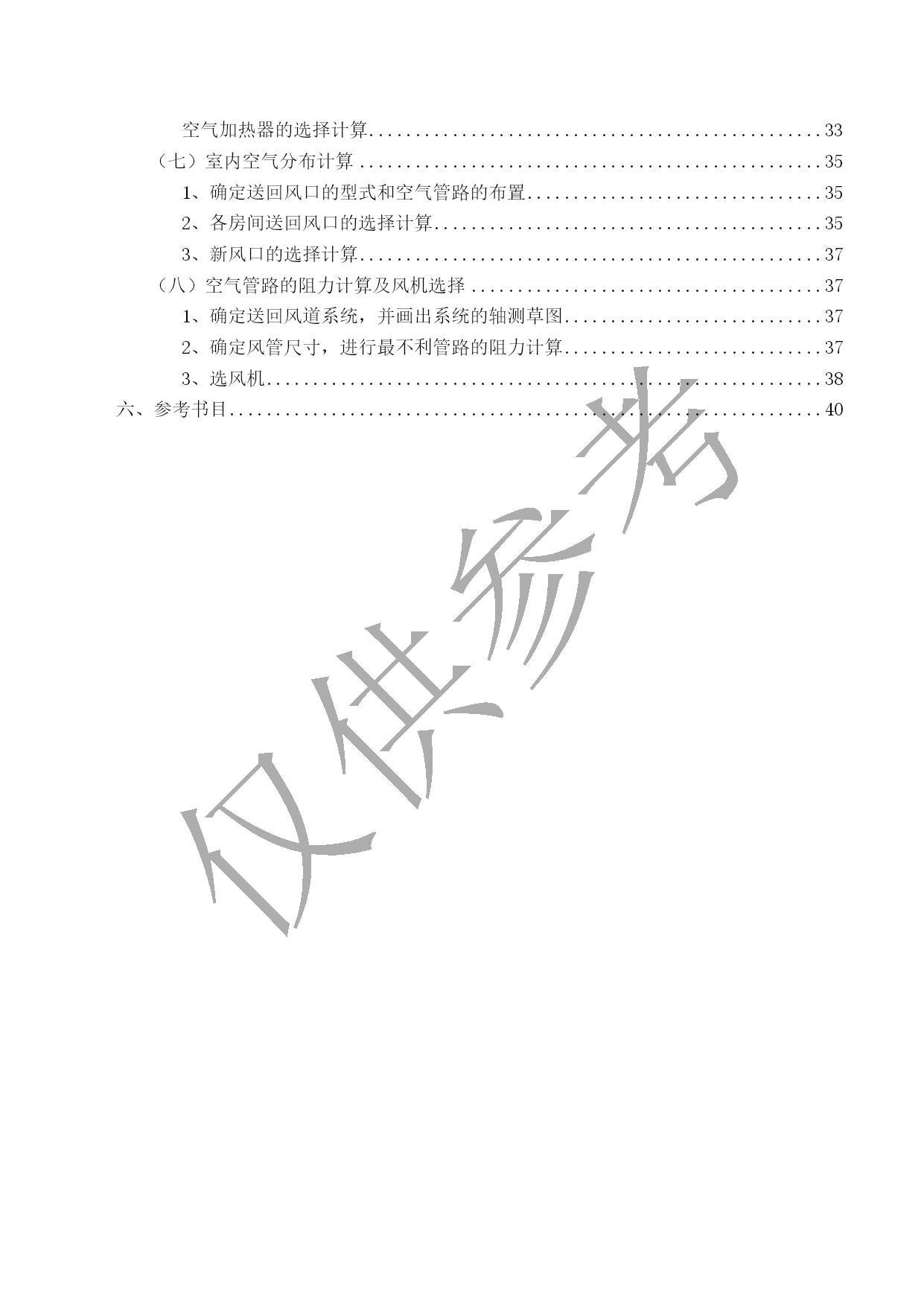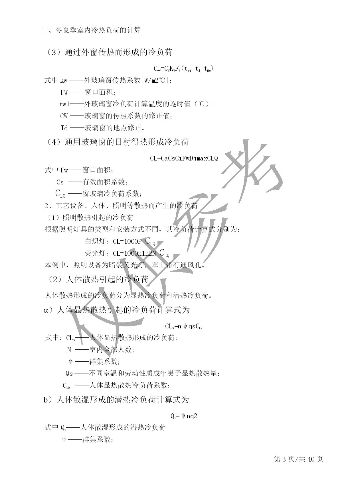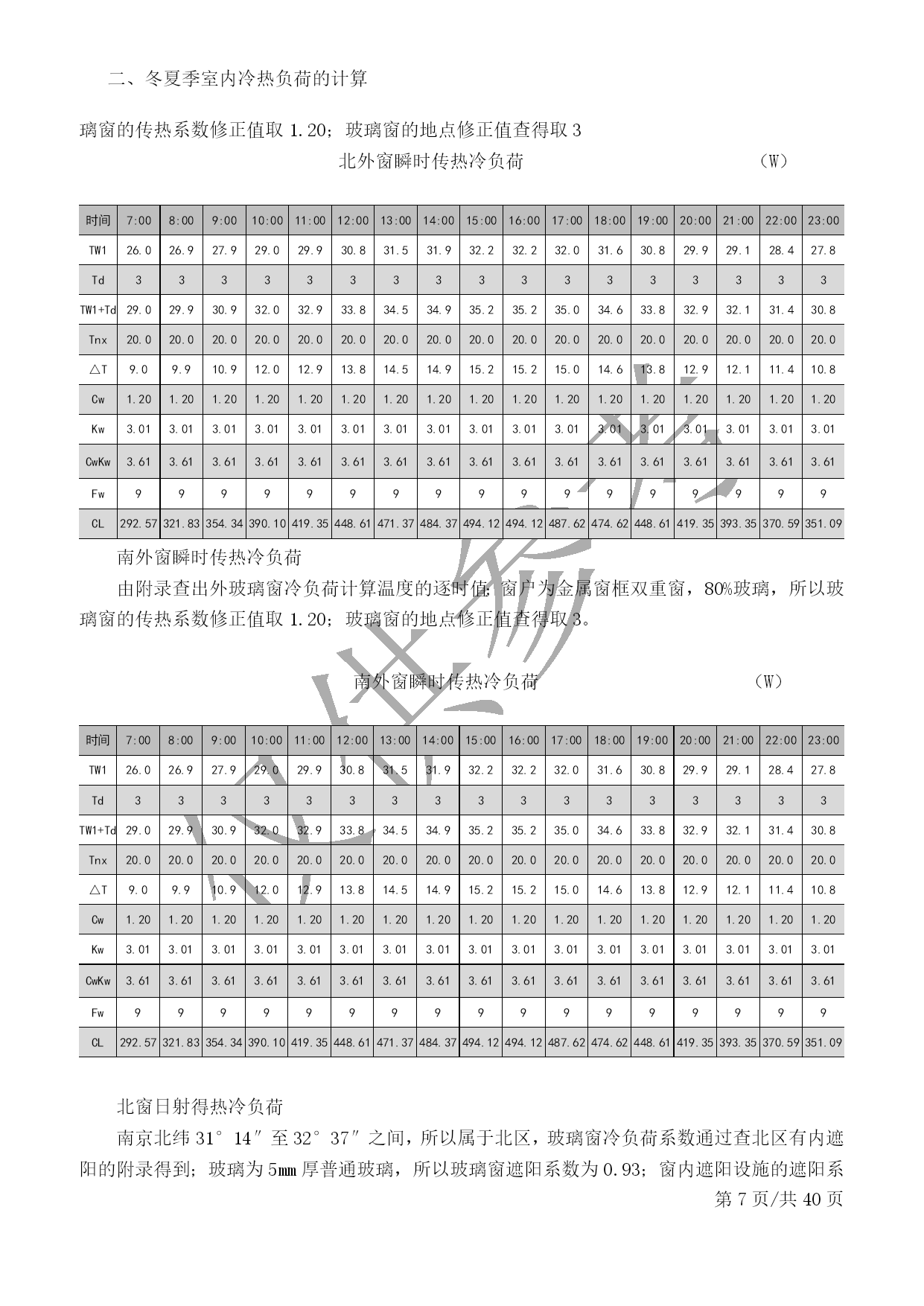 指导老师:马荣生丁兴凤绪论设计目的空调课程设计是《暖通空调》课程的重要教学环节之一,通过这一环节达到了解空调设计的内容、程序和基本原则,学习设计计算的基本步骤和方法,巩固《暖通空调》课程的理论知识,培养独立工作能力和解决实际工程问题的能力。同时,利用与之相关的软件,增强应用与创造能力。如用于辅助设计的CAD,用于编写文档的WORD,用于数据统计的EXCEL,都是帮助我们高效工作的工具,故此,此次课程设计不仅是对《空调工程》的专业知识的应用,也是对当代的我们应用各种计算机软件的一个考验。设计任务整个设计要求完成恒温车间(一层)的空调设计。应将设计结果整理成设计计算说明书,其中包括:原始资料、设计方案、计算公式、数据来源、设备类型、主要设备材料表。设计成果还应能用工程图纸表达出来,必须提供空调平、剖面图、系统图及机房详图。目录TOC\o"1-3"\h\z\uHYPERLINK\l"_Toc453497450"一、原始资料PAGEREF_Toc453497450\h1HYPERLINK\l"_Toc453497451"(一)建筑及结构PAGEREF_Toc453497451\h1HYPERLINK\l"_Toc453497452"(二)气象资料PAGEREF_Toc453497452\h1HYPERLINK\l"_Toc453497453"(三)工艺资料PAGEREF_Toc453497453\h1HYPERLINK\l"_Toc453497454"二、冬夏季室内冷热负荷的计算PAGEREF_Toc453497454\h2HYPERLINK\l"_Toc453497455"(一)围护结构传热系数的确定PAGEREF_Toc453497455\h2HYPERLINK\l"_Toc453497456"(二)夏季空调冷负荷的计算PAGEREF_Toc453497456\h2HYPERLINK\l"_Toc453497457"1、围护结构冷负荷的计算PAGEREF_Toc453497457\h2HYPERLINK\l"_Toc453497458"(2)人体散热引起的冷负荷PAGEREF_Toc453497458\h3HYPERLINK\l"_Toc453497459"(3)工艺设备散热引起的冷负荷PAGEREF_Toc453497459\h4HYPERLINK\l"_Toc453497460"(4)各房间冷负荷汇总PAGEREF_Toc453497460\h4HYPERLINK\l"_Toc453497461"(三)夏季各房间湿负荷计算PAGEREF_Toc453497461\h20HYPERLINK\l"_Toc453497462"三、冬季空调热、湿负荷计算PAGEREF_Toc453497462\h21HYPERLINK\l"_Toc453497463"(一)需要计算的部分PAGEREF_Toc453497463\h21HYPERLINK\l"_Toc453497464"1、基本耗热量计算(墙、吊顶、门、窗、地面)PAGEREF_Toc453497464\h21HYPERLINK\l"_Toc453497465"2、附加耗热量(考虑朝向、风力及高度等修正)PAGEREF_Toc453497465\h21HYPERLINK\l"_Toc453497466"3、冷风渗透、浸入耗热量PAGEREF_Toc453497466\h21HYPERLINK\l"_Toc453497467"(二)冬季热湿负荷汇兑PAGEREF_Toc453497467\h22HYPERLINK\l"_Toc453497468"1、各房间热负荷汇总PAGEREF_Toc453497468\h22HYPERLINK\l"_Toc453497469"2、冬季湿负荷计算(同夏季)PAGEREF_Toc453497469\h26HYPERLINK\l"_Toc453497470"四、空调方案的确定PAGEREF_Toc453497470\h27HYPERLINK\l"_Toc453497471"(一)确定空调方式PAGEREF_Toc453497471\h27HYPERLINK\l"_Toc453497472"(二)系统的划分PAGEREF_Toc453497472\h27