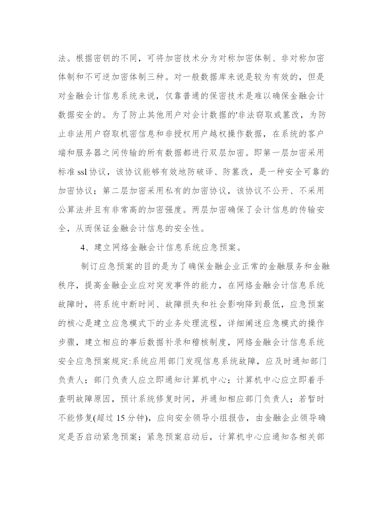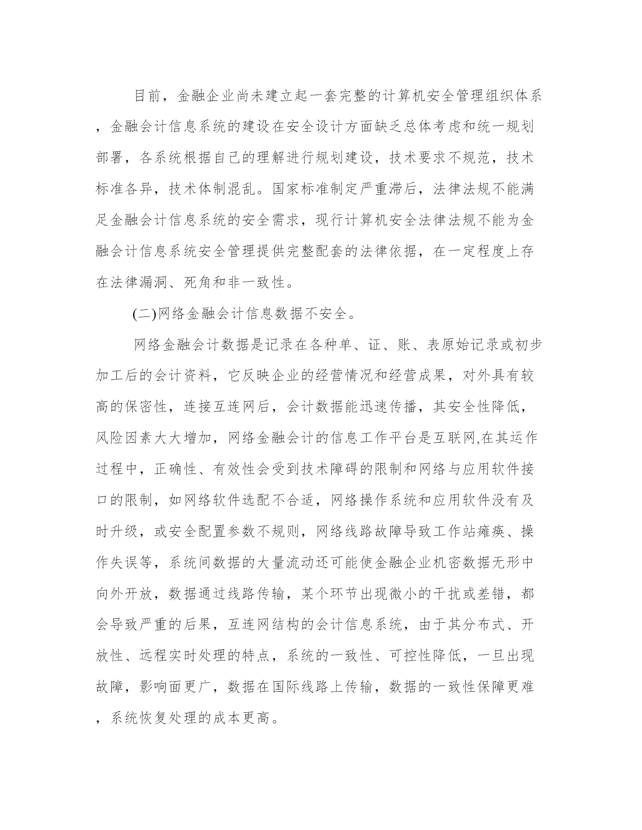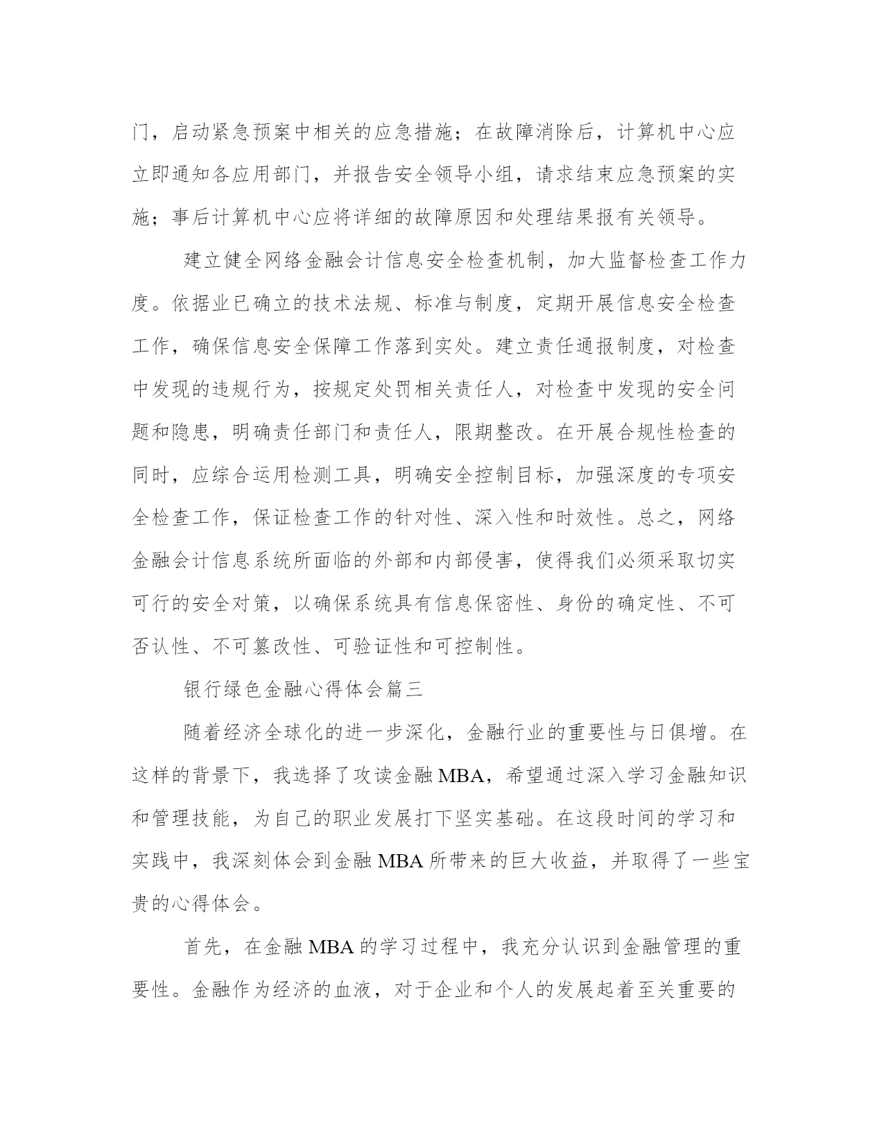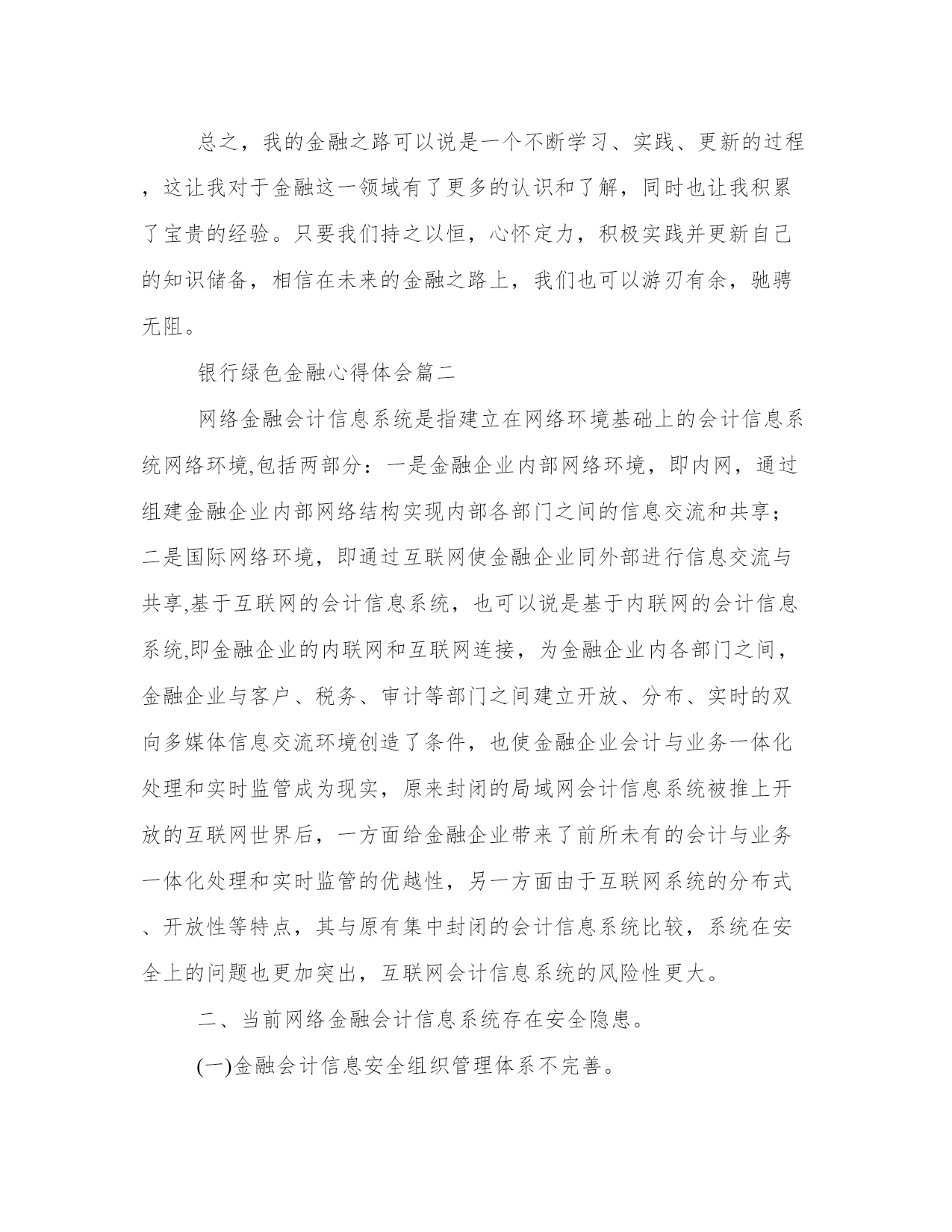 银行绿色金融心得体会(汇总13篇)体会是指将学习的东西运用到实践中去,通过实践反思学习内容并记录下来的文字,近似于经验总结。心得体会可以帮助我们更好地认识自己,通过总结和反思,我们可以更清楚地了解自己的优点和不足,找到自己的定位和方向。以下我给大家整理了一些优质的心得体会范文,希望对大家能够有所帮助。银行绿色金融心得体会篇一近些年来,金融领域的发展呈现出繁荣的景象,与之相应,人们对于金融这一话题的关注程度不断提升。作为从业者,作为普通百姓,进入金融世界已经成为一种趋势,我也不例外。下面,我将就我自己在金融领域的心得体会进行分享。第一段:了解基础理论,掌握基本知识。在进入金融领域之前,我首先选择了阅读相关书籍、听取专家讲座等方式,了解金融领域一些基本的术语、知识和规则,例如金融市场、证券、基金等等。这些知识在之后的实践中成为我理解和应用的基础,也为我日后更深入地分析金融打下了基础。第二段:实践是检验真理的唯一标准。理论虽好,但面对复杂多变的金融市场,仅凭书本知识也会存在不足。因此,我非常注重实践。我尝试着在投资员工持股计划、购买基金、购买股票等方面进行投资。在实践中,我逐渐学习到如何通过信息分析,制定投资策略,把握交易时机。同时也充分感受到金融市场的风险和不确定性,切实体会到就算是一个小小的投资决策,对投资者也会有深远的影响。第三段:走出固定思维框架,拓宽视野。古人云:“养心莫若寡欲,学问莫若多闻。”对于金融领域也同样适用。不仅要深入学习金融领域内的知识,还要了解其它行业、产业发展动态,在一定程度上才能更好地了解整个市场发展的方向。因此,我积极参加一些中学生金融人才、金融高峰论坛等活动,与业内专家、企业家互动交流,拓宽自己的视野,不断提升自己的见识。第四段:不断学习、更新知识。金融市场变化万千,一份掌握了金融知识也不能保证实时掌握市场现状。为了跟上时代潮流,市场发展,更新自己的知识知识非常必要。因此,在闲暇时间,我积极参加一些金融知识培训、研讨会、券商线上学堂等活动,学习不同领域企业的财务状况和利润走势,不断补充自己的知识储备,以便更好地适应市场变化。第五段:毅力和耐心是成功的关键。在金融领域,毅力和耐心是取得成功的关键。正如巴菲特所说:“决定一个投资者的成败,并不是在一天或一周内的市场繁荣或水深火热,而是在十年或二十年内的整体表现。”因此,我们必须学会保持冷静,坚持不懈地积累经验、提高能力,同时也学会适时调整投资策略,战胜市场波动。总之,我的金融之路可以说是一个不断学习、实践、更新的过程,这让我对于金融这一领域有了更多的认识和了解,同时也让我积累了宝贵的经验。只要我们持之以恒,心怀定力,积极实践并更新自己的知识储备,相信在未来的金融之路上,我们也可以游刃有余,驰骋无阻。银行绿色金融心得体会篇二网络金融会计信息系统是指建立在网络环境基础上的会计信息系统网络环境,包括两部分:一是金融企业内部网络环境,即内网,通过组建金融企业内部网络结构实现内部各部门之间的信息交流和共享;二是国际网络环境,即通过互联网使金融企业同外部进行信息交流与共享,基于互联网的会计信息系统,也可以说是基于内联网的会计信息系统,即金融企业的内联网和互联网连接,为金融企业内各部门之间,金融企业与客户、税务、审计等部门之间建立开放、分布、实时的双向多媒体信息交流环境创造了条件,也使金融企业会计与业务一体化处理和实时监管成为现实,原来封闭的局域网会计信息系统被推上开放的互联网世界后,一方面给金融企业带来了前所未有的会计与业务一体化处理和实时监管的优越性,另一方面由于互联网系统的分布式、开放性等特点,其与原有集中封闭的会计信息系统比较,系统在安全上的问题也更加突出,互联网会计信息系统的风险性更大。二、当前网络金融会计信息系统存在安全隐患。(一)金融会计信息安全组织管理体系不完善。目前,金融企业尚未建立起一套完整的计算机安全管理组织体系,金融会计信息系统的建设在安全设计方面缺乏总体考虑和统一规划部署,各系统根据自己的理解进行规划建设,技术要求不规范,技术标准各异,技术体制混乱。国家标准制定严重滞后,法律法规不能满足金融会计信息系统的安全需求,现行计算机安全法律法规不能为金融会计信息系统安全管理提供完整配套的法律依据,在一定程度上存在法律漏洞、死角和非一致性。(二)网络金融会计信息数据不安全。网络金融会计数据是记录在各种单、证、账、表原始记录或初步加工后的会计资料,它反映企业的经营情况和经营成果,对外具有较高的保密性,连接互连网后,会计数据能迅速传播,其安全性降低,风险因素大大增加,网络金融会计的信息工作平台是互联网,在其运作过程中,正确性、有效性会受到技术障碍的限制和网络与应用软件接口的限制,如网络软件选配不合适,网络操作系统和