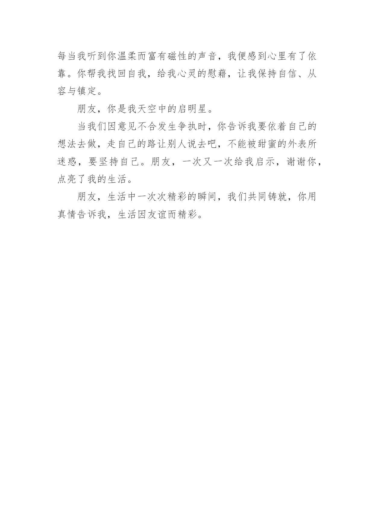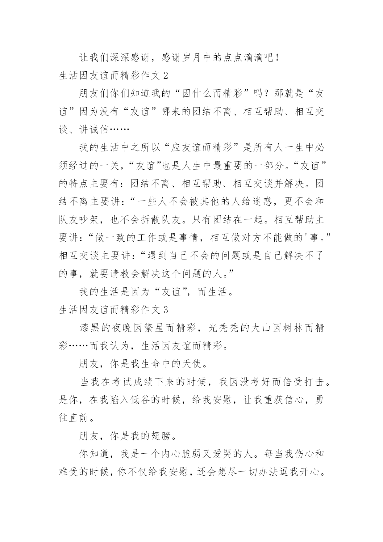 生活因友谊而精彩作文生活因友谊而精彩作文3篇在学习、工作或生活中,大家都不可避免地会接触到作文吧,借助作文可以宣泄心中的情感,调节自己的心情。相信写作文是一个让许多人都头痛的问题,以下是小编为大家收集的生活因友谊而精彩作文,欢迎大家分享。生活因友谊而精彩作文1友谊,是在你寒冷时的一盆火炉;友谊,是帮助你打开成功的一把钥匙;友谊,是在你口渴时一滴甘甜的泉水。拥有友谊,就等于拥有了快乐,就等于拥有了明天。在小学四年级时,我走向低谷,学习成绩直线下滑,脾气像吃了枪药似的,动不动就发火,我想走出这个低谷可就是走不出来,朋友们看我这样干着急也不是办法,就不断的开导我,终于,在朋友的帮助下,我走出了低谷。当你陷入低谷时,是朋友的一句话帮你走出了低谷;当你遇到困难时,是朋友的帮助帮你解决了问题。还有一次,我们班的两位同学家里非常困难,老师知道了这件事,组织了一次捐款,同学们踊跃的为这两位同学捐款,虽然只是十块、二十块,可这都是同学们自己攒的零花钱。在这件事上,充分体现了友谊的重要性。生活因友谊而精彩!让我们深深感谢,感谢岁月中的点点滴滴吧!生活因友谊而精彩作文2朋友们你们知道我的“因什么而精彩”吗?那就是“友谊”因为没有“友谊”哪来的团结不离、相互帮助、相互交谈、讲诚信……我的生活中之所以“应友谊而精彩”是所有人一生中必须经过的一关,“友谊”也是人生中最重要的一部分。“友谊”的特点主要有:团结不离、相互帮助、相互交谈并解决。团结不离主要讲:“一些人不会被其他的人给迷惑,更不会和队友吵架,也不会拆散队友。只有团结在一起。相互帮助主要讲:“做一致的工作或是事情,相互做对方不能做的'事。”相互交谈主要讲:“遇到自己不会的问题或是自己解决不了的事,就要请教会解决这个问题的人。”我的生活是因为“友谊”,而生活。生活因友谊而精彩作文3漆黑的夜晚因繁星而精彩,光秃秃的大山因树林而精彩……而我认为,生活因友谊而精彩。朋友,你是我生命中的天使。当我在考试成绩下来的时候,我因没考好而倍受打击。是你,在我陷入低谷的时候,给我安慰,让我重获信心,勇往直前。朋友,你是我的翅膀。你知道,我是一个内心脆弱又爱哭的人。每当我伤心和难受的时候,你不仅给我安慰,还会想尽一切办法逗我开心。每当我听到你温柔而富有磁性的声音,我便感到心里有了依靠。你帮我找回自我,给我心灵的慰藉,让我保持自信、从容与镇定。朋友,你是我天空中的启明星。当我们因意见不合发生争执时,你告诉我要依着自己的想法去做,走自己的路让别人说去吧,不能被甜蜜的外表所迷惑,要坚持自己。朋友,一次又一次给我启示,谢谢你,点亮了我的生活。朋友,生活中一次次精彩的瞬间,我们共同铸就,你用真情告诉我,生活因友谊而精彩。